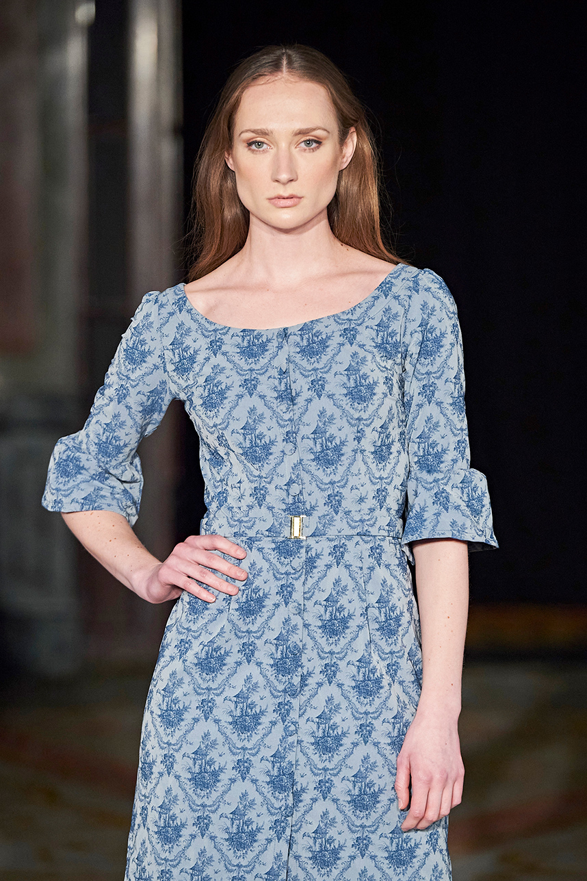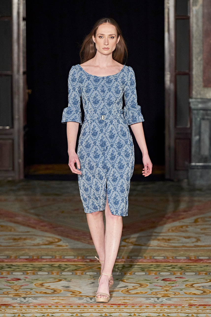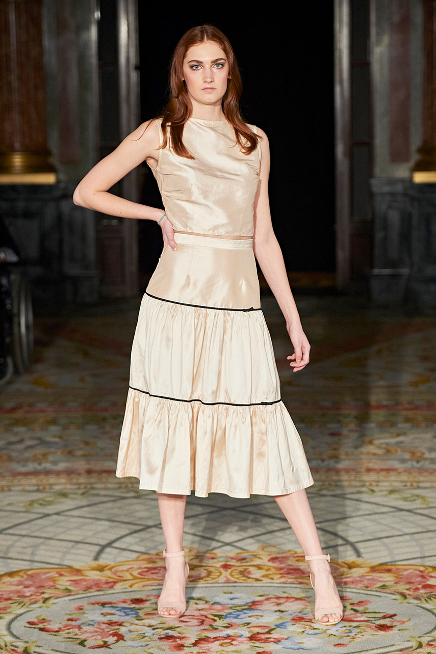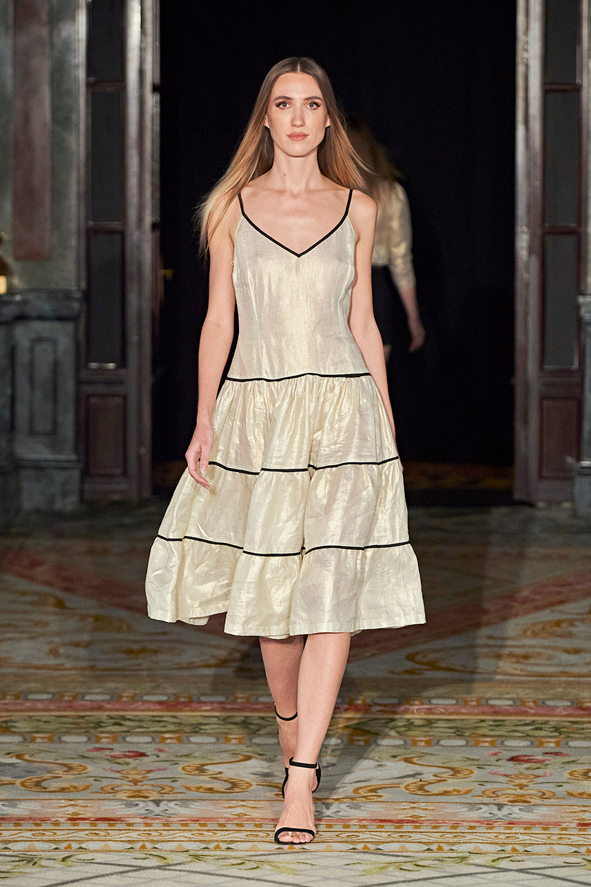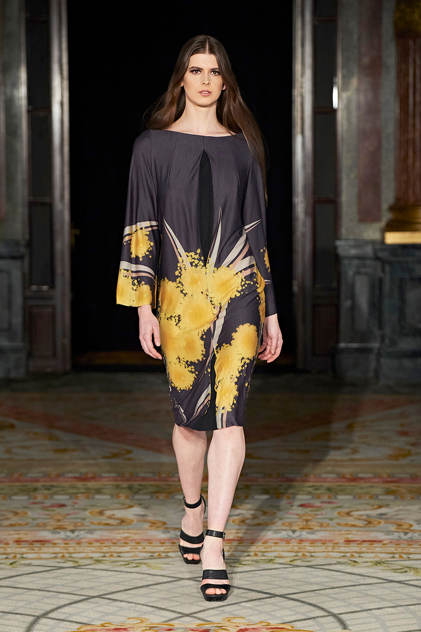 Wendy Ratcliffe from Australia, founder of InVintaged presented her collection “Chrysalis,” inspired by simple, classical vintage-inspired styles. The silhouettes were designed to perfectly enhance a modern woman’s natural elegance – From the 1920’s to 2020. Ratcliffe expertly paired silk velvets with chainmaille maintaining a classic femininity. Hand dyed Australian Merino Wool in shades Chainmaille, French navy, wattle yellow, black, smokey grey and Australian bush green were paired with silks with tailored draping and interesting details such as caped sleeves.
