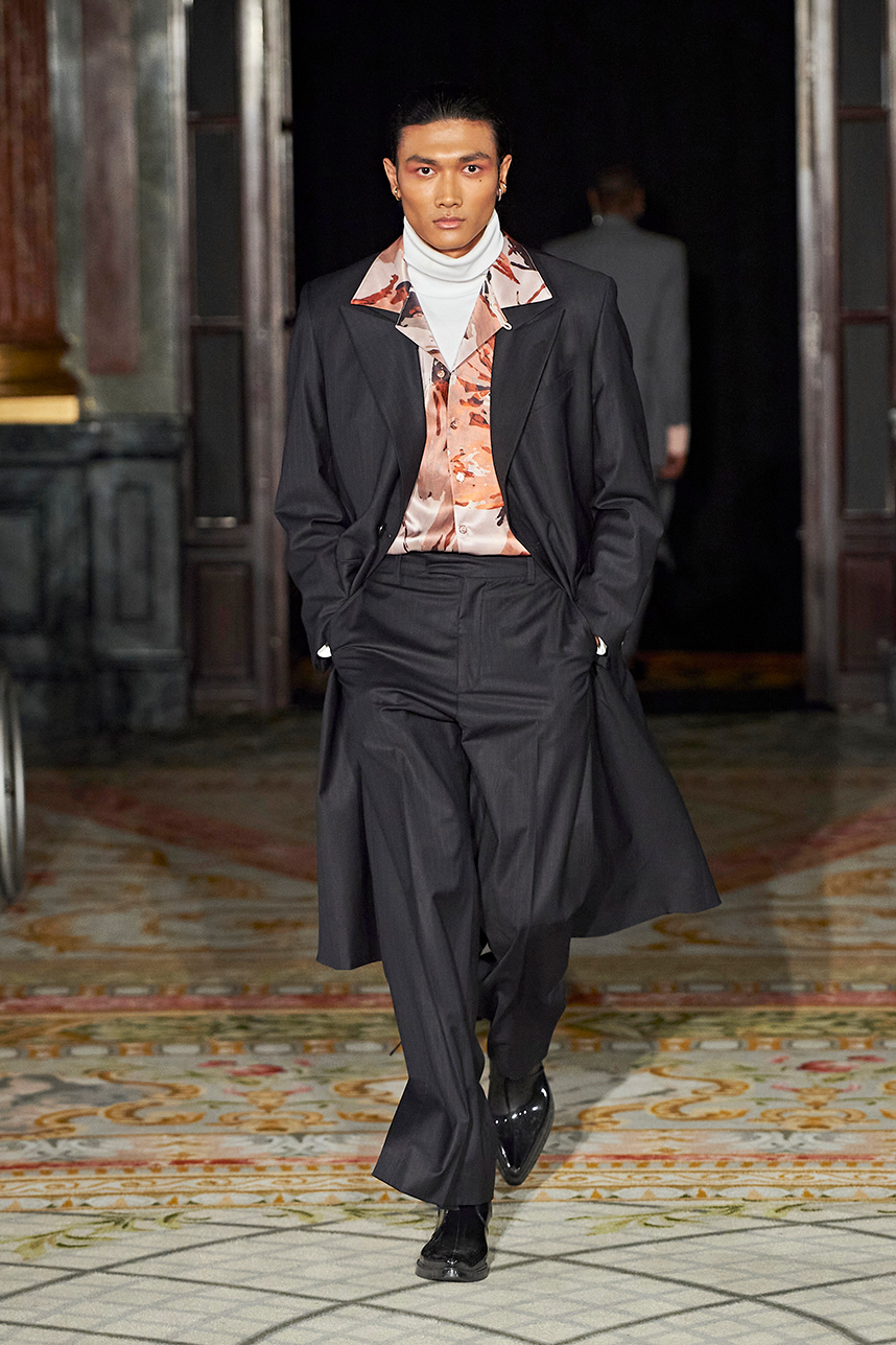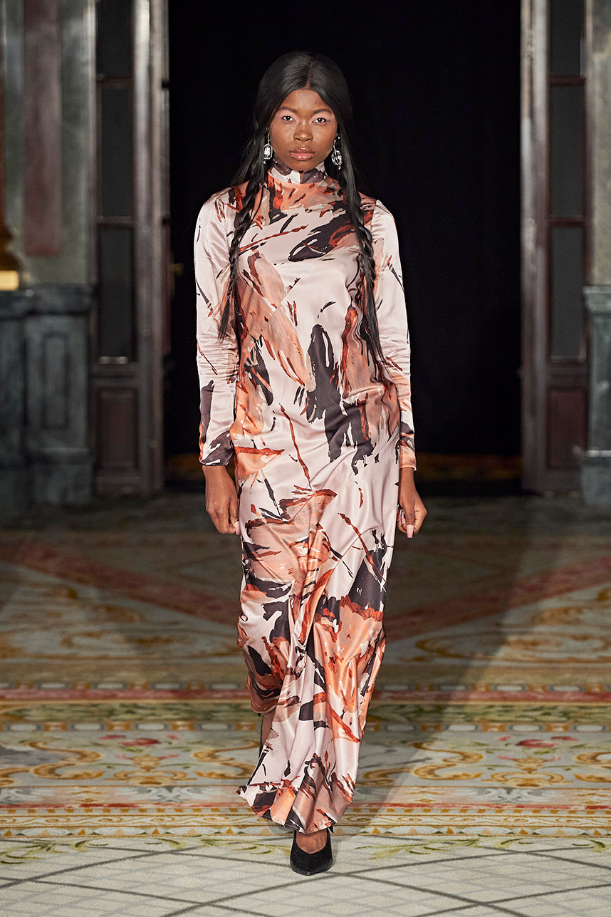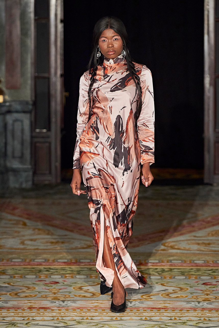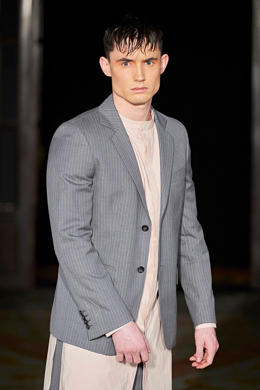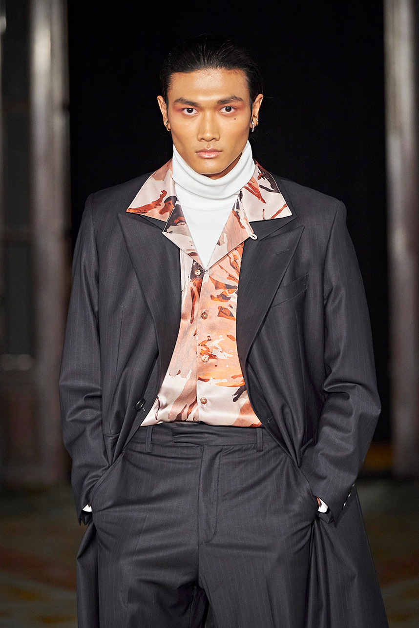 Rickyy Wong’s FW2020 collection « Chinostalgia » was a reflection on the cultural dynamism of Asia’s world cities of the 20th century – Hong Kong and Shanghai. The Hong Kong based designer label produced men’s and women’s collections focusing on high-end fabrics, finishes and textile design techniques representing the best of Asian craftsmanship. The collection rendered a romantic vision of the past in shades of pastel and soft grey, with flowing printed silks, pink and green sharp dressing, Japanese organic cotton suiting, organic silk dresses, crisp wool tailoring referencing the diverse fashion heritage of the region. Fresh and wearable pieces enveloped in a cohesive collection hallmarked by a beautiful abstract print in a pink and peach palette with earth tone highlights.