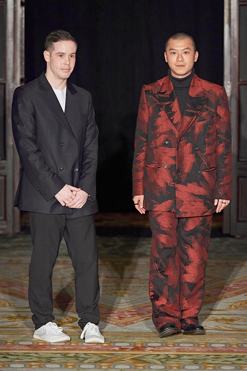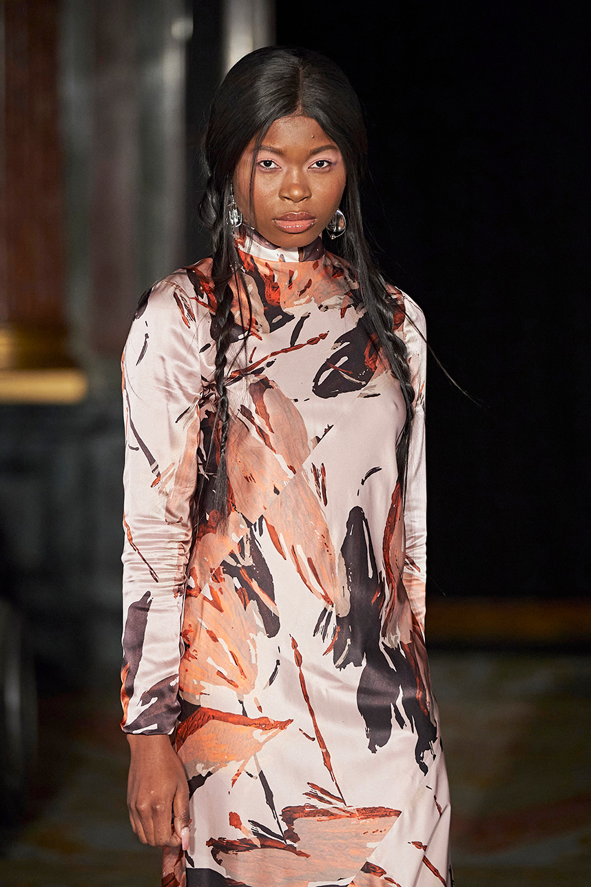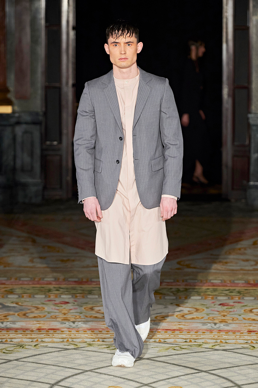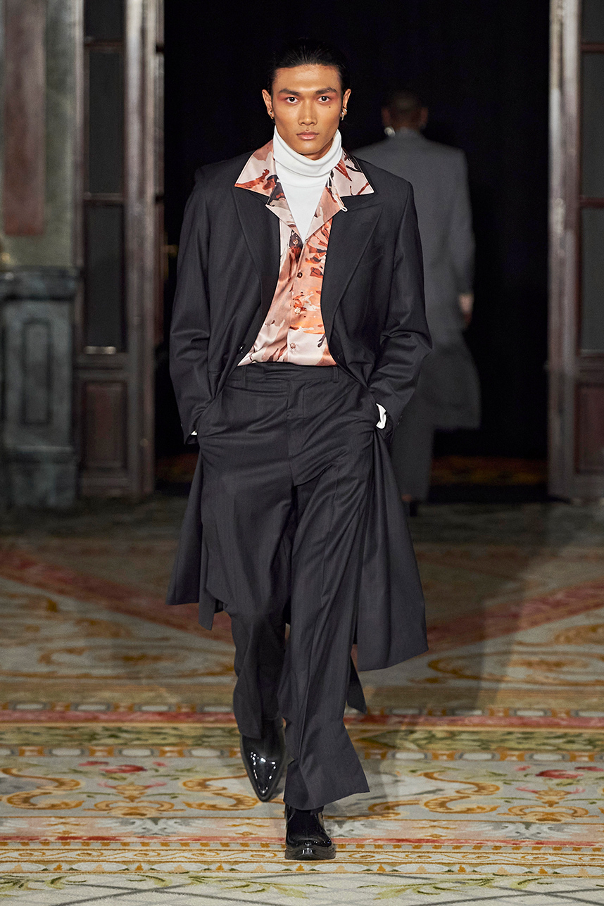 Rickyy Wong’s FW2020 collection « Chinostalgia » was a reflection on the cultural dynamism of Asia’s world cities of the 20th century – Hong Kong and Shanghai. The Hong Kong based designer label produced men’s and women’s collections focusing on high-end fabrics, finishes and textile design techniques representing the best of Asian craftsmanship. The collection rendered a romantic vision of the past in shades of pastel and soft grey, with flowing printed silks, pink and green sharp dressing, Japanese organic cotton suiting, organic silk dresses, crisp wool tailoring referencing the diverse fashion heritage of the region. Fresh and wearable pieces enveloped in a cohesive collection hallmarked by a beautiful abstract print in a pink and peach palette with earth tone highlights.