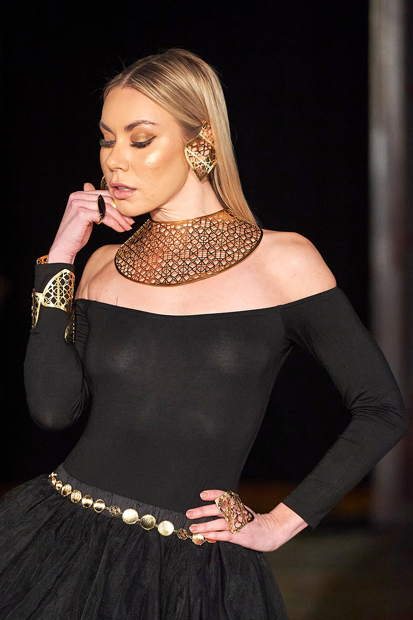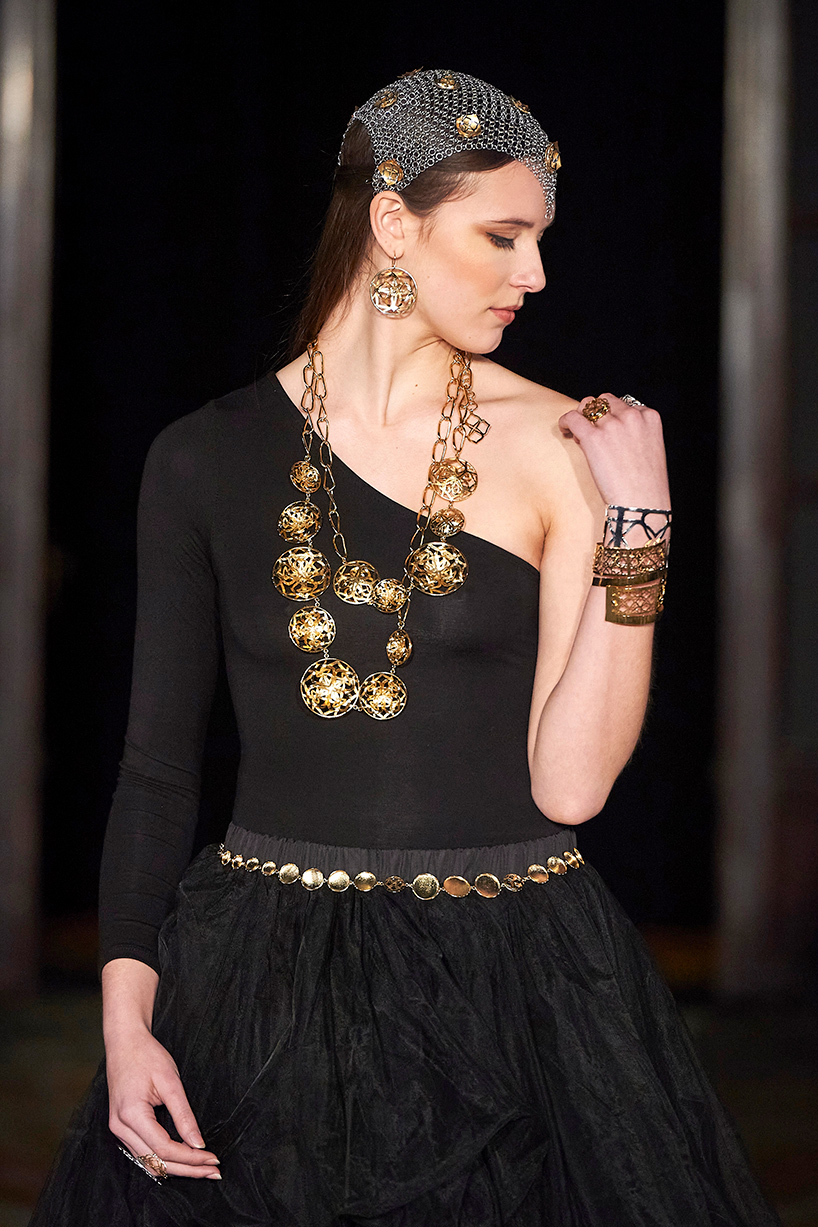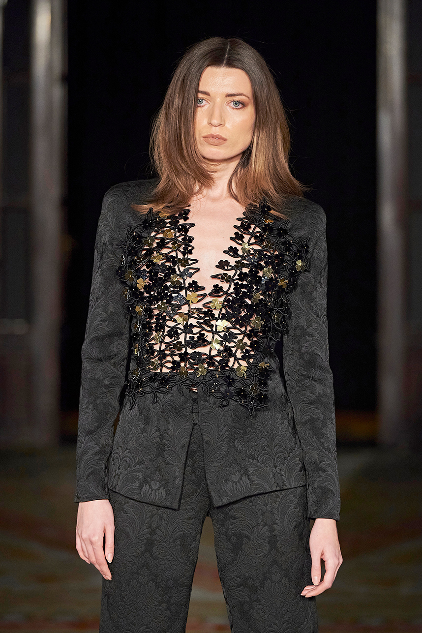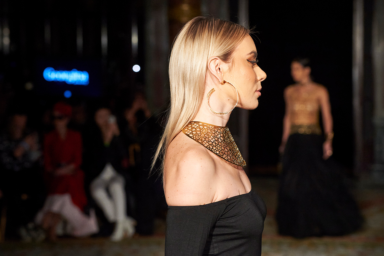 Australian native Jessica Tierney presented fashion brand Chained Couture featuring her signature stainless steel accessories with her collection titled, “Paris – 48.8566° N, 2.3522° E” The entire collection explored the conceptualisation of travel and the femininity in architecture within the city of Paris. Military inspired epliettes encrusted with crystals and studs, architectural draped gowns and stainless steel belted pieces that were captivating with design details such as cutouts as well as perfectly placed studs. The all black collection was created by hand in a Sydney atelier. Textured fabrics such as Merino wool and bridal tulle, layering and hand embellishments were used to amplify each look and create striking silhouettes utilizing a cohesive combination of hand embroidered beading and stainless steel accessories.