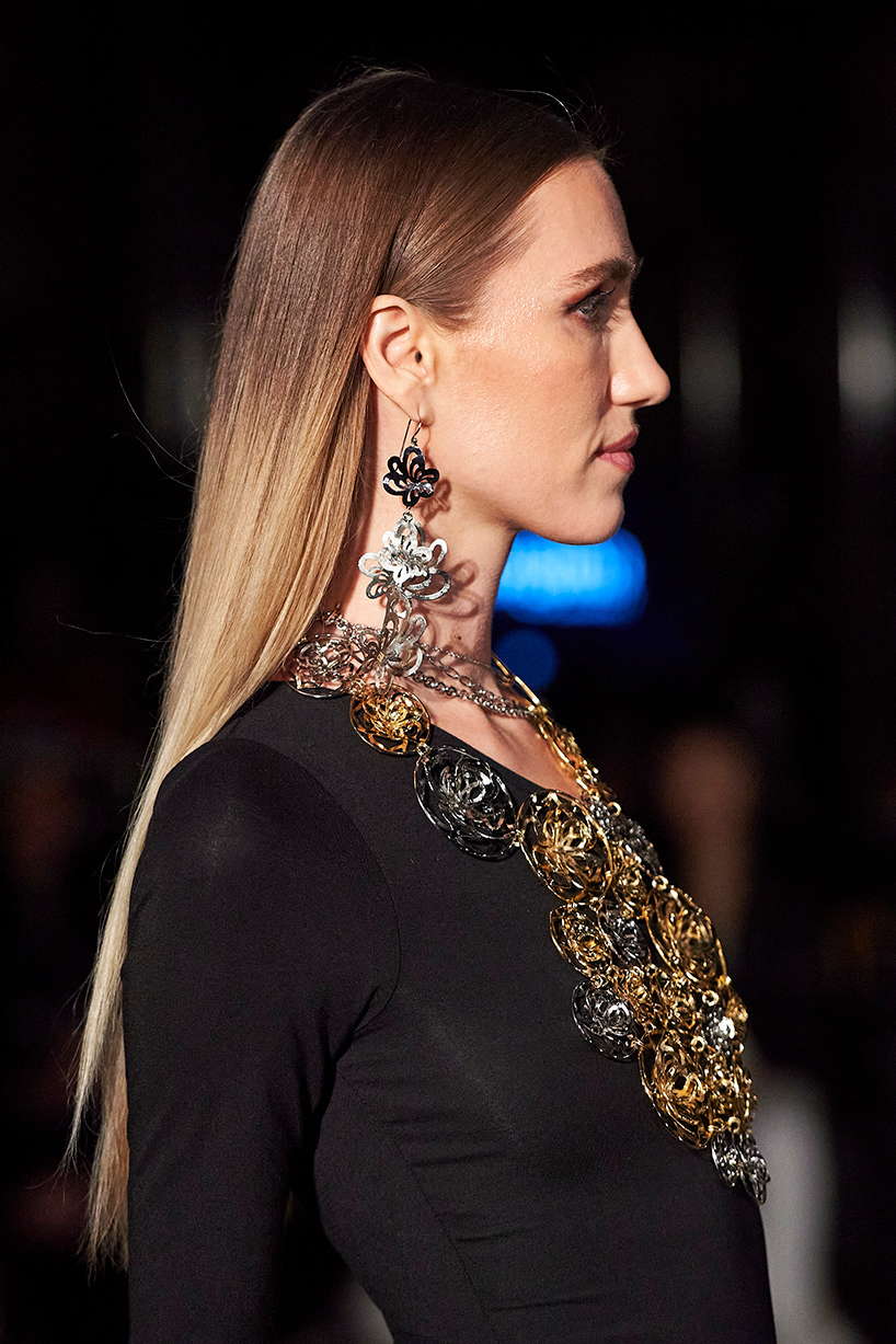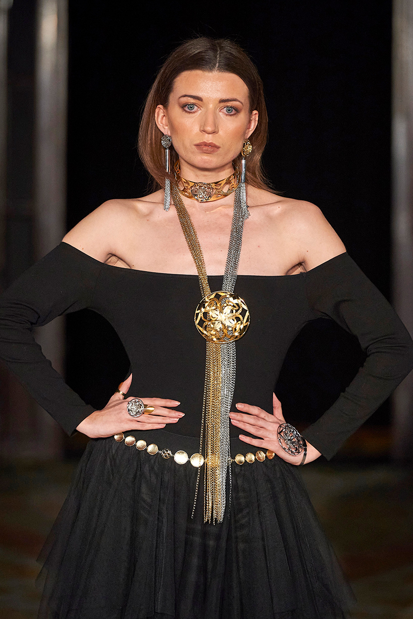 Missouri jewelry label, Georgina Jewelry presented her eye capturing collection “Bloom,” inspired by women and her Mexican heritage full of bold statement pieces. The designer Georgina Herrera fuses unique and authentic statement pieces from earrings to bold necklaces and arm cuffs and bust “chainmail” offering fresh, modern, yet classic design using gold, silver, and colored stones in magenta and purple.