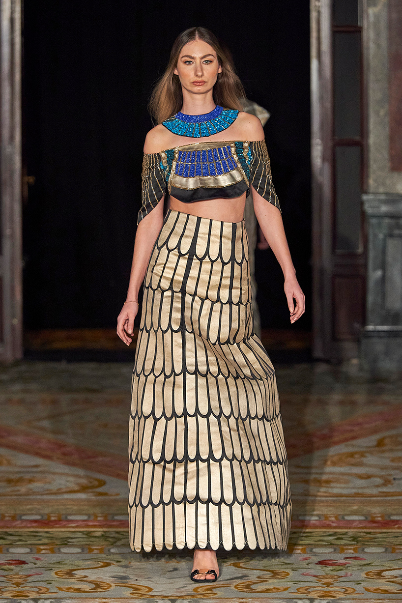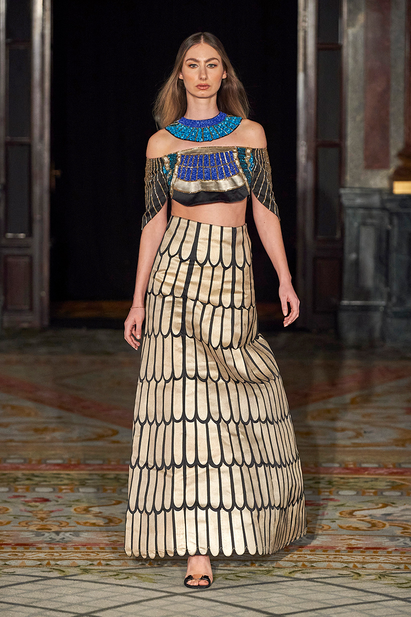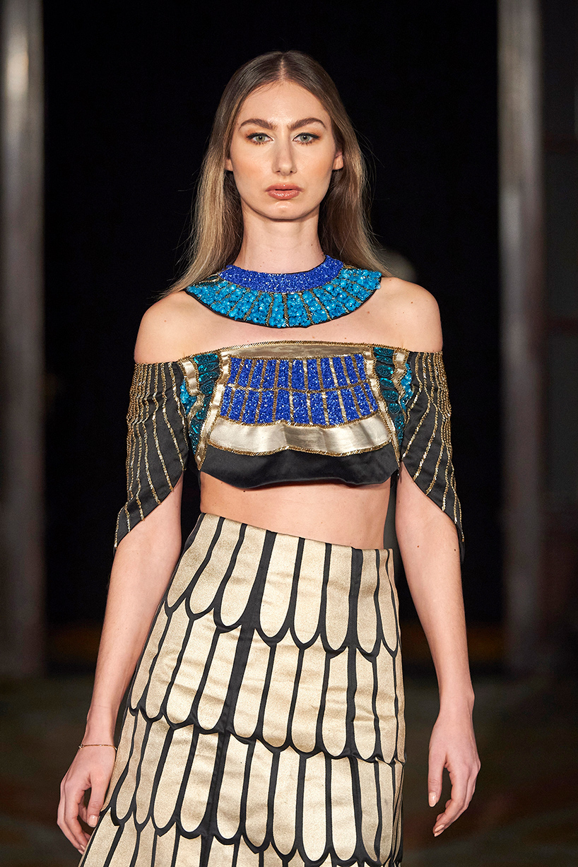 New Delhi based designer, Bani Pasricha, showcased her luxury Egyptian-inspired collection, “The Pharaoh,” full of shimmer and delight. Pasricha brought luxury fabrics and rich colors to the runway highlighting the designer’s love for nature, history and art. Elegant fabrics such as satin crepe, dutch satin, gold sheen tissue were used in the collection featuring a colorful array of gold, turquoise, black and white prints and patterns with bold shimmer and shine in interesting geometric patterns.