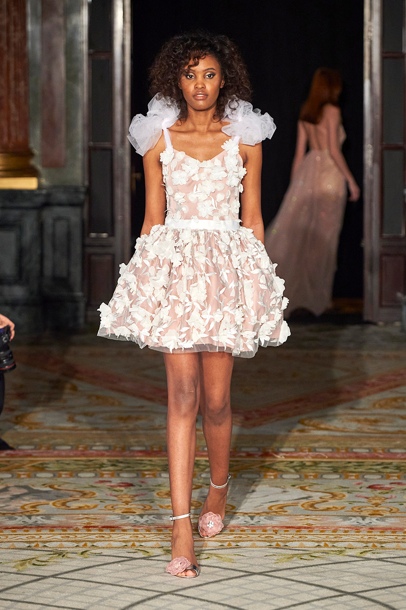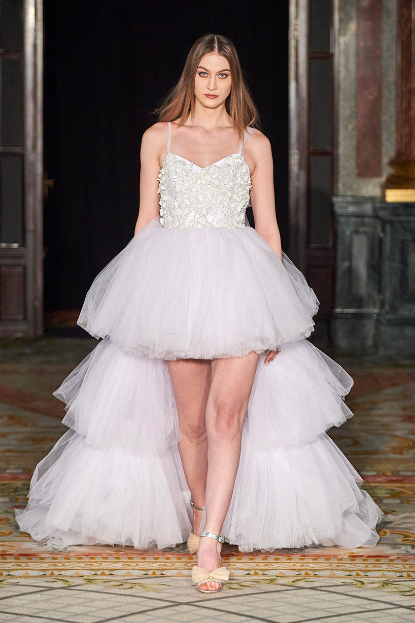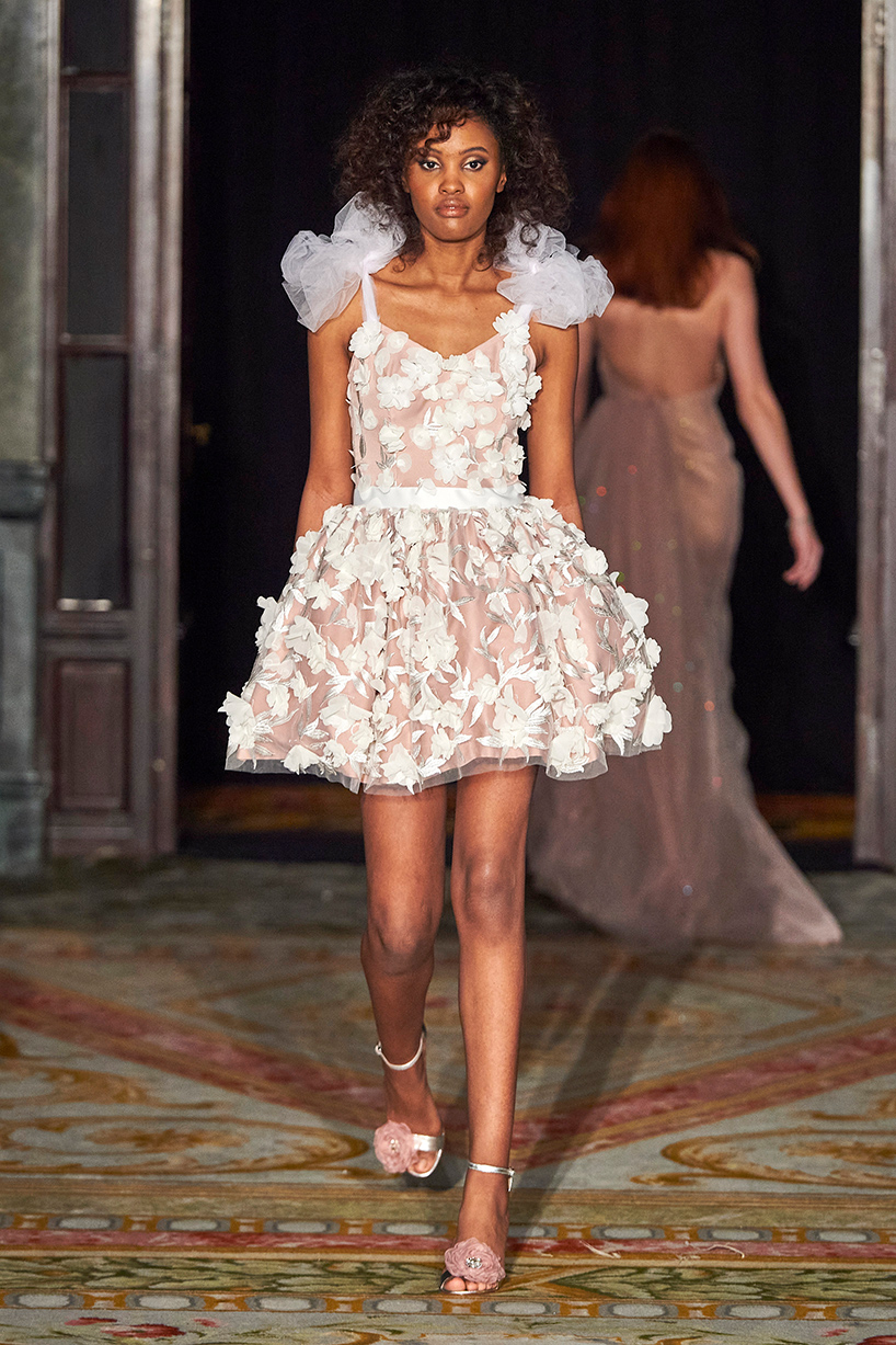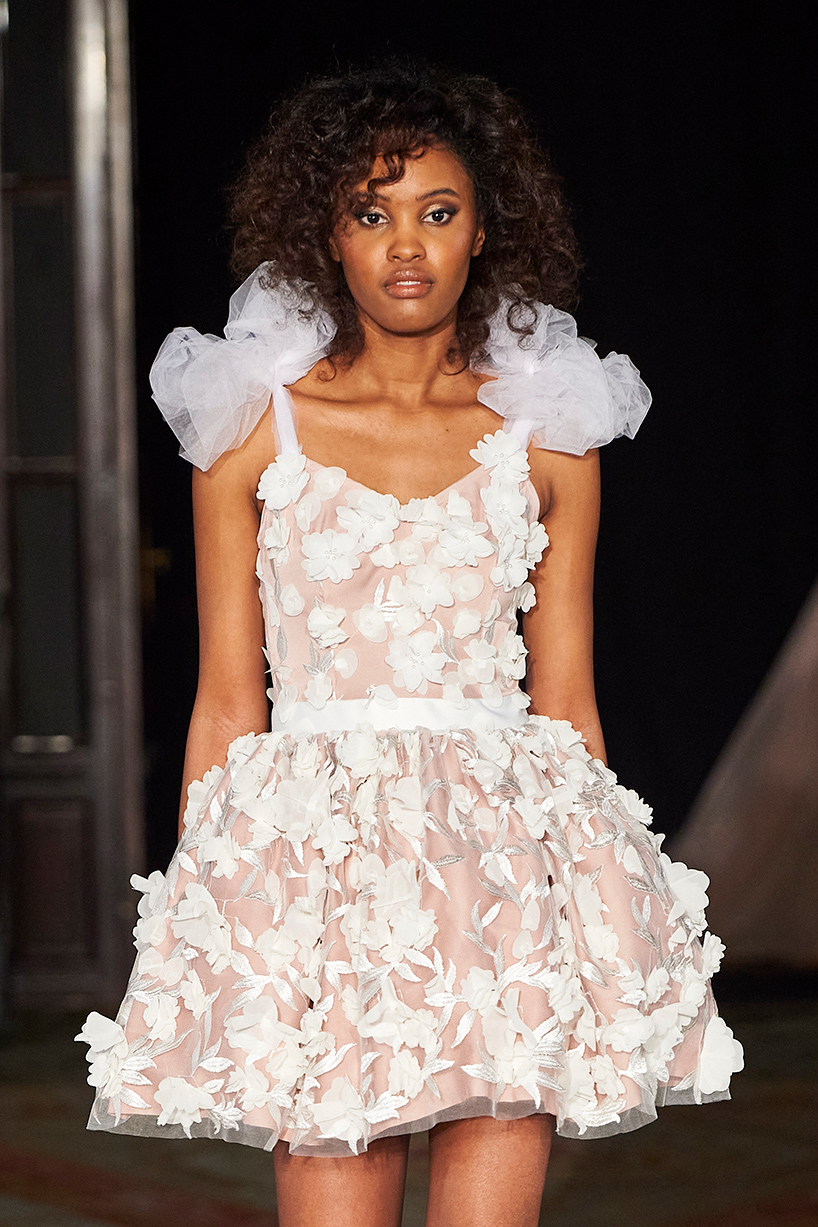 The collection titled “Andy” encompassed the finest artisan tailors to everyday womenswear pieces. The designer drew inspiration from pretty pastels and crystals merging haute couture and everyday with lace, tulle, and satin. Standout pieces included a tiered white tulle high low dress and a white belted bouffant cocktail dress with organza floral detail and tulle shoulder bows.