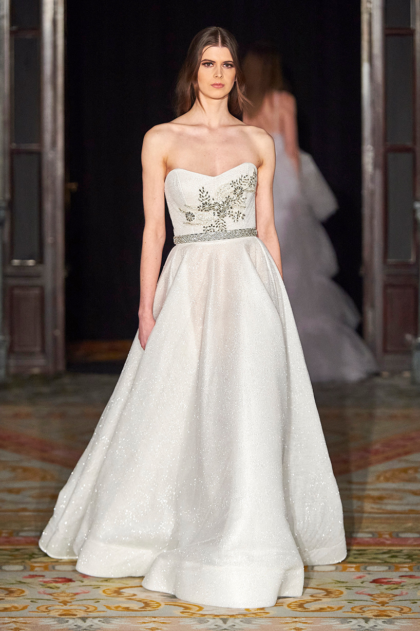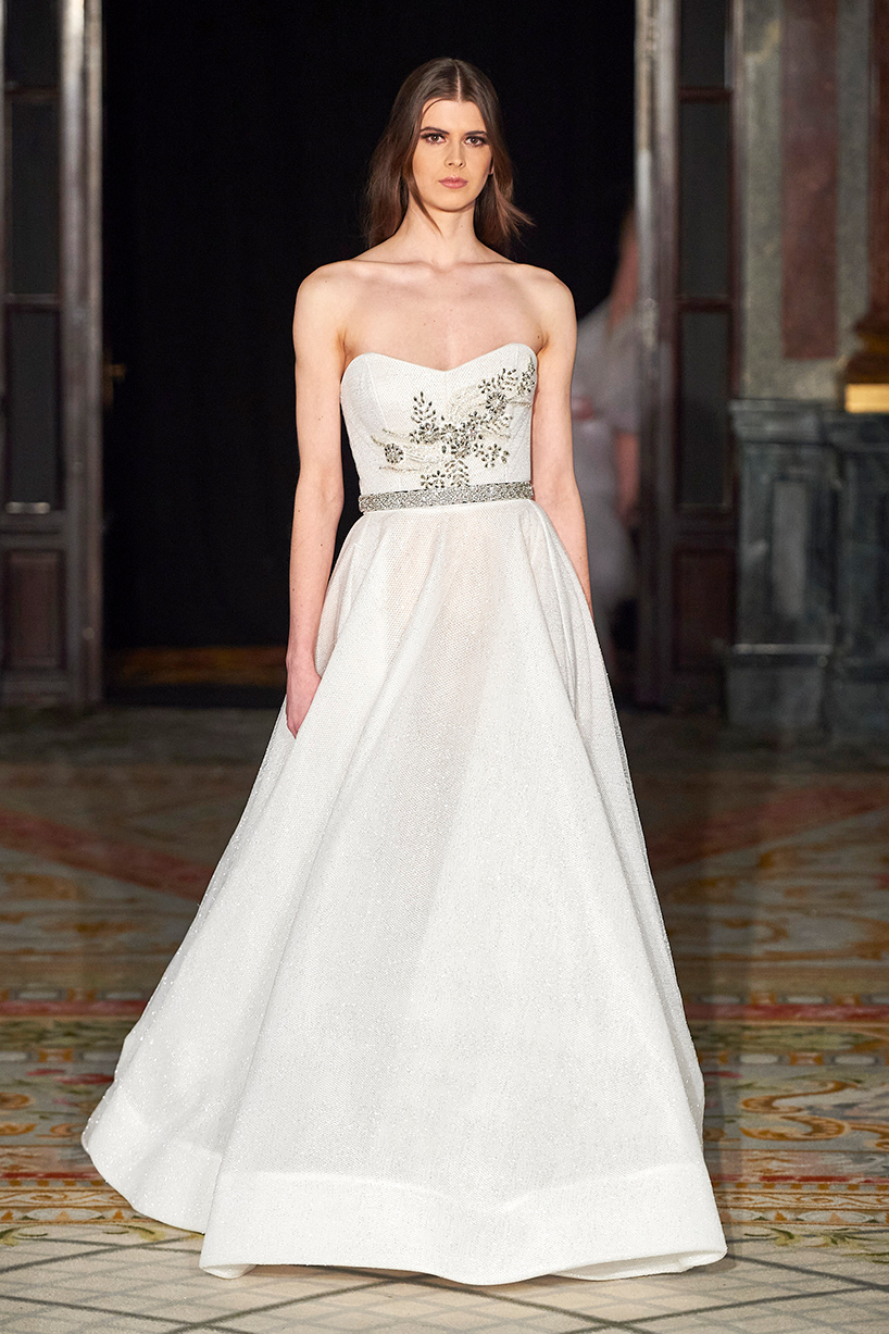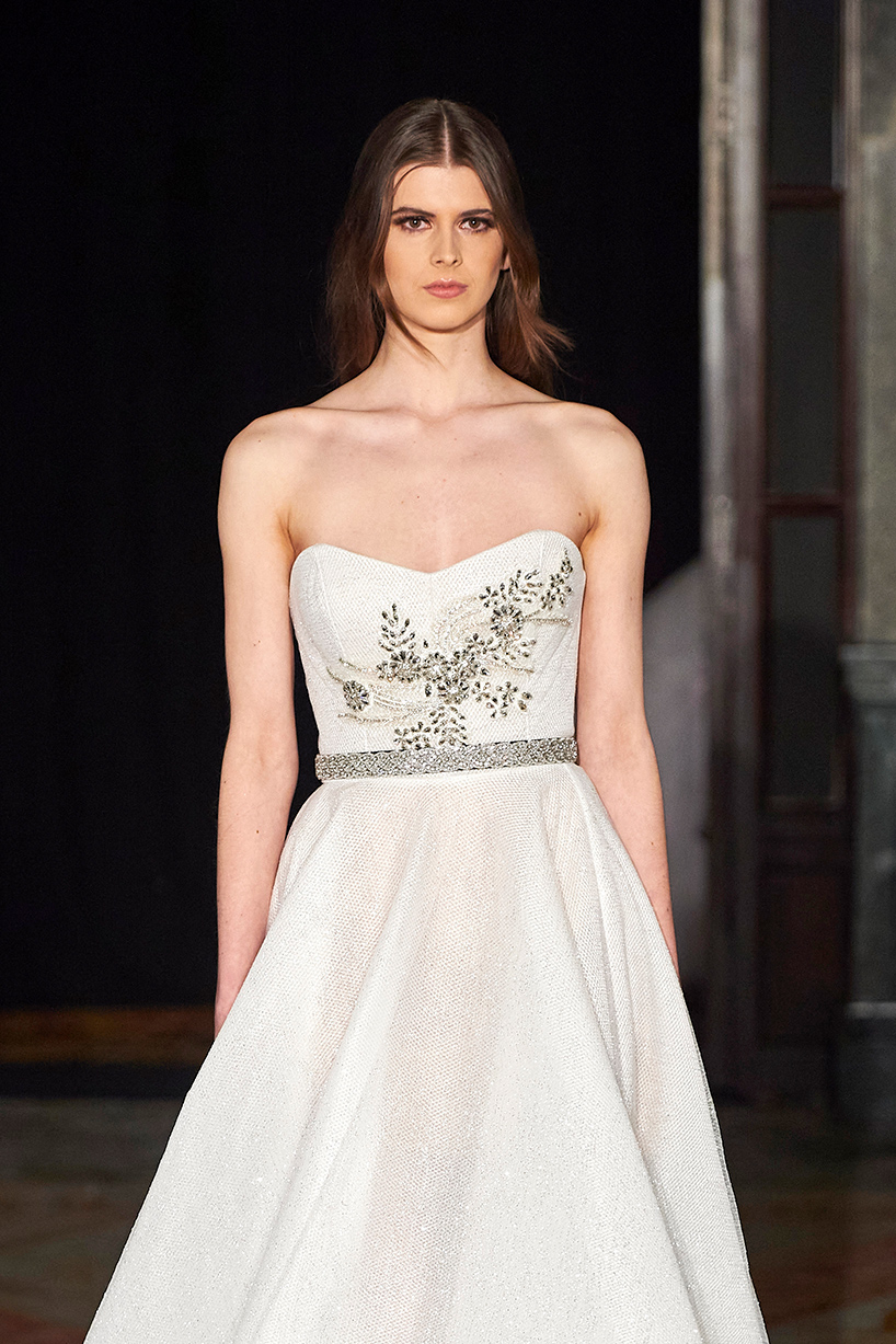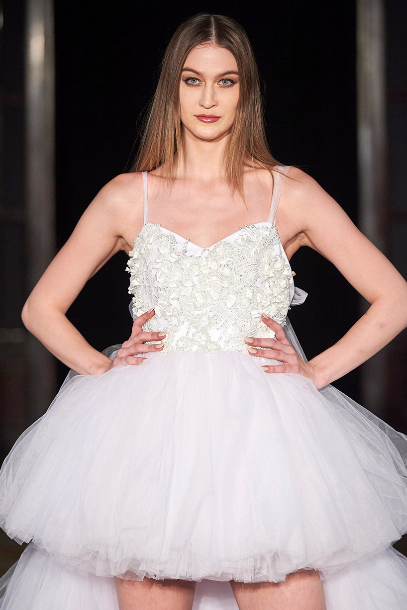 The collection titled “Andy” encompassed the finest artisan tailors to everyday womenswear pieces. The designer drew inspiration from pretty pastels and crystals merging haute couture and everyday with lace, tulle, and satin. Standout pieces included a tiered white tulle high low dress and a white belted bouffant cocktail dress with organza floral detail and tulle shoulder bows.