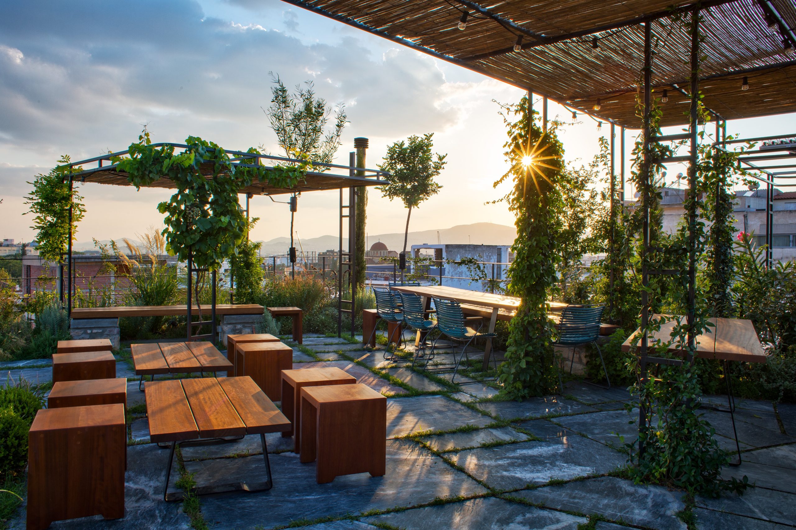 Le toit de l’immeuble rĂ©interprète la cour typique d’une habitation grecque traditionnelle, tout en offrant un lieu de rencontre, de dĂ©tente et de divertissement verdoyant et ombragĂ©. Au milieu de la vĂ©gĂ©tation exclusivement grecque d’oliviers et de grenadiers, de lavande, de plantes parfumĂ©es et de pergolas bordĂ©es de vignes, une passerelle de dalles de marbre est formĂ©e qui oriente le regard du spectateur vers diffĂ©rents chemins visuels. Ainsi, les clients peuvent profiter d’une vue imprenable sur l’Acropole, la colline de Philopappou, l’Observatoire et le quartier de Gazi avec la possibilitĂ© supplĂ©mentaire de savourer des pizzas maison et des saveurs mĂ©diterranĂ©ennes fraĂ®ches associĂ©es Ă des cocktails artisanaux. Plusieurs constructions individuelles, telles que des supports en marbre, des pergolas en mĂ©tal avec une toiture en roseau traditionnel, de nouvelles balustrades en mĂ©tal influencĂ©es par le Bauhaus grec, ainsi que l’ajout d’un four Ă bois, contribuent Ă relier l’espace avec le paysage historique qui l’entoure , amĂ©liorant encore l’expĂ©rience du visiteur.