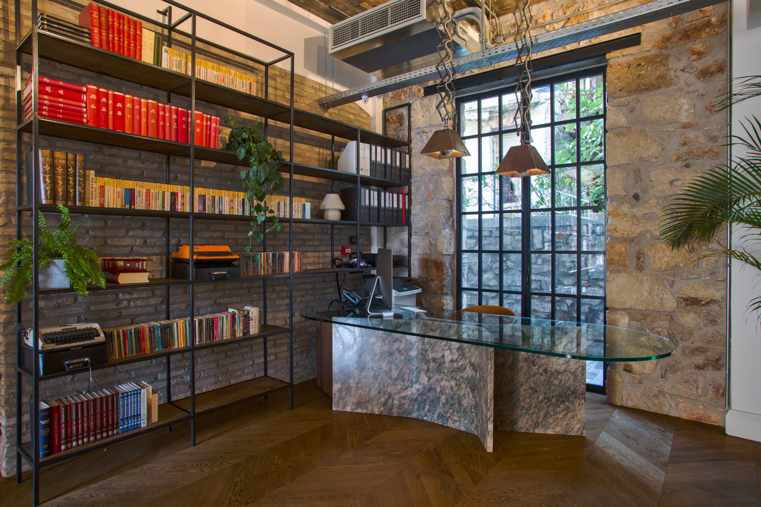 En entrant dans THE FOUNDRY Suites Athènes, une rĂ©ception et un salon accueillants vous attendent. Une bibliothèque sur mesure attire votre attention – un hommage Ă l’histoire d’imprimerie du bâtiment – ainsi qu’une vitre sur le sol en bois massif donnant sur la cave de l’hĂ´tel, qui a Ă©mergĂ© de la dĂ©couverte de l’ancien rĂ©servoir de l’usine lors de la reconstruction. Le rĂ©servoir a Ă©tĂ© conservĂ© et remodelĂ© – en raison de son microclimat pratique – dans une zone de stockage pour les vins et produits sĂ©lectionnĂ©s de toute la Grèce.