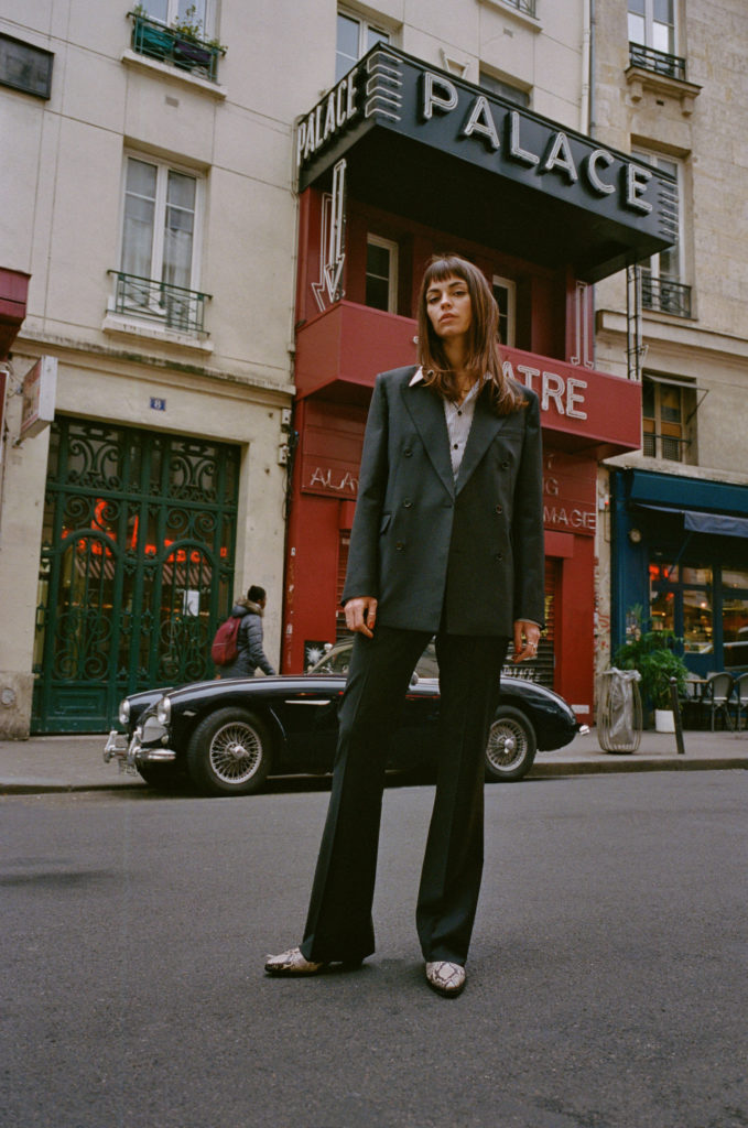 La collection d’une vingtaine de silhouettes se compose de vestes croisées aux coupes droites, de pantalons flare, de chemises à cols pointus, de cabans courts croisés ou encore de peau lainée oversize ainsi que de western boots en python…
