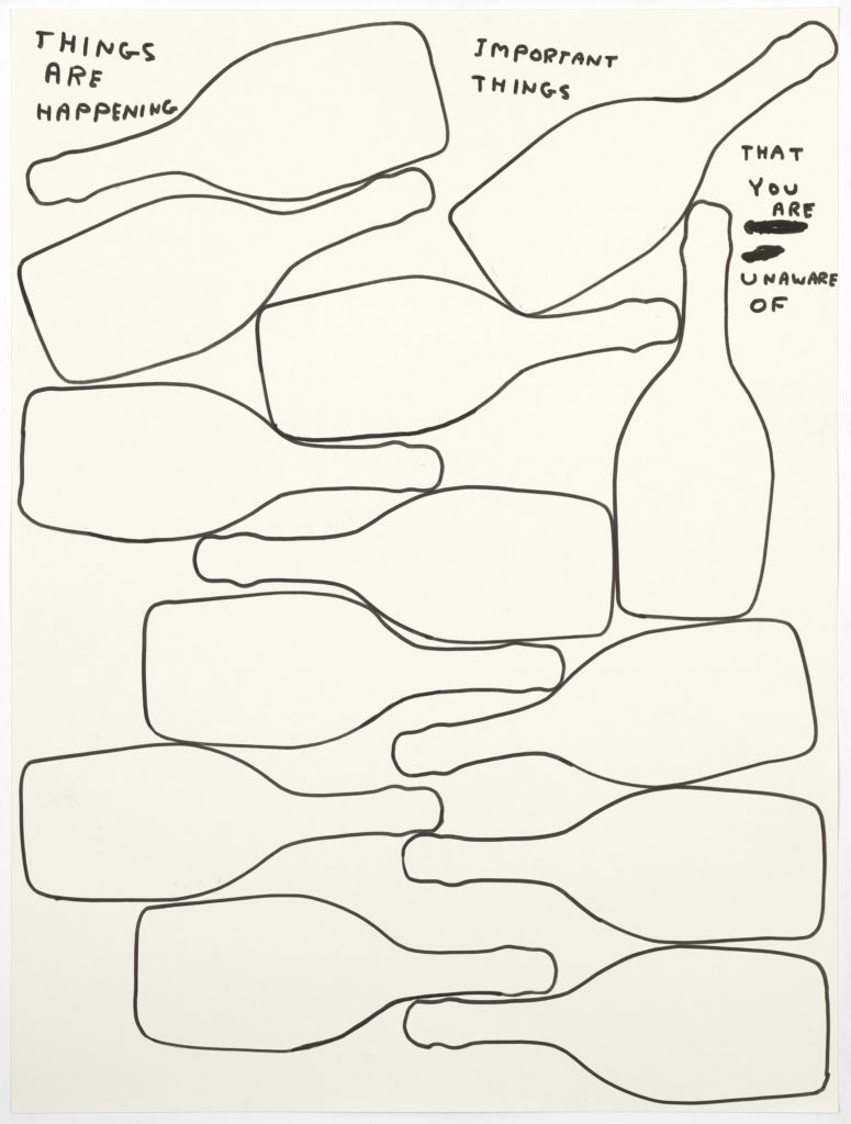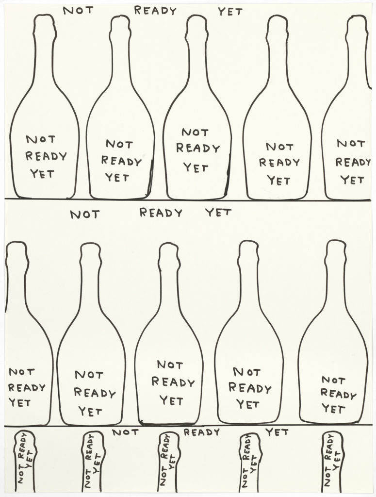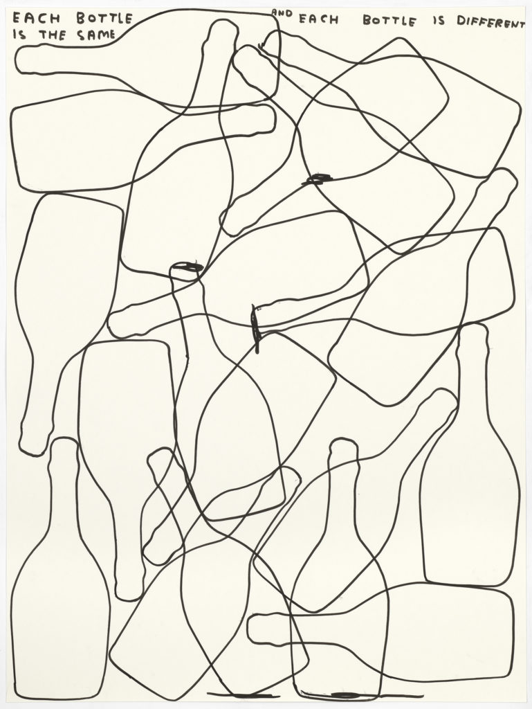 « Lorsque l’on décide de faire une œuvre sur le thème de la fabrication du champagne : il faut visiter plusieurs fois la région champenoise ; il faut échanger avec les professionnels en les écoutant attentivement, puis visiter les crayères, les vignes et les installations de production ; il faut apprendre à déguster du champagne. » explique David Shrigley.