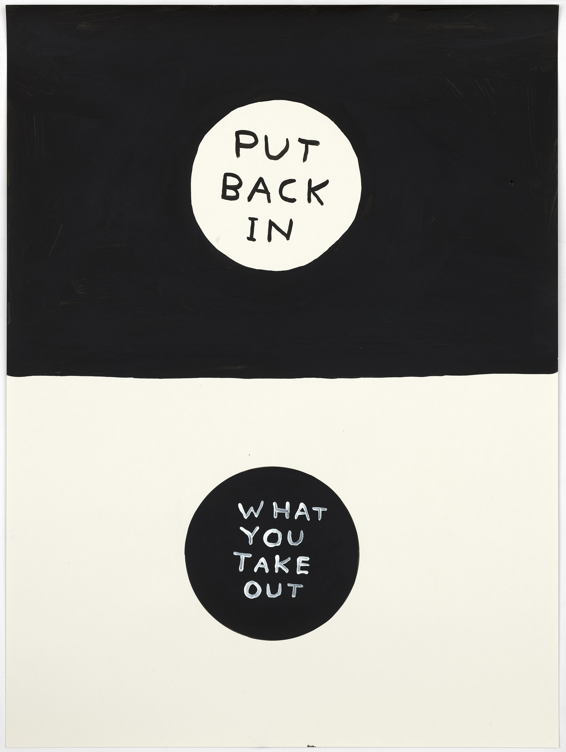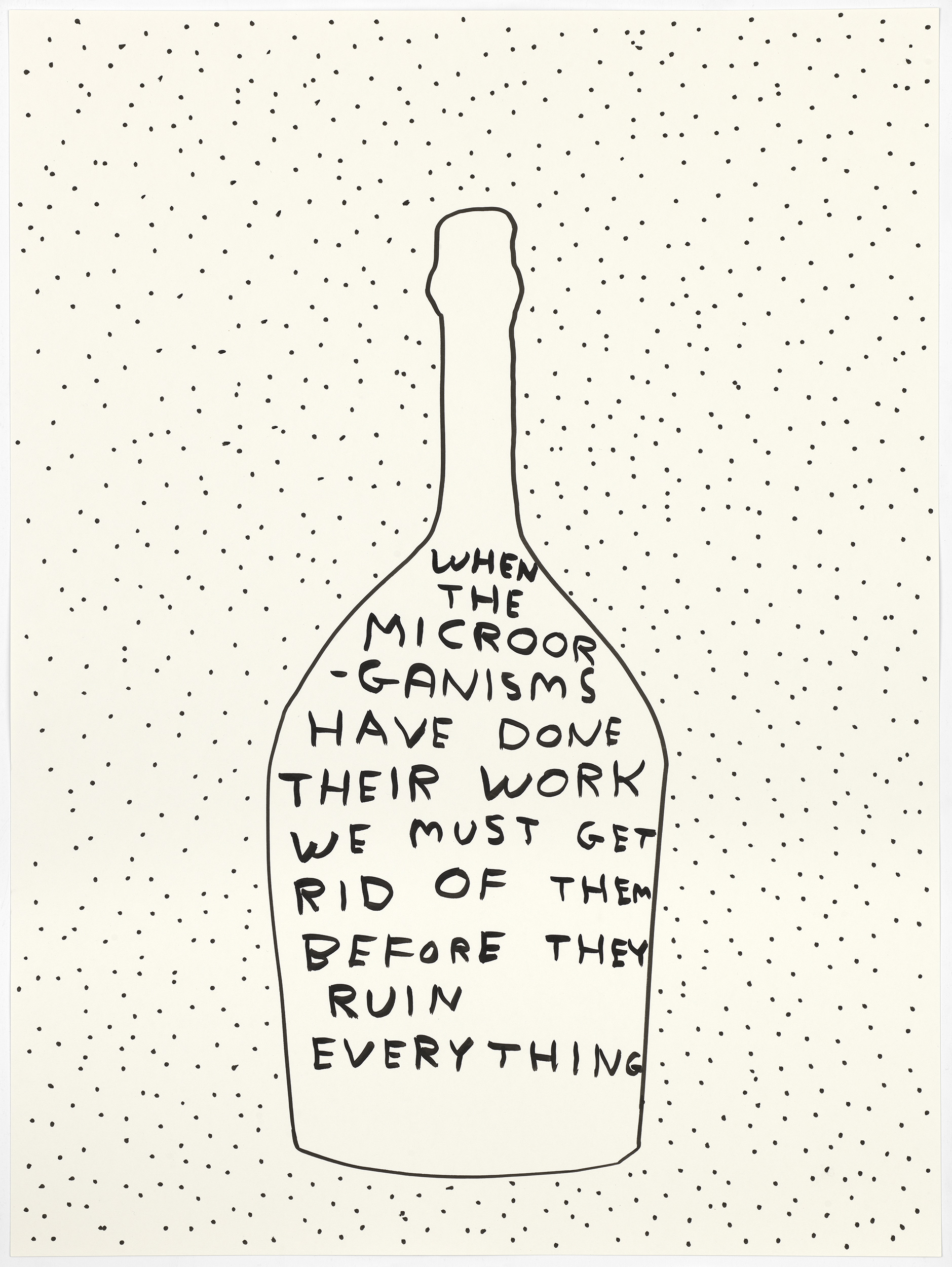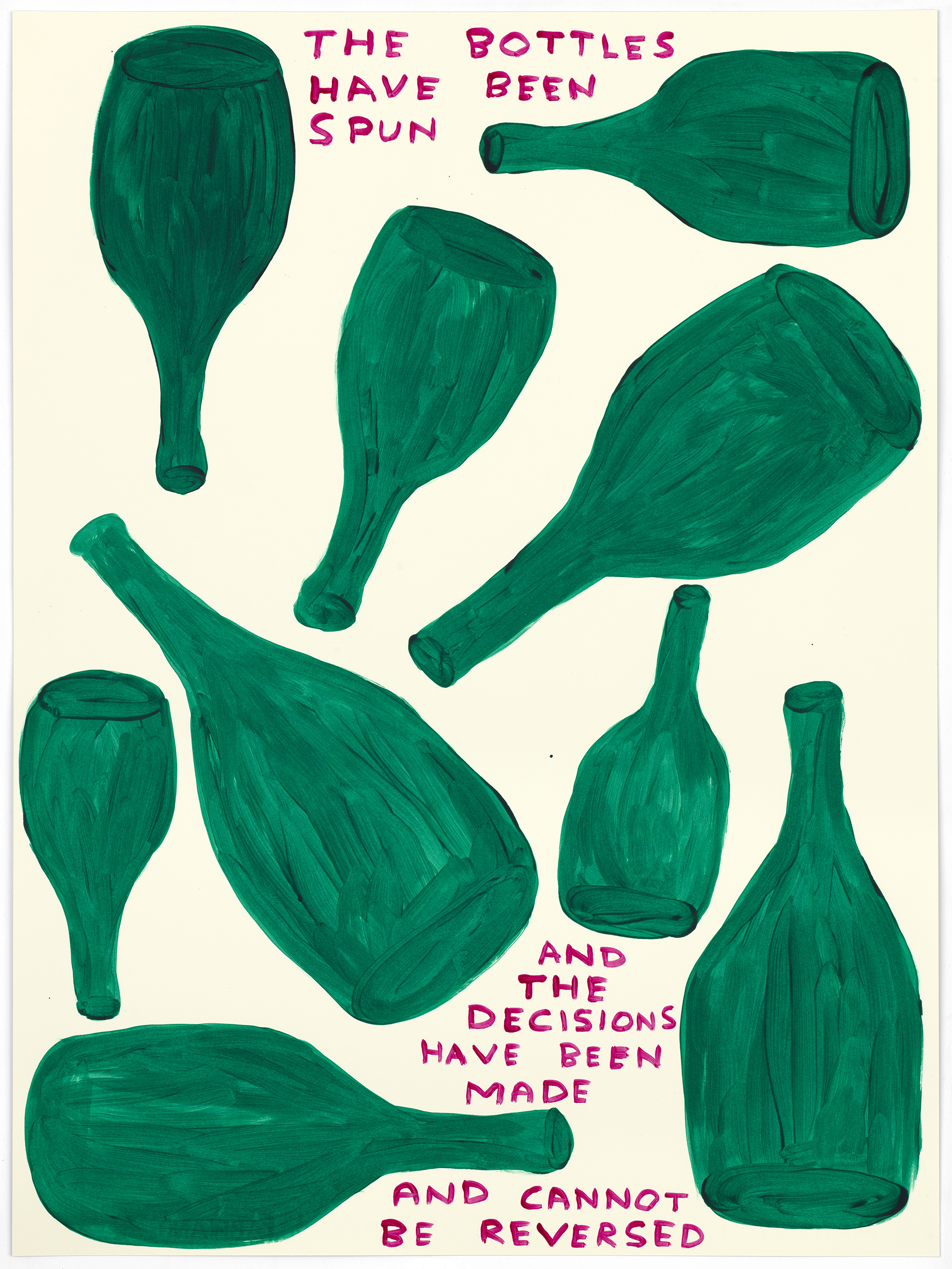 « Lorsque l’on décide de faire une œuvre sur le thème de la fabrication du champagne : il faut visiter plusieurs fois la région champenoise ; il faut échanger avec les professionnels en les écoutant attentivement, puis visiter les crayères, les vignes et les installations de production ; il faut apprendre à déguster du champagne. » explique David Shrigley.