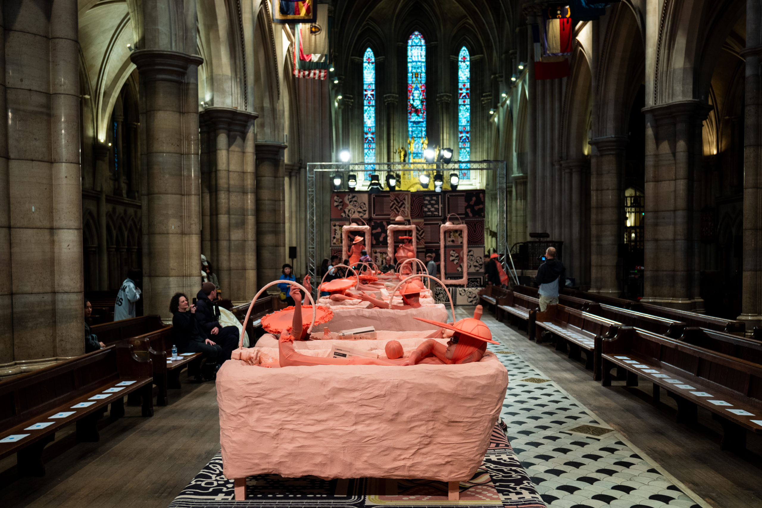 body movement and pulse. The spirituality and mental peace of the bathing is juxtaposed with the religious space of the cathedral hall and visualizes a space – both communal and private – build on rituals and routines.