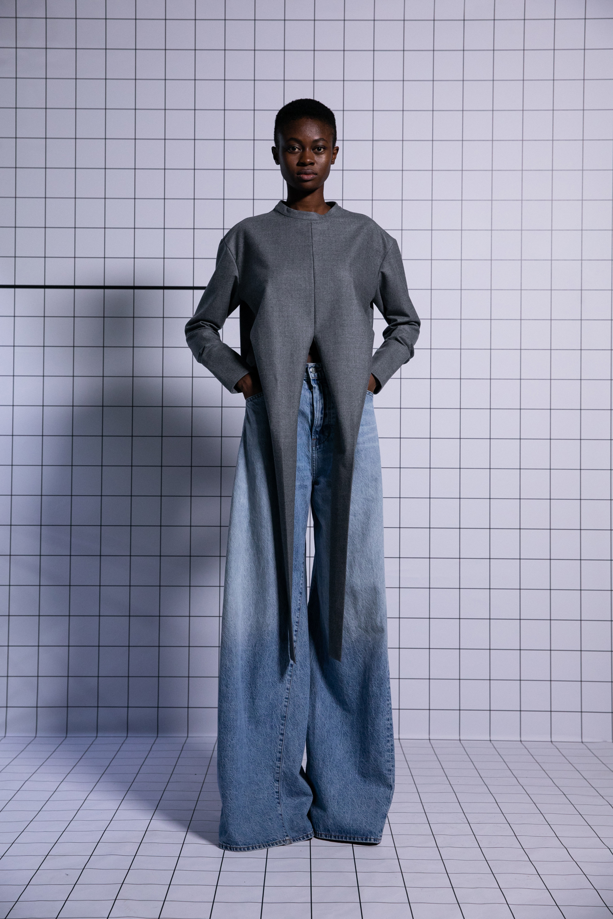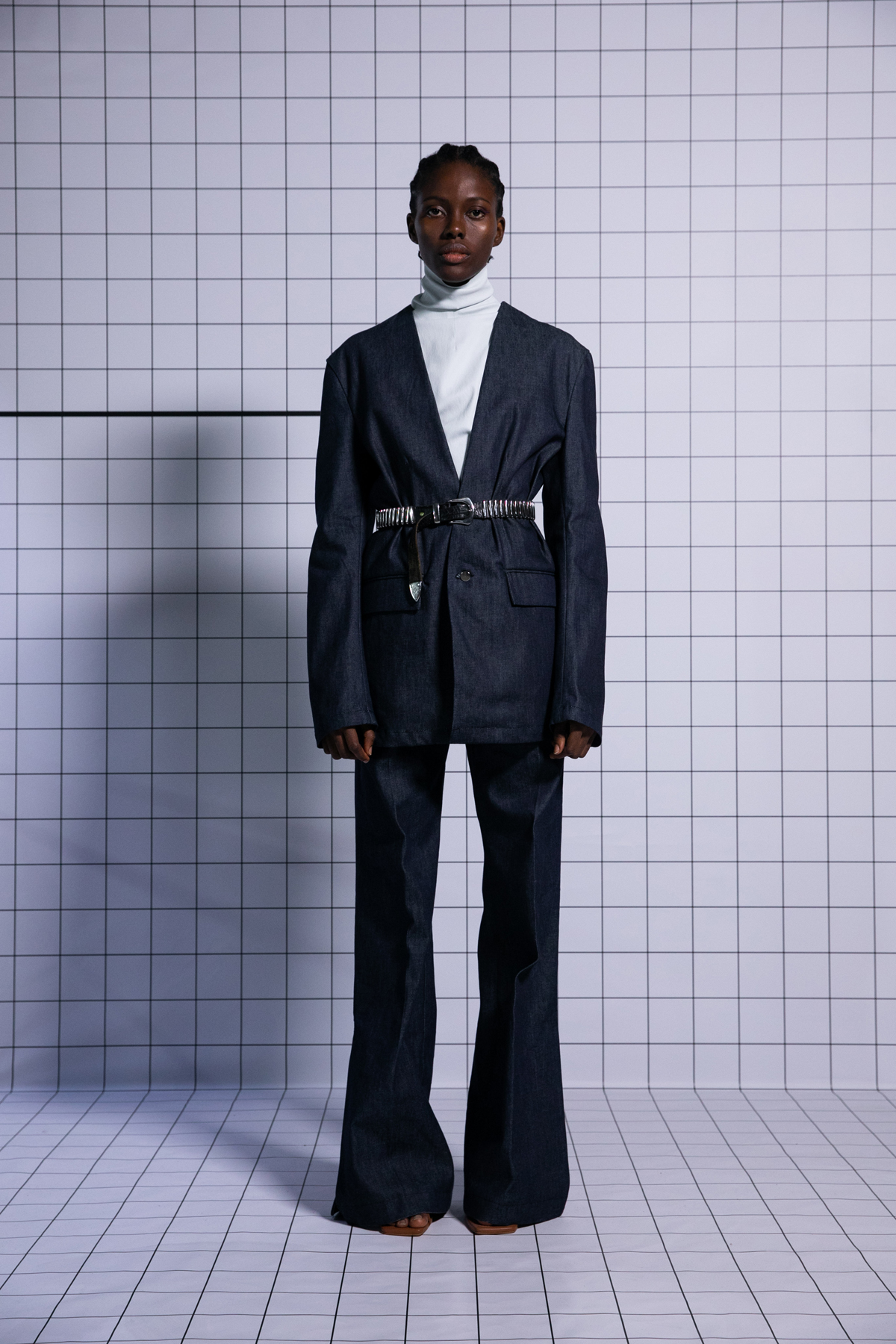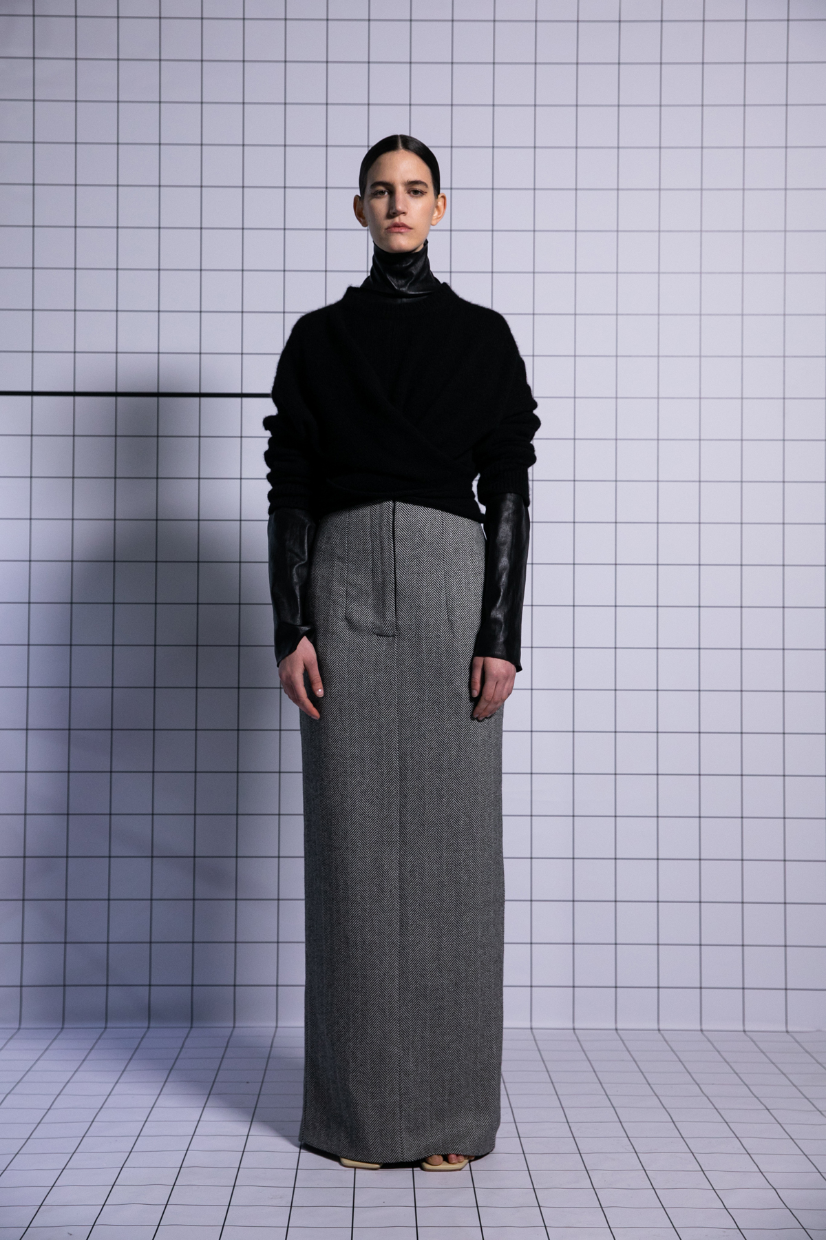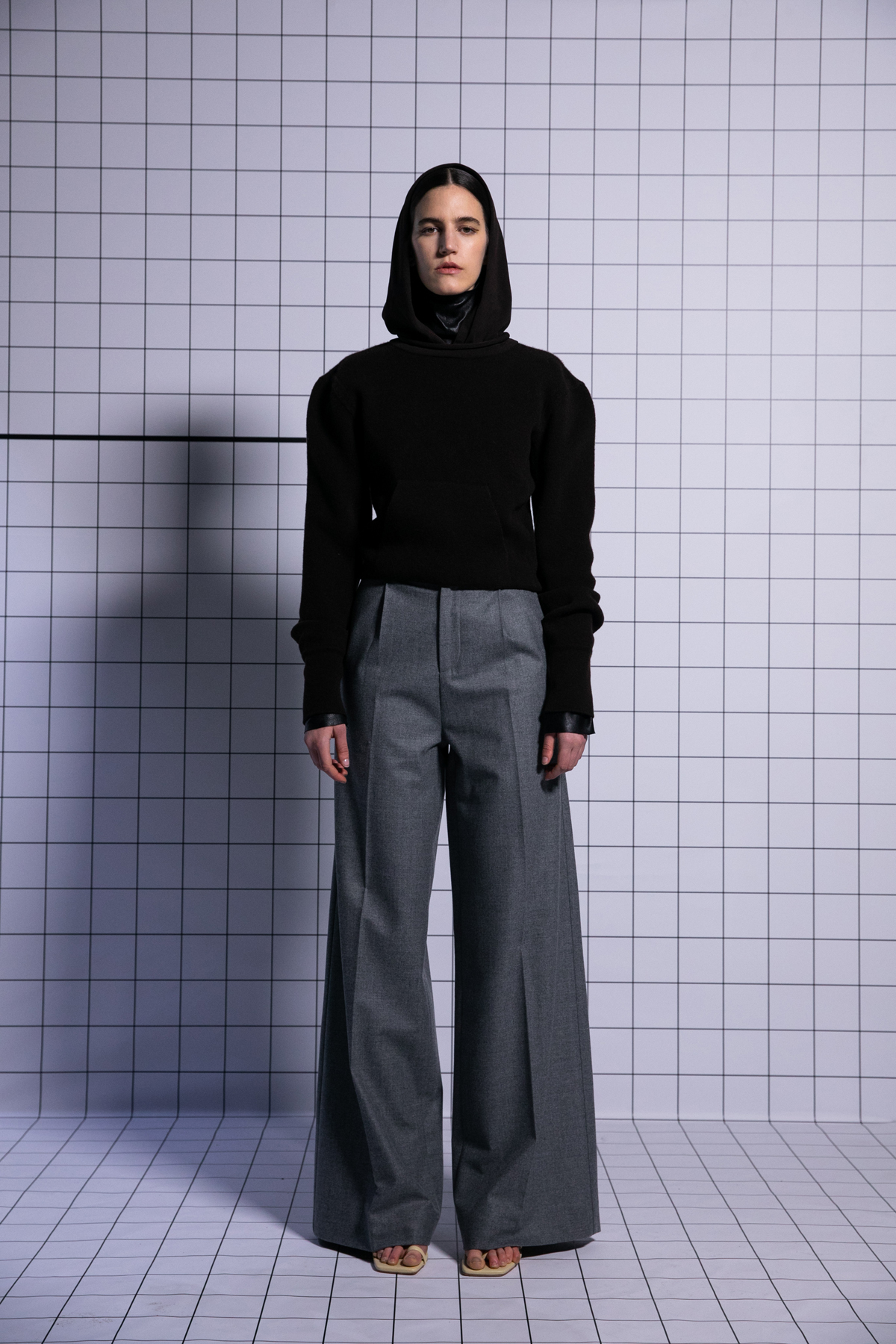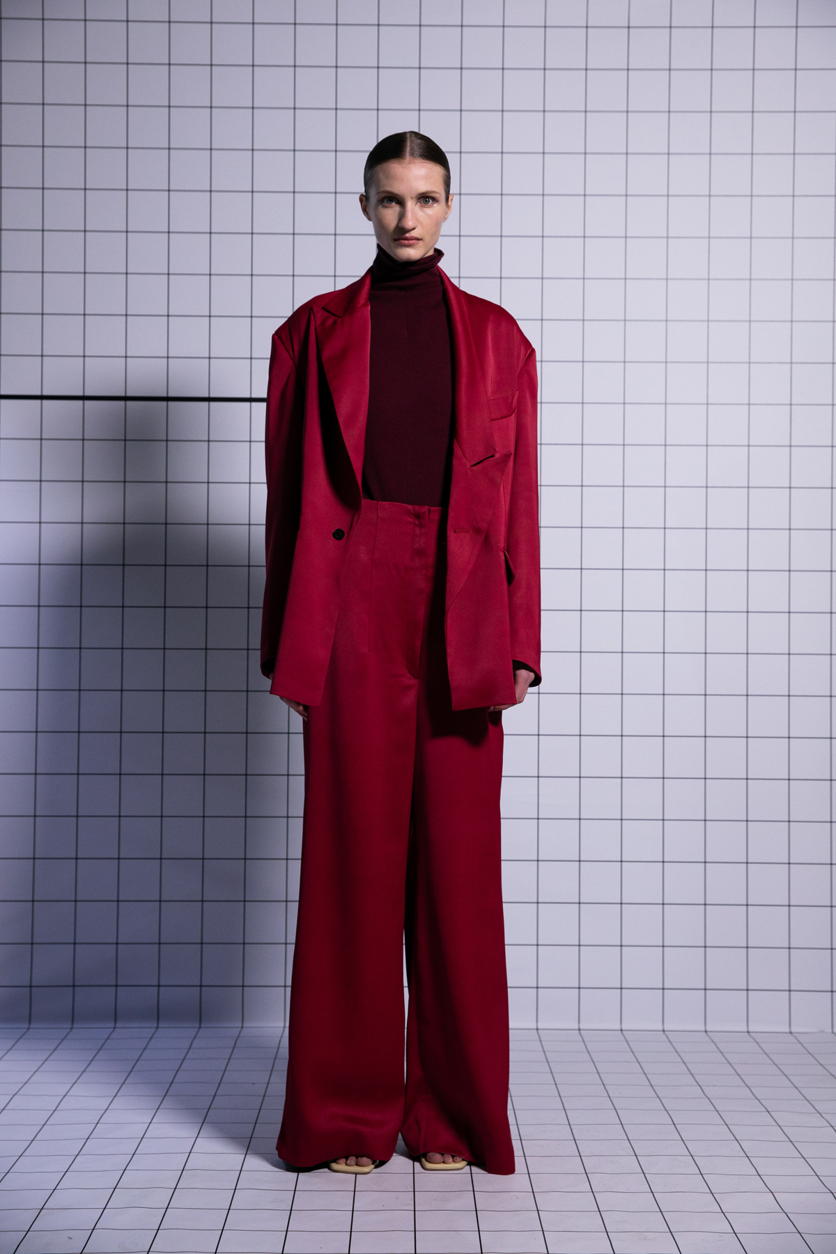 Les volumes des silhouettes sont androgynes, tout en conservant une certaine sophistication et un chic très féminin. Le designer crée des carrures aux épaules larges, dessinant parfois une silhouette stricte et monolithique, et ailleurs marquant la taille l’extrême.
