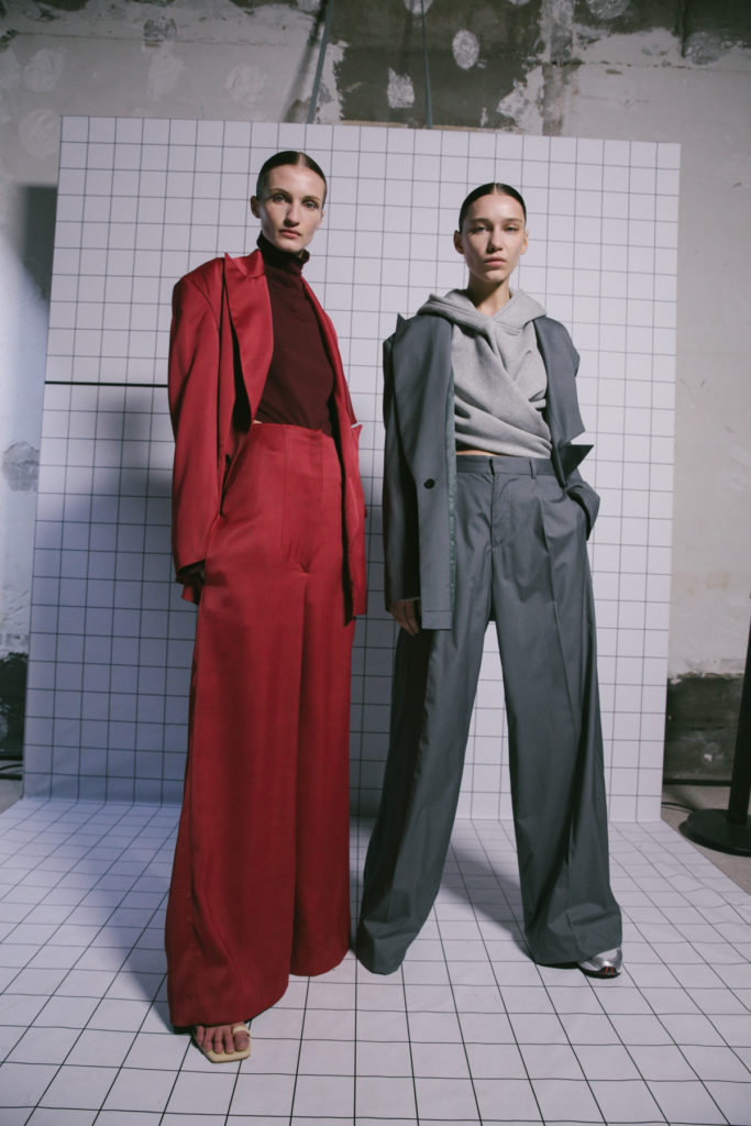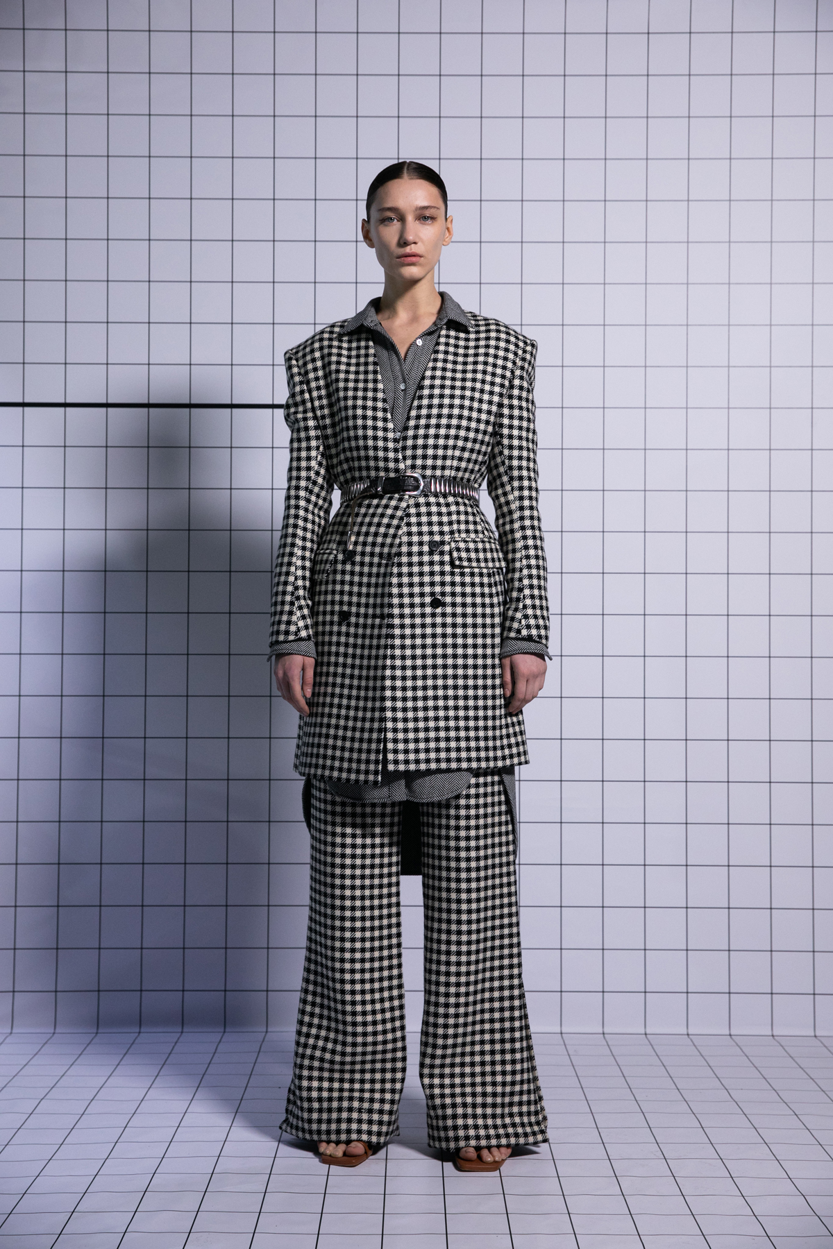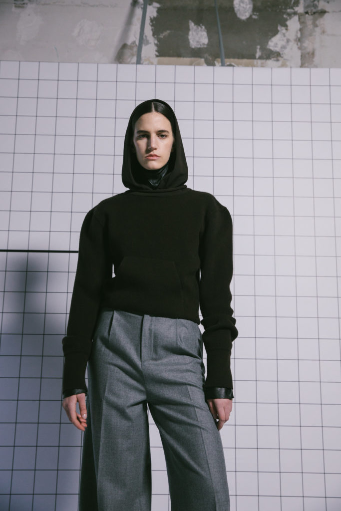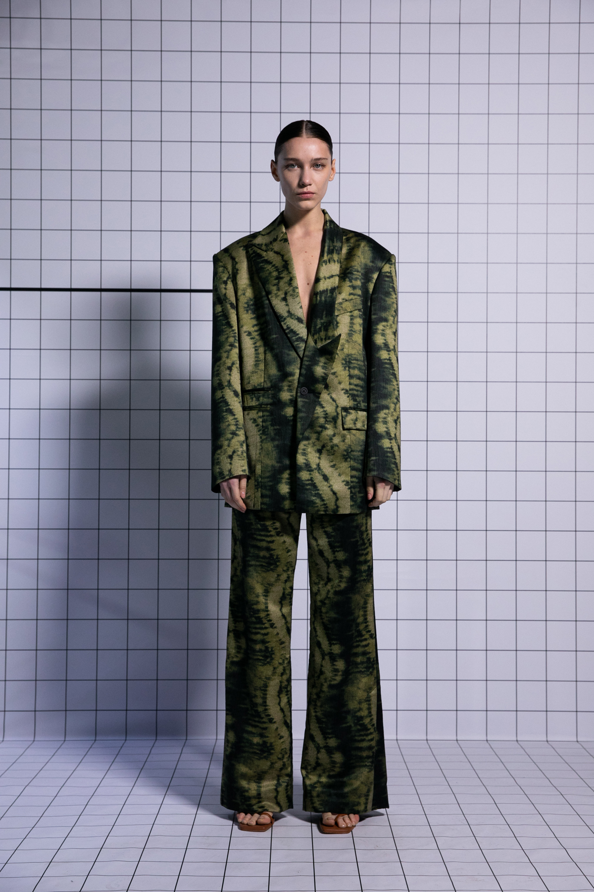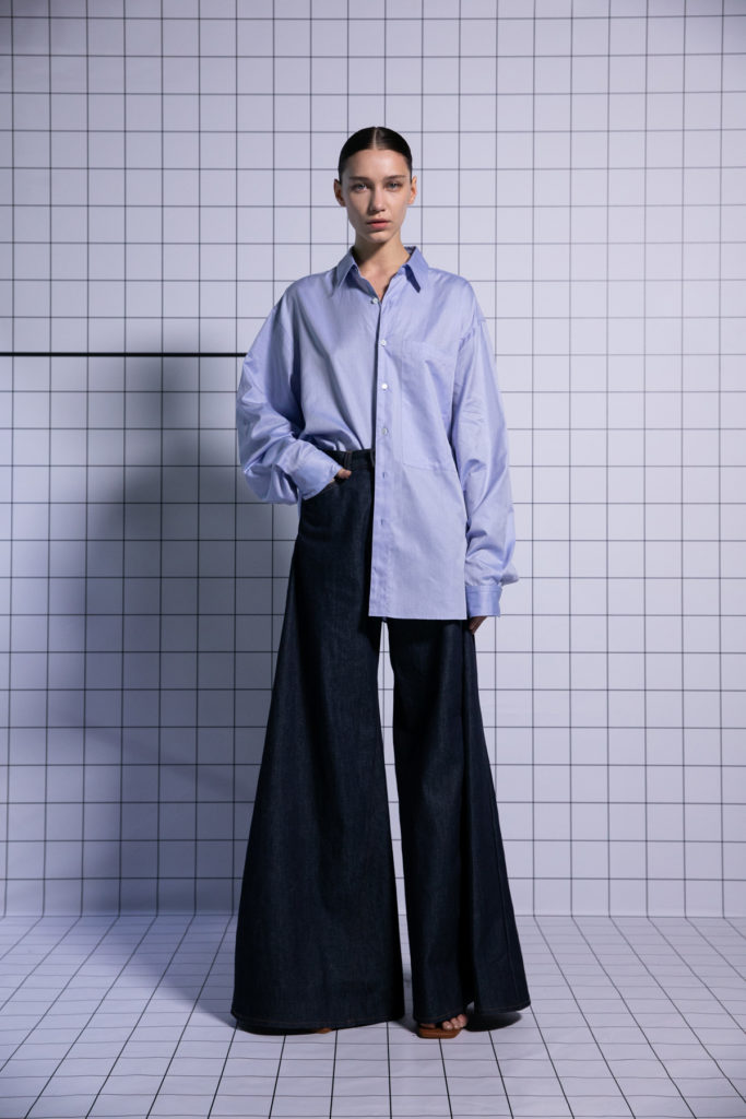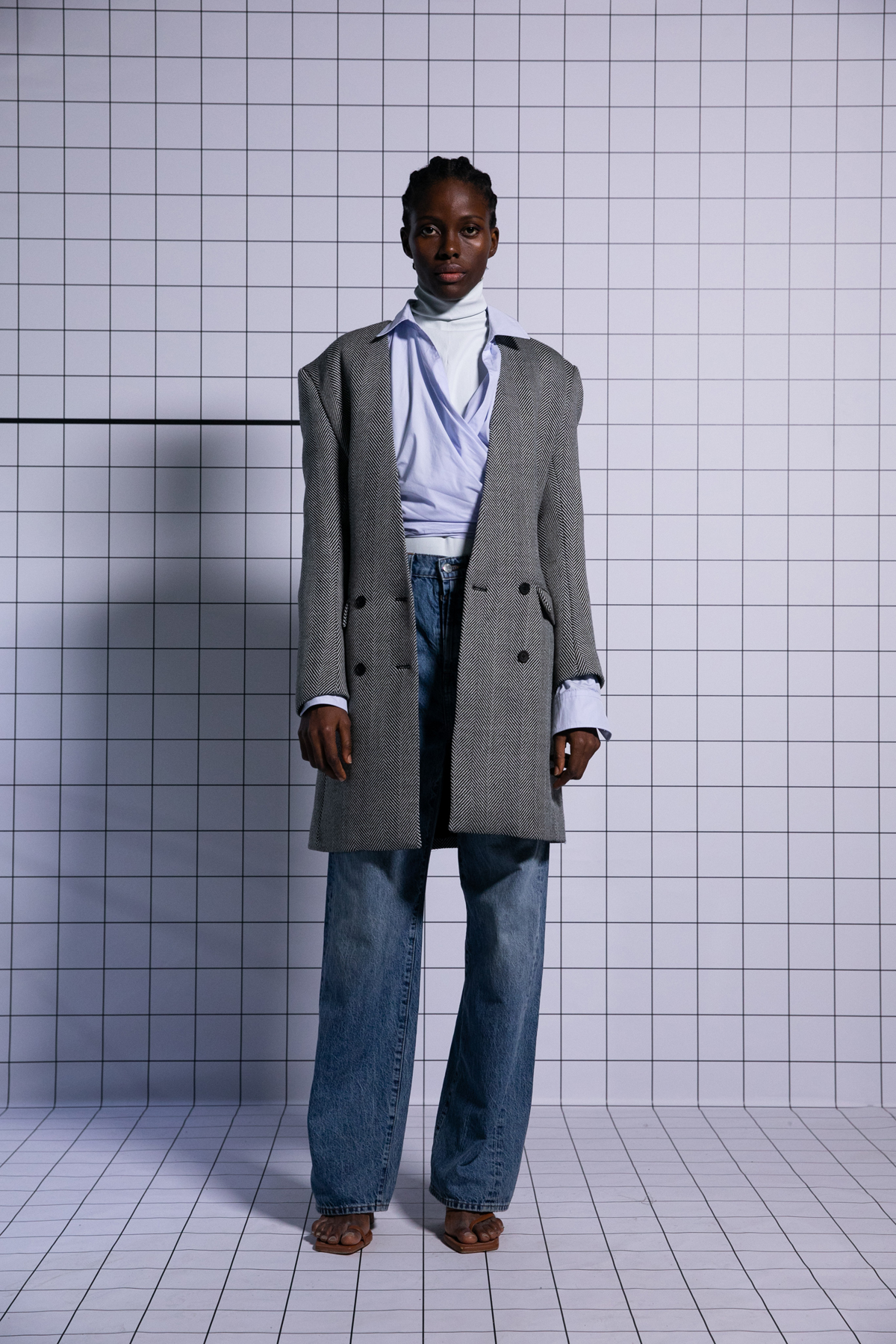 Les volumes des silhouettes sont androgynes, tout en conservant une certaine sophistication et un chic très féminin. Le designer crée des carrures aux épaules larges, dessinant parfois une silhouette stricte et monolithique, et ailleurs marquant la taille l’extrême.