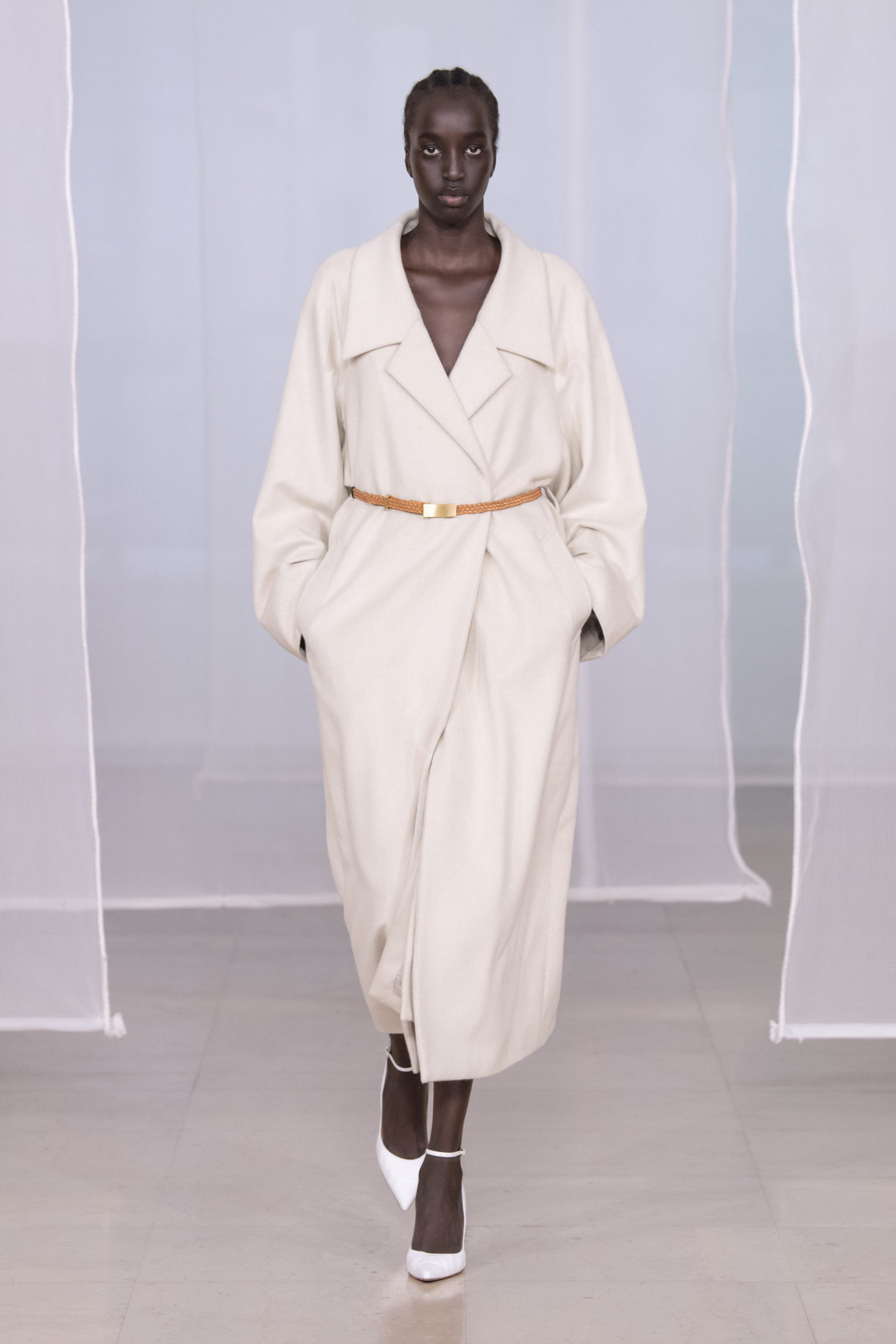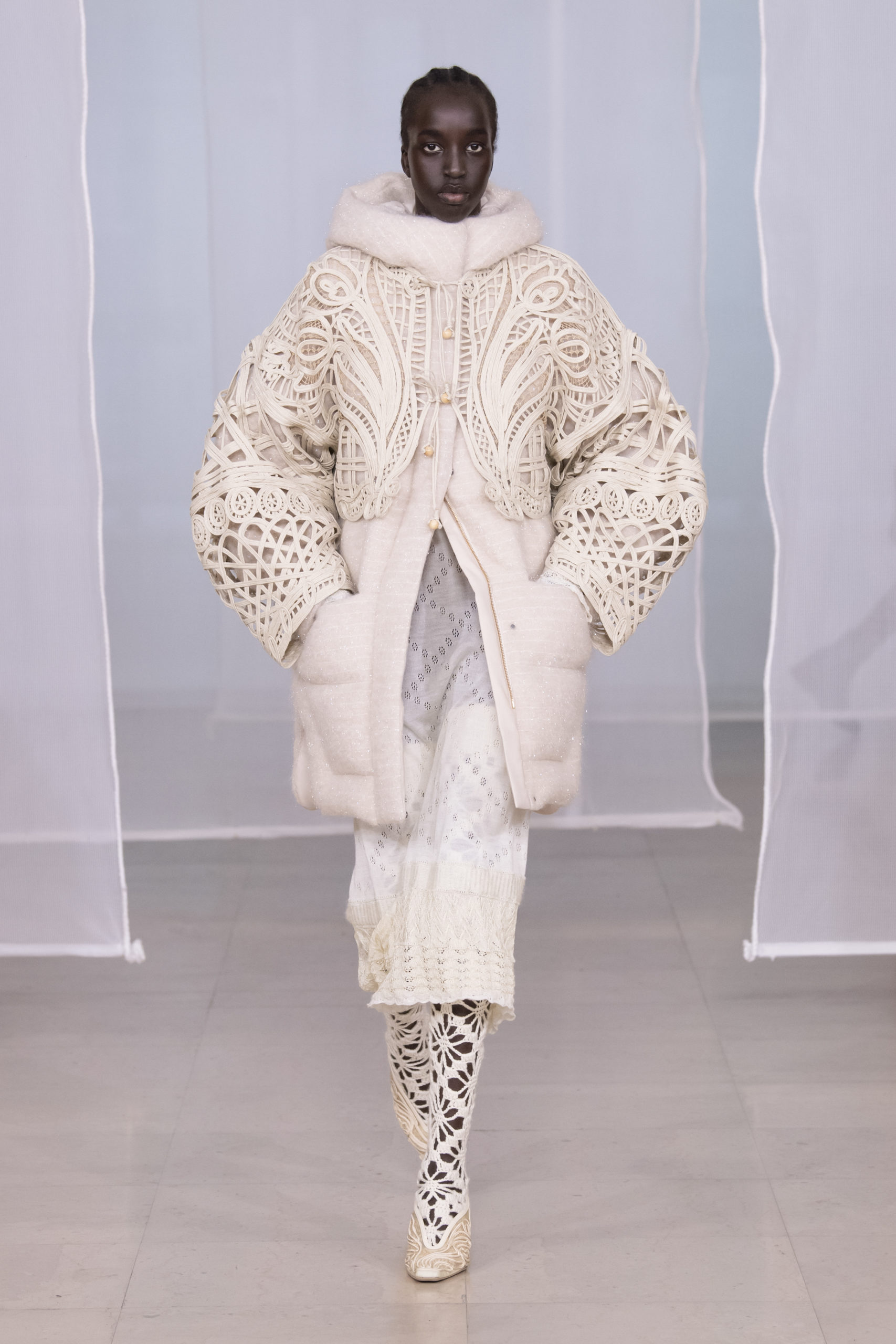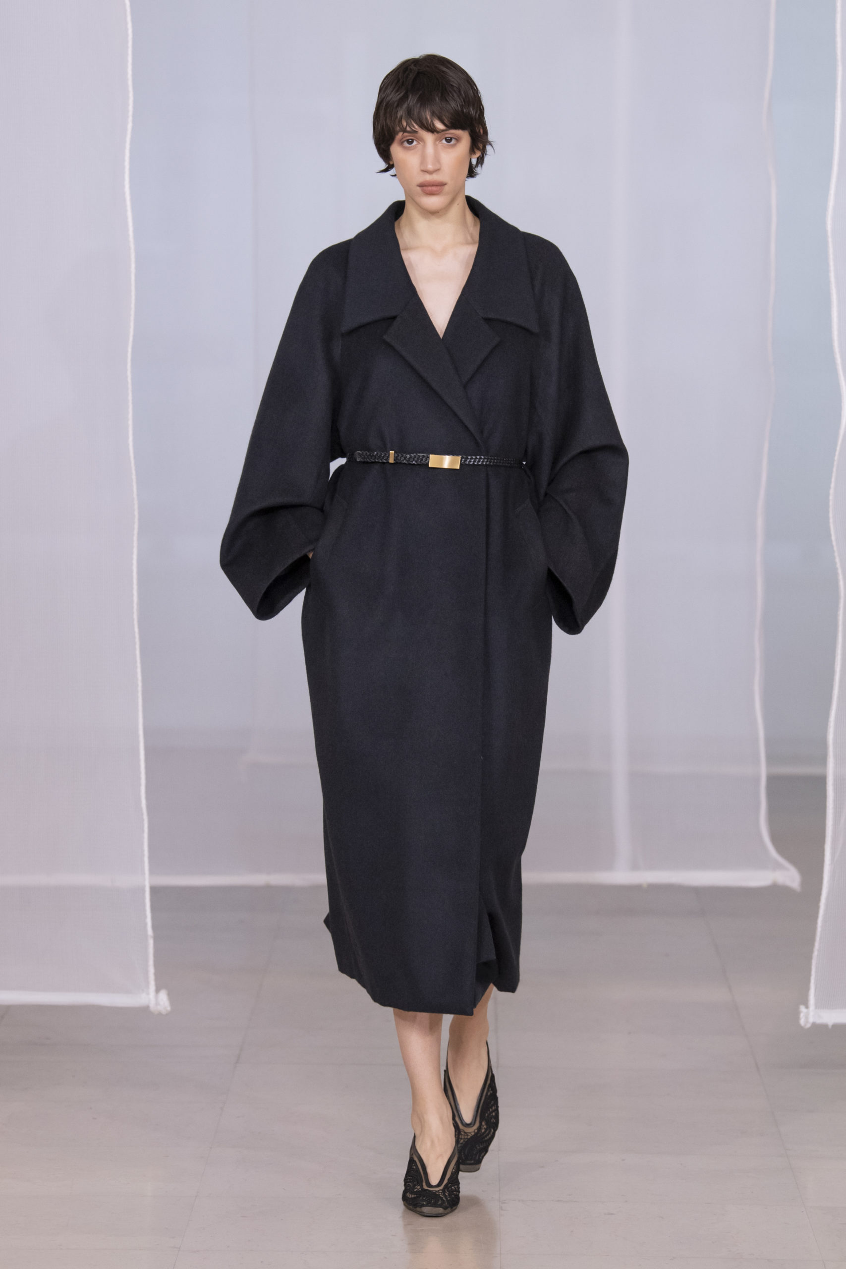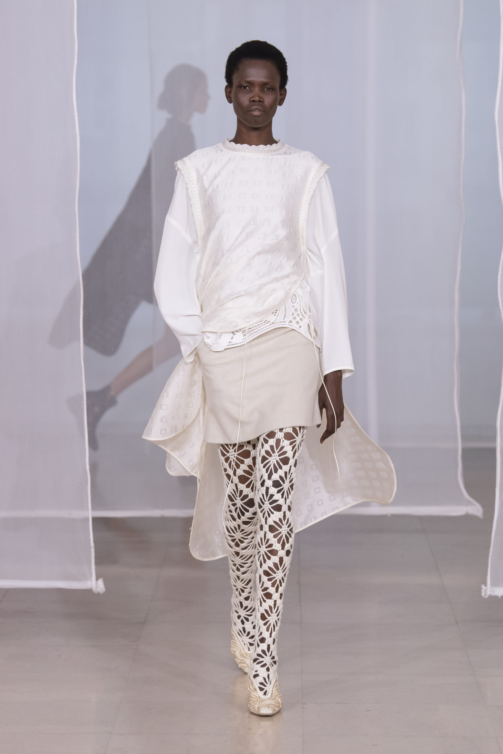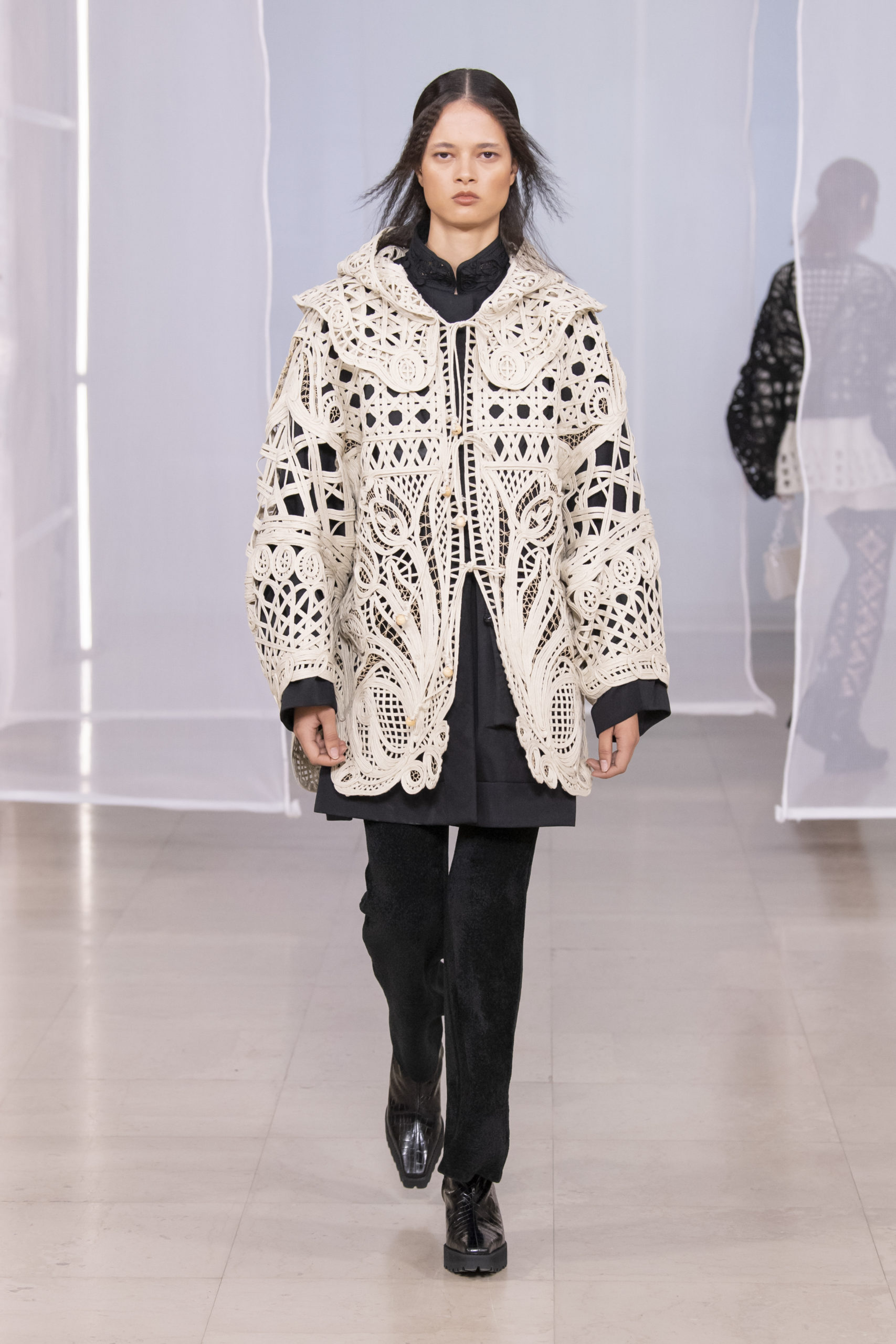 Layers are assembled in subtle yet novel combinations using Mame’s repertoire of loosely woven knitwear, dropped shoulders and elongated cuffs, embracing the body softly in weightless yet voluminous silhouettes – the human form protected by immaterial weaves.
