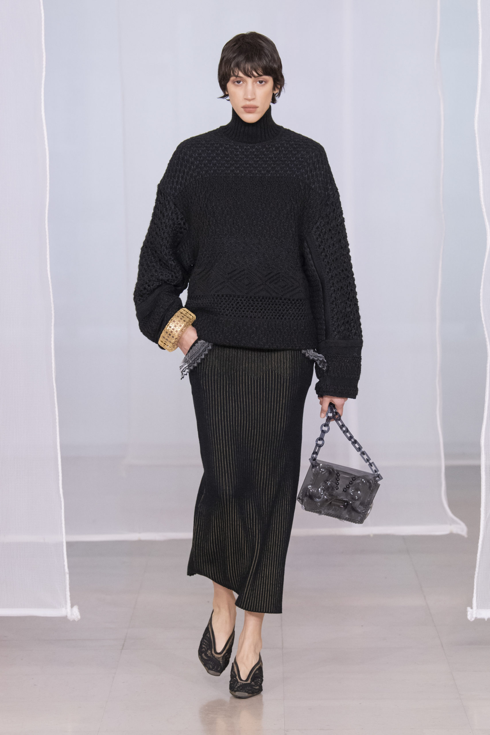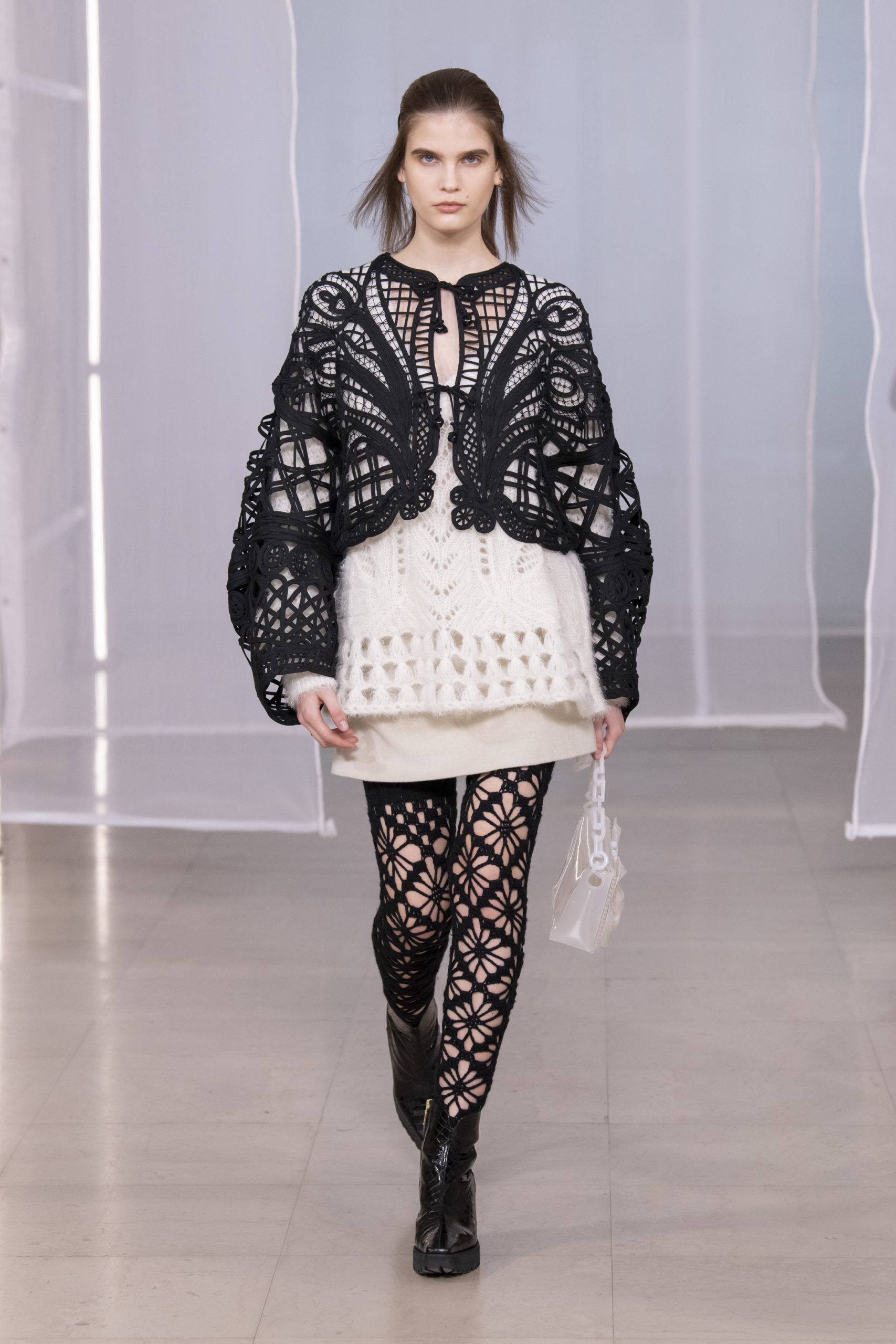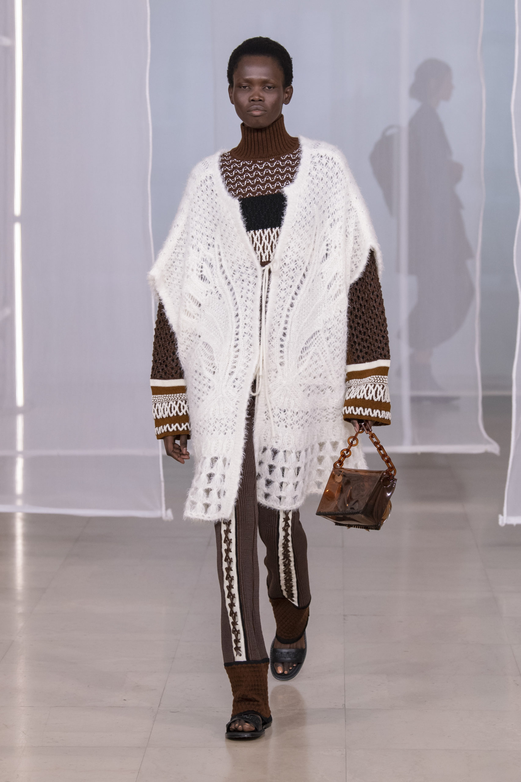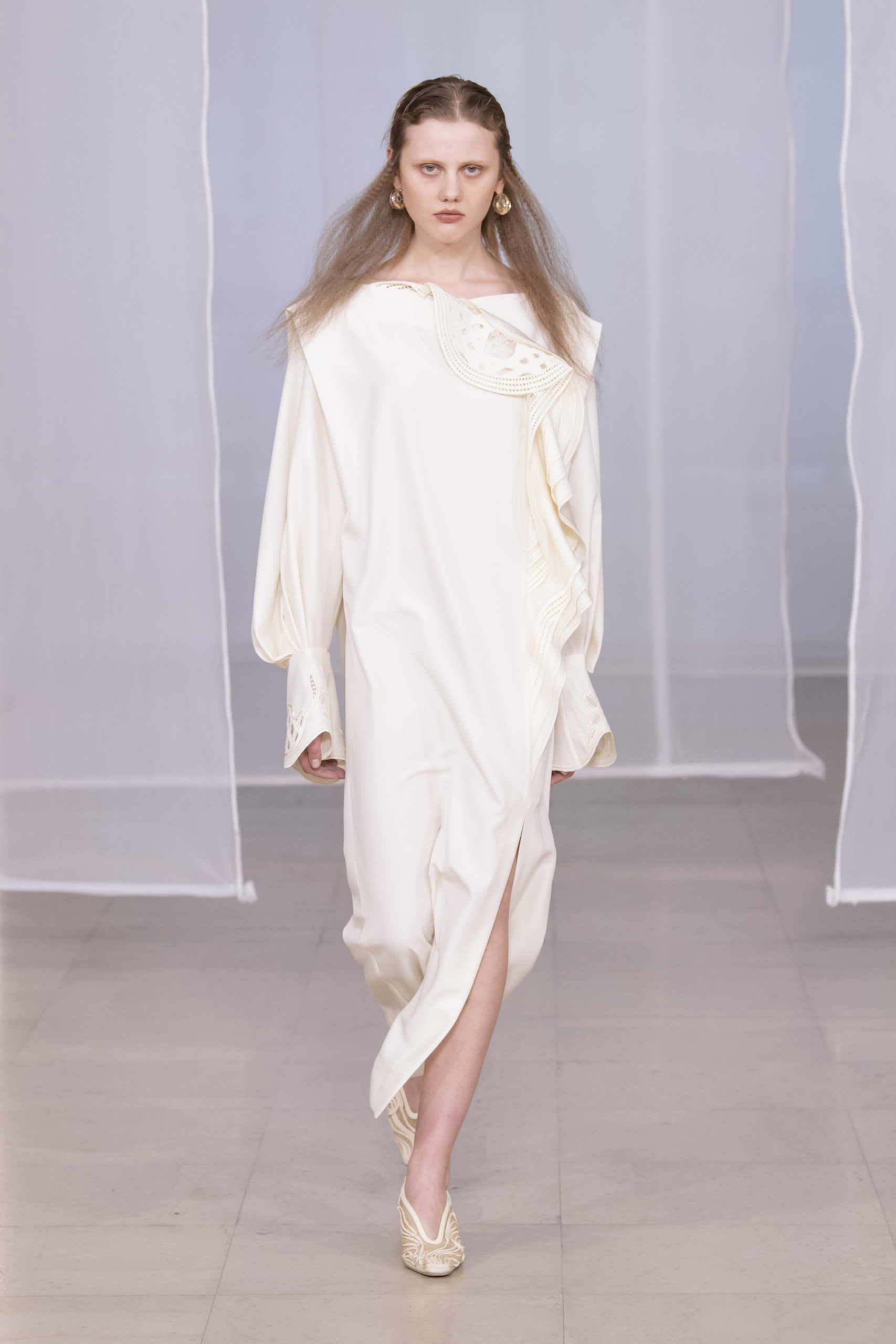 Layers are assembled in subtle yet novel combinations using Mame’s repertoire of loosely woven knitwear, dropped shoulders and elongated cuffs, embracing the body softly in weightless yet voluminous silhouettes – the human form protected by immaterial weaves.
