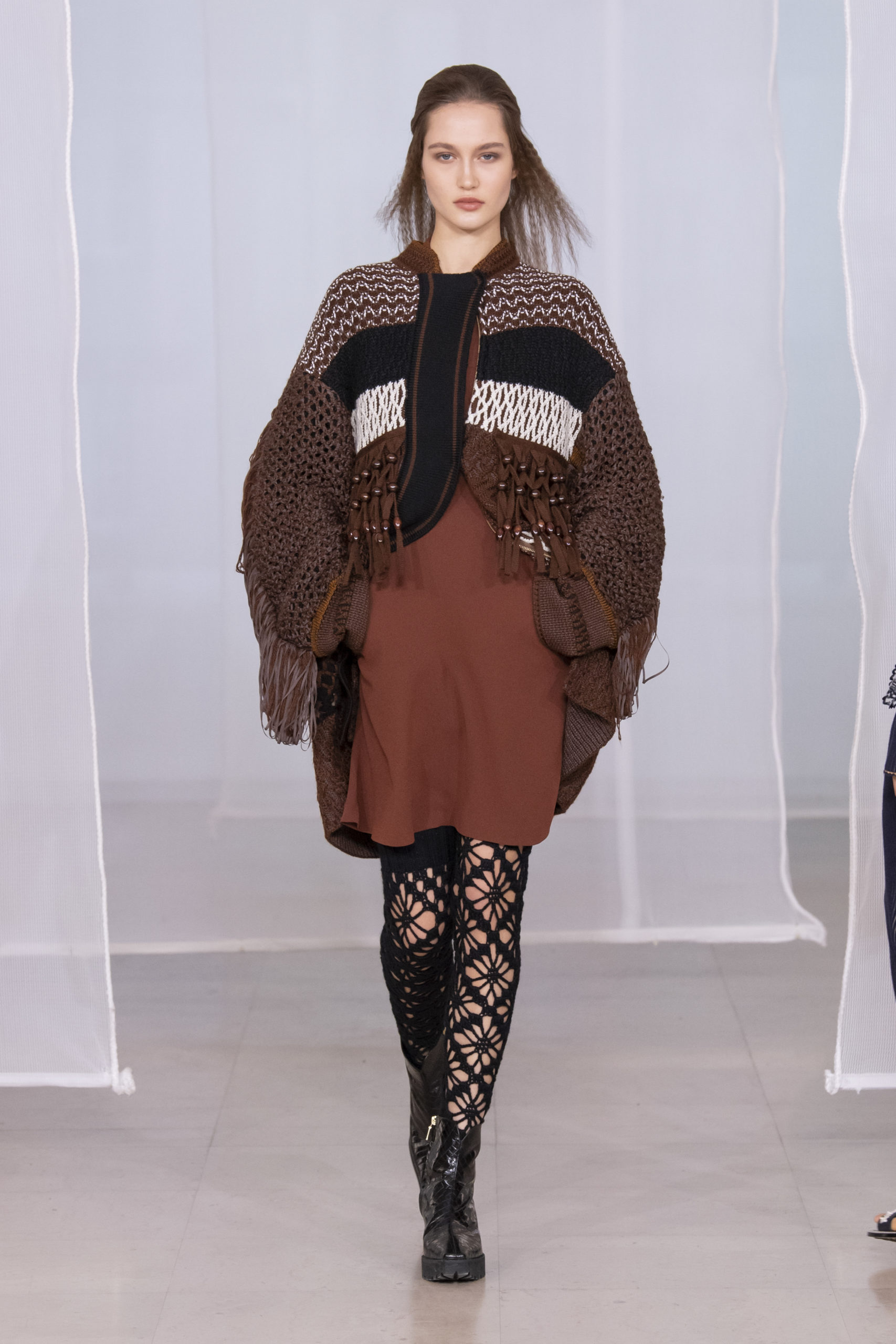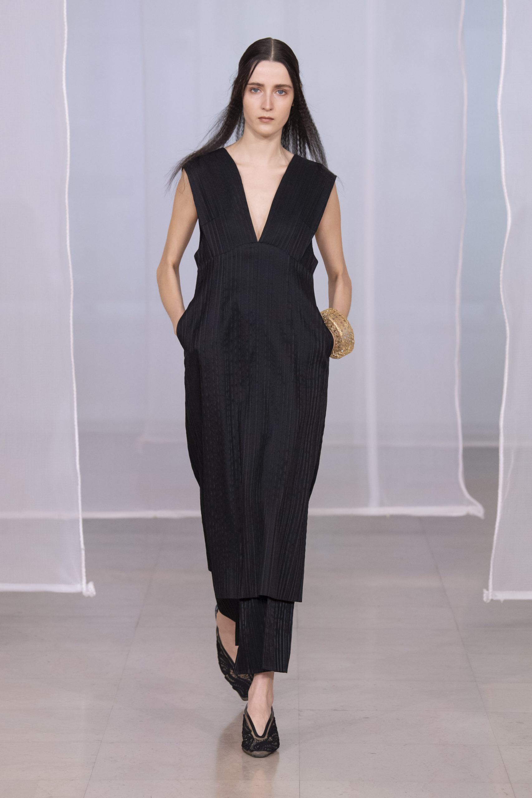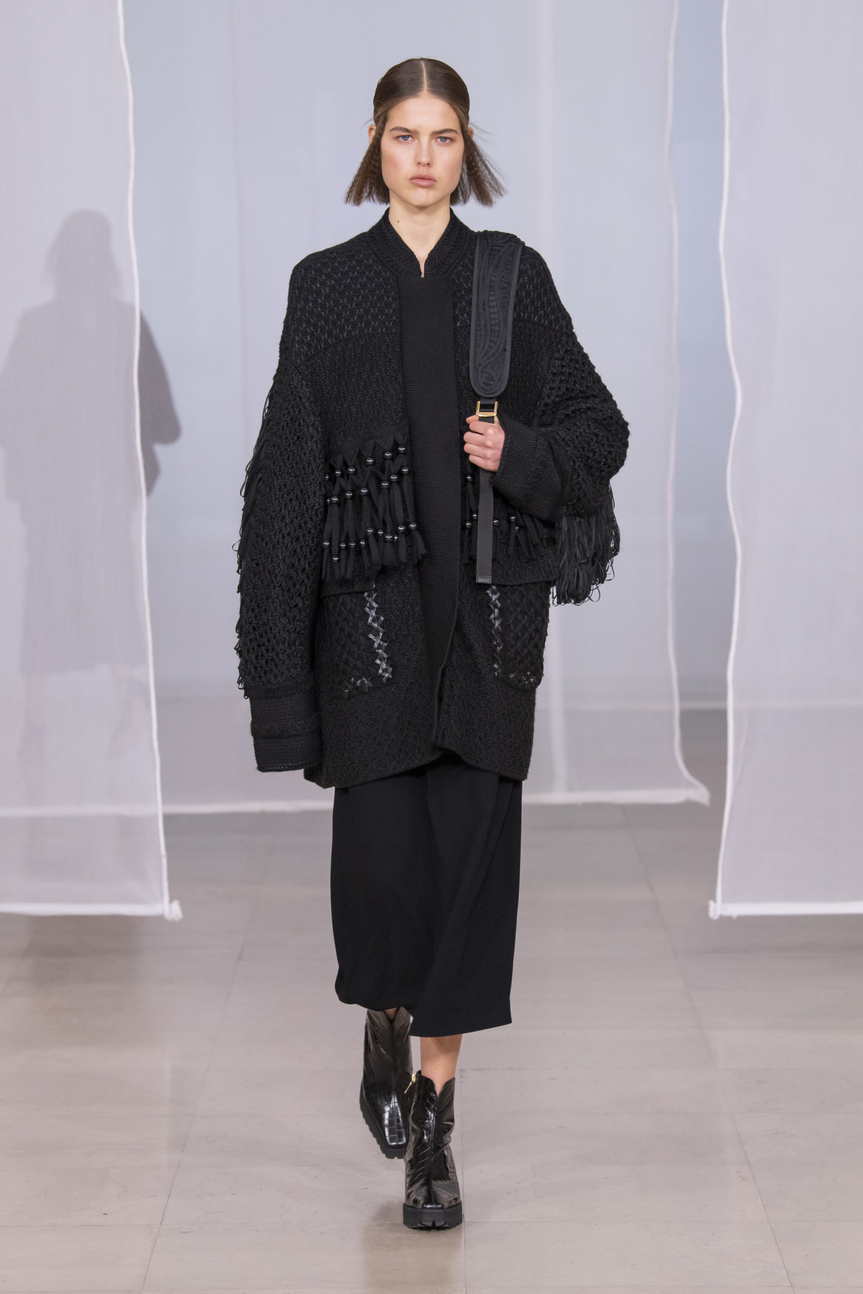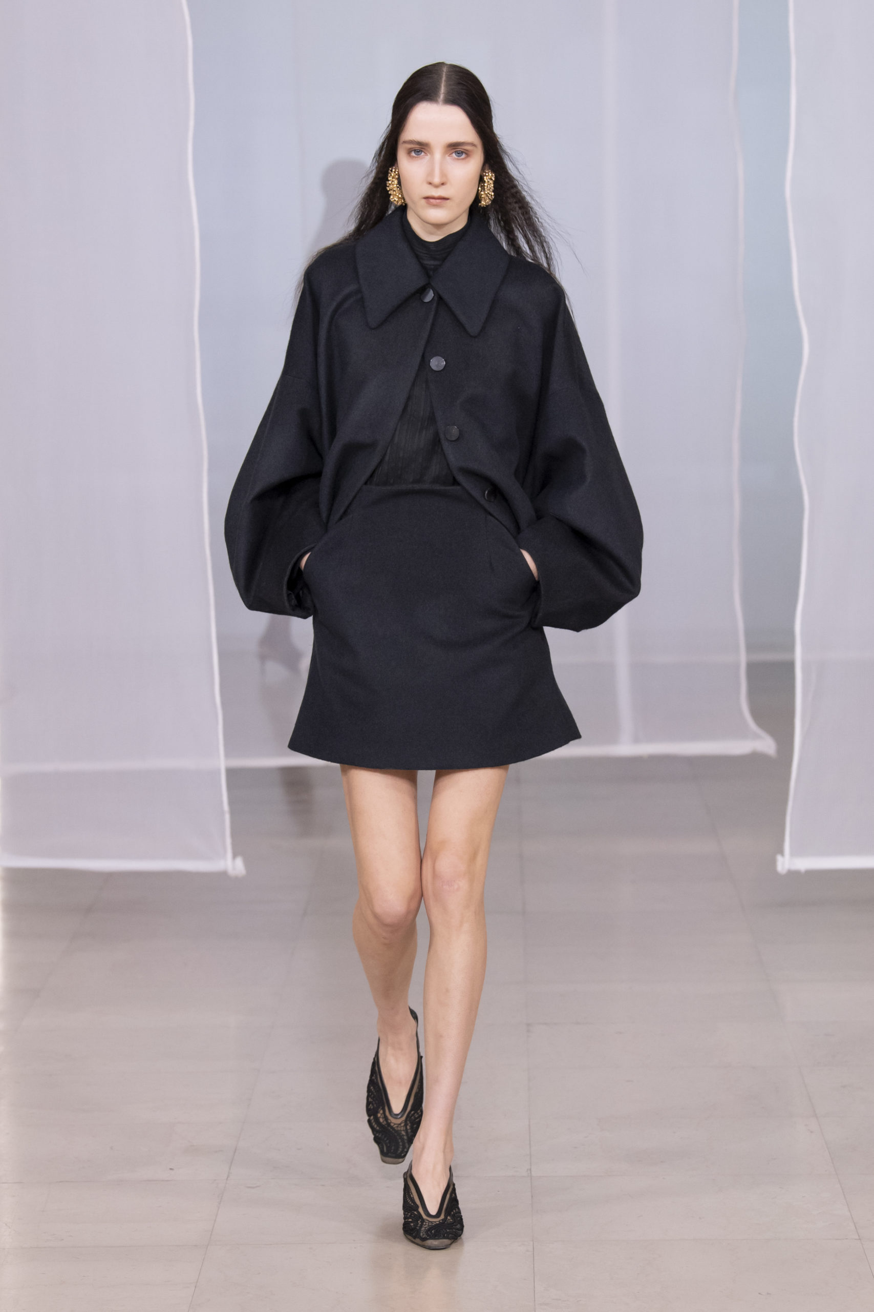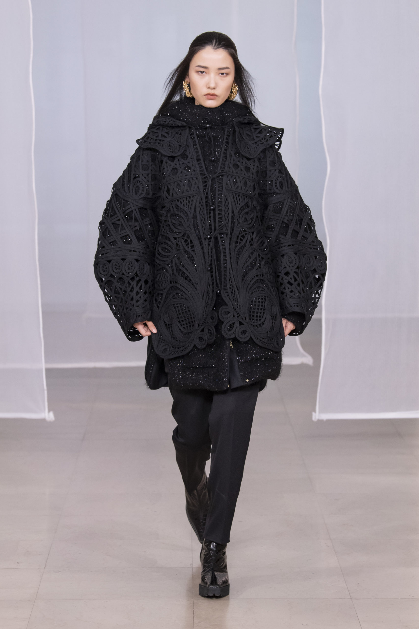Layers are assembled in subtle yet novel combinations using Mame’s repertoire of loosely woven knitwear, dropped shoulders and elongated cuffs, embracing the body softly in weightless yet voluminous silhouettes – the human form protected by immaterial weaves.