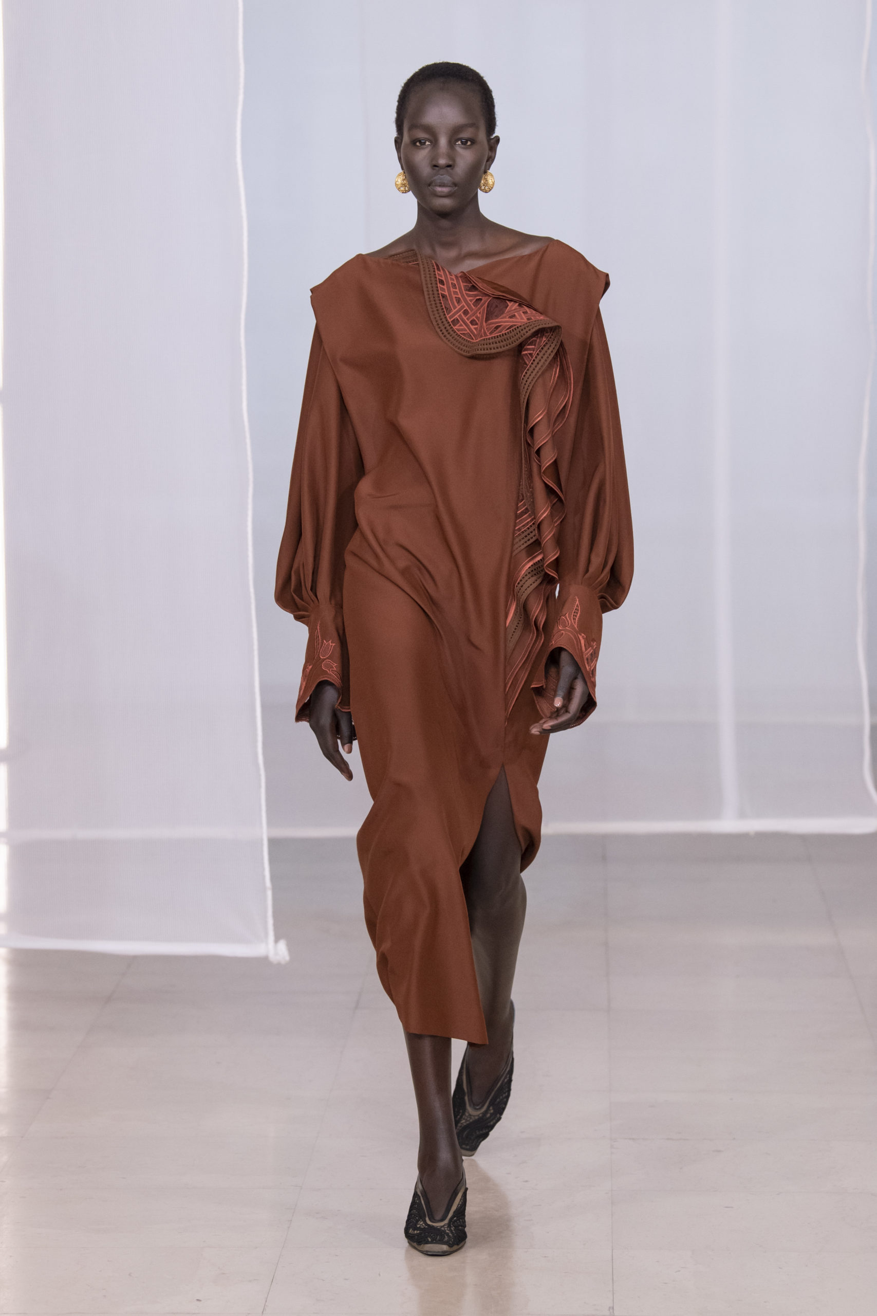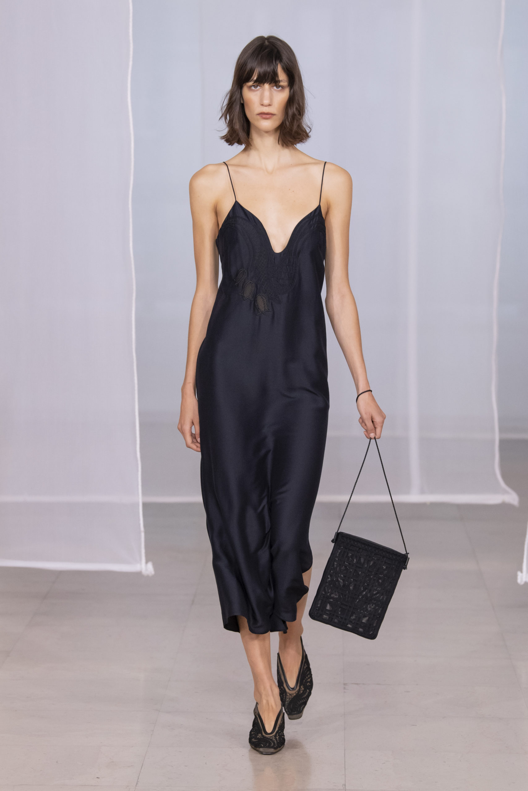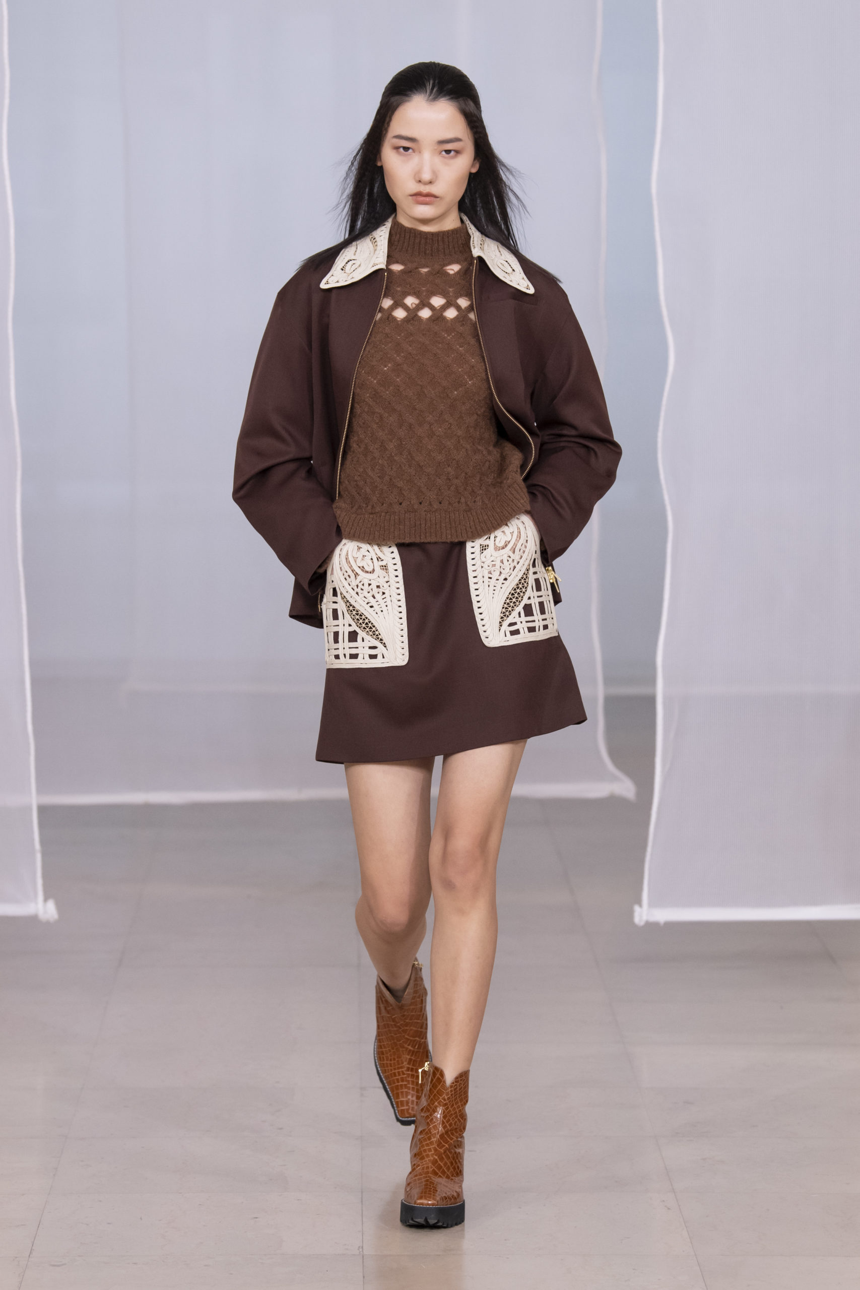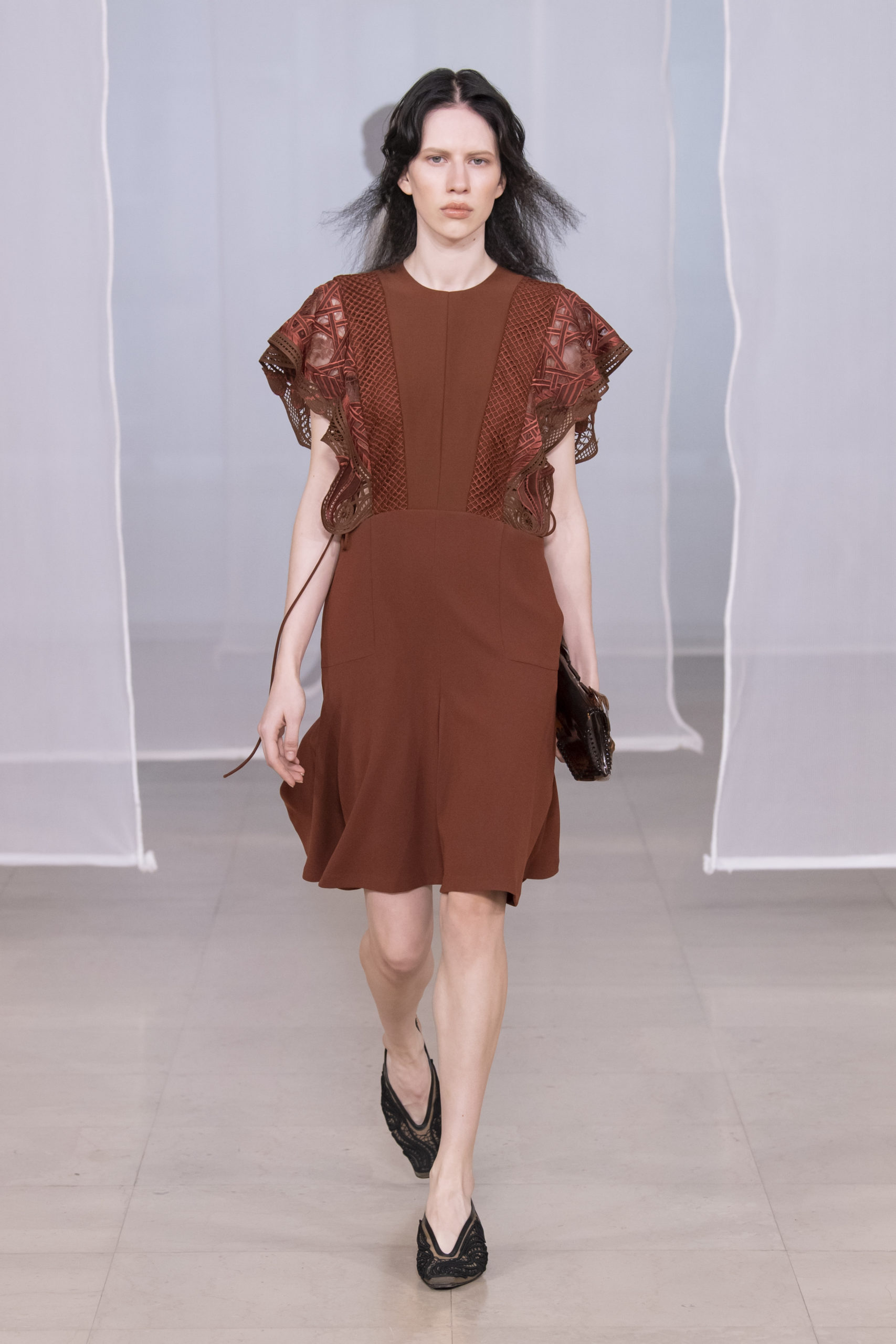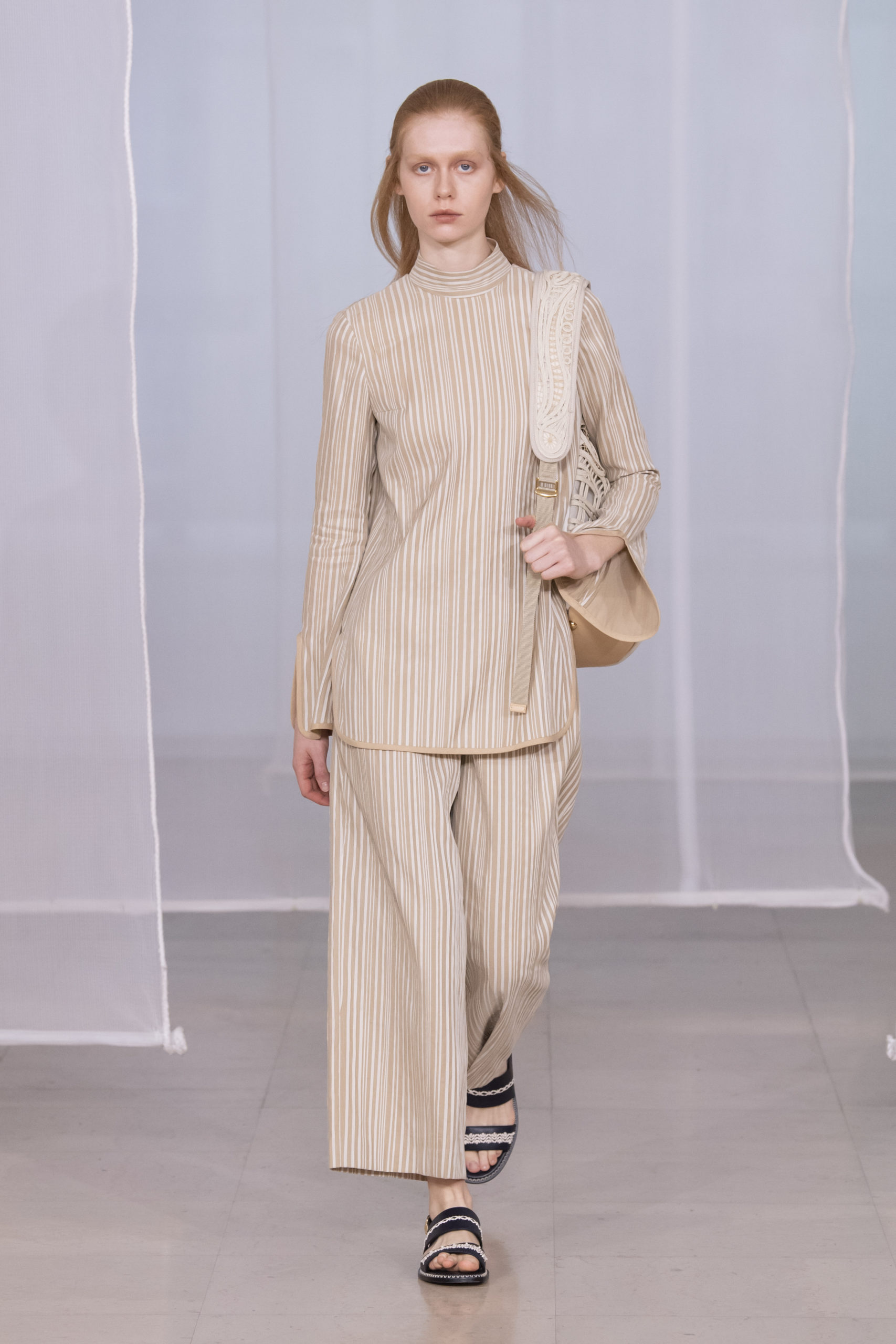 Inspired by a tactile interaction with the earth, the palette is warm, like the morning sun warming the winterscape. Browns reveal the richness of the soils. Gold and botanical accessories twine around neck and ears, while a series of linen embroidery bags come with small pouch. The brand’s first backpack comes to liberate the hands of active minds while the iconic Mame Kurogouchi PVC bag, a daring fusion of organic design and industrial material, takes earthy tones.