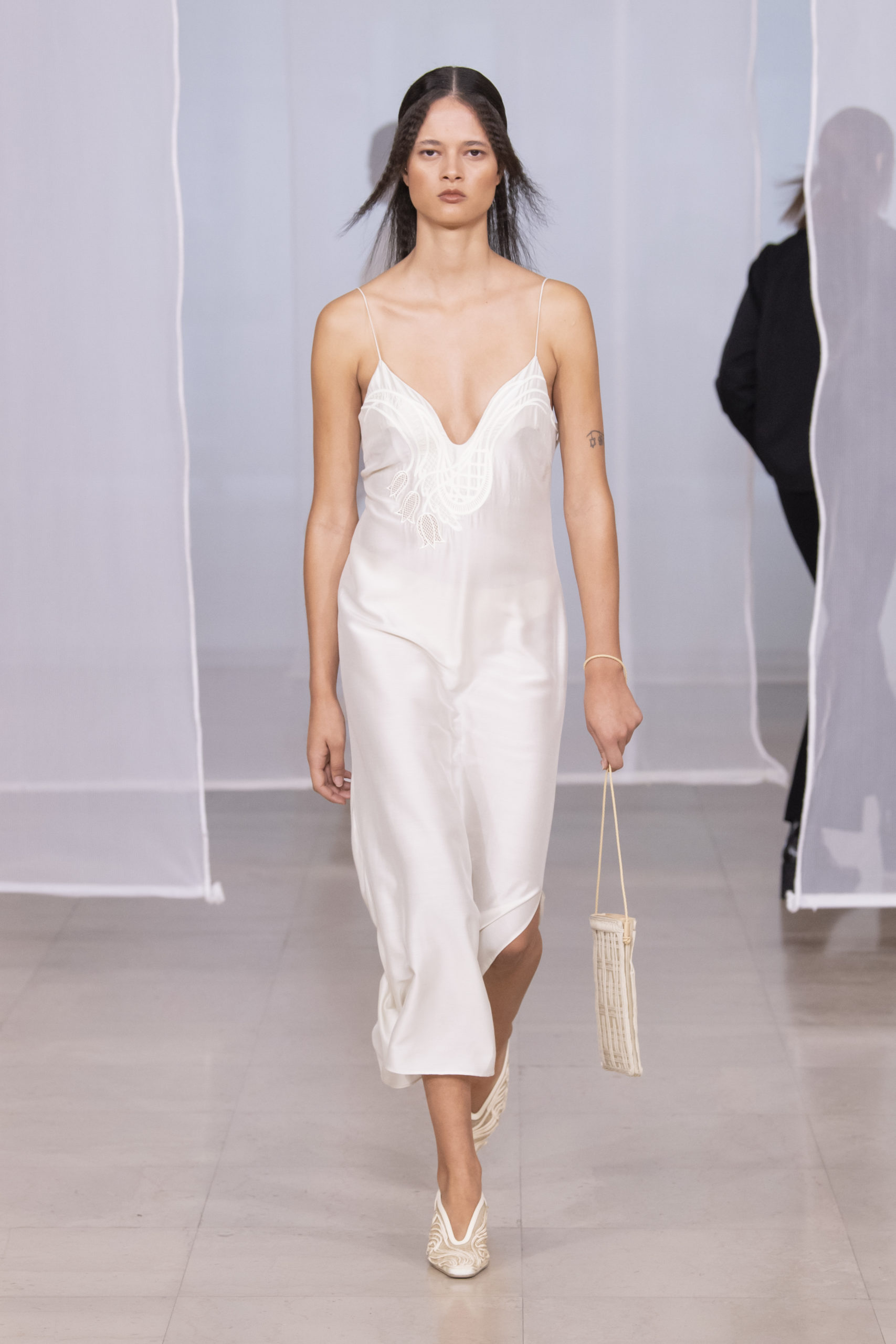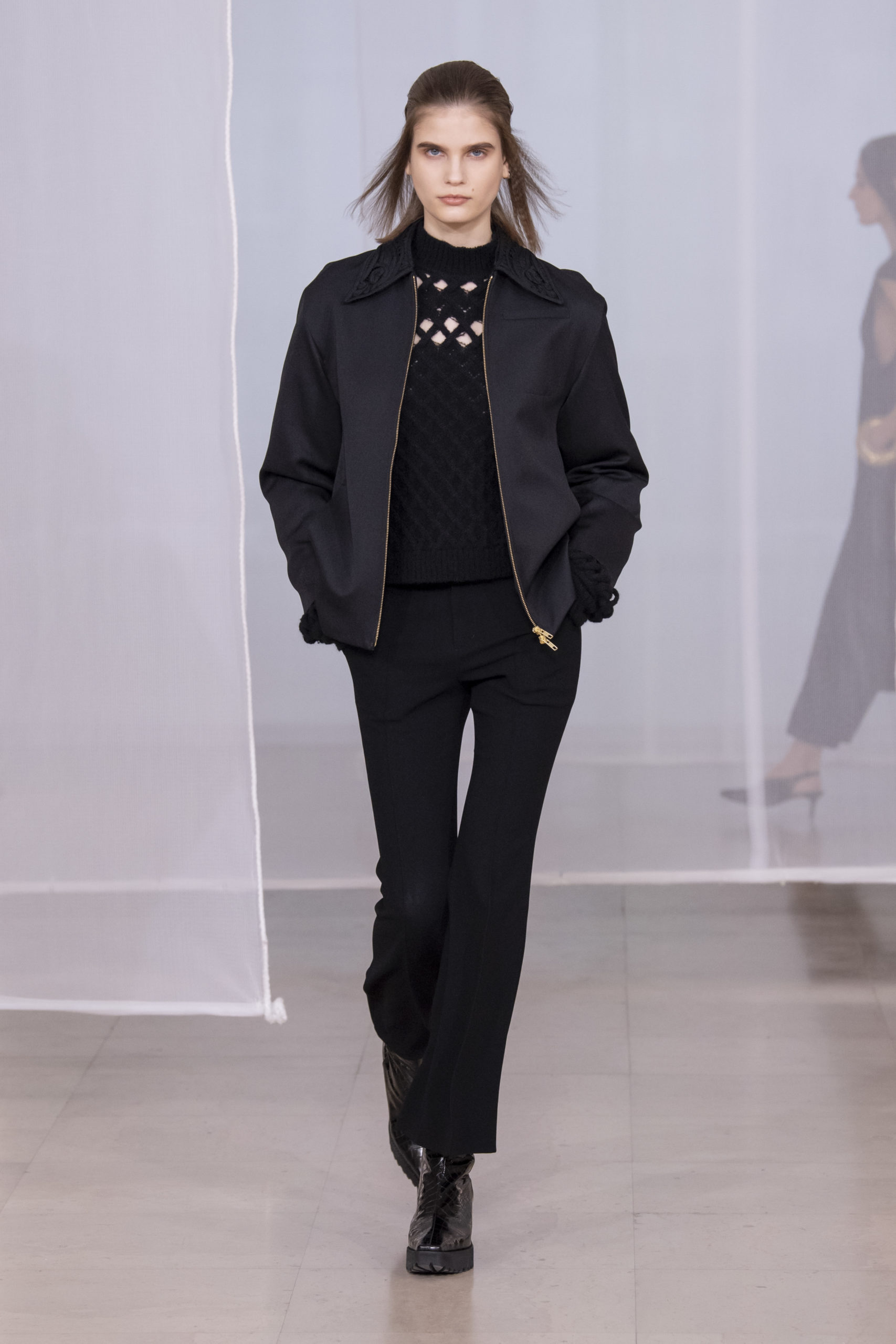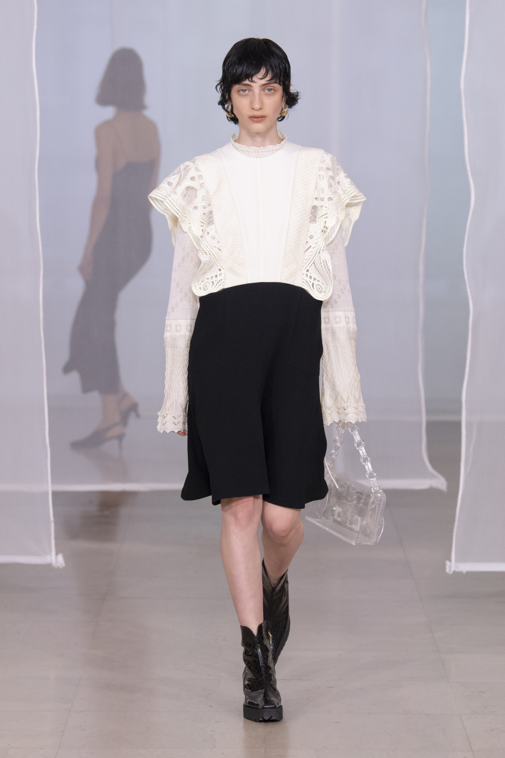 Rather than be dutiful imitations of reality, inspirations are transcended to their idealized form through techniques traditional and modern: floral motifs nodding to the Icelandic landscape and lattice patterns are evoked using signature jacquard weaves; delicate strands of shiny thread woven into wool duvet jackets or a chequered pattern pay homage to the memory of morning dew reflecting a sunbeam. Linen laces are woven like baskets by applying embroidery techniques, which add dramatic movement and stunning visual effects on jackets or the sleeves of dresses. Loosely woven knitwear proposes subtle yet novel layering ideas.