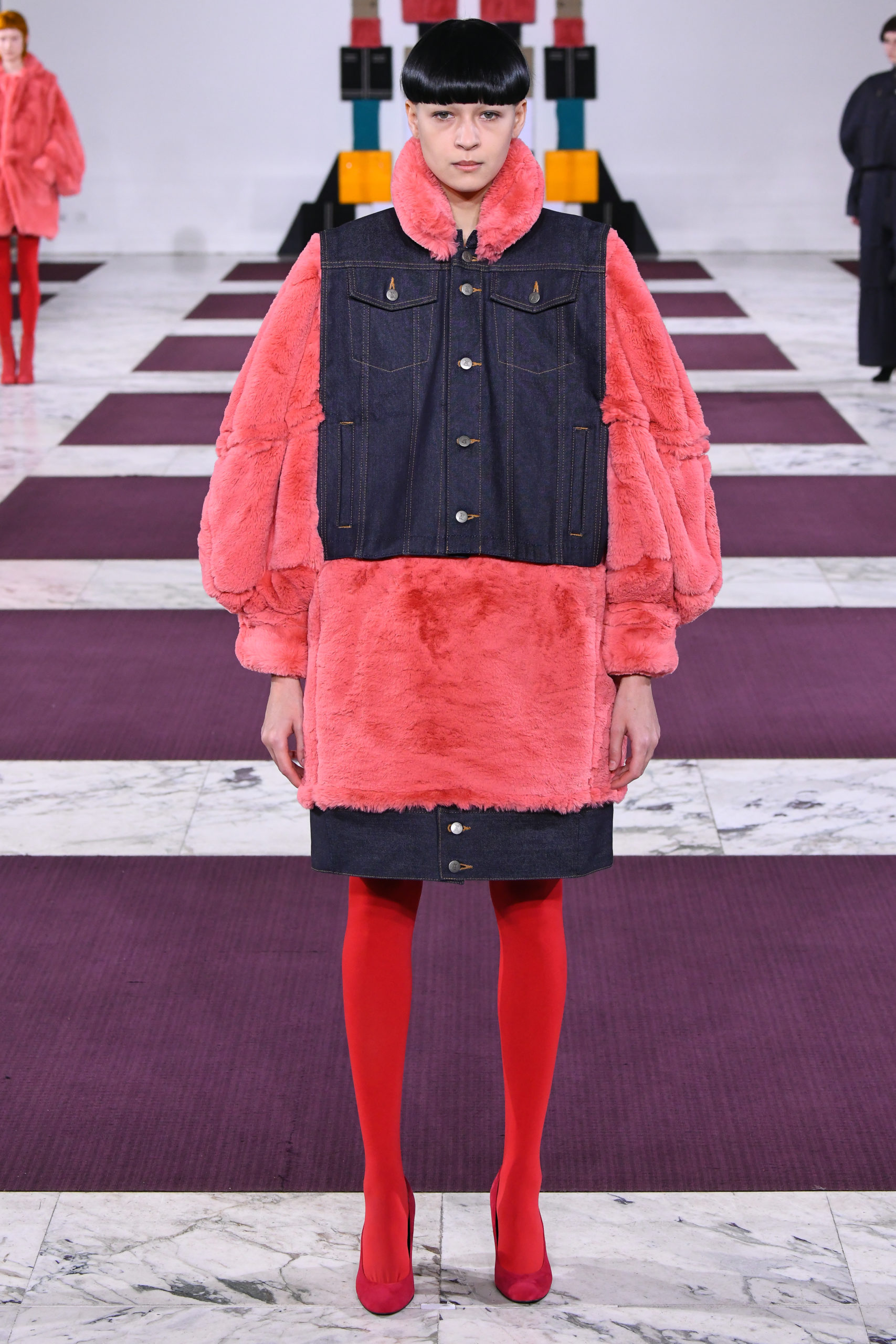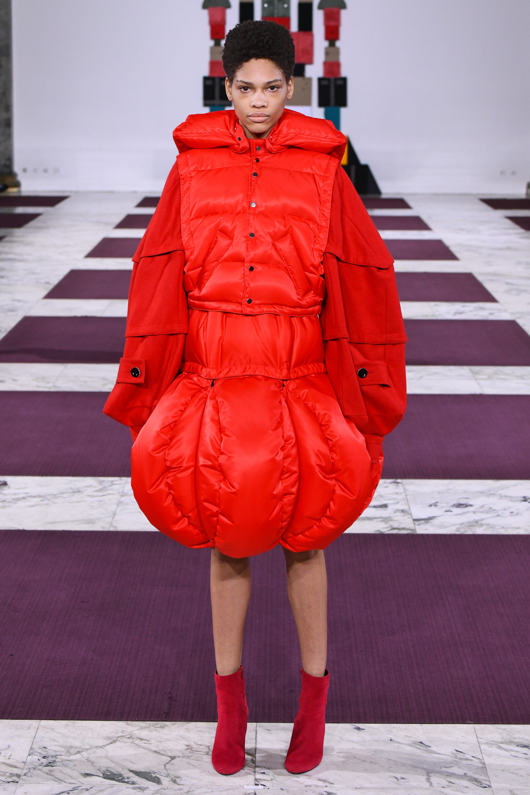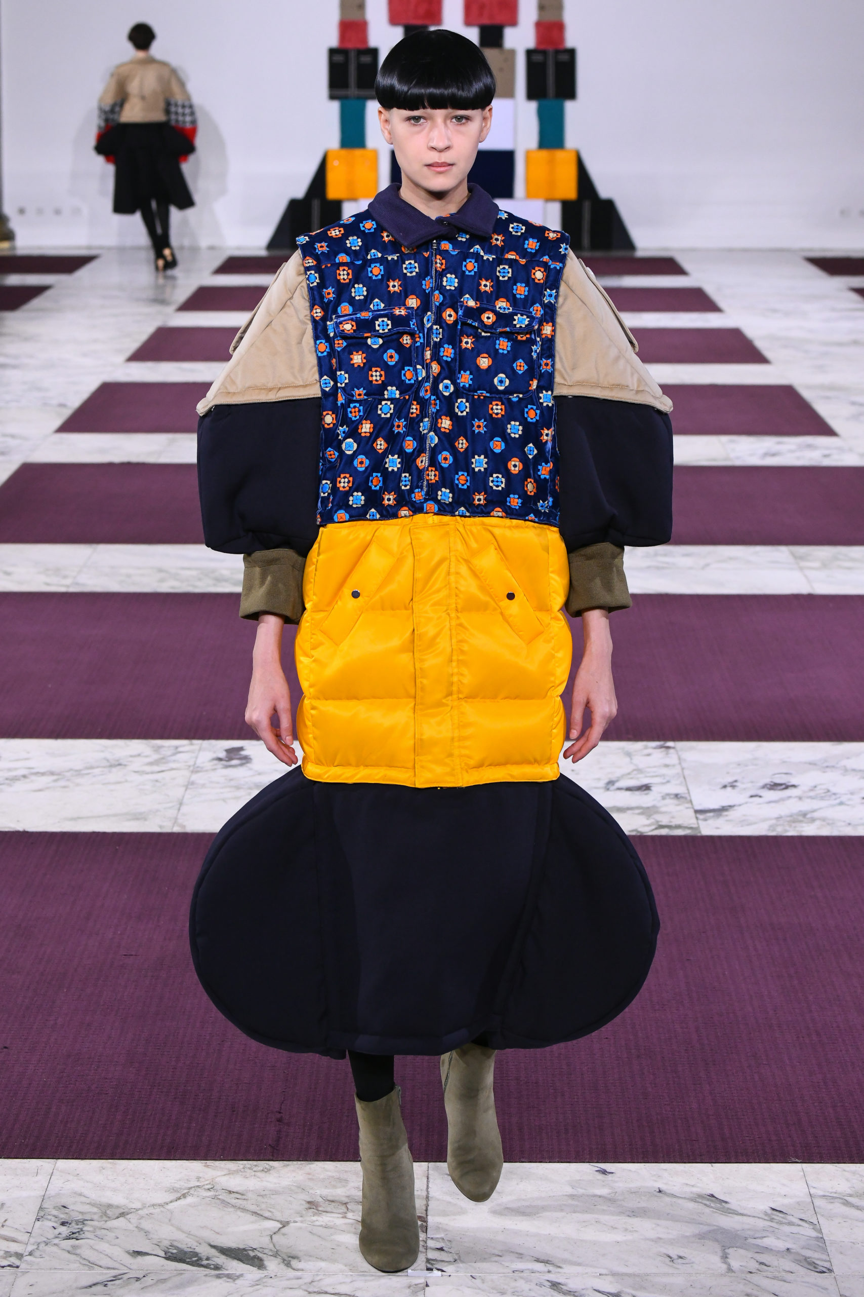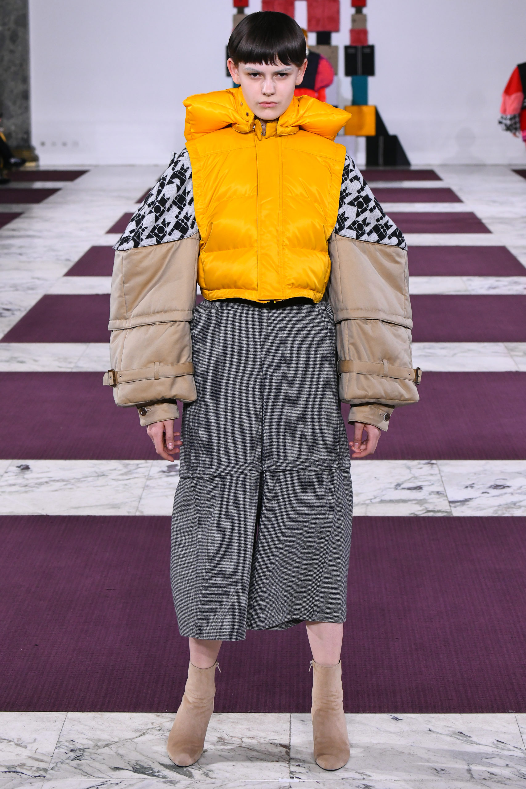 Cuffs transform into collars, trench sleeves clip onto the body of a lace dress, and a bodice flips to form the bottom of a skirt in this conceptual collection of pick ‘n’ mix hybrids. Possible combinations of colors and textures appear endless, spanning eco-fur, denim, Aran knit and sections of down-filled nylon puffers. The theme also extends to shoe heels made of stacked cubes.