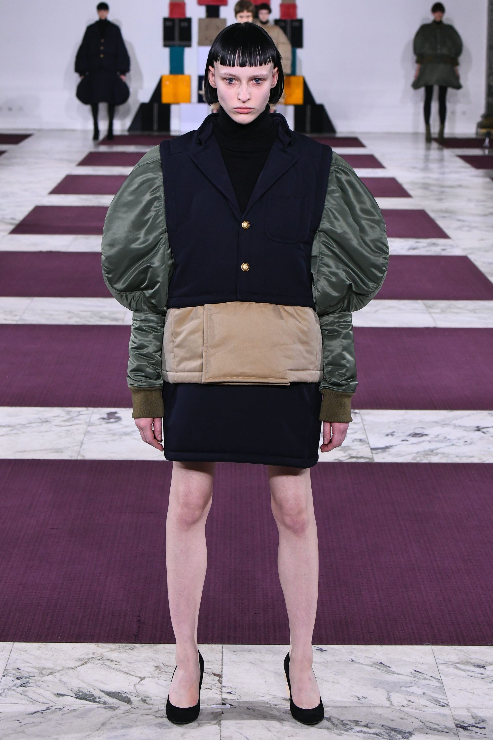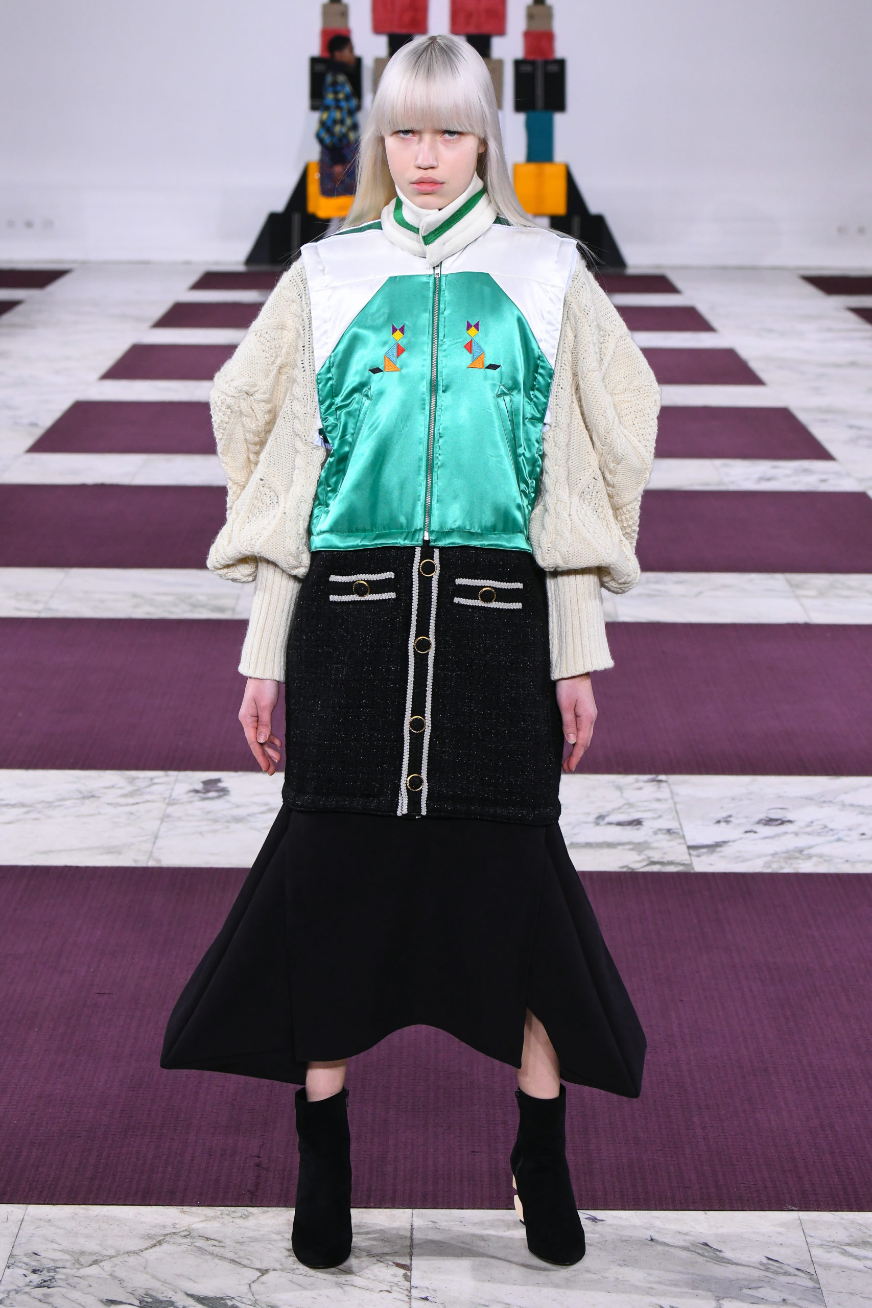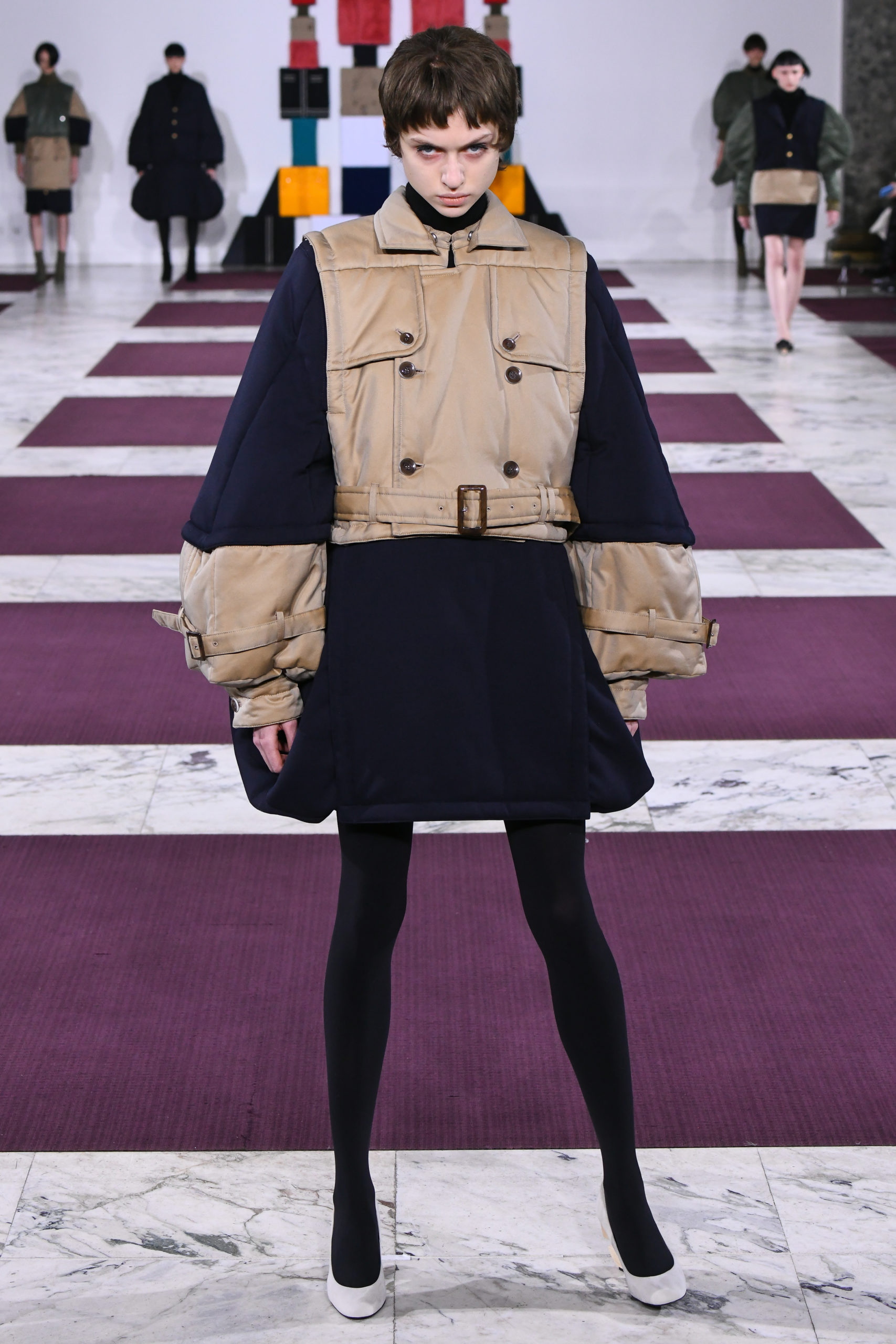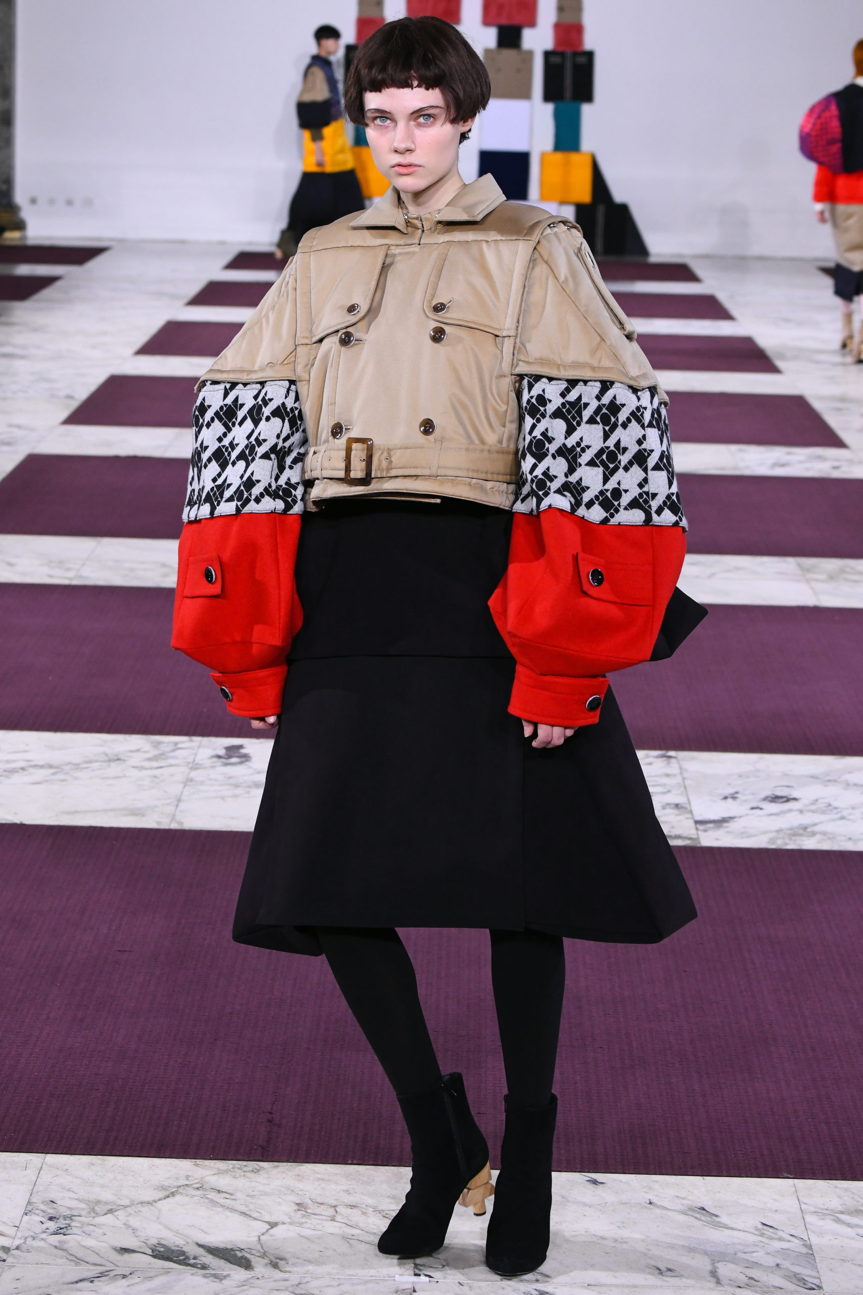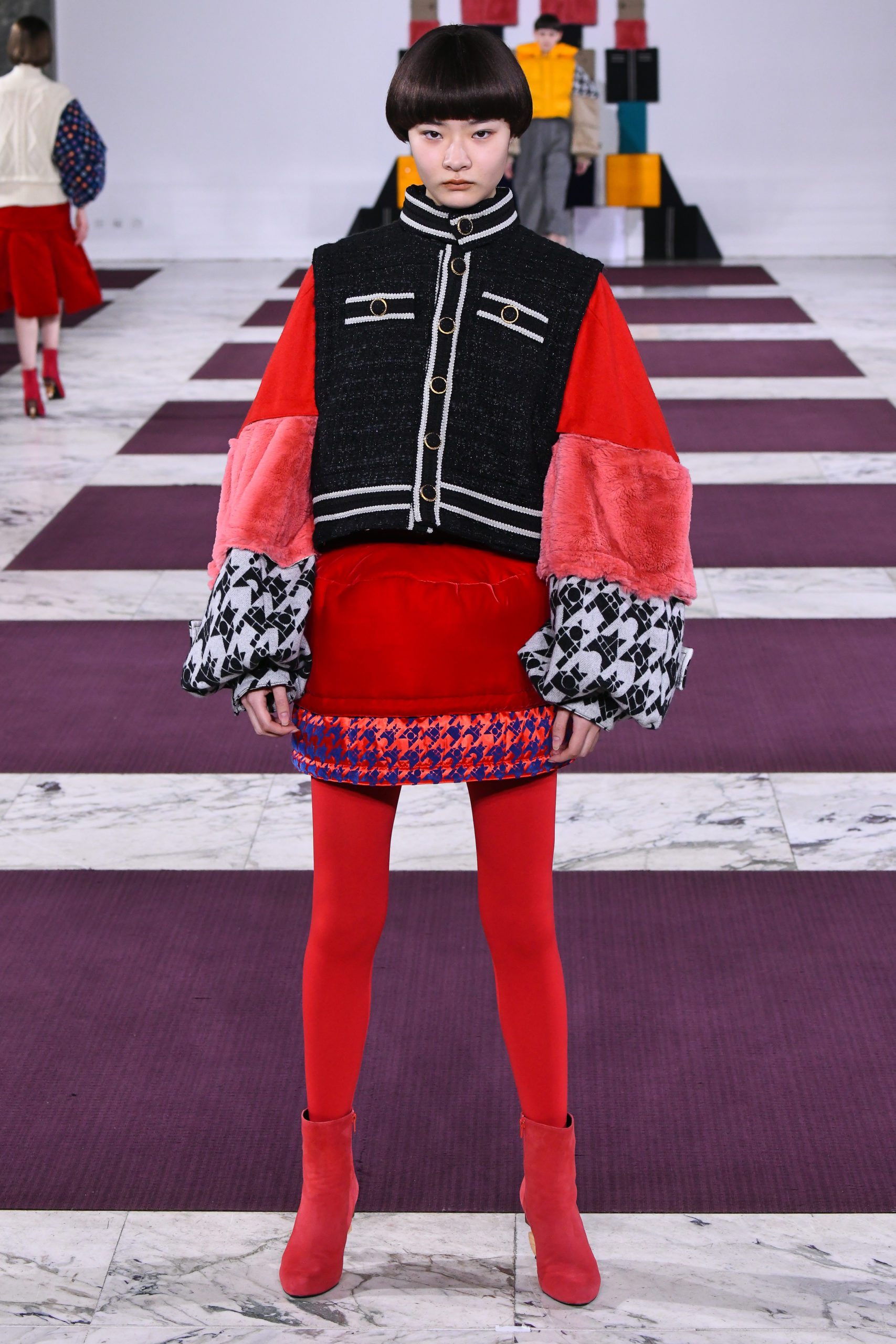 Cuffs transform into collars, trench sleeves clip onto the body of a lace dress, and a bodice flips to form the bottom of a skirt in this conceptual collection of pick ‘n’ mix hybrids. Possible combinations of colors and textures appear endless, spanning eco-fur, denim, Aran knit and sections of down-filled nylon puffers. The theme also extends to shoe heels made of stacked cubes.