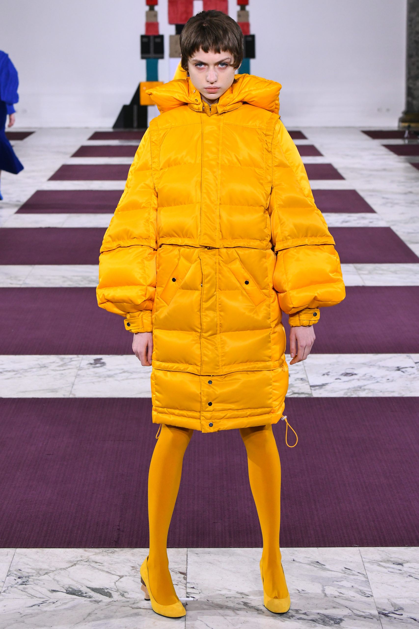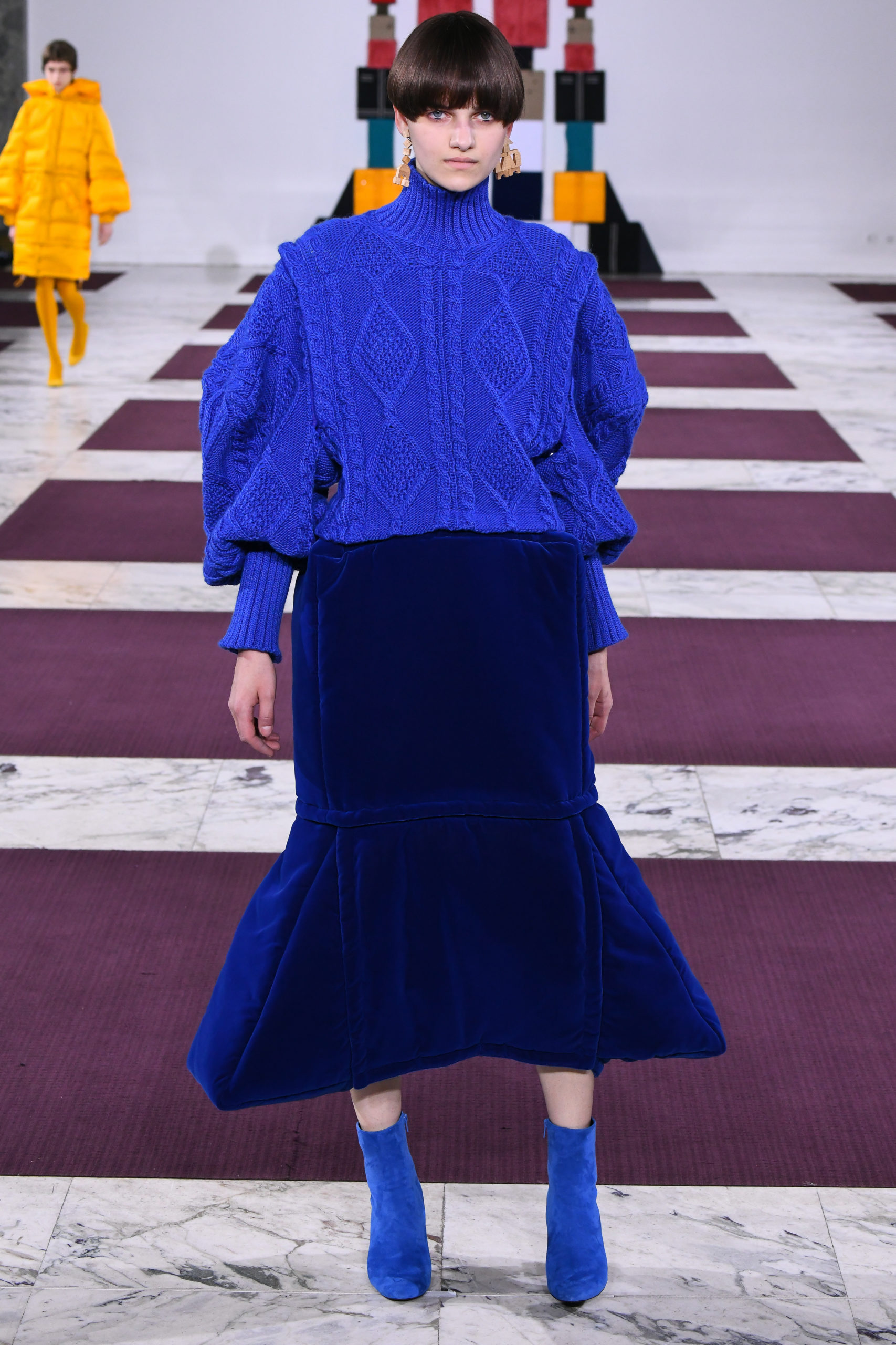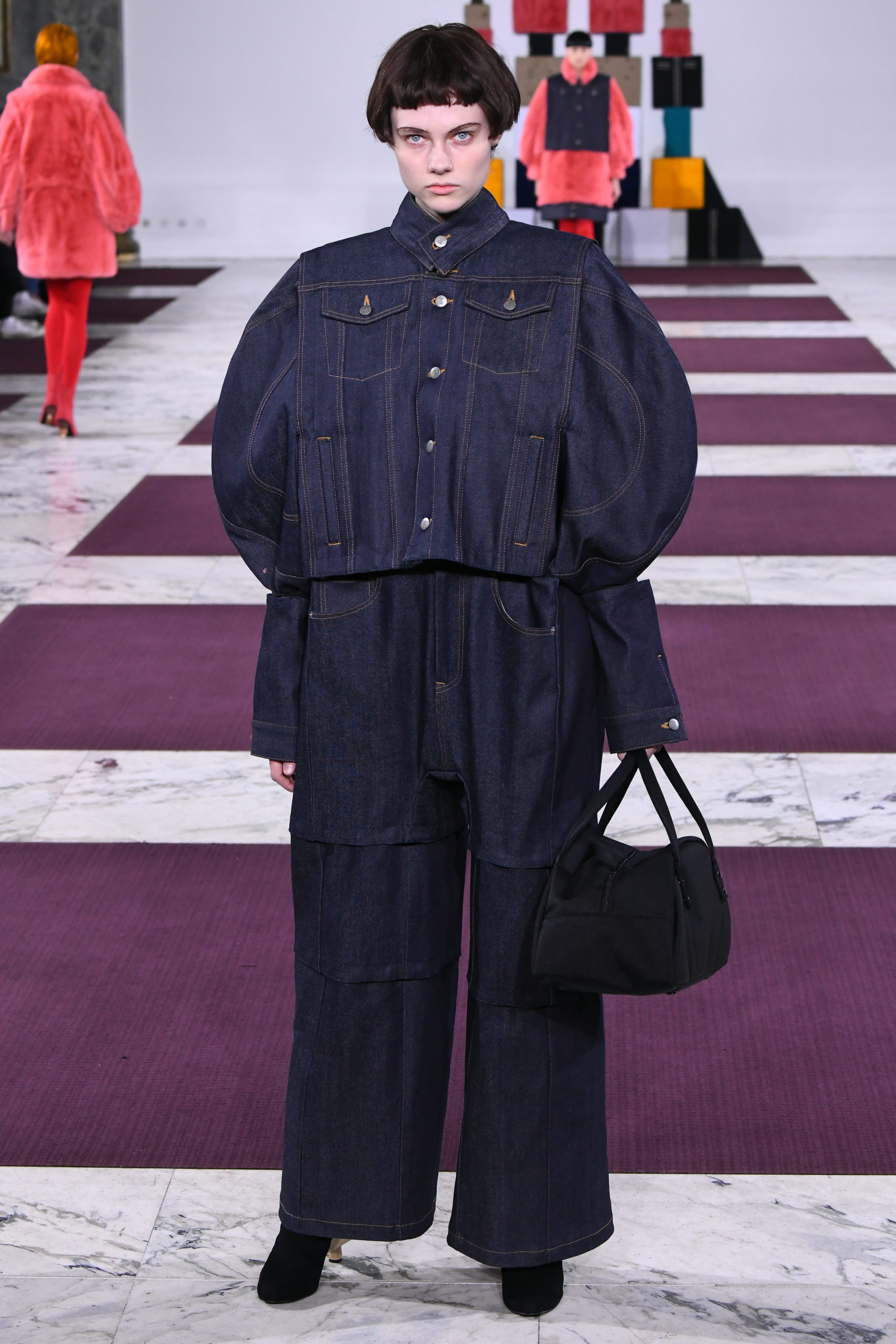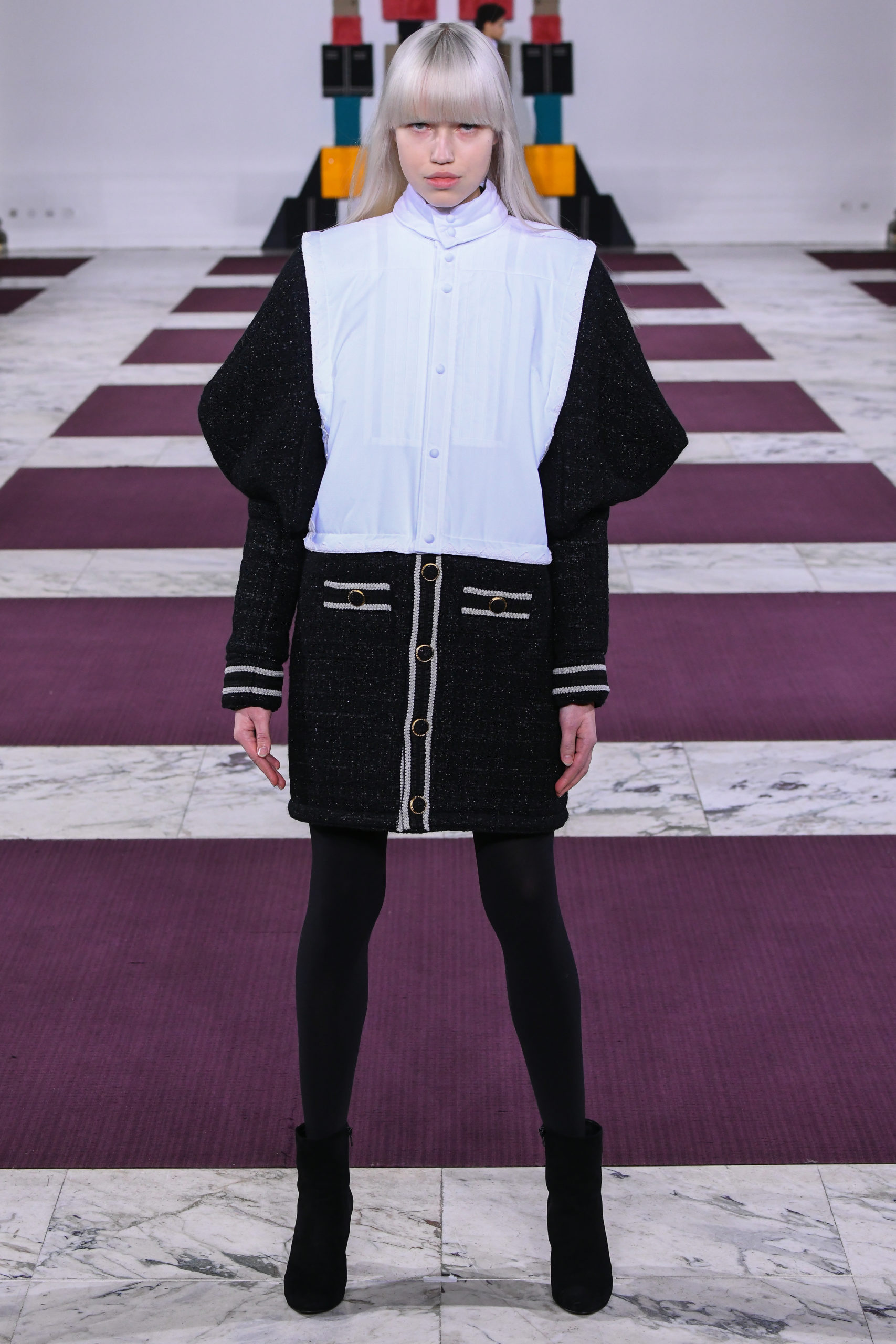Cuffs transform into collars, trench sleeves clip onto the body of a lace dress, and a bodice flips to form the bottom of a skirt in this conceptual collection of pick ‘n’ mix hybrids. Possible combinations of colors and textures appear endless, spanning eco-fur, denim, Aran knit and sections of down-filled nylon puffers. The theme also extends to shoe heels made of stacked cubes.