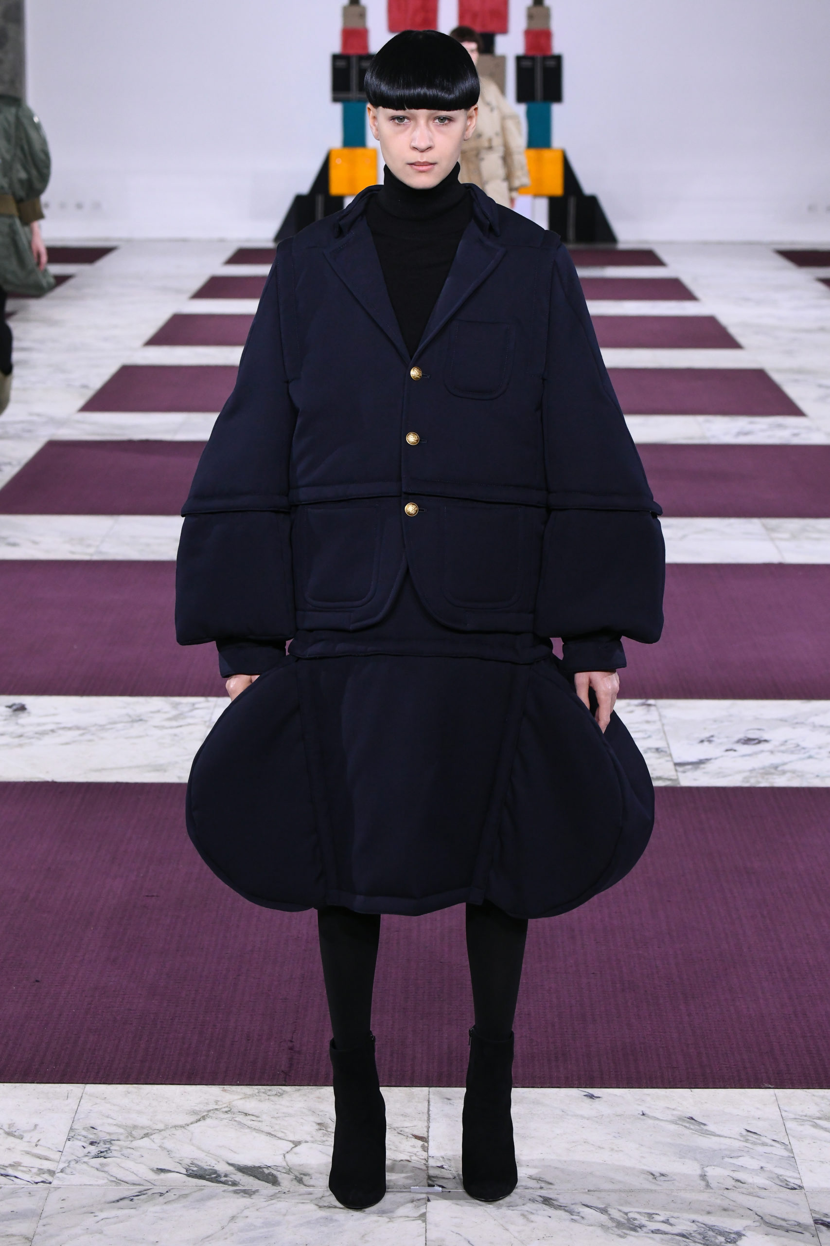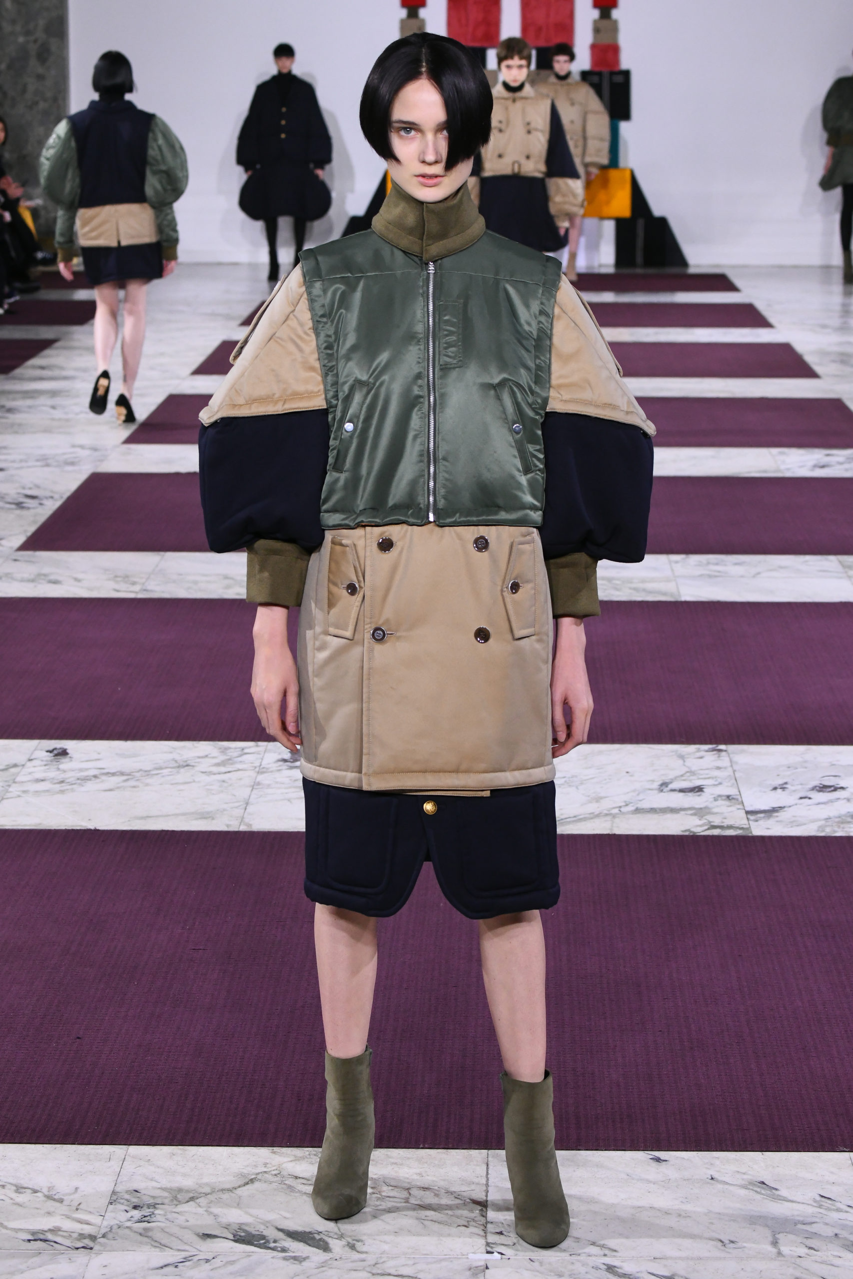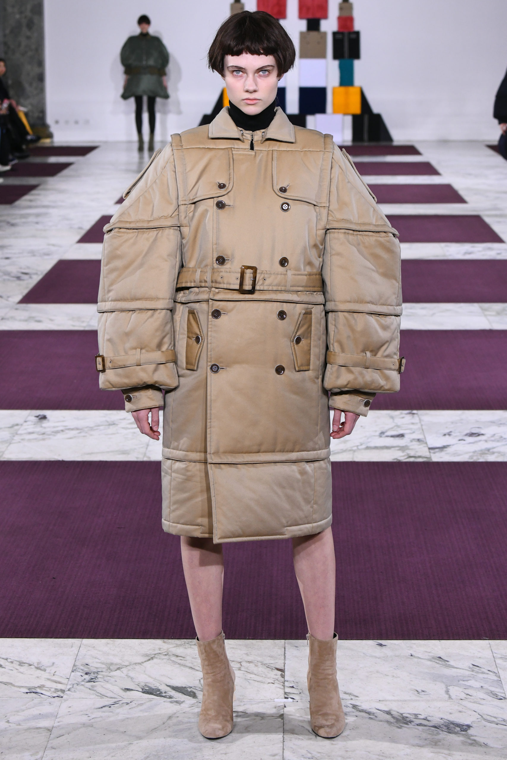 From the trench coat to the MA-1 bomber, each garment is pieced together from an assemblage of geometric volumes – squares, rectangles, triangles, columns and semicircles – made to identical dimensions and proportions. Each section can then be detached and re-attached onto other pieces from the collection thanks to a system of snaps.