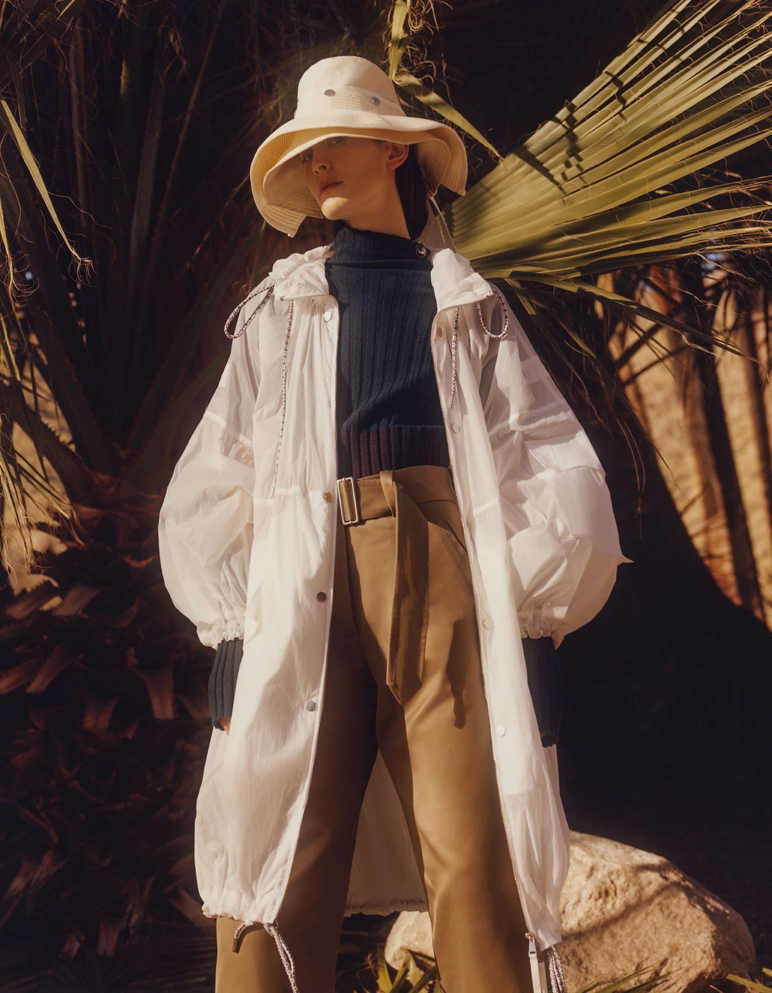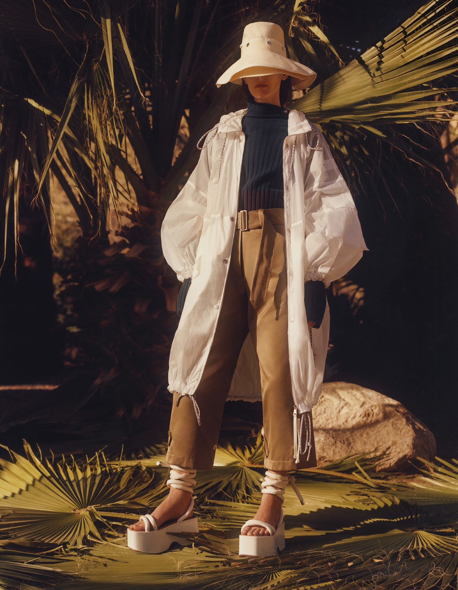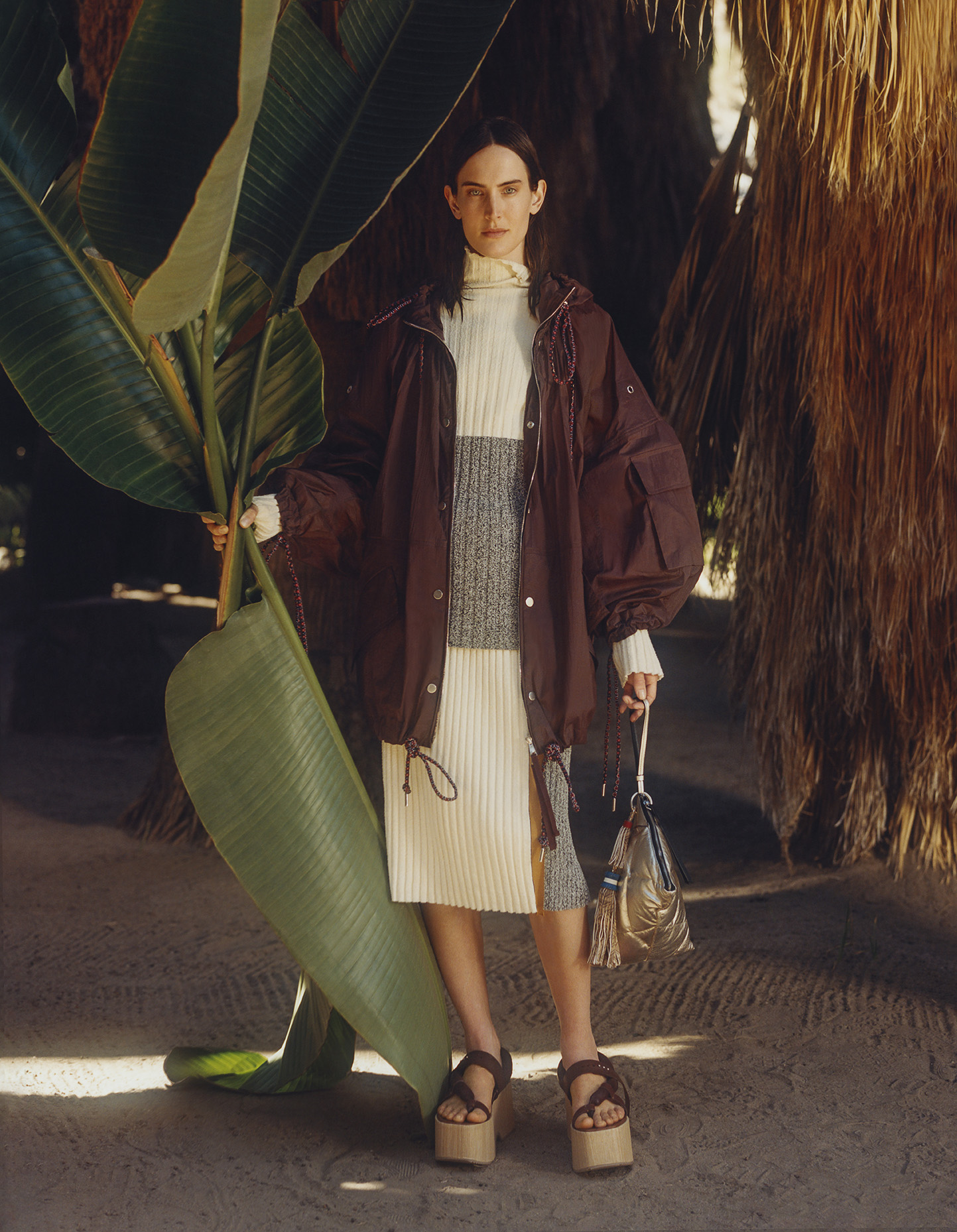 The trench-coat is lightly padded. Blousons have puff sleeves and the padded vest is elongated and made in suede. Parkas have kimono shapes. Ribbed knits are worn underneath, sometimes opened by elbow slashes that allow further reconfigurations. Multi-brim hats, twisted totes, huge backpacks and wooden platforms highlight the wandering feel.