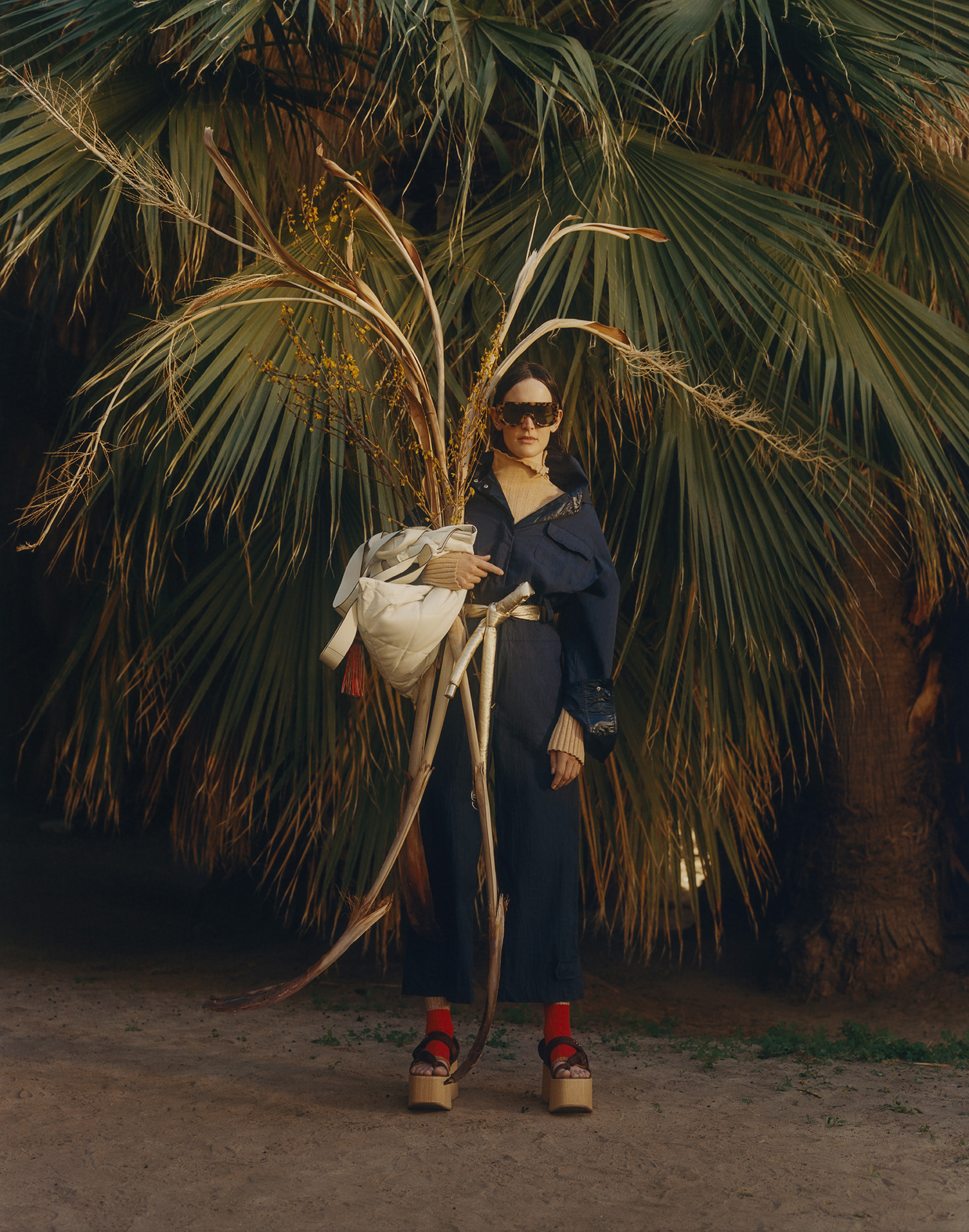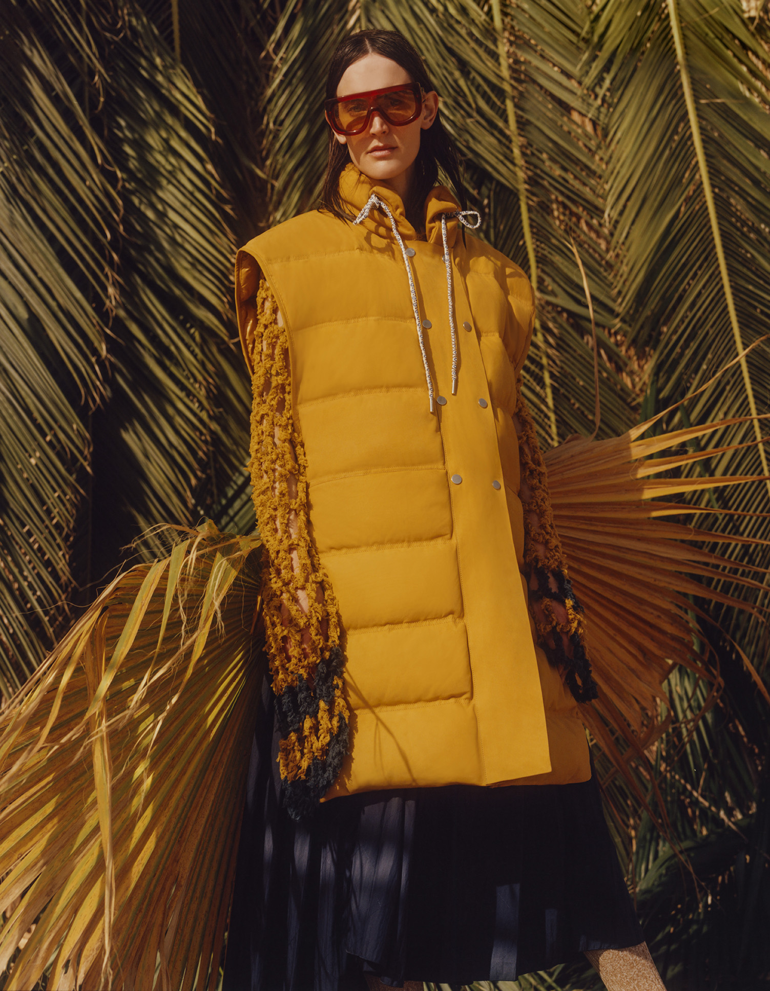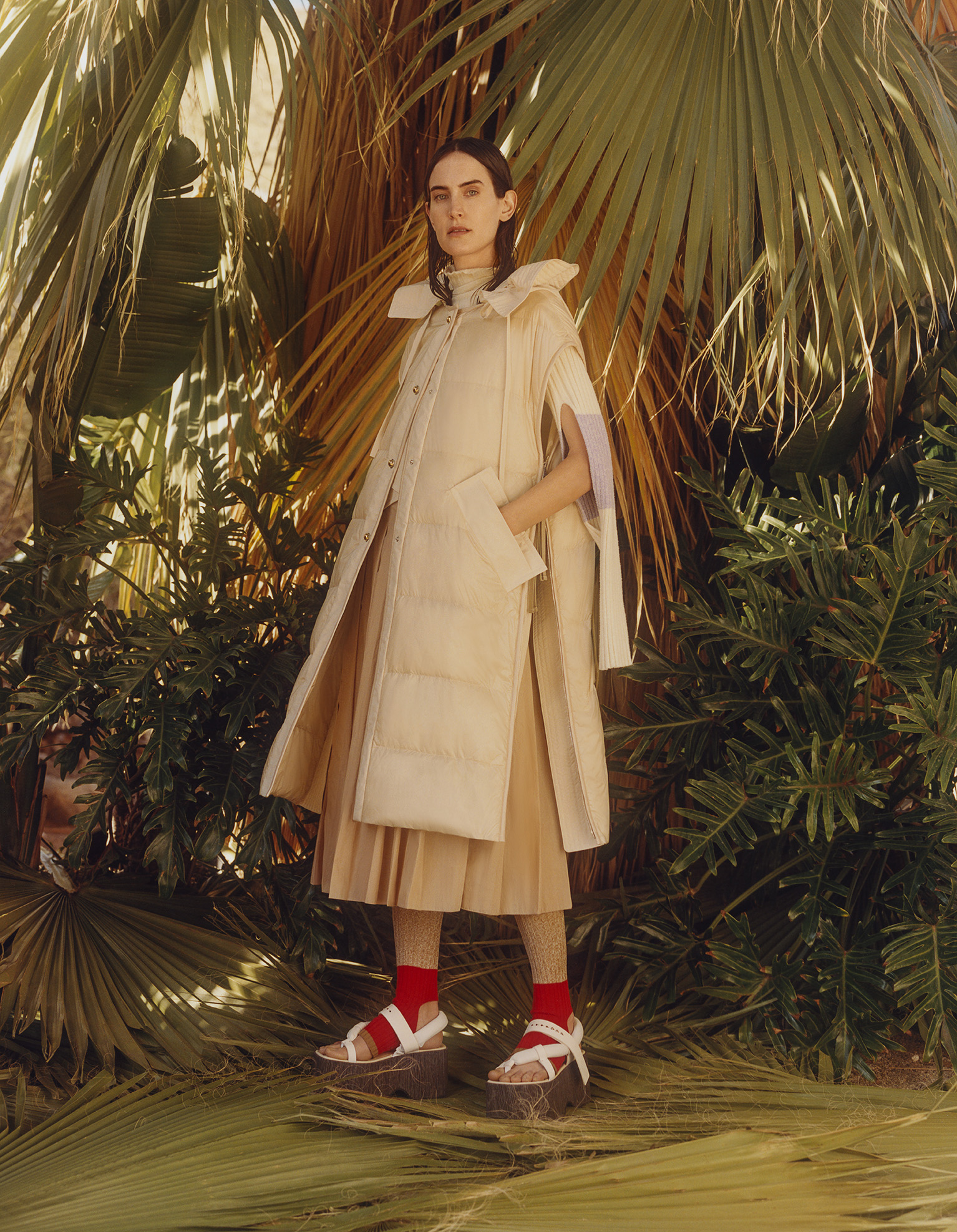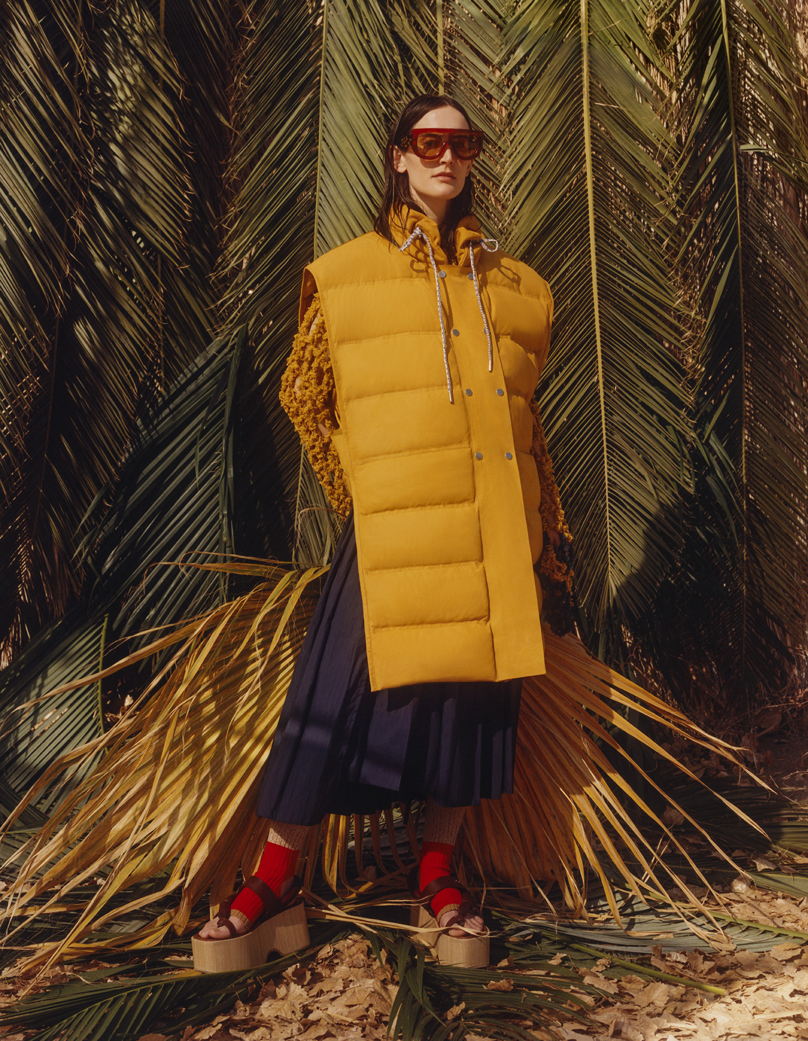 The trench-coat is lightly padded. Blousons have puff sleeves and the padded vest is elongated and made in suede. Parkas have kimono shapes. Ribbed knits are worn underneath, sometimes opened by elbow slashes that allow further reconfigurations. Multi-brim hats, twisted totes, huge backpacks and wooden platforms highlight the wandering feel.