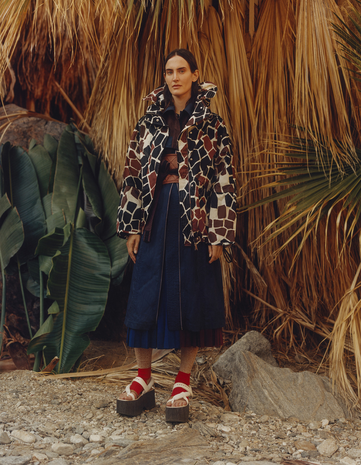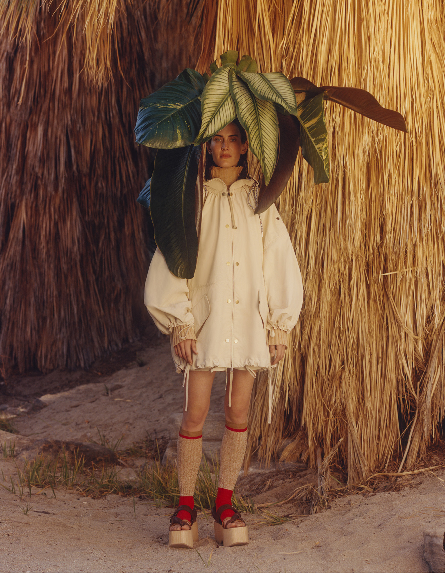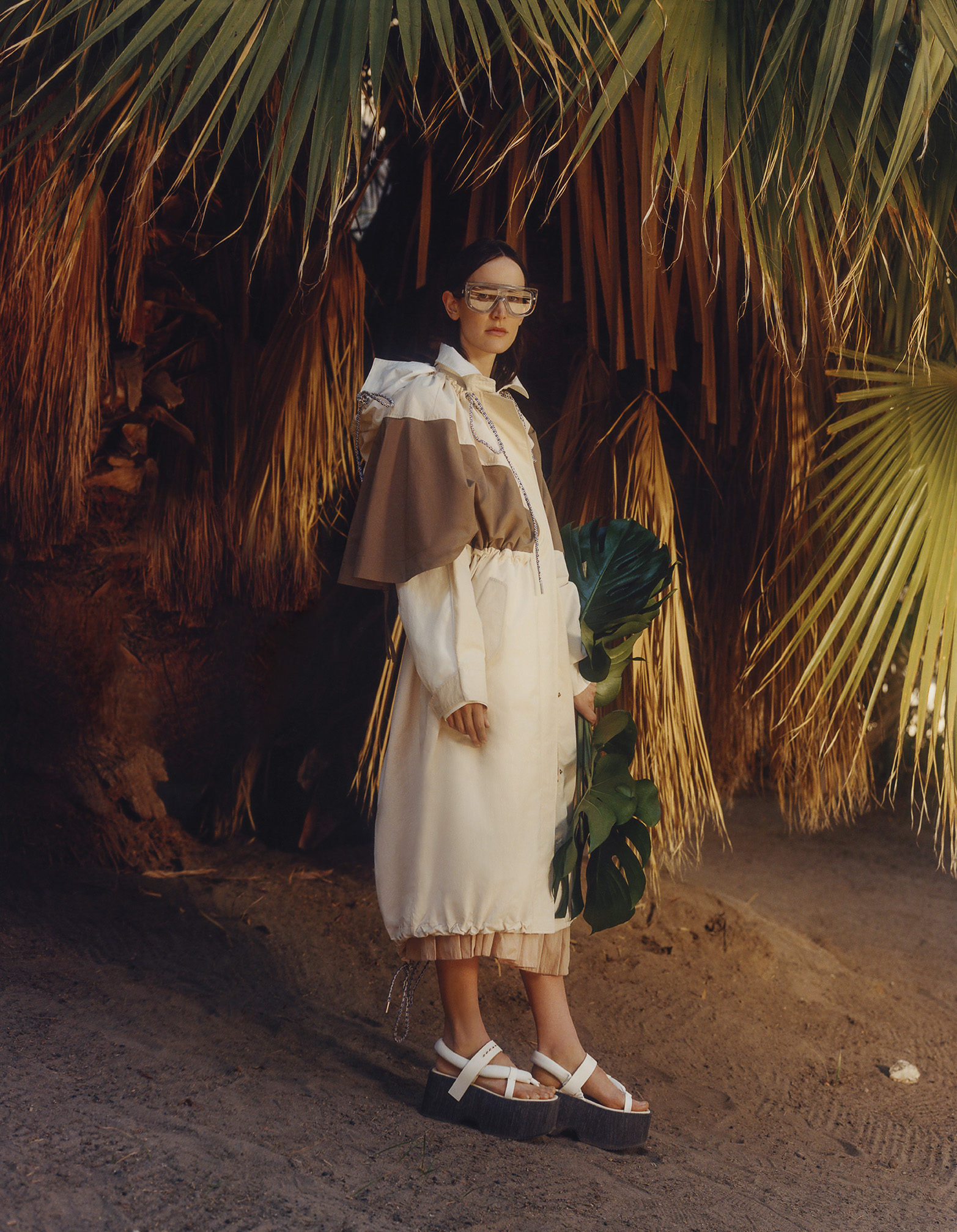 The volume of kimonos and the wooden platforms of Japan meet African geometries as Giraffe prints are splashed onto sportswear shapes and Chinese silhouettes are reconfigured as utilitarian suits. Mischief-drenched tropical lightness is carried through Leoni’s signature superimposition of forms, this season in weightless and transparent materials with an x-ray effect.