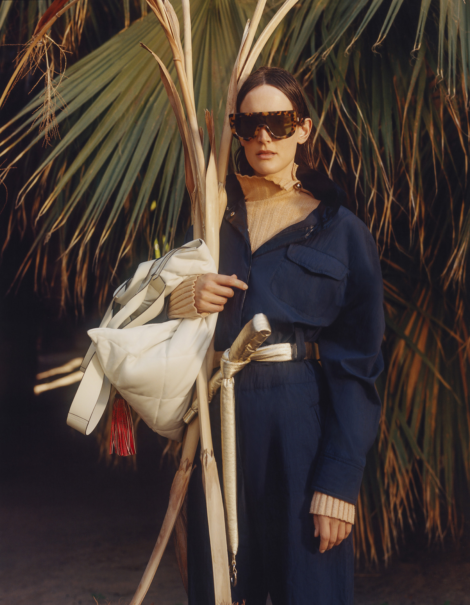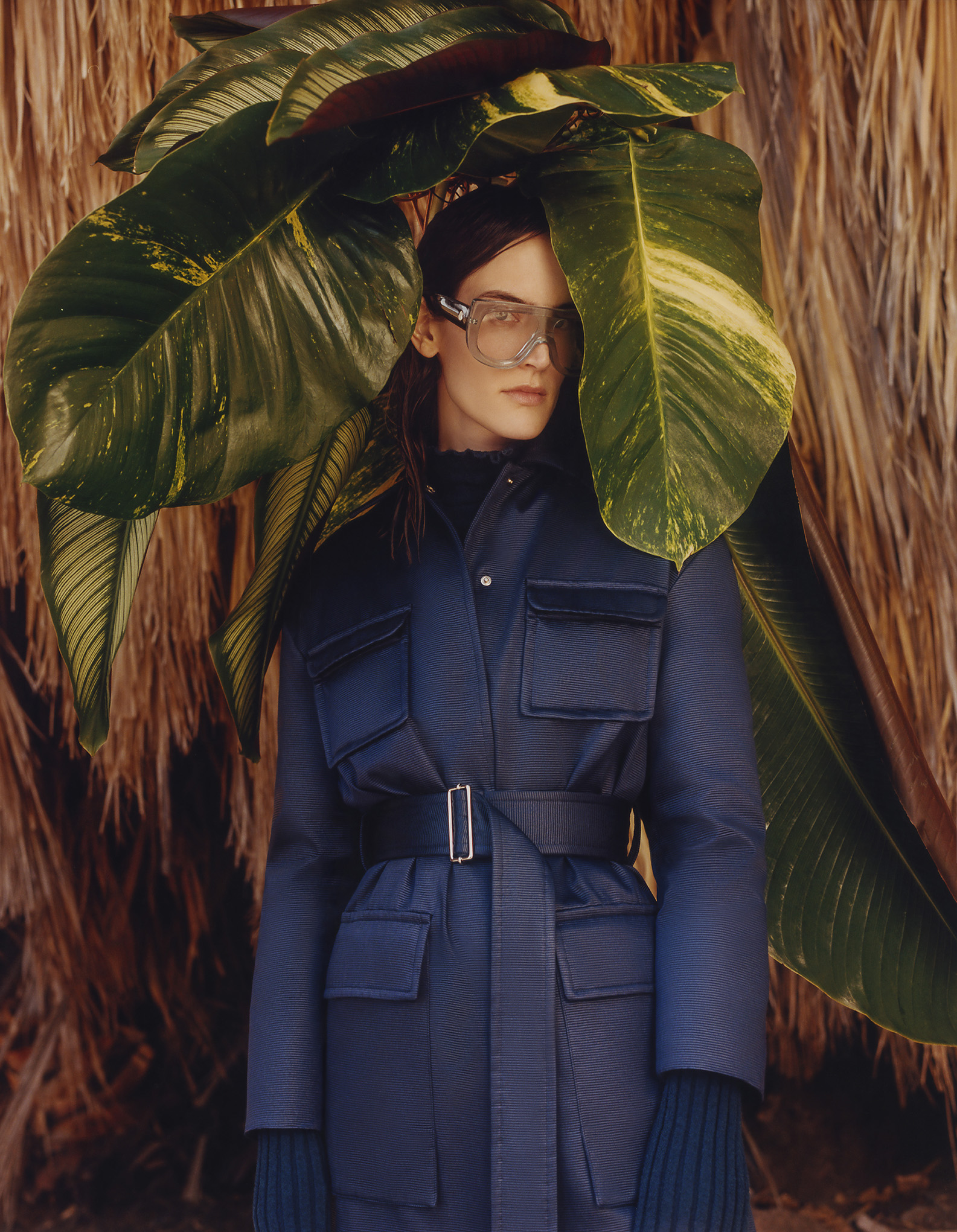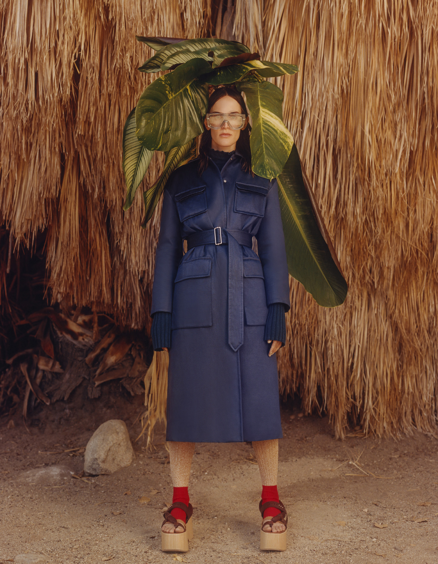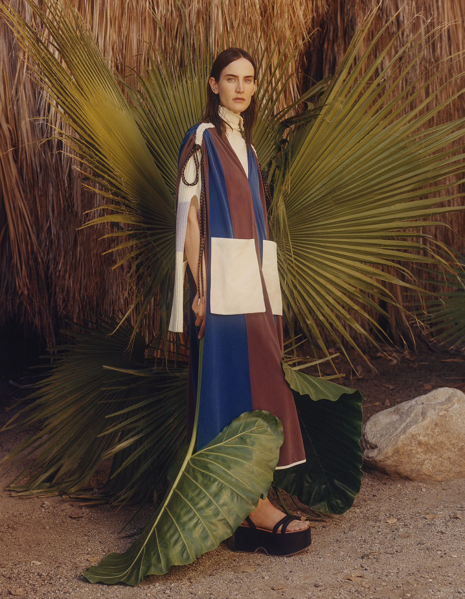 The volume of kimonos and the wooden platforms of Japan meet African geometries as Giraffe prints are splashed onto sportswear shapes and Chinese silhouettes are reconfigured as utilitarian suits. Mischief-drenched tropical lightness is carried through Leoni’s signature superimposition of forms, this season in weightless and transparent materials with an x-ray effect.