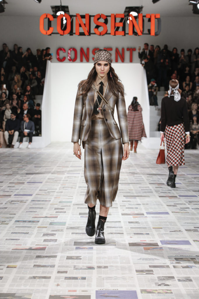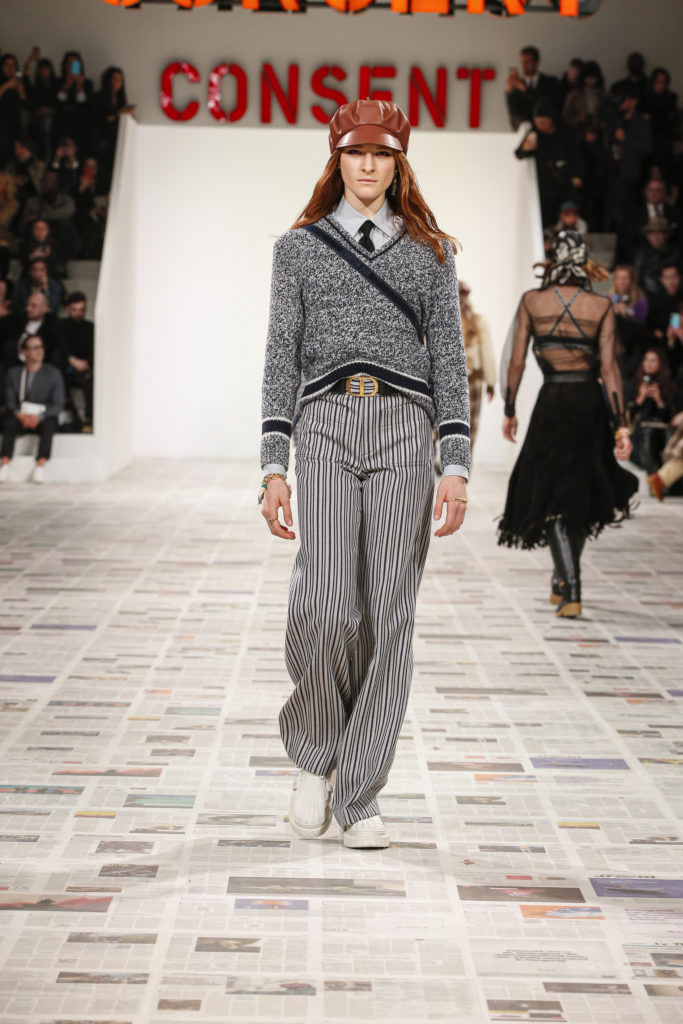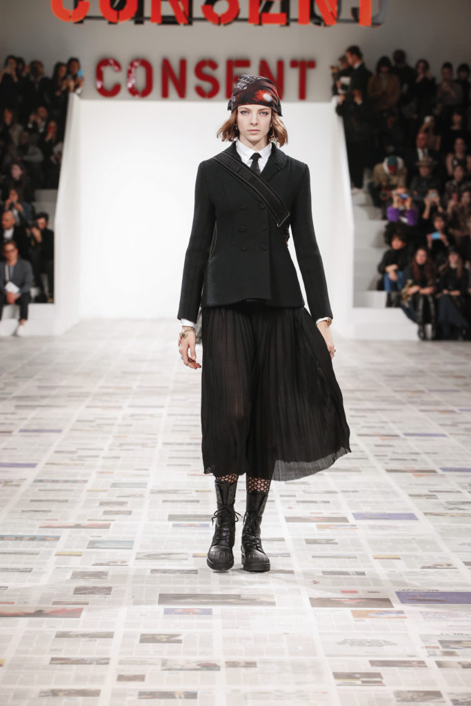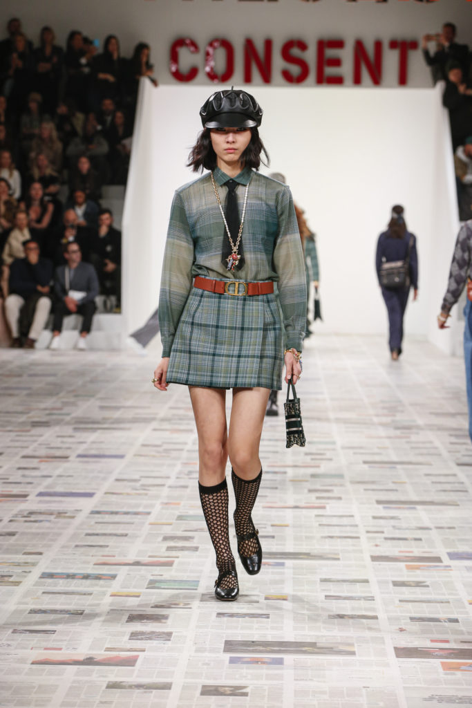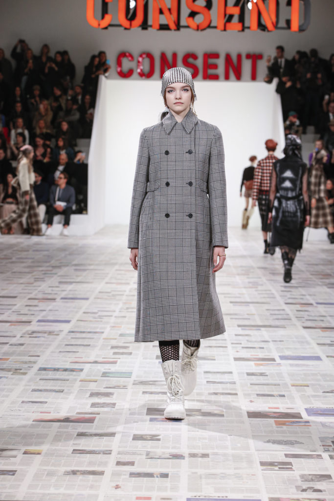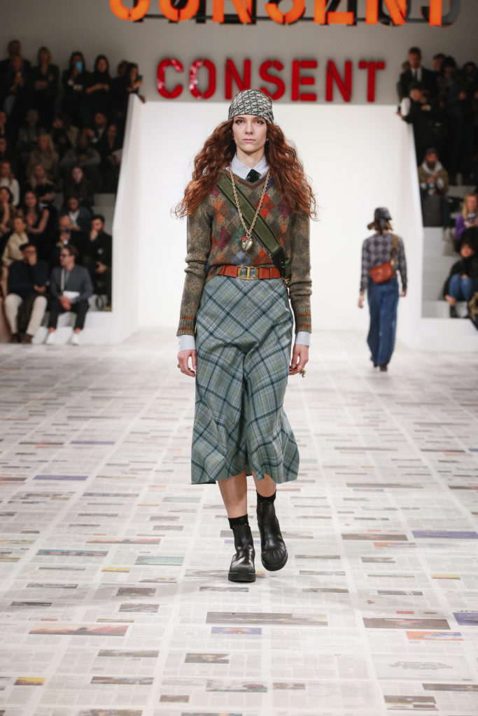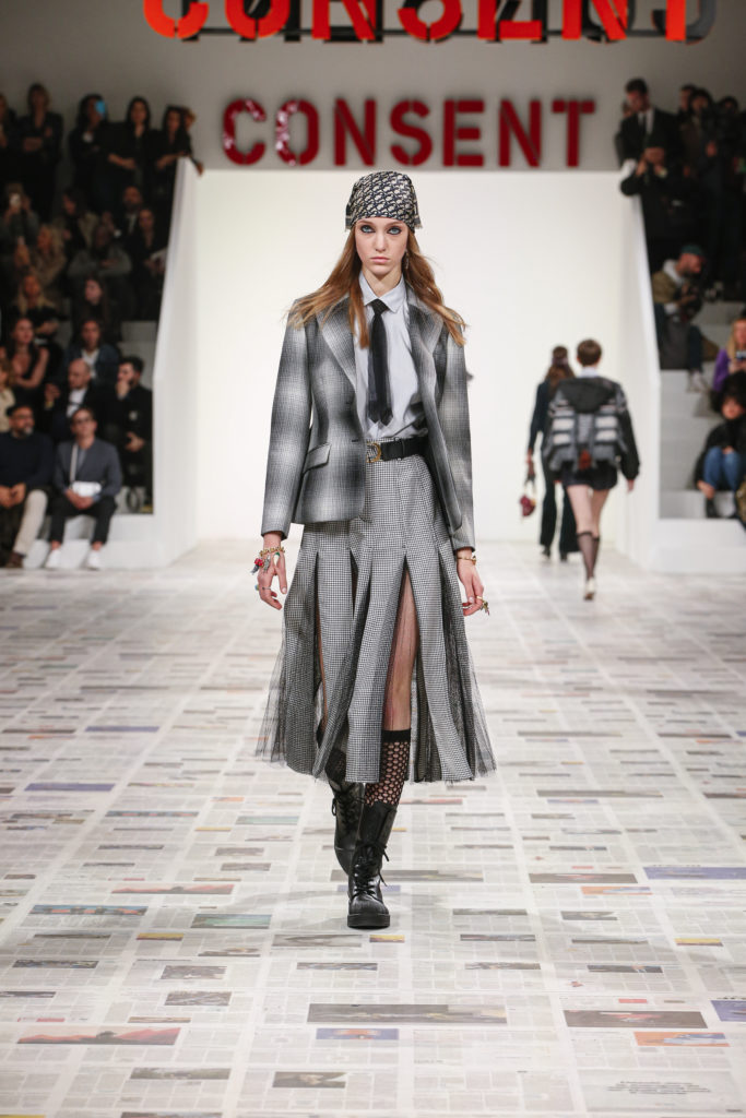 Inspirée par les personnalités emblématiques de l’art féministe italien des années 1960-1970, Maria Grazia Chiuri poursuit, à l’occasion de sa collection prêt-à-porter automne-hiver 2020-2021, sa réflexion sur les liens pluriels et indéfectibles entre corps, féminisme et féminité. Bercée par les images de son adolescence, la Directrice Artistique imagine un chemin initiatique vers l’affirmation de soi, à travers l’art et la mode. Ainsi, carreaux et pois, jupes longues et plissées, noir et blanc façonnent le vêtement, lieu d’affranchissement et de liberté, entre identité et sororité. Conçue par l’artiste collective Claire Fontaine, la scénographie du défilé, scandant les mots « I say I » – traduits du manifeste « Io dico Io » de la célèbre figure italienne Carla Lonzi*. Le catwalk est recouvert de pages du journal Le Monde, une nouvelle version de la pièce Newsfloor, intitulée Le Monde pixélisé, d’après une photographie d’Henri Matisse – prise par Robert Capa en 1949 –, tandis que des phrases lumineuses sont suspendues, tels des sous-titres engagés. Une manière singulièrement créative d’aborder les multiples facettes de la subjectivité féminine. Et du projet infini qu’est le féminin.
