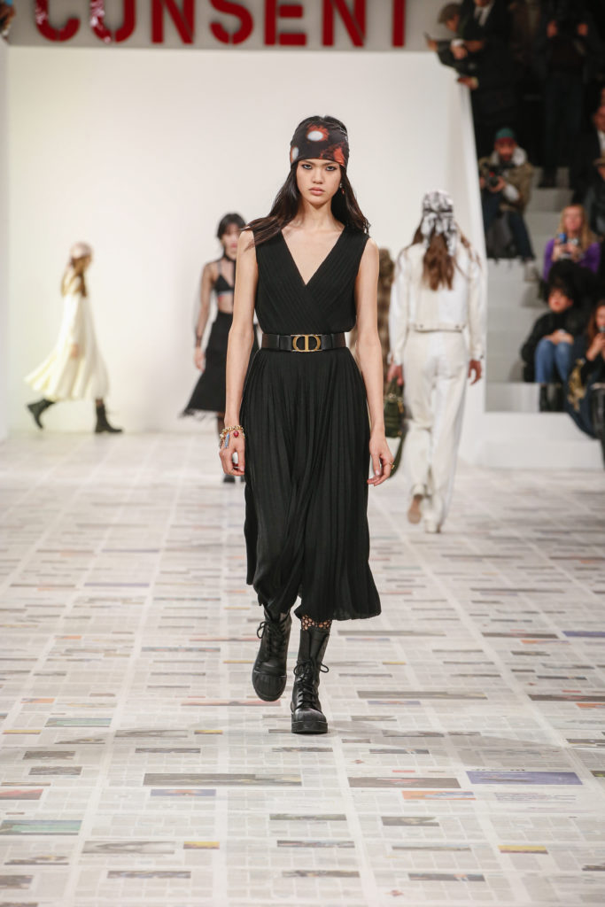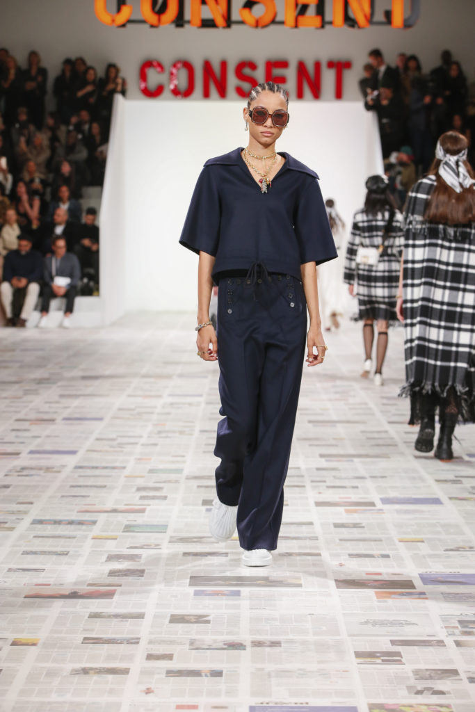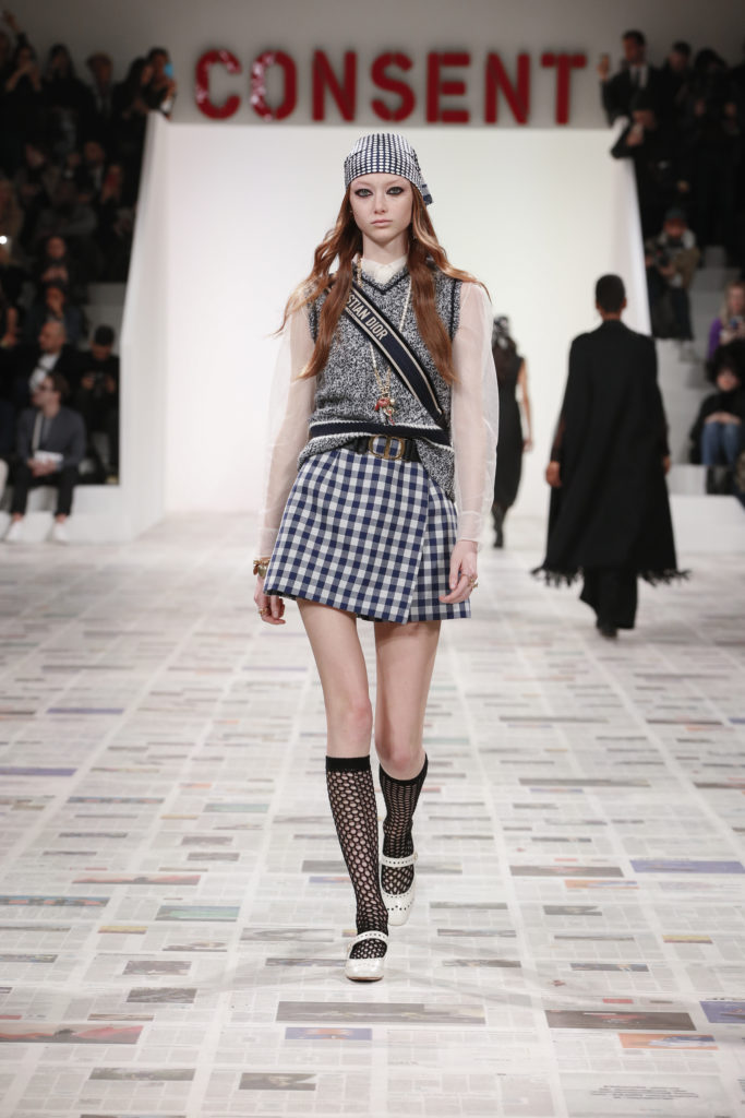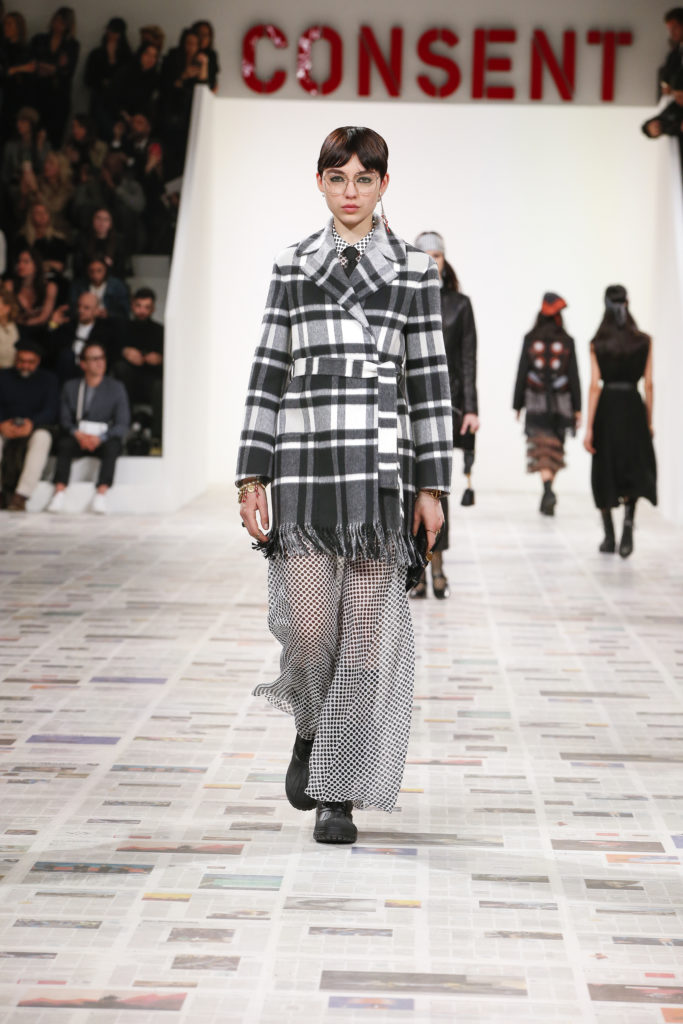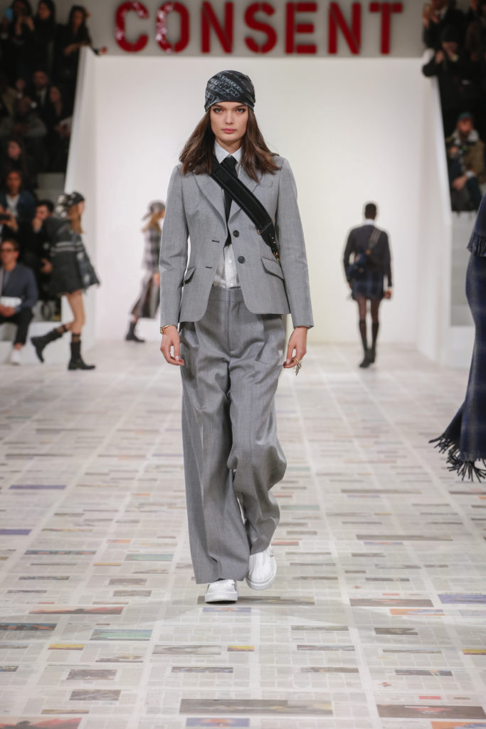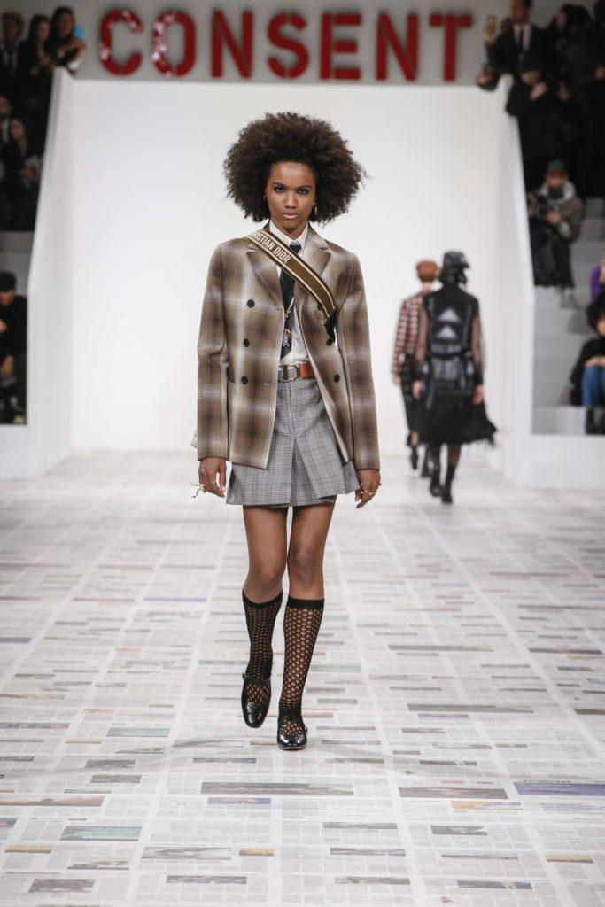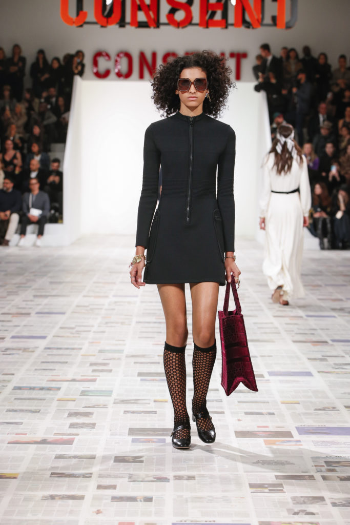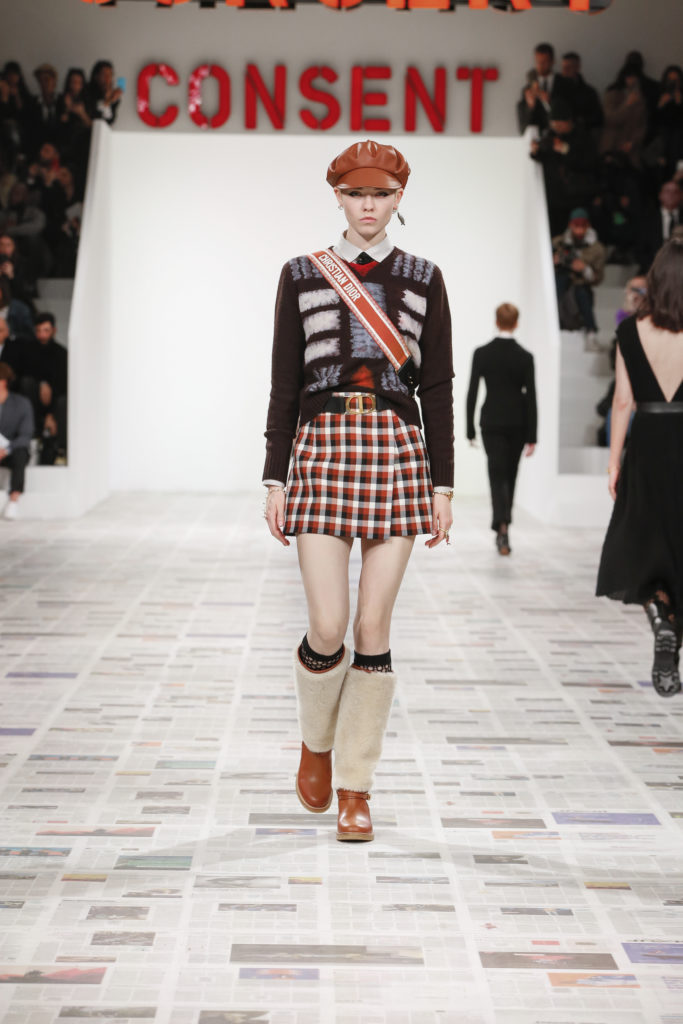 Inspirée par les personnalités emblématiques de l’art féministe italien des années 1960-1970, Maria Grazia Chiuri poursuit, à l’occasion de sa collection prêt-à-porter automne-hiver 2020-2021, sa réflexion sur les liens pluriels et indéfectibles entre corps, féminisme et féminité. Bercée par les images de son adolescence, la Directrice Artistique imagine un chemin initiatique vers l’affirmation de soi, à travers l’art et la mode. Ainsi, carreaux et pois, jupes longues et plissées, noir et blanc façonnent le vêtement, lieu d’affranchissement et de liberté, entre identité et sororité. Conçue par l’artiste collective Claire Fontaine, la scénographie du défilé, scandant les mots « I say I » – traduits du manifeste « Io dico Io » de la célèbre figure italienne Carla Lonzi*. Le catwalk est recouvert de pages du journal Le Monde, une nouvelle version de la pièce Newsfloor, intitulée Le Monde pixélisé, d’après une photographie d’Henri Matisse – prise par Robert Capa en 1949 –, tandis que des phrases lumineuses sont suspendues, tels des sous-titres engagés. Une manière singulièrement créative d’aborder les multiples facettes de la subjectivité féminine. Et du projet infini qu’est le féminin.