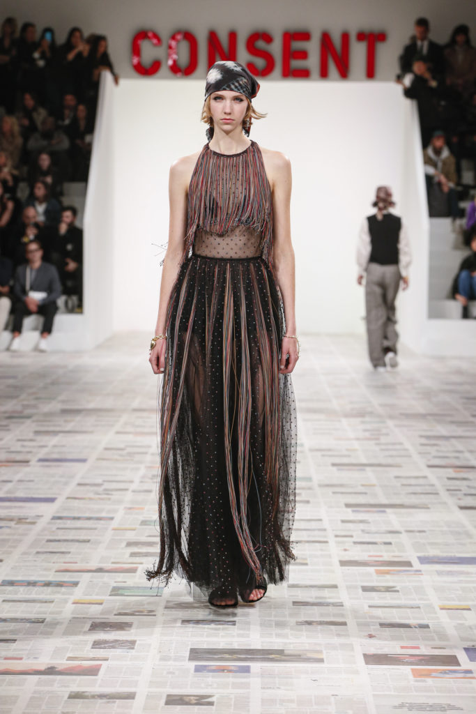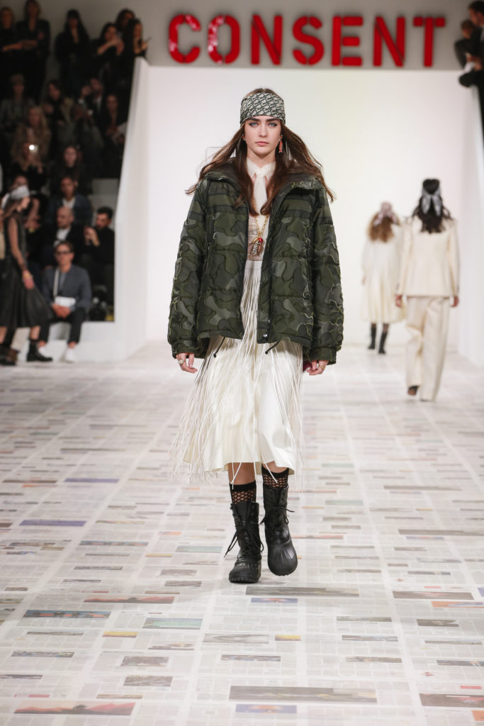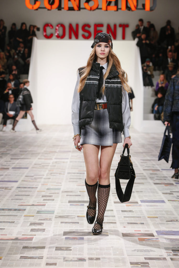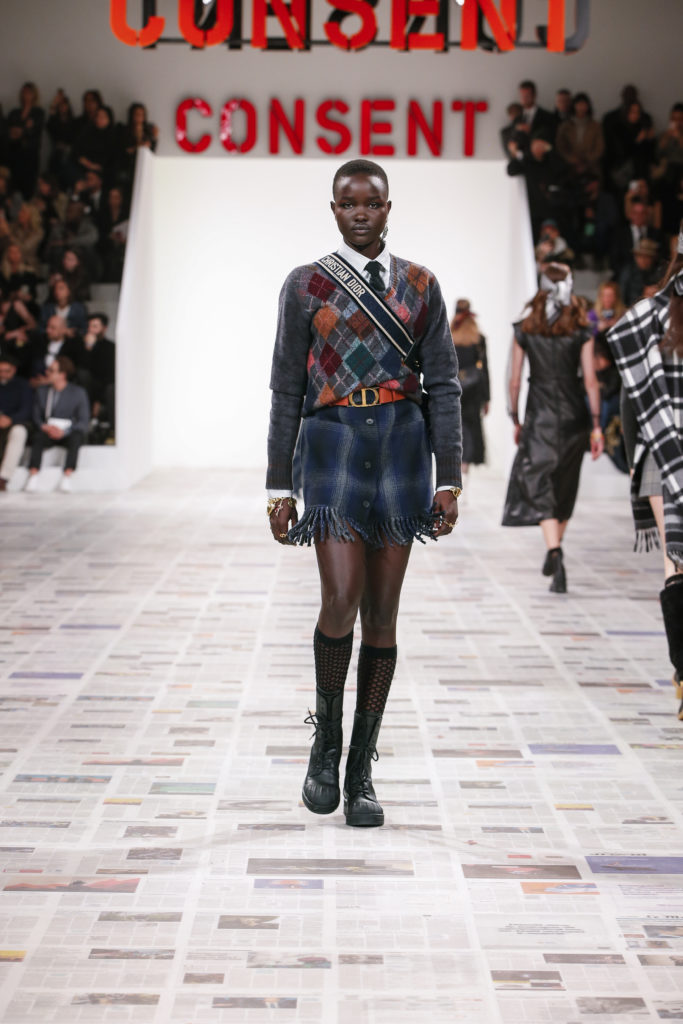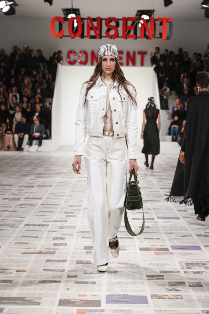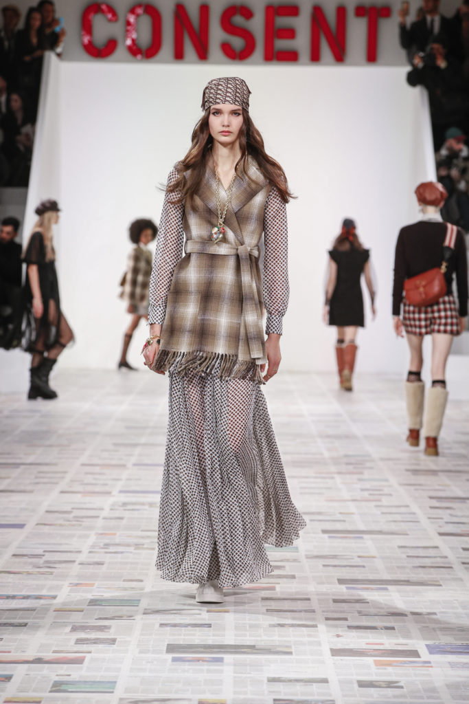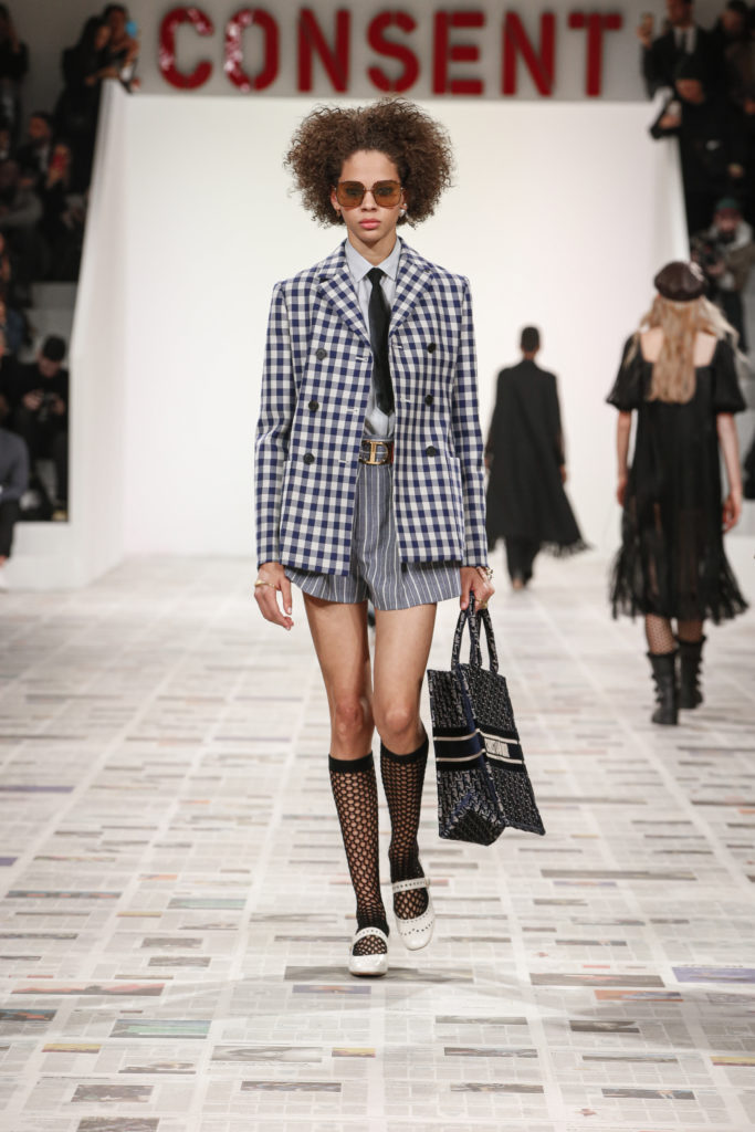 Inspirée par les personnalités emblématiques de l’art féministe italien des années 1960-1970, Maria Grazia Chiuri poursuit, à l’occasion de sa collection prêt-à-porter automne-hiver 2020-2021, sa réflexion sur les liens pluriels et indéfectibles entre corps, féminisme et féminité. Bercée par les images de son adolescence, la Directrice Artistique imagine un chemin initiatique vers l’affirmation de soi, à travers l’art et la mode. Ainsi, carreaux et pois, jupes longues et plissées, noir et blanc façonnent le vêtement, lieu d’affranchissement et de liberté, entre identité et sororité. Conçue par l’artiste collective Claire Fontaine, la scénographie du défilé, scandant les mots « I say I » – traduits du manifeste « Io dico Io » de la célèbre figure italienne Carla Lonzi*. Le catwalk est recouvert de pages du journal Le Monde, une nouvelle version de la pièce Newsfloor, intitulée Le Monde pixélisé, d’après une photographie d’Henri Matisse – prise par Robert Capa en 1949 –, tandis que des phrases lumineuses sont suspendues, tels des sous-titres engagés. Une manière singulièrement créative d’aborder les multiples facettes de la subjectivité féminine. Et du projet infini qu’est le féminin.