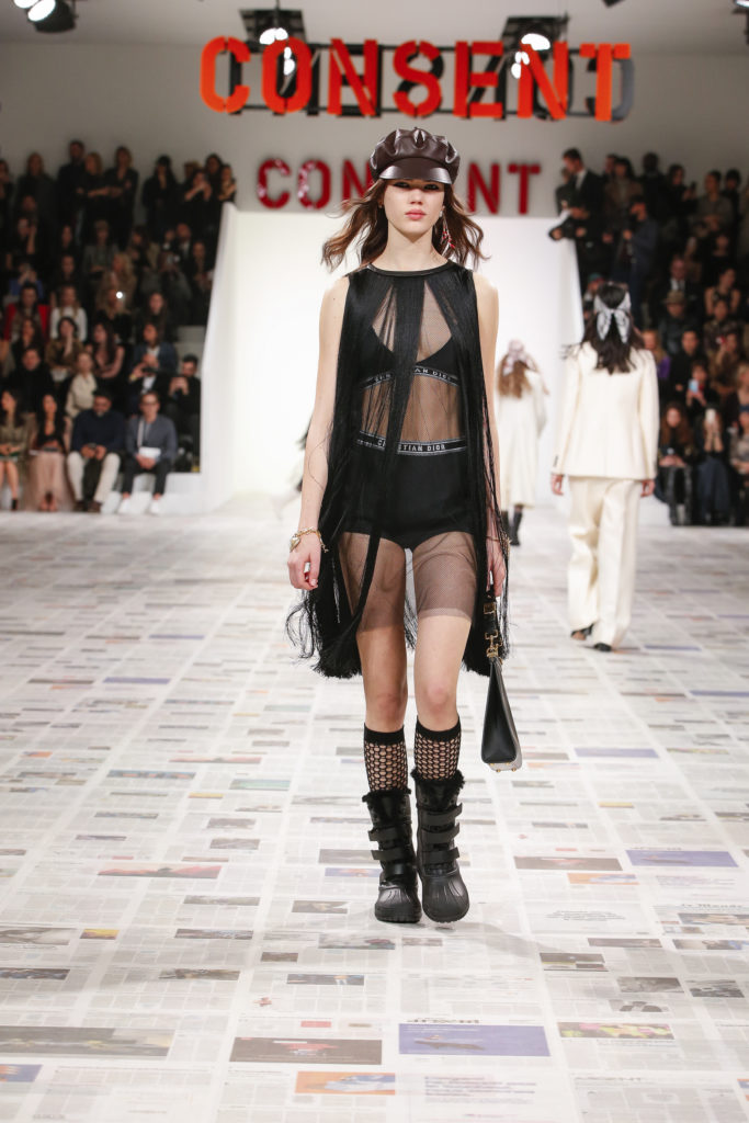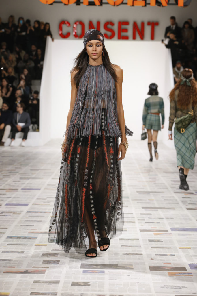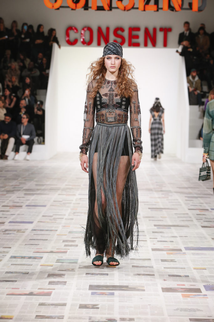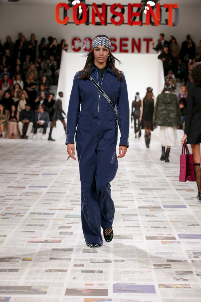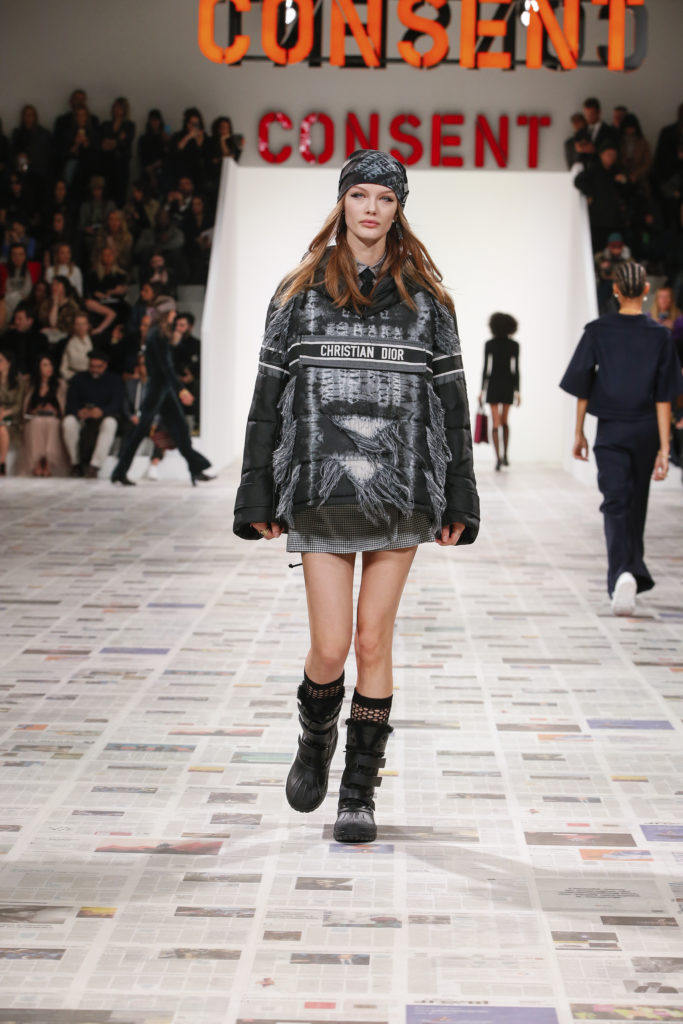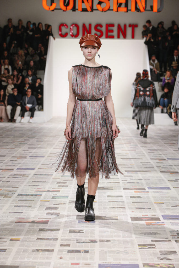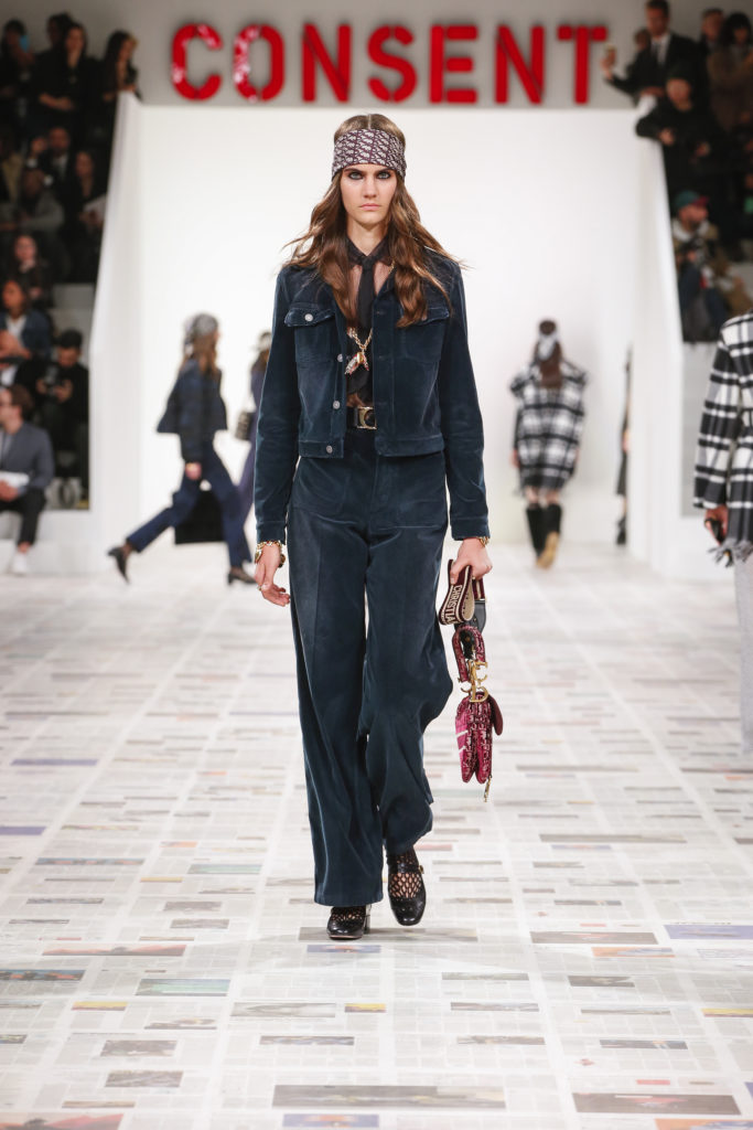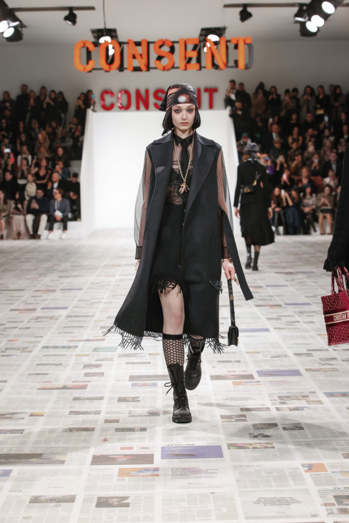 Inspirée par les personnalités emblématiques de l’art féministe italien des années 1960-1970, Maria Grazia Chiuri poursuit, à l’occasion de sa collection prêt-à-porter automne-hiver 2020-2021, sa réflexion sur les liens pluriels et indéfectibles entre corps, féminisme et féminité. Bercée par les images de son adolescence, la Directrice Artistique imagine un chemin initiatique vers l’affirmation de soi, à travers l’art et la mode. Ainsi, carreaux et pois, jupes longues et plissées, noir et blanc façonnent le vêtement, lieu d’affranchissement et de liberté, entre identité et sororité. Conçue par l’artiste collective Claire Fontaine, la scénographie du défilé, scandant les mots « I say I » – traduits du manifeste « Io dico Io » de la célèbre figure italienne Carla Lonzi*. Le catwalk est recouvert de pages du journal Le Monde, une nouvelle version de la pièce Newsfloor, intitulée Le Monde pixélisé, d’après une photographie d’Henri Matisse – prise par Robert Capa en 1949 –, tandis que des phrases lumineuses sont suspendues, tels des sous-titres engagés. Une manière singulièrement créative d’aborder les multiples facettes de la subjectivité féminine. Et du projet infini qu’est le féminin.