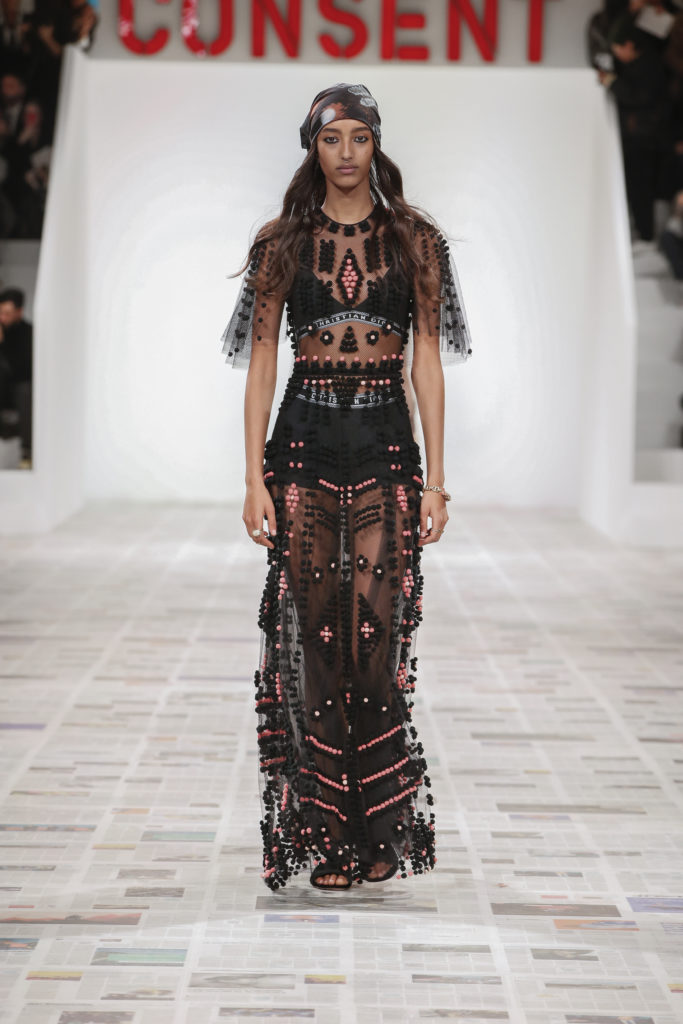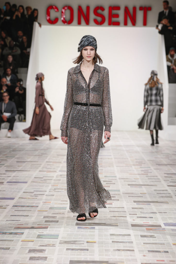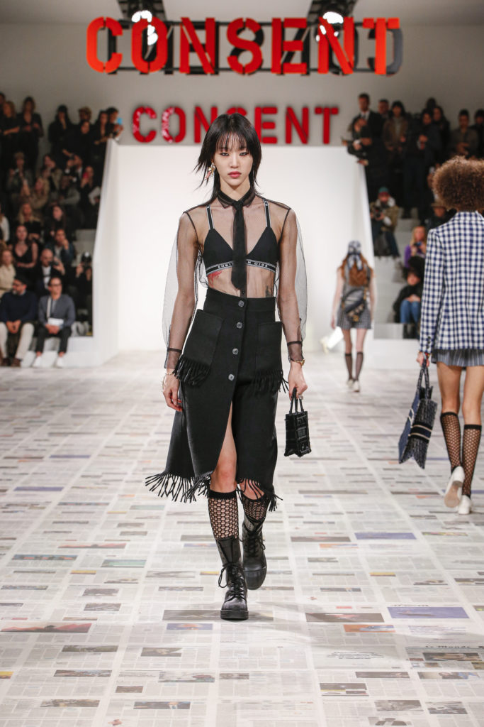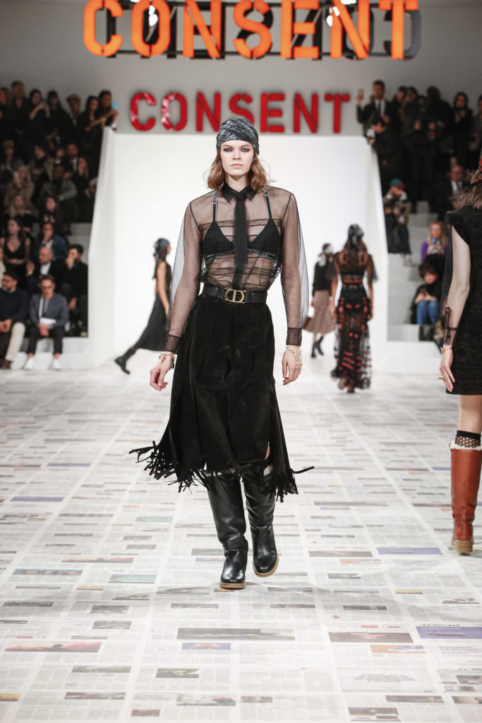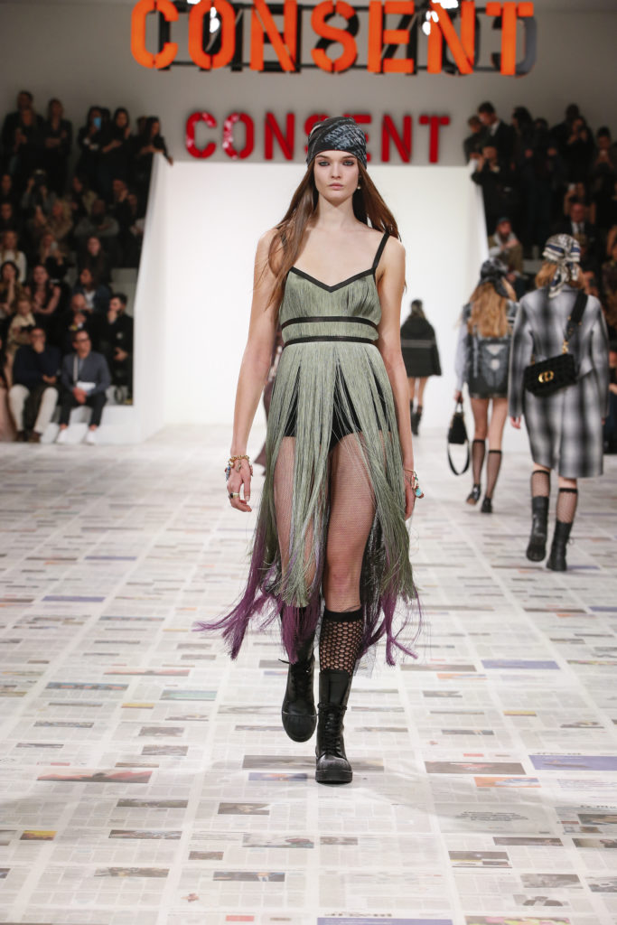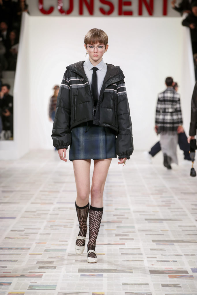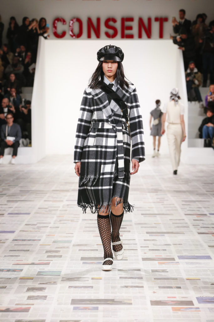 Inspirée par les personnalités emblématiques de l’art féministe italien des années 1960-1970, Maria Grazia Chiuri poursuit, à l’occasion de sa collection prêt-à-porter automne-hiver 2020-2021, sa réflexion sur les liens pluriels et indéfectibles entre corps, féminisme et féminité. Bercée par les images de son adolescence, la Directrice Artistique imagine un chemin initiatique vers l’affirmation de soi, à travers l’art et la mode. Ainsi, carreaux et pois, jupes longues et plissées, noir et blanc façonnent le vêtement, lieu d’affranchissement et de liberté, entre identité et sororité. Conçue par l’artiste collective Claire Fontaine, la scénographie du défilé, scandant les mots « I say I » – traduits du manifeste « Io dico Io » de la célèbre figure italienne Carla Lonzi*. Le catwalk est recouvert de pages du journal Le Monde, une nouvelle version de la pièce Newsfloor, intitulée Le Monde pixélisé, d’après une photographie d’Henri Matisse – prise par Robert Capa en 1949 –, tandis que des phrases lumineuses sont suspendues, tels des sous-titres engagés. Une manière singulièrement créative d’aborder les multiples facettes de la subjectivité féminine. Et du projet infini qu’est le féminin.