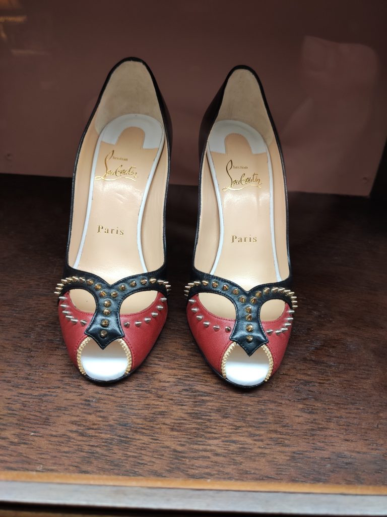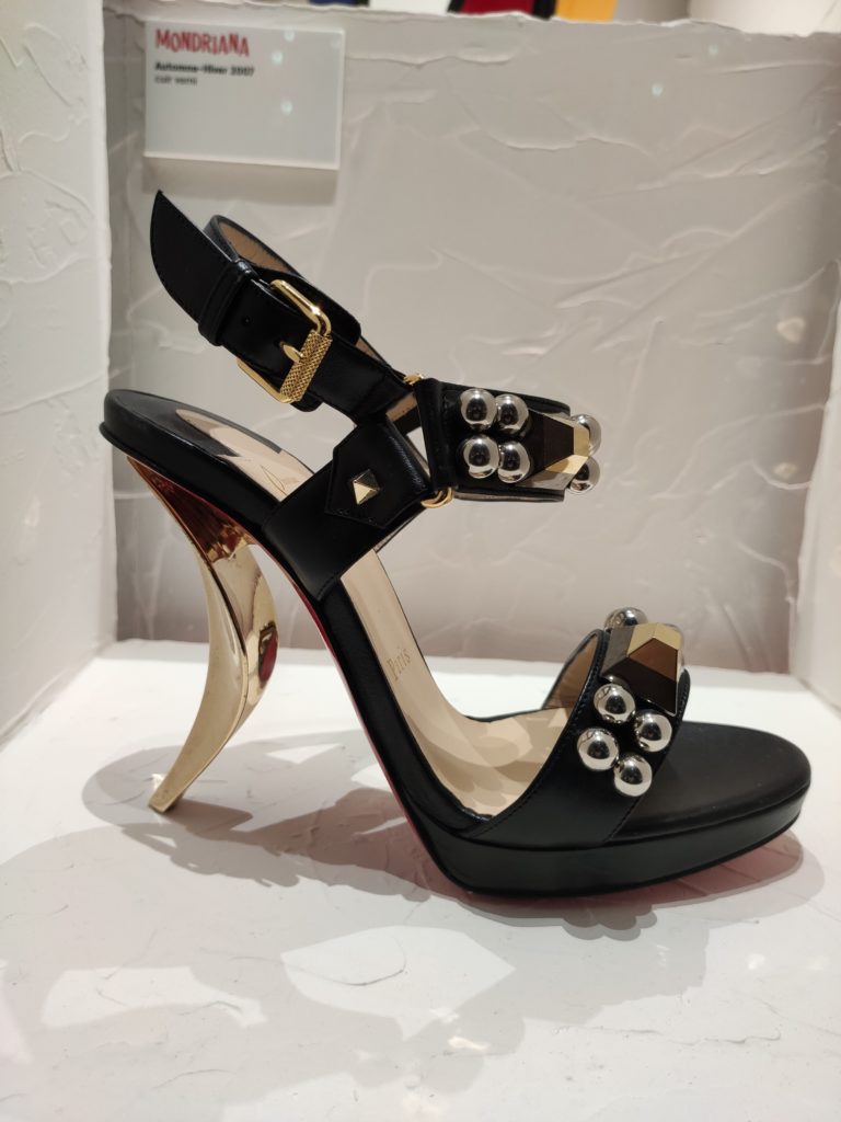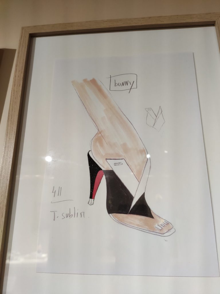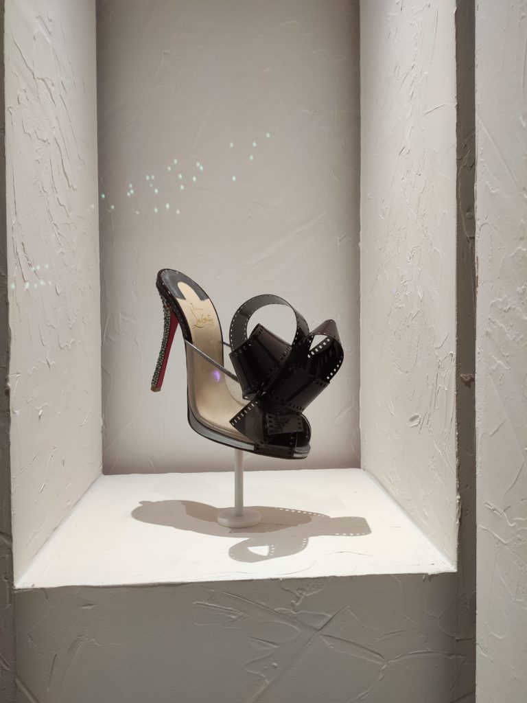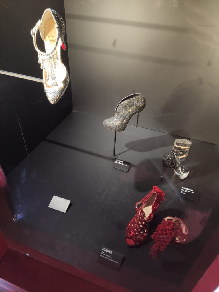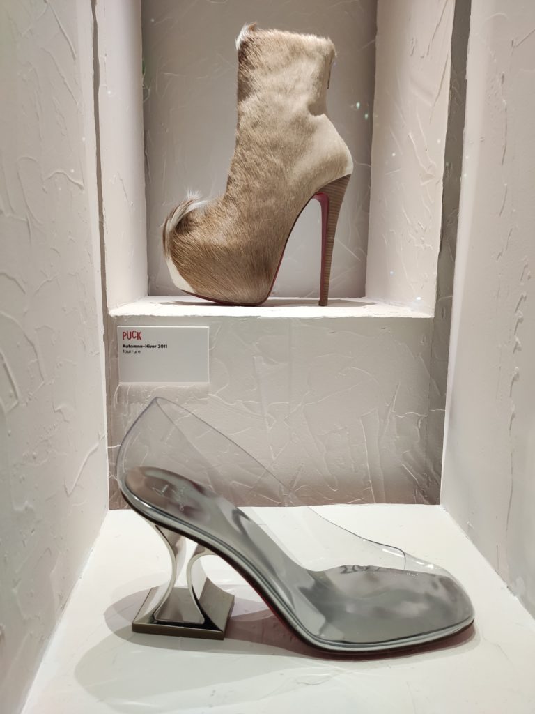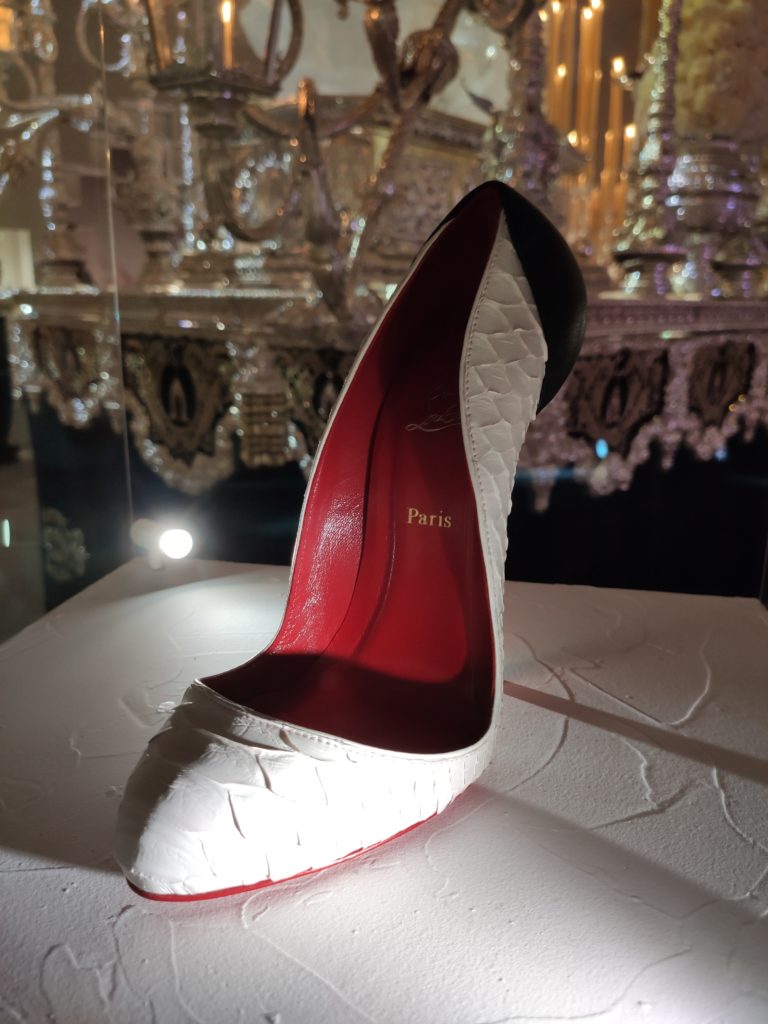 Une large sélection de souliers et croquis est présentée, dont certains jamais exposés. Ces pièces patrimoniales et artistiques sont exposées aux côtés de nombreuses collaborations qui soulignent l’attachement de Christian Louboutin pour les savoir-faire et les métiers d’art, comme des vitraux réalisés par la Maison du Vitrail à Paris, un palanquin d’argent réalisé par l’Orfebreria Villareal de Séville, ou encore un cabaret sculpté au Bhoutan.
