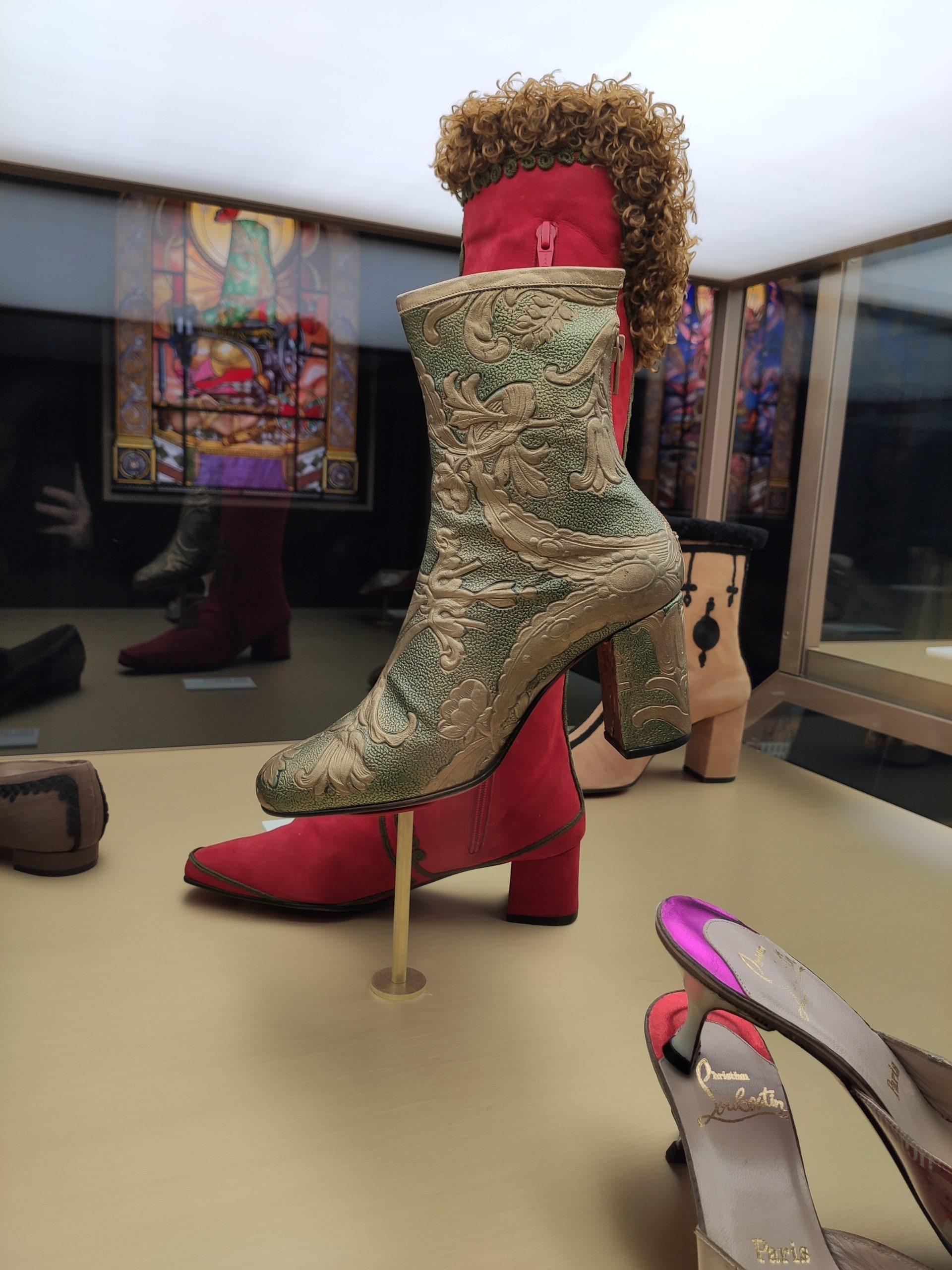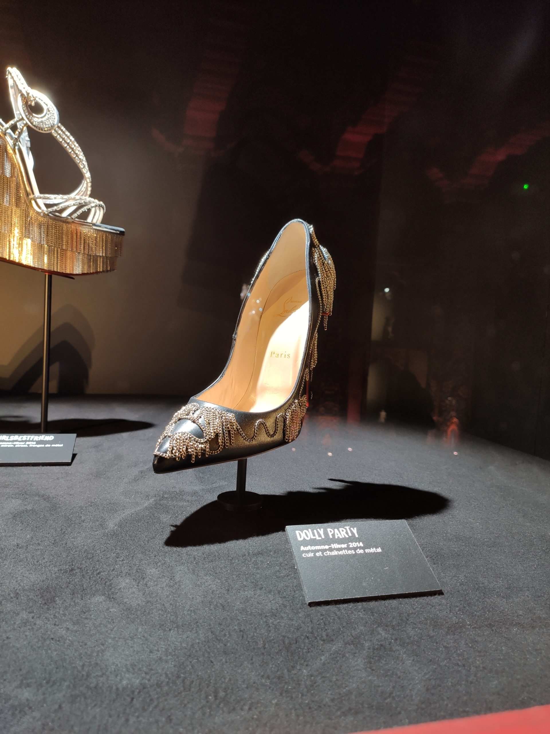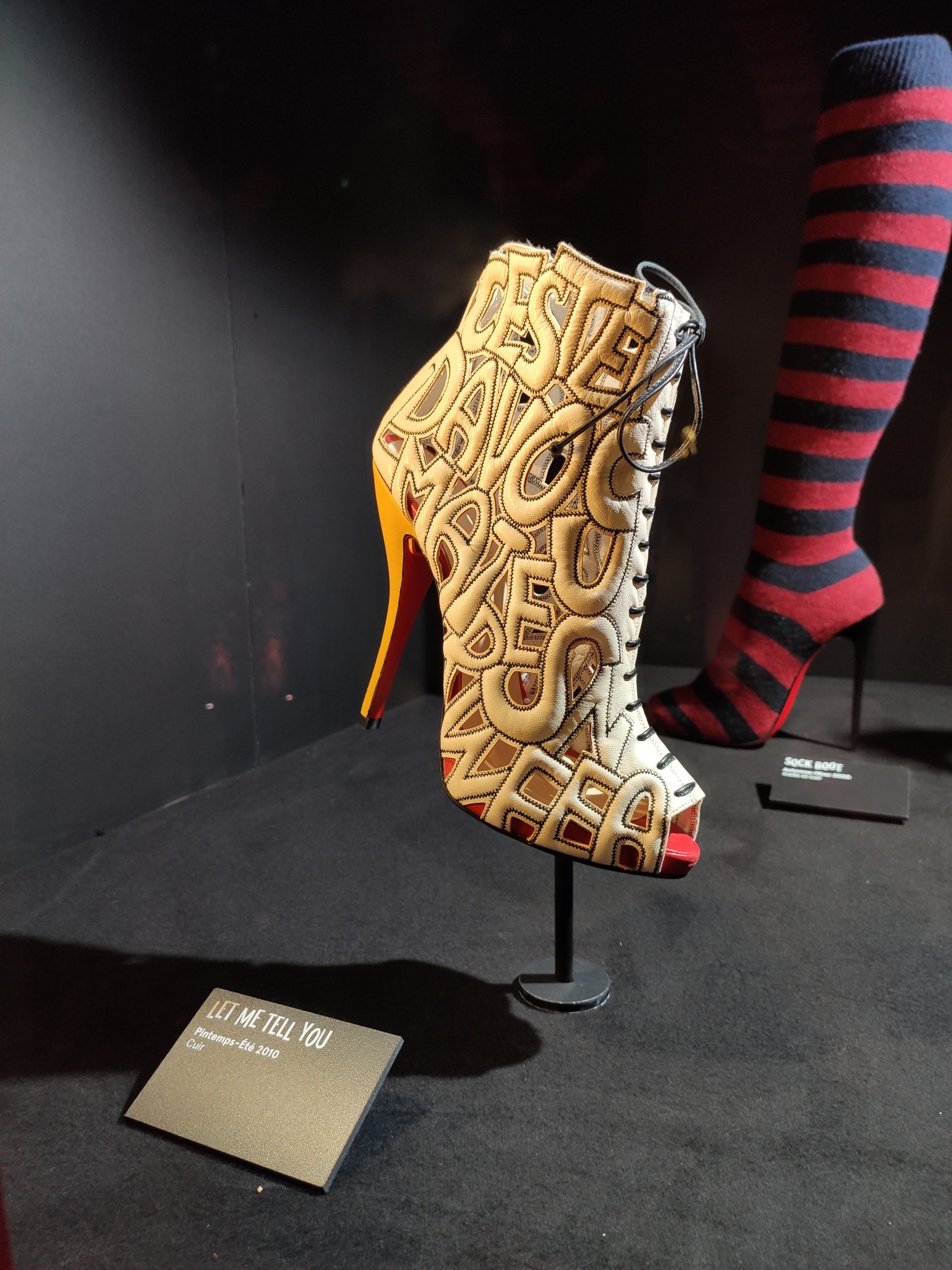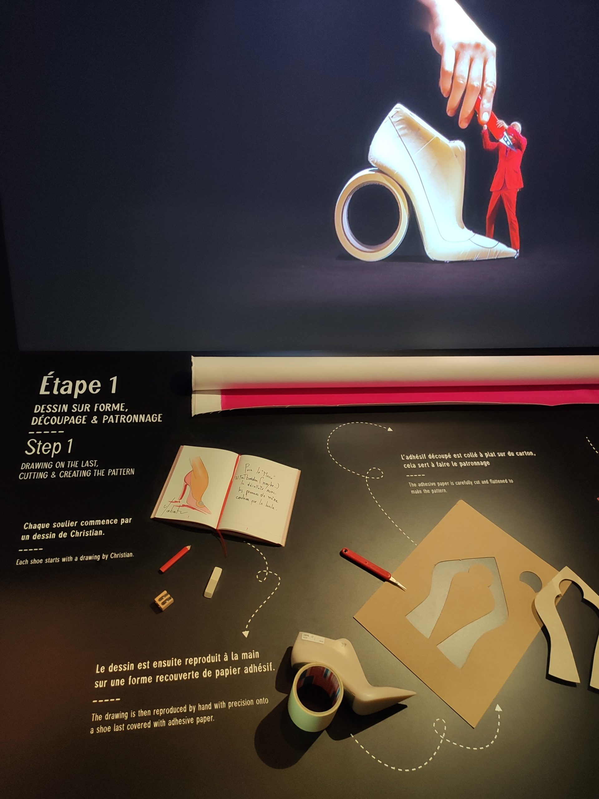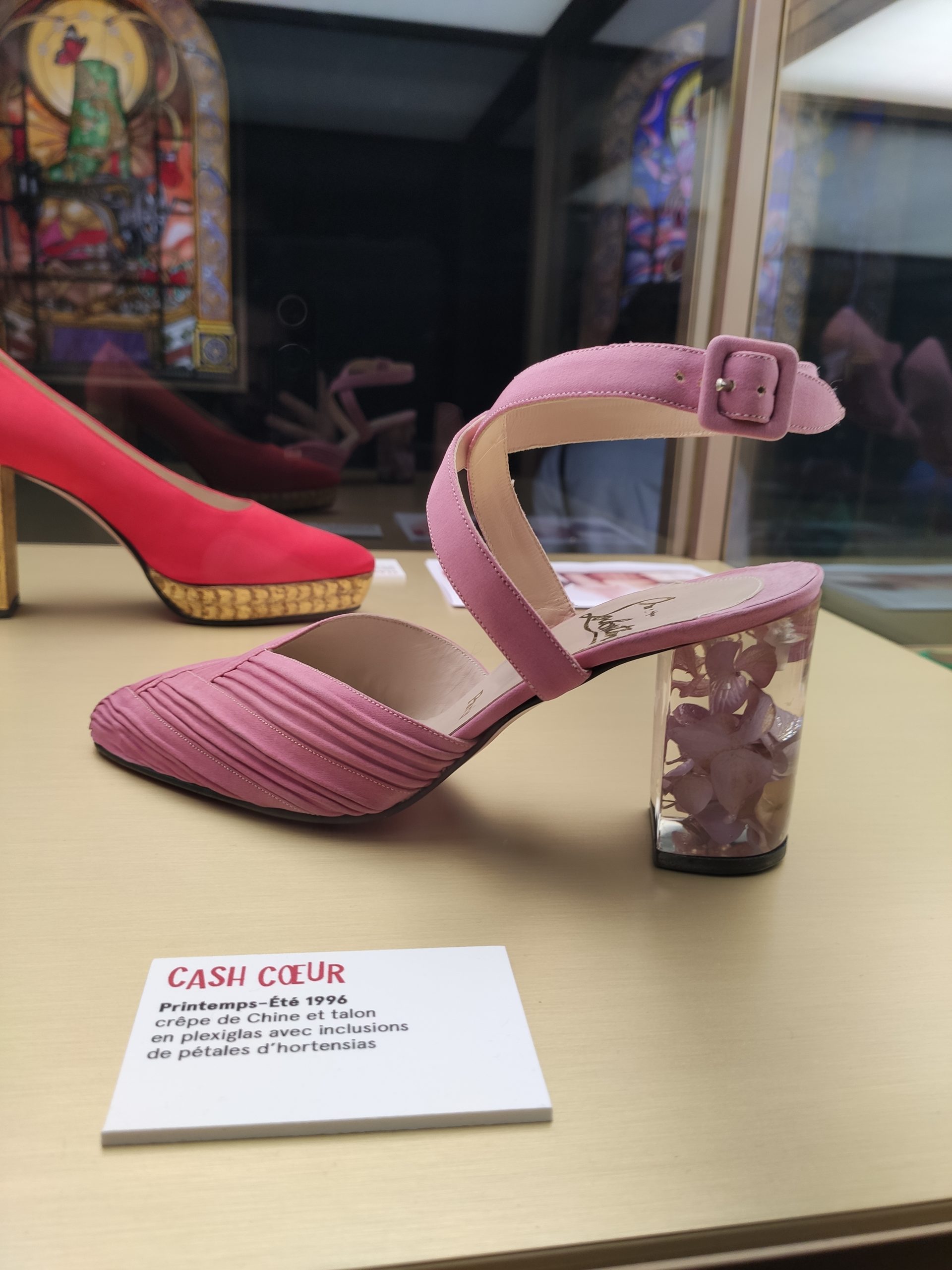 Une large sélection de souliers et croquis est présentée, dont certains jamais exposés. Ces pièces patrimoniales et artistiques sont exposées aux côtés de nombreuses collaborations qui soulignent l’attachement de Christian Louboutin pour les savoir-faire et les métiers d’art, comme des vitraux réalisés par la Maison du Vitrail à Paris, un palanquin d’argent réalisé par l’Orfebreria Villareal de Séville, ou encore un cabaret sculpté au Bhoutan.