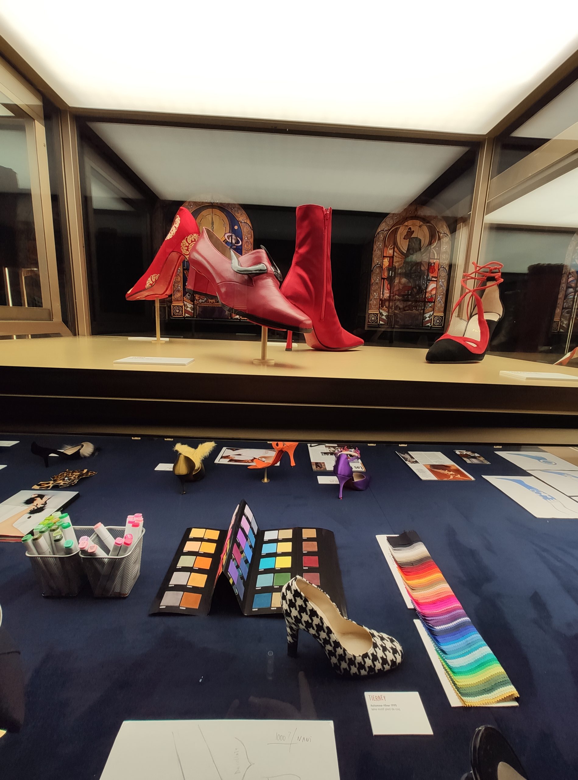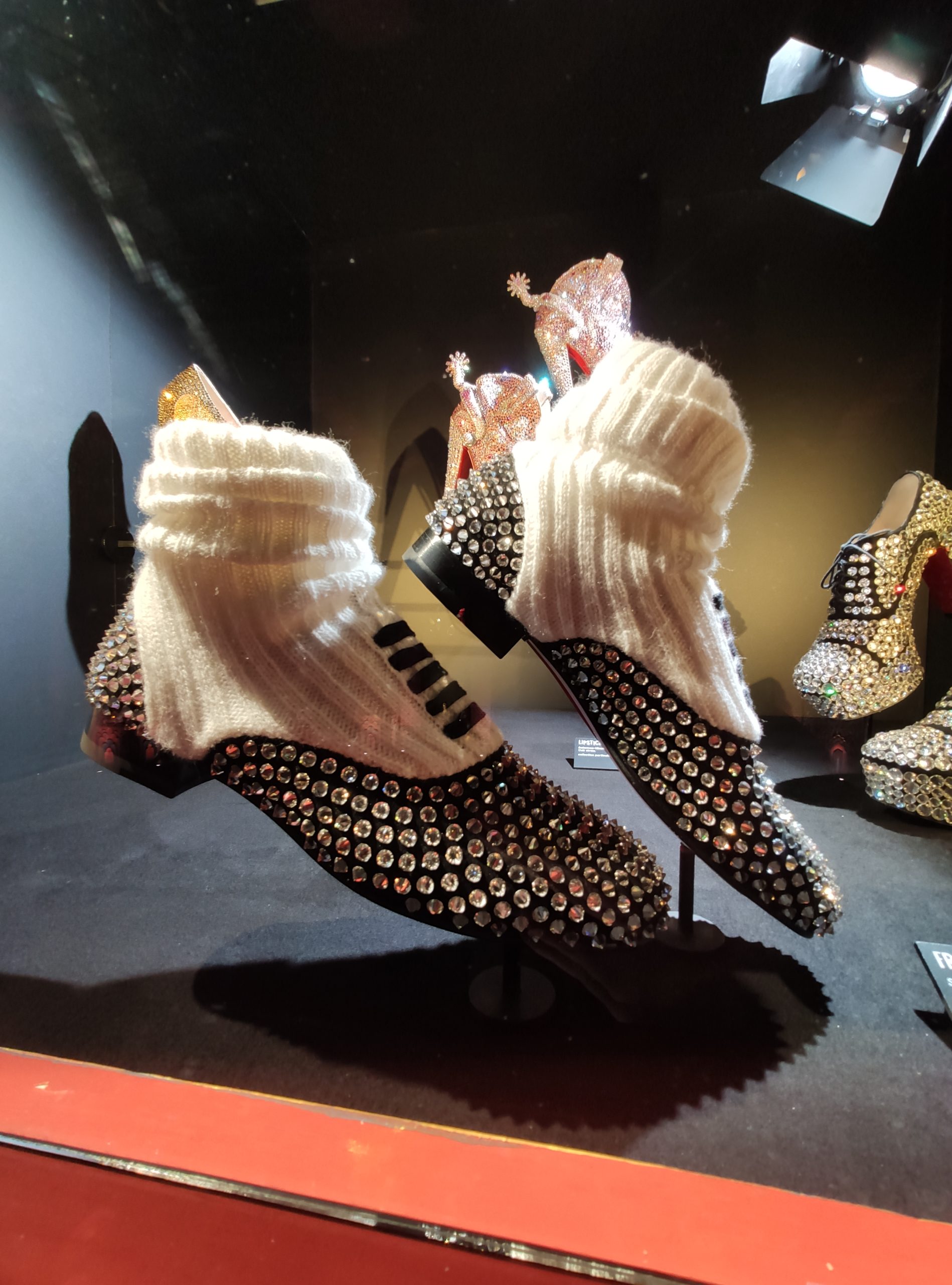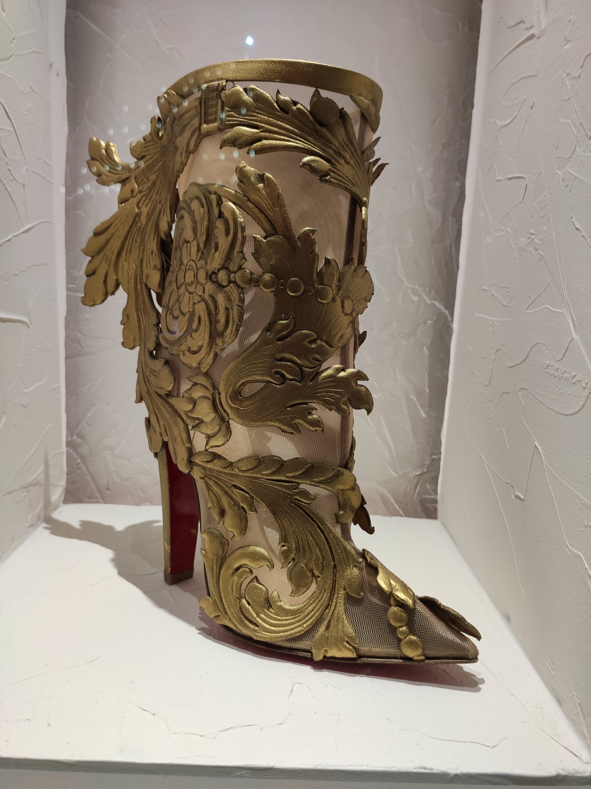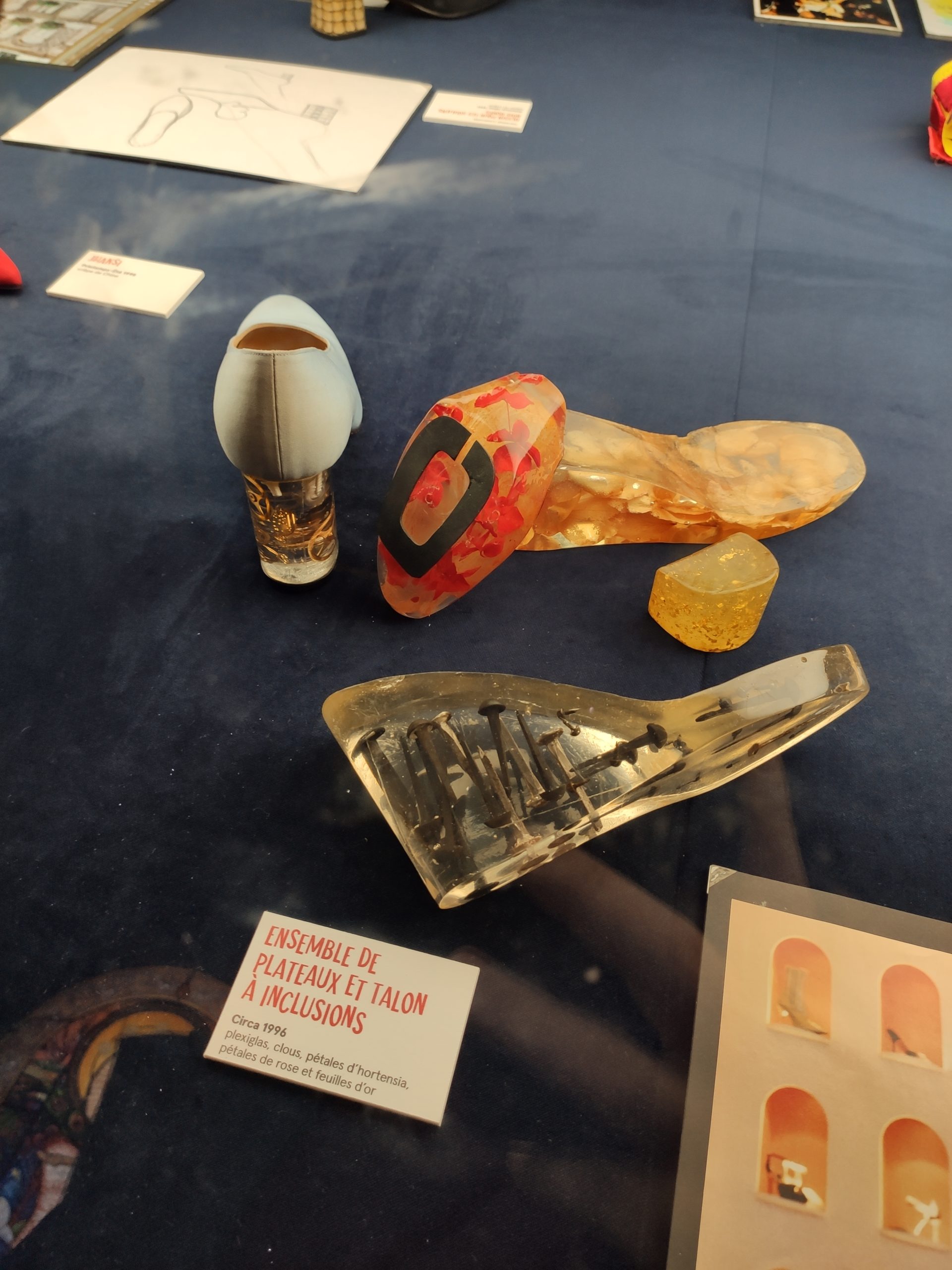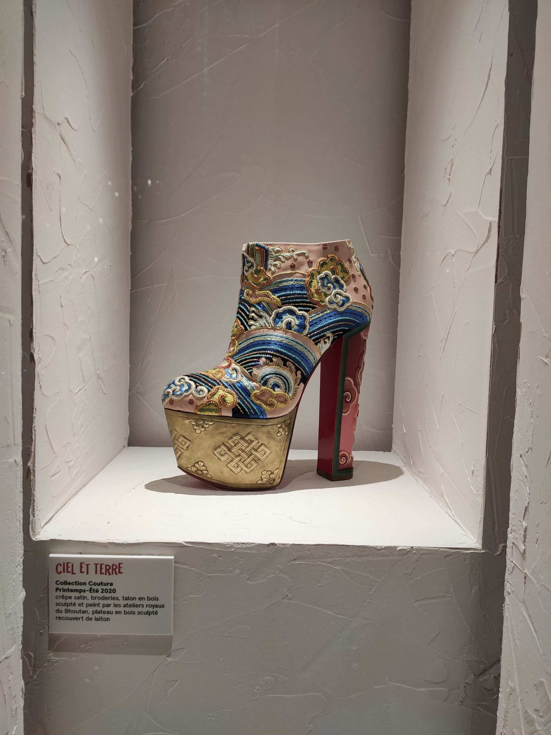 Une large sélection de souliers et croquis est présentée, dont certains jamais exposés. Ces pièces patrimoniales et artistiques sont exposées aux côtés de nombreuses collaborations qui soulignent l’attachement de Christian Louboutin pour les savoir-faire et les métiers d’art, comme des vitraux réalisés par la Maison du Vitrail à Paris, un palanquin d’argent réalisé par l’Orfebreria Villareal de Séville, ou encore un cabaret sculpté au Bhoutan.