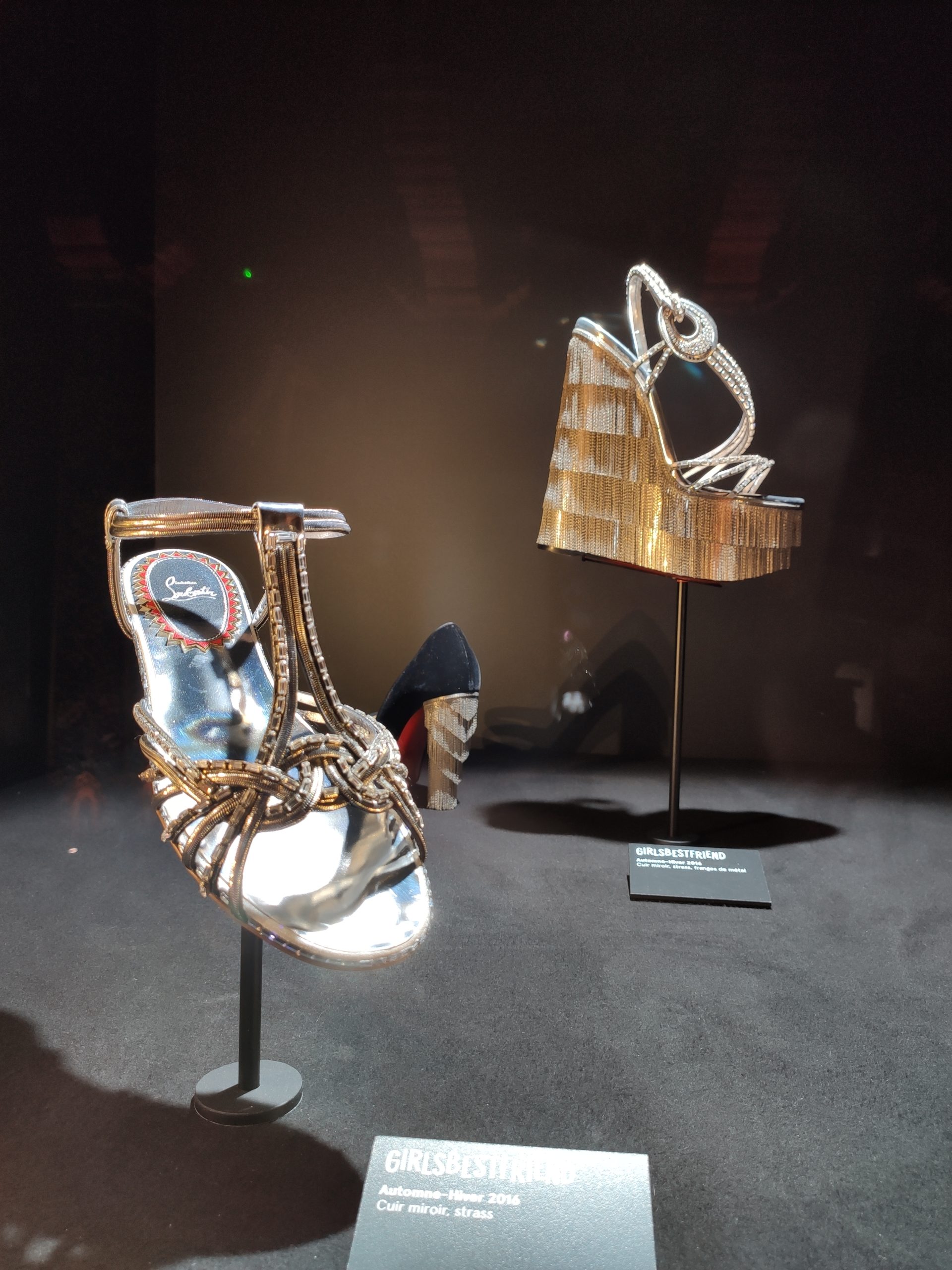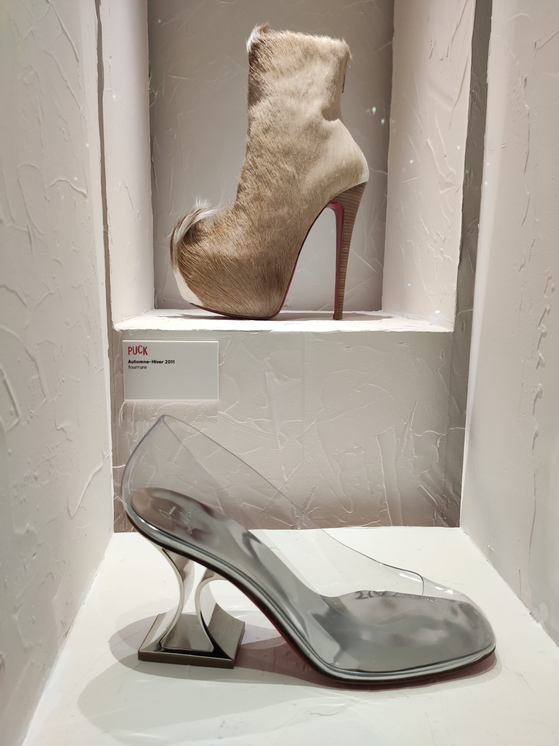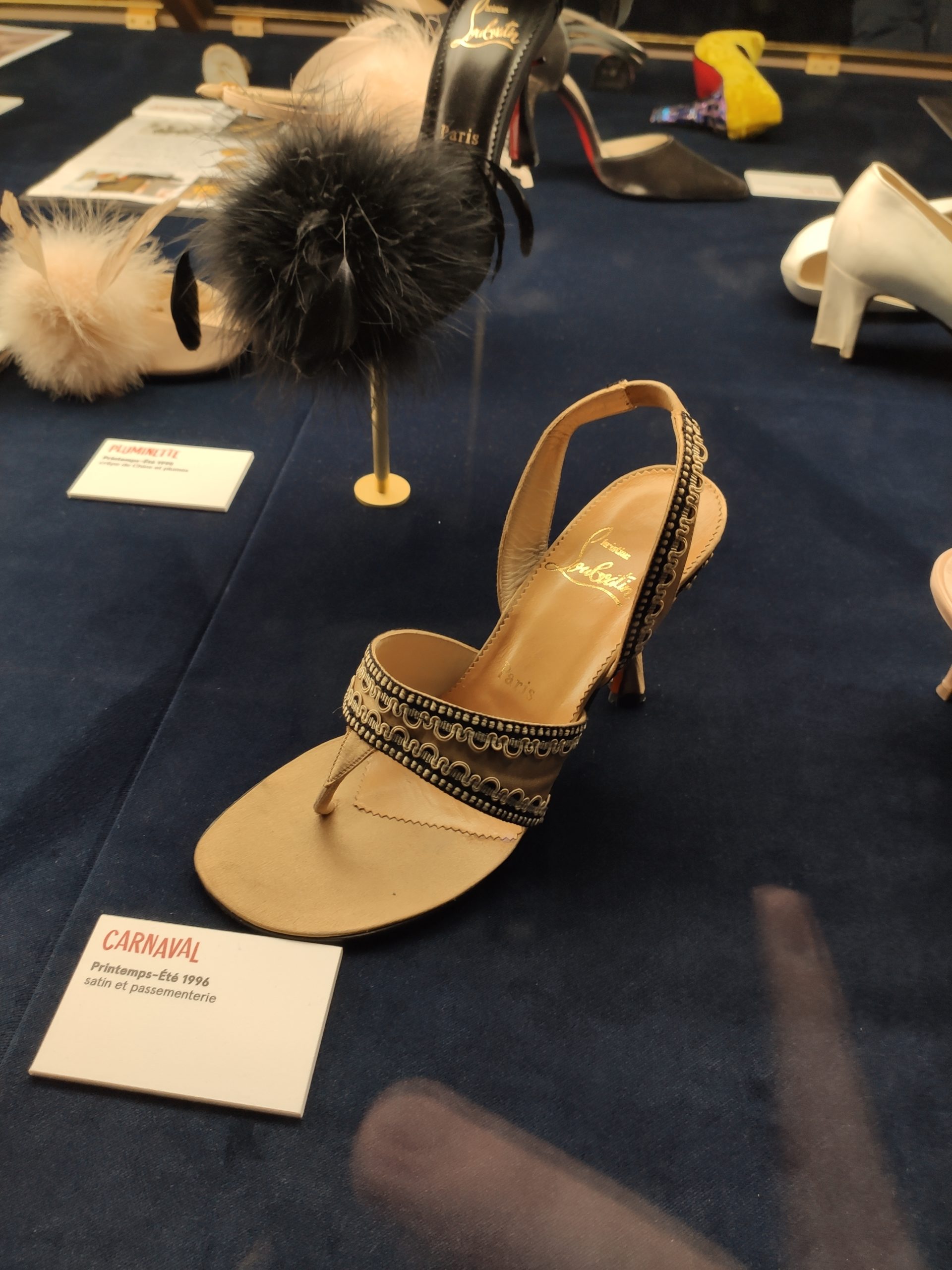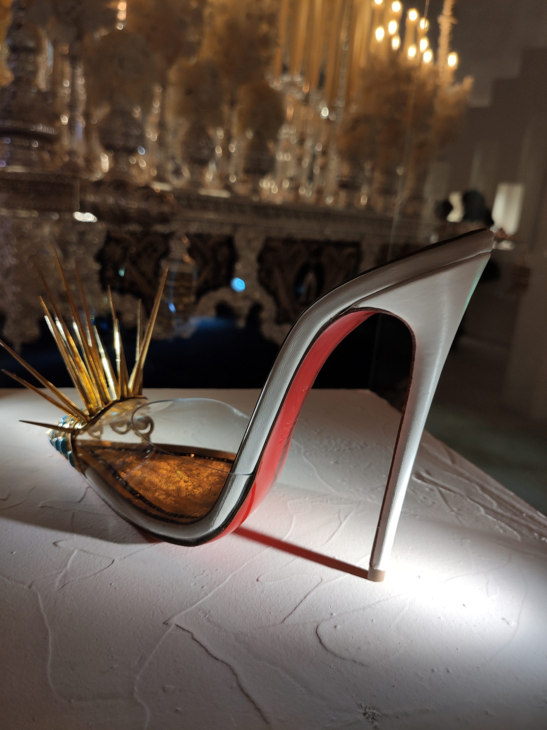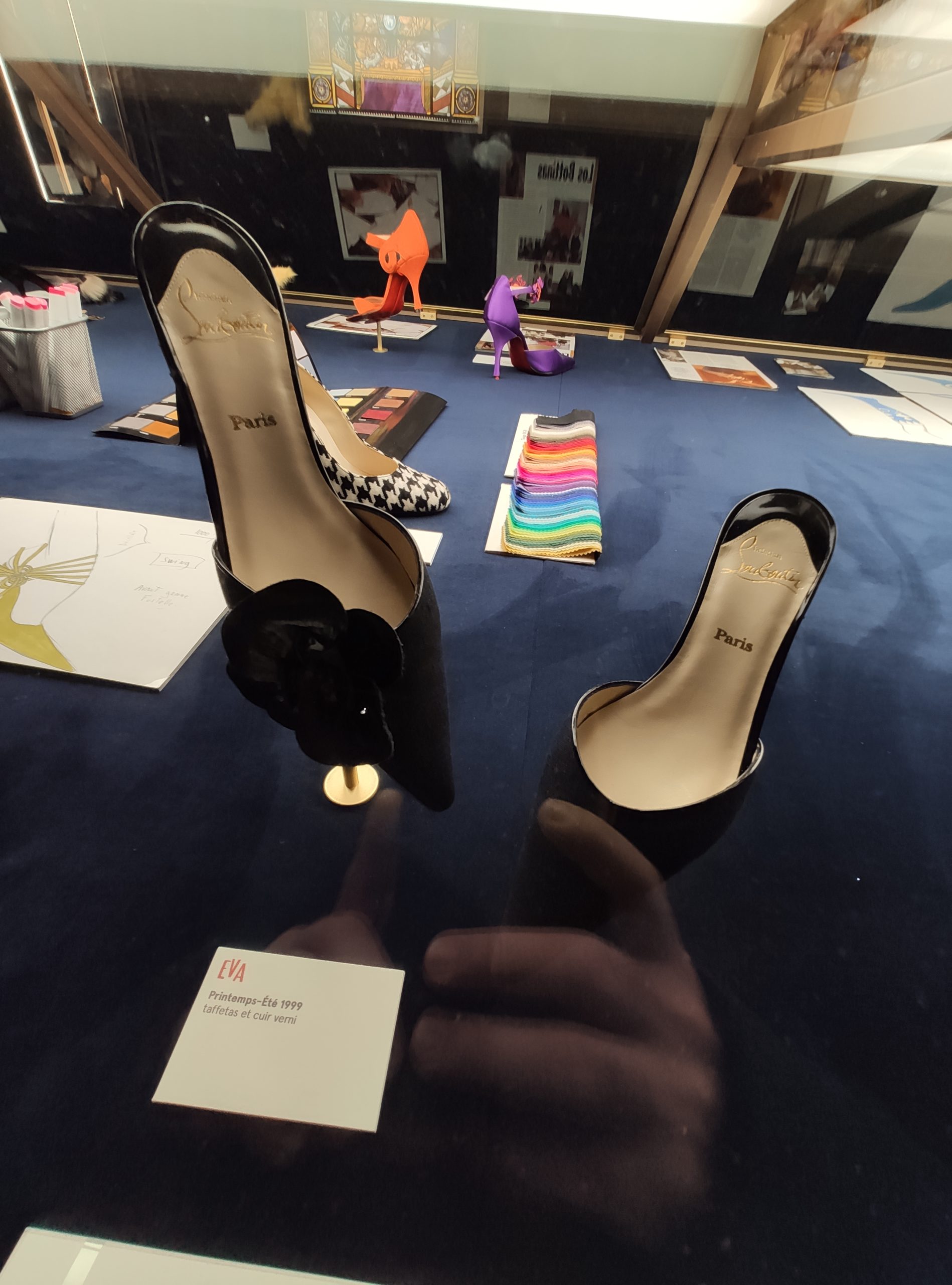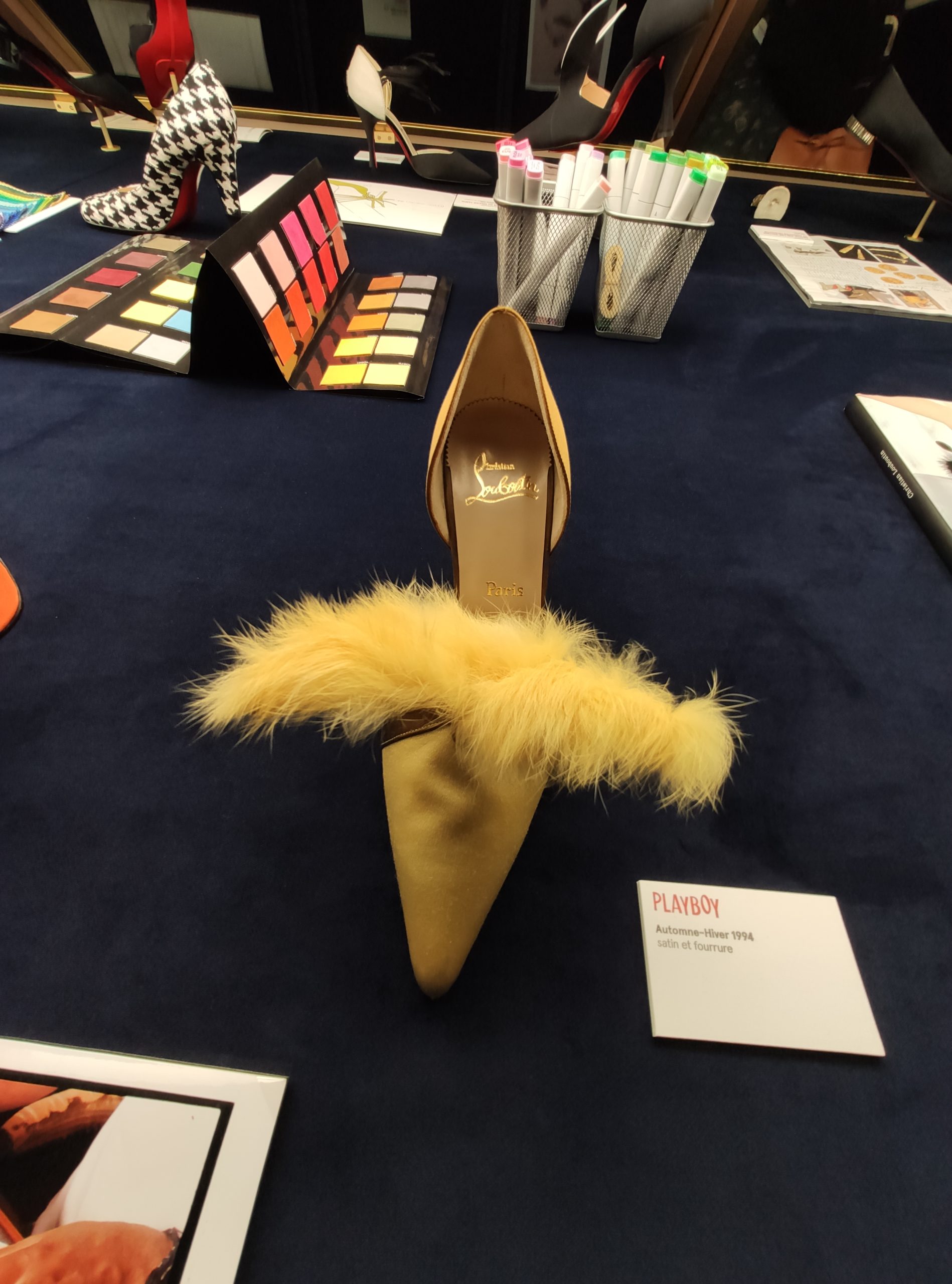 Une large sélection de souliers et croquis est présentée, dont certains jamais exposés. Ces pièces patrimoniales et artistiques sont exposées aux côtés de nombreuses collaborations qui soulignent l’attachement de Christian Louboutin pour les savoir-faire et les métiers d’art, comme des vitraux réalisés par la Maison du Vitrail à Paris, un palanquin d’argent réalisé par l’Orfebreria Villareal de Séville, ou encore un cabaret sculpté au Bhoutan.