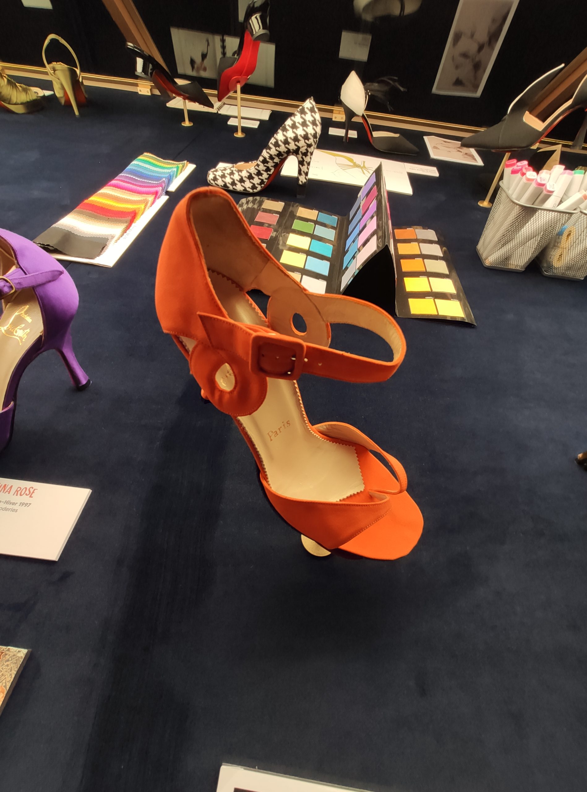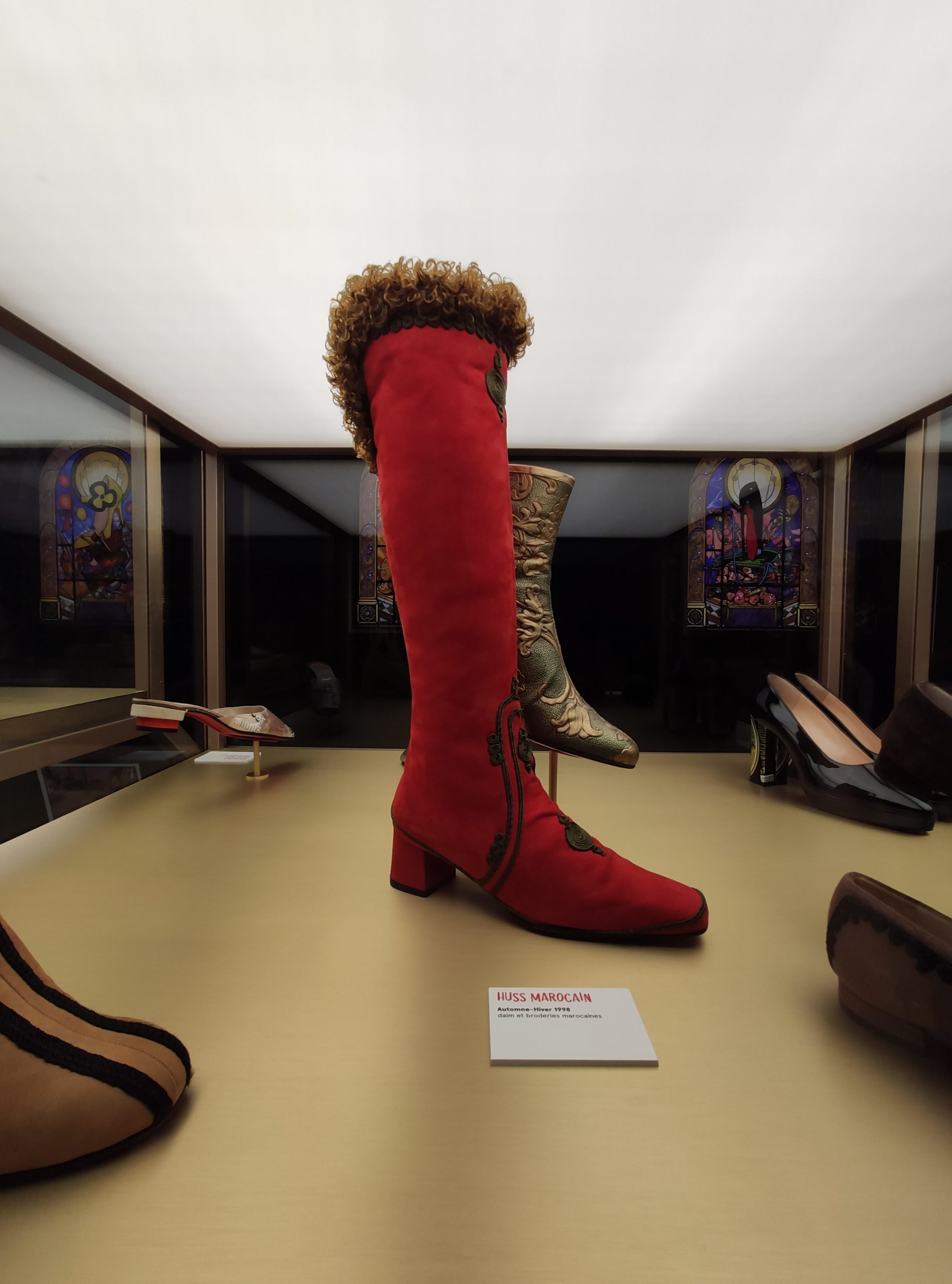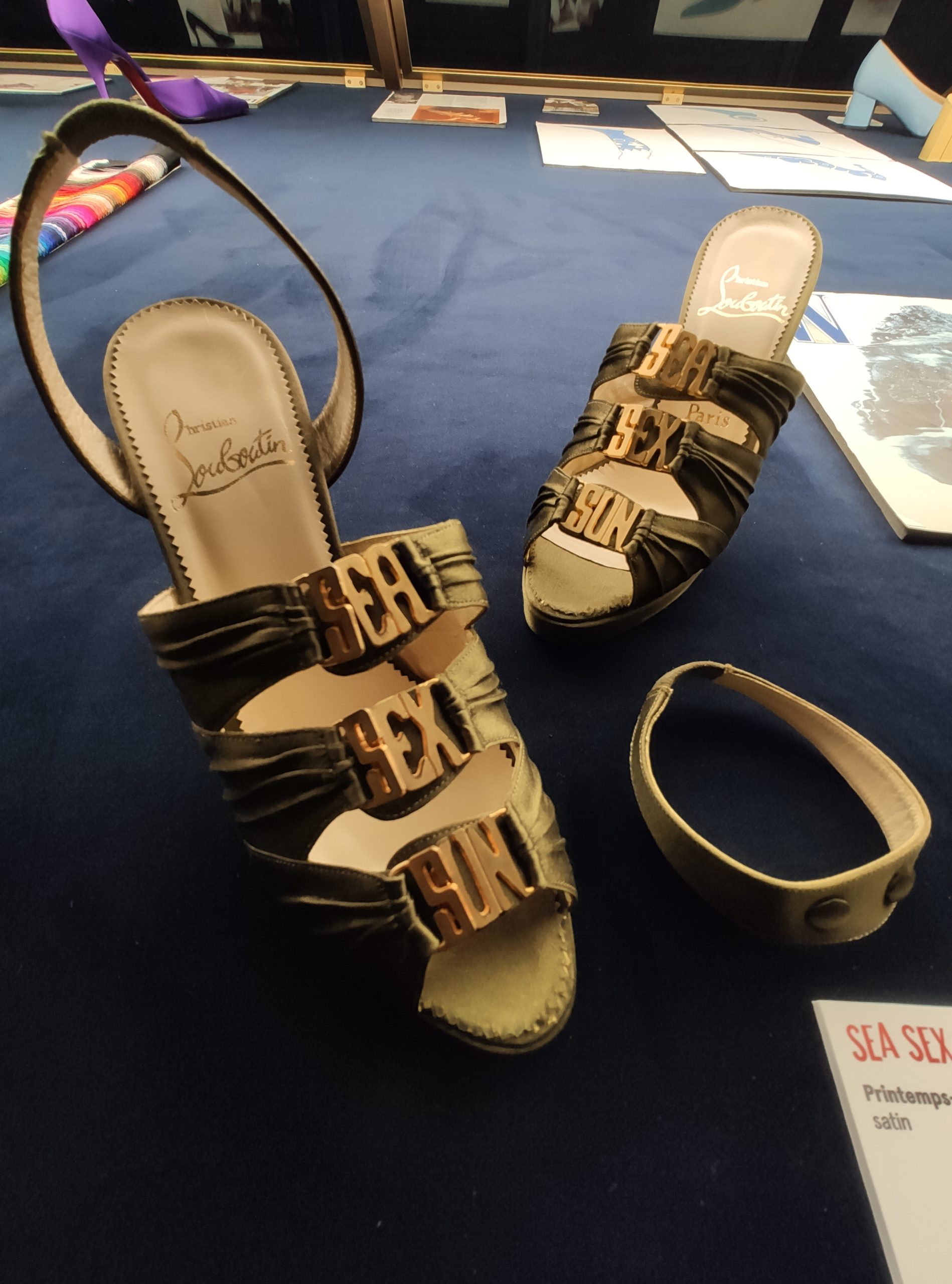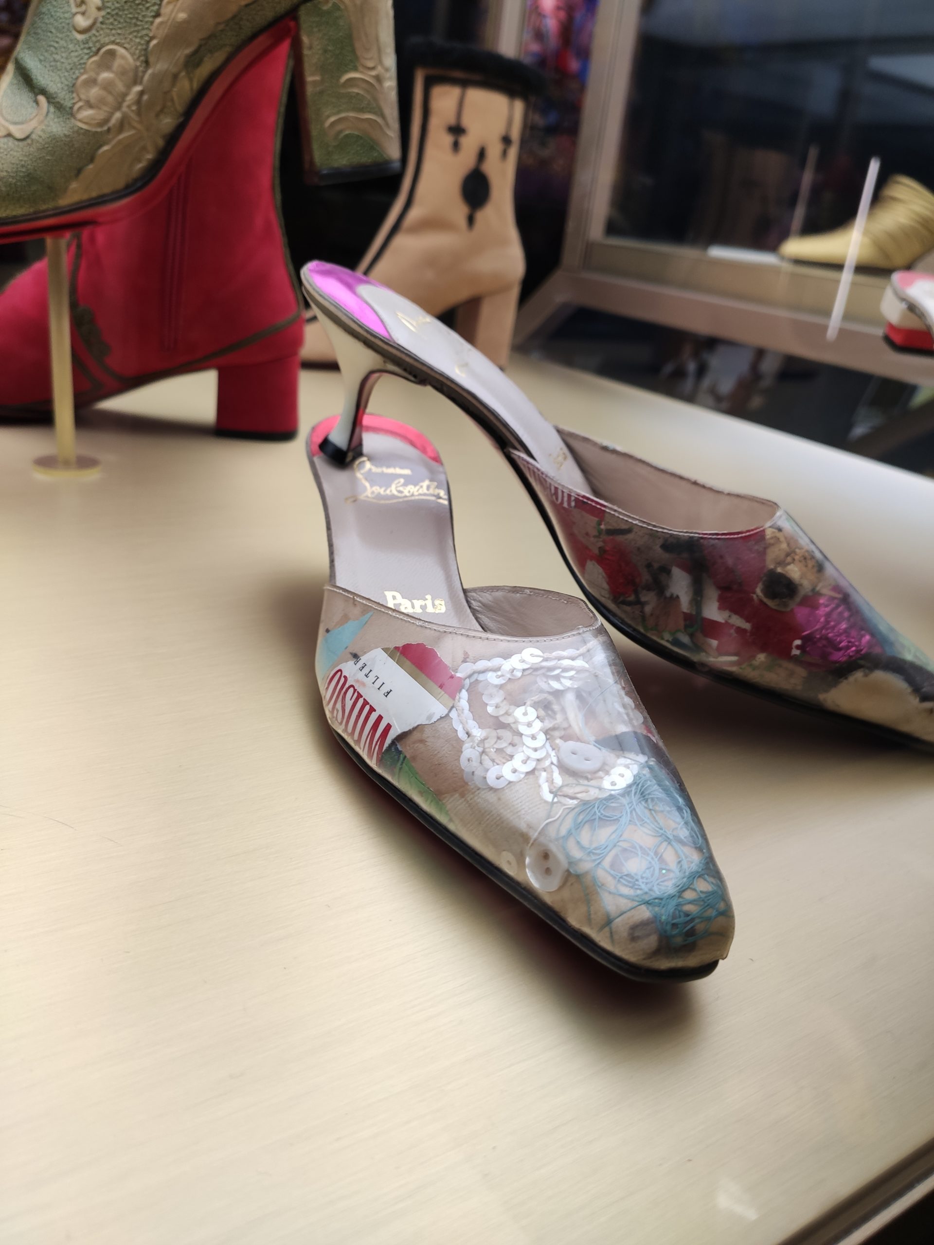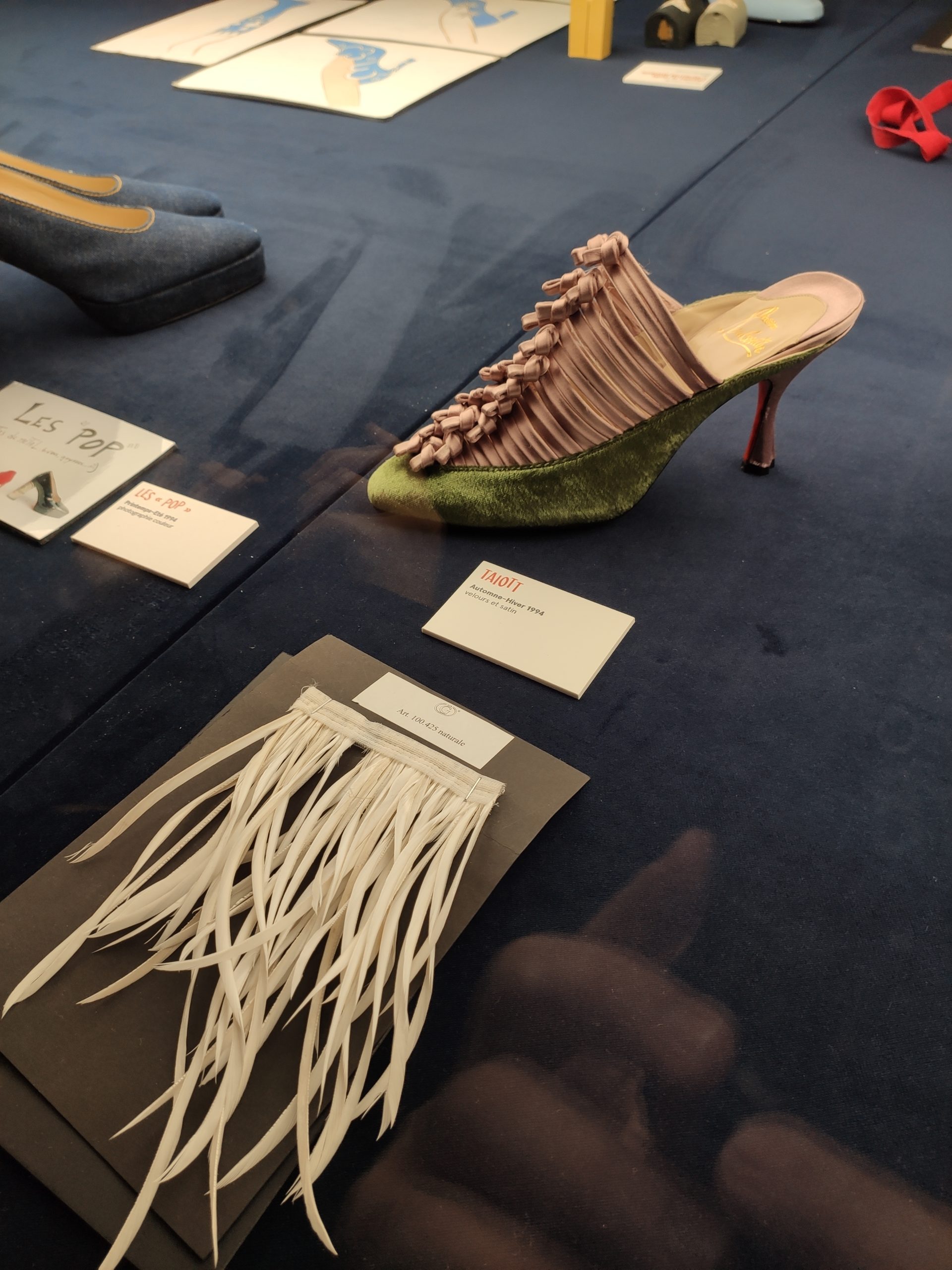 Une large sélection de souliers et croquis est présentée, dont certains jamais exposés. Ces pièces patrimoniales et artistiques sont exposées aux côtés de nombreuses collaborations qui soulignent l’attachement de Christian Louboutin pour les savoir-faire et les métiers d’art, comme des vitraux réalisés par la Maison du Vitrail à Paris, un palanquin d’argent réalisé par l’Orfebreria Villareal de Séville, ou encore un cabaret sculpté au Bhoutan.