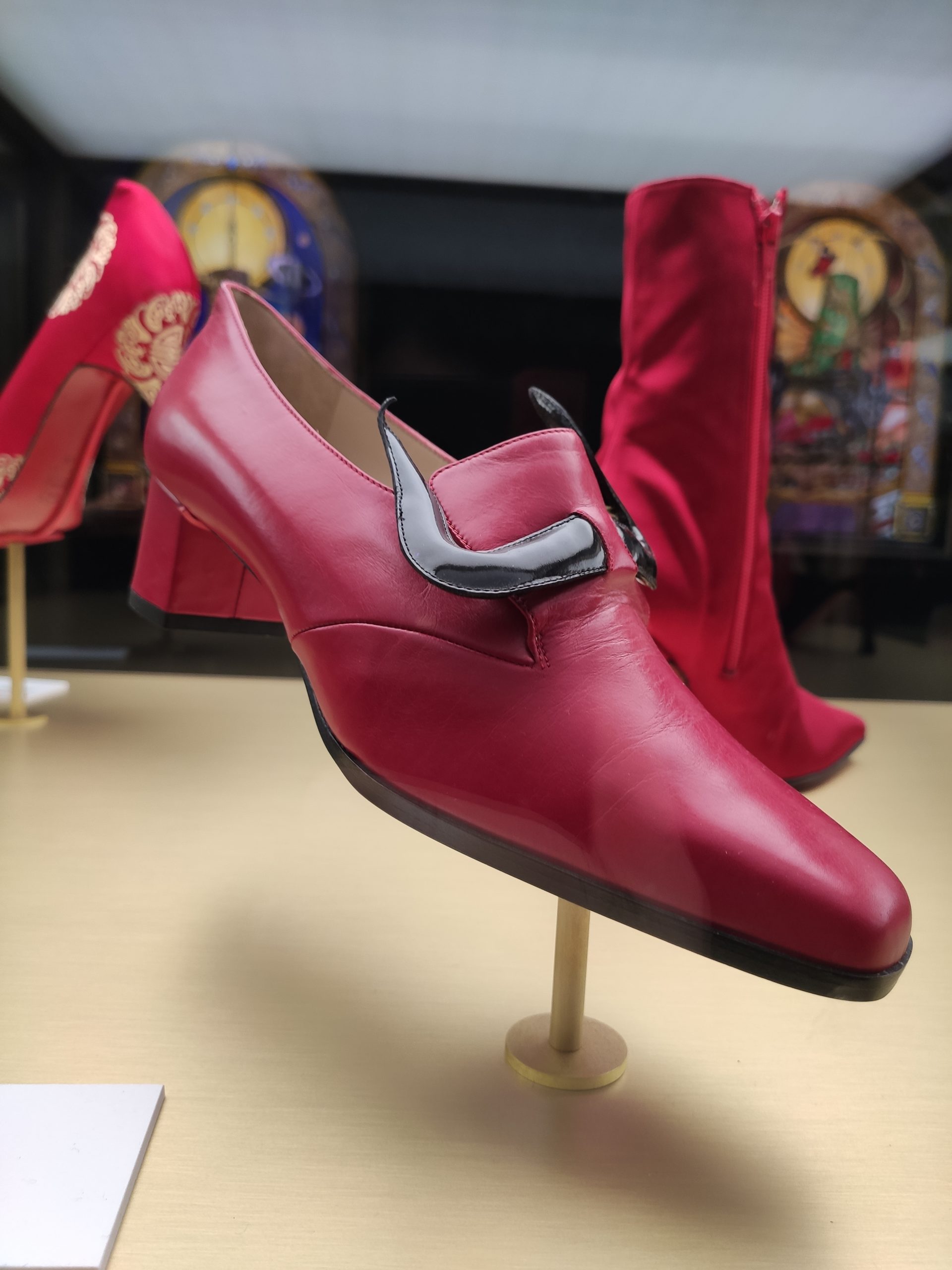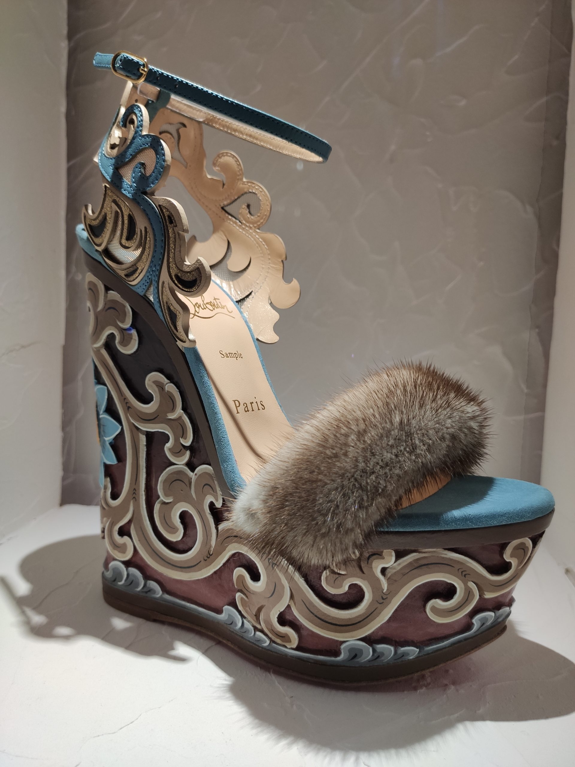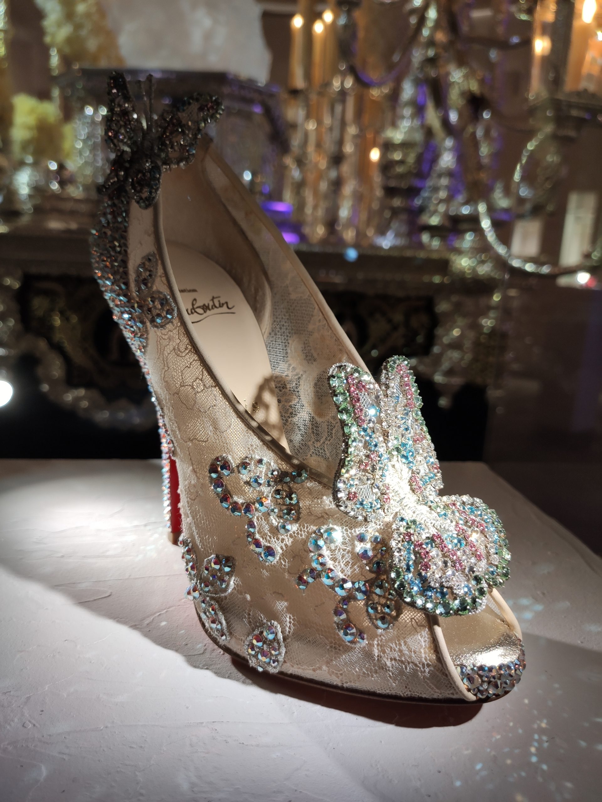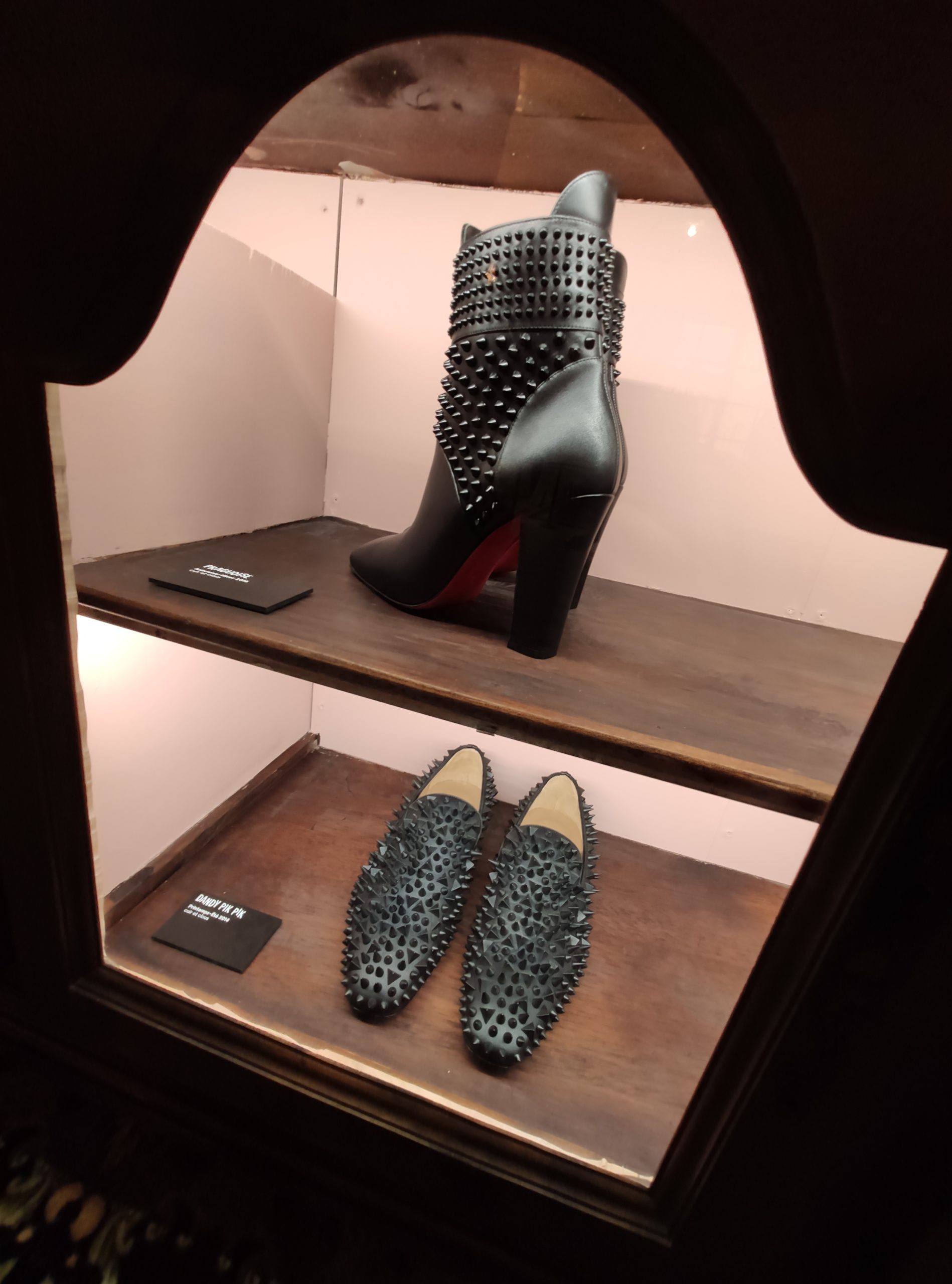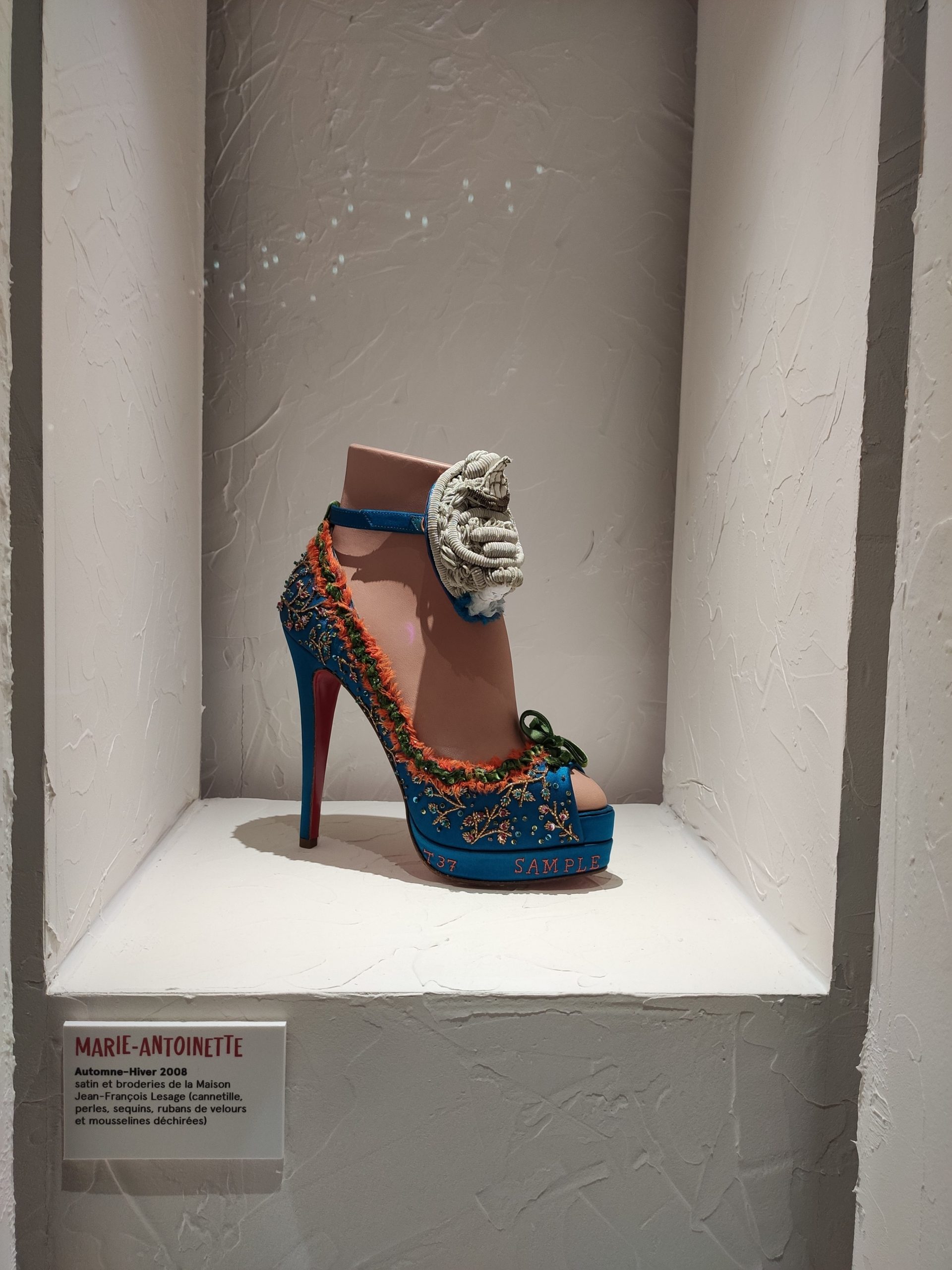Une large sélection de souliers et croquis est présentée, dont certains jamais exposés. Ces pièces patrimoniales et artistiques sont exposées aux côtés de nombreuses collaborations qui soulignent l’attachement de Christian Louboutin pour les savoir-faire et les métiers d’art, comme des vitraux réalisés par la Maison du Vitrail à Paris, un palanquin d’argent réalisé par l’Orfebreria Villareal de Séville, ou encore un cabaret sculpté au Bhoutan.