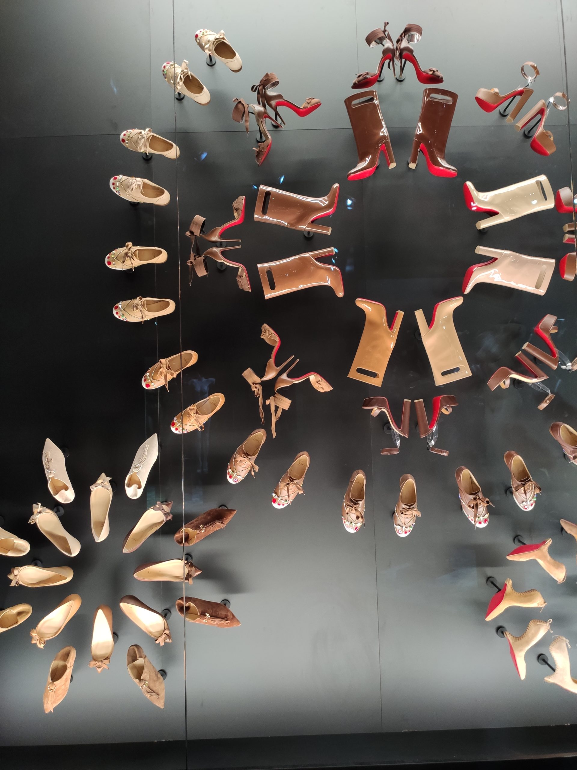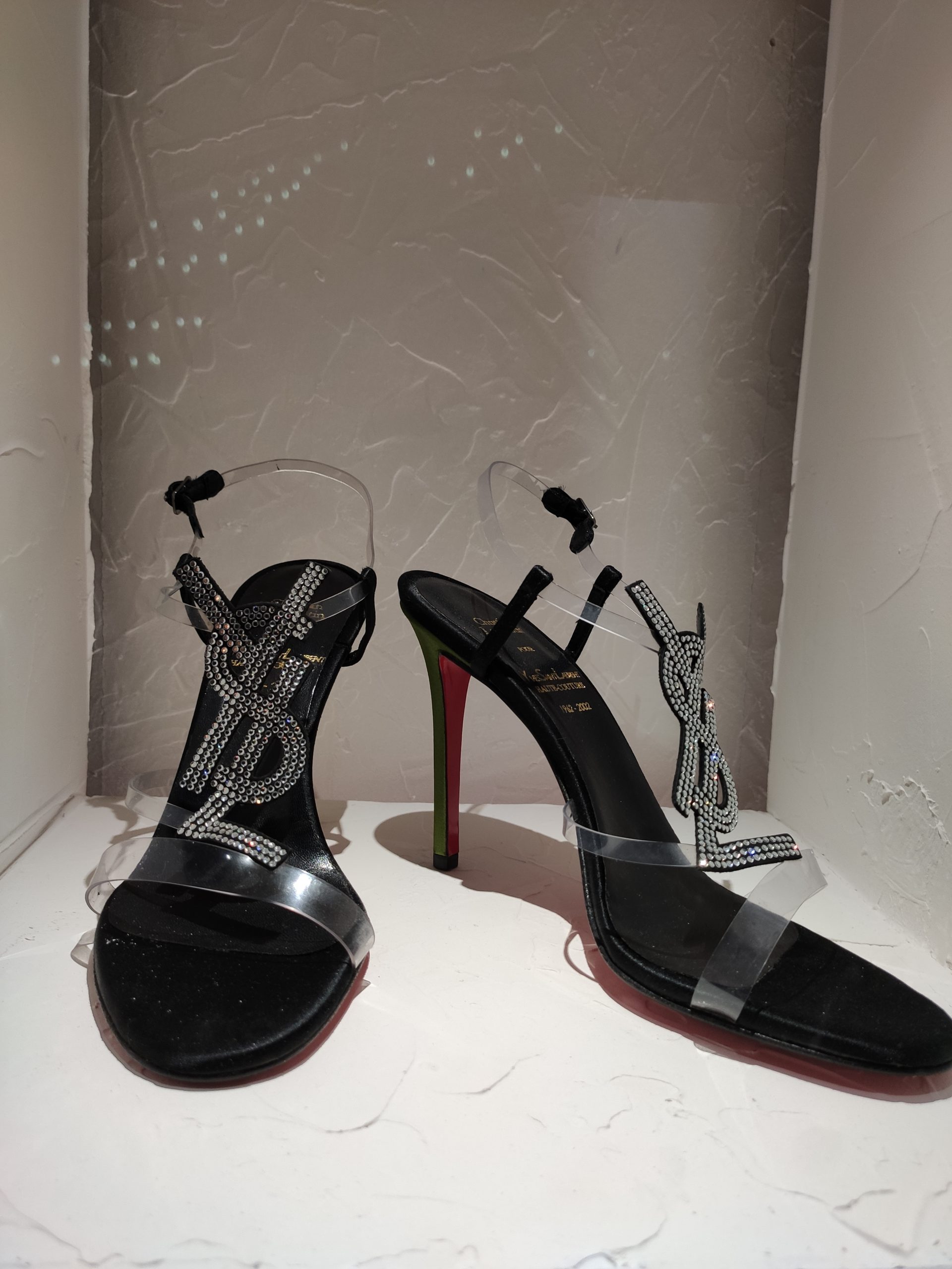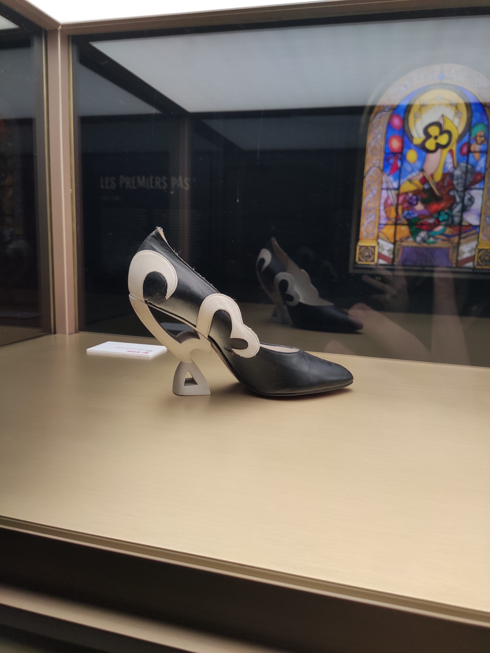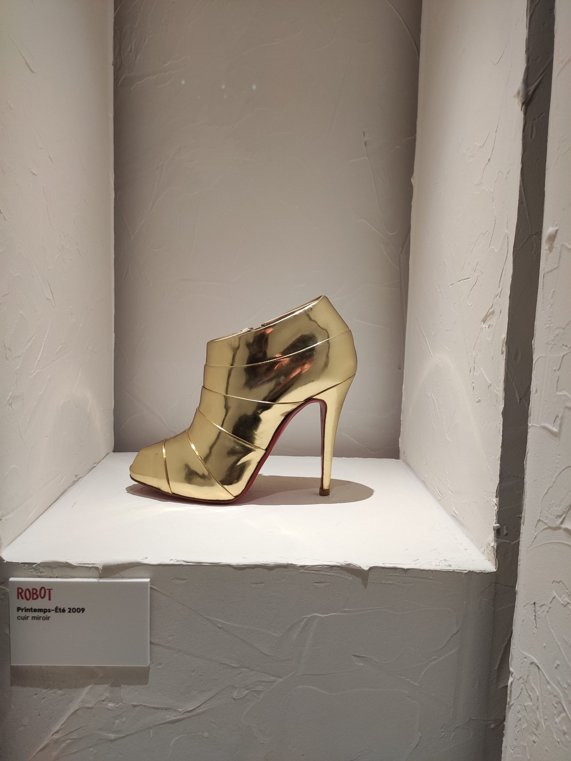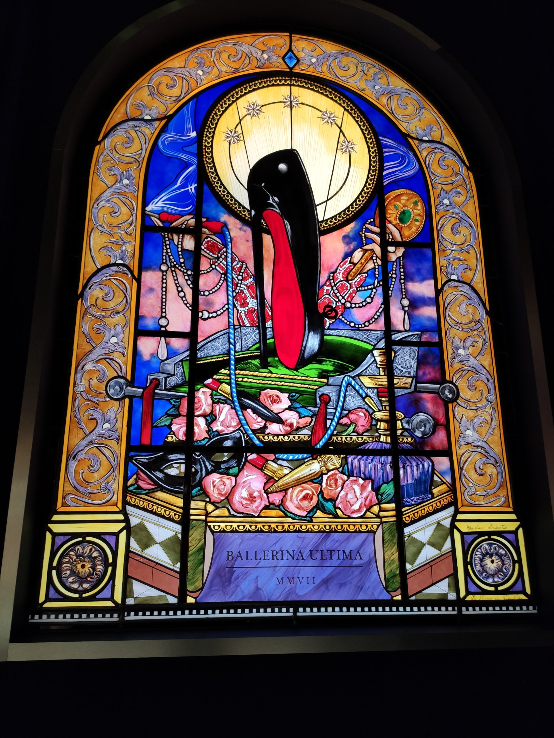 Une large sélection de souliers et croquis est présentée, dont certains jamais exposés. Ces pièces patrimoniales et artistiques sont exposées aux côtés de nombreuses collaborations qui soulignent l’attachement de Christian Louboutin pour les savoir-faire et les métiers d’art, comme des vitraux réalisés par la Maison du Vitrail à Paris, un palanquin d’argent réalisé par l’Orfebreria Villareal de Séville, ou encore un cabaret sculpté au Bhoutan.