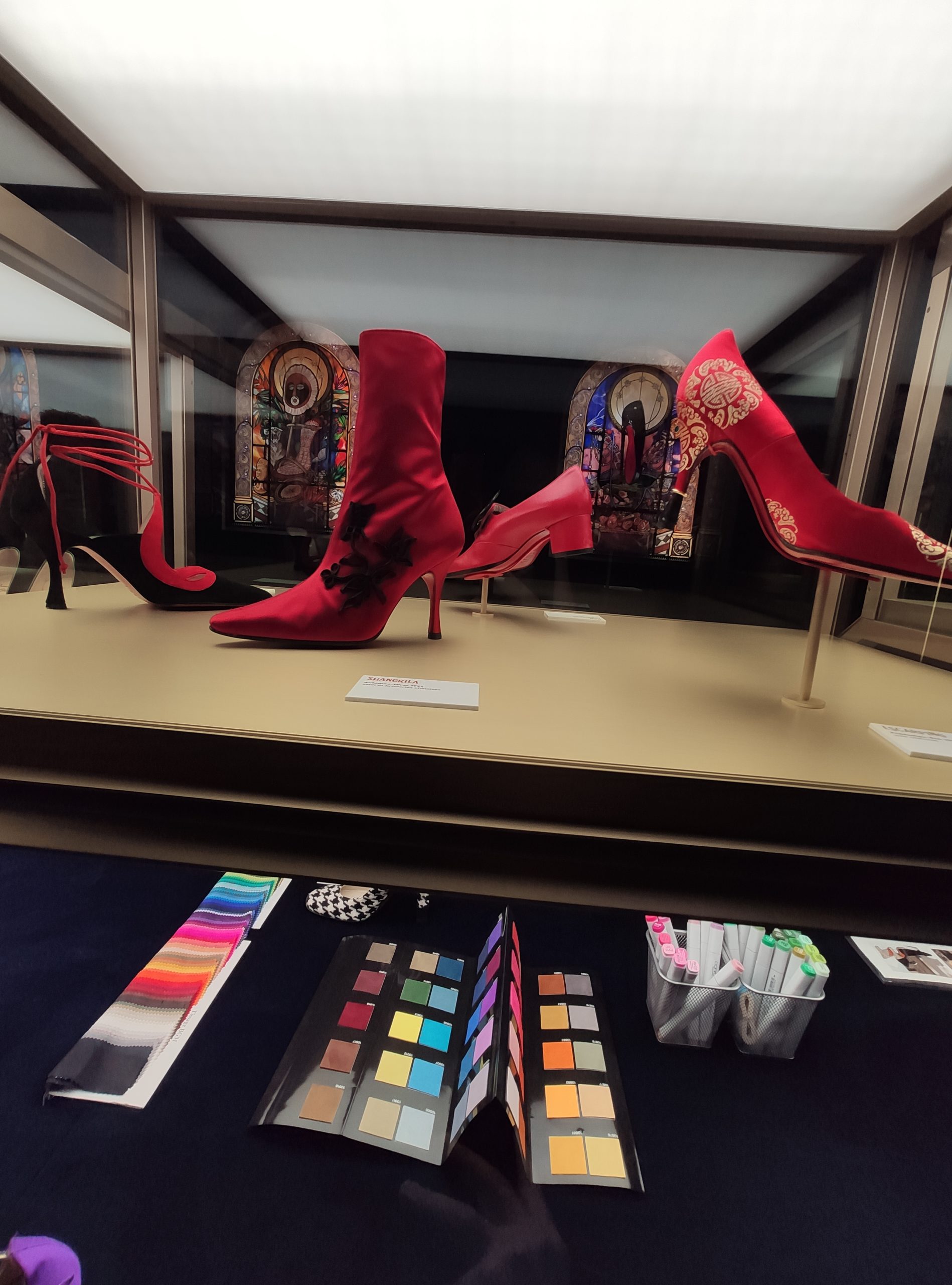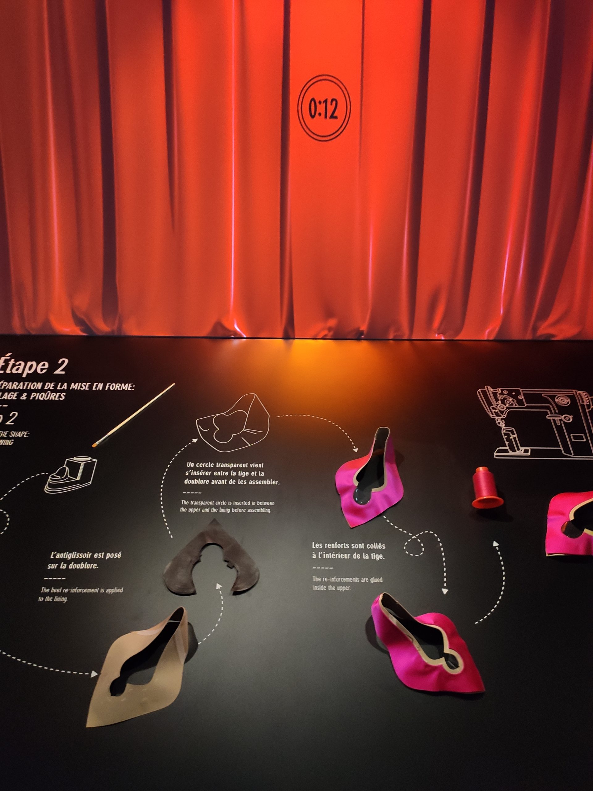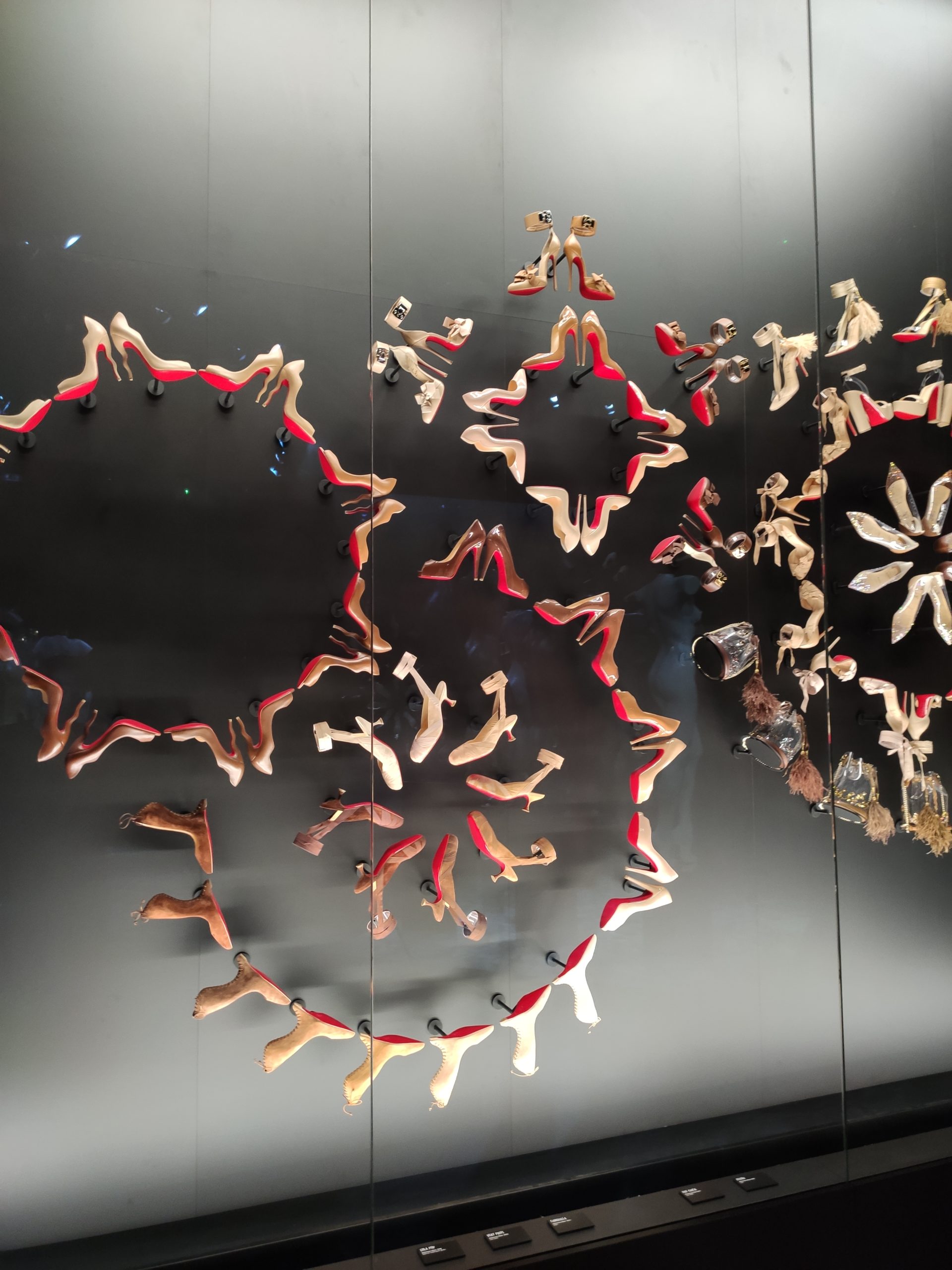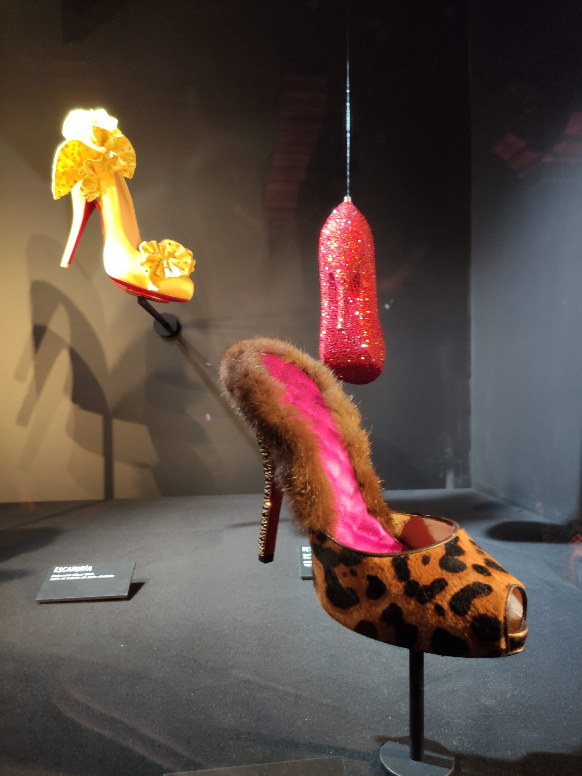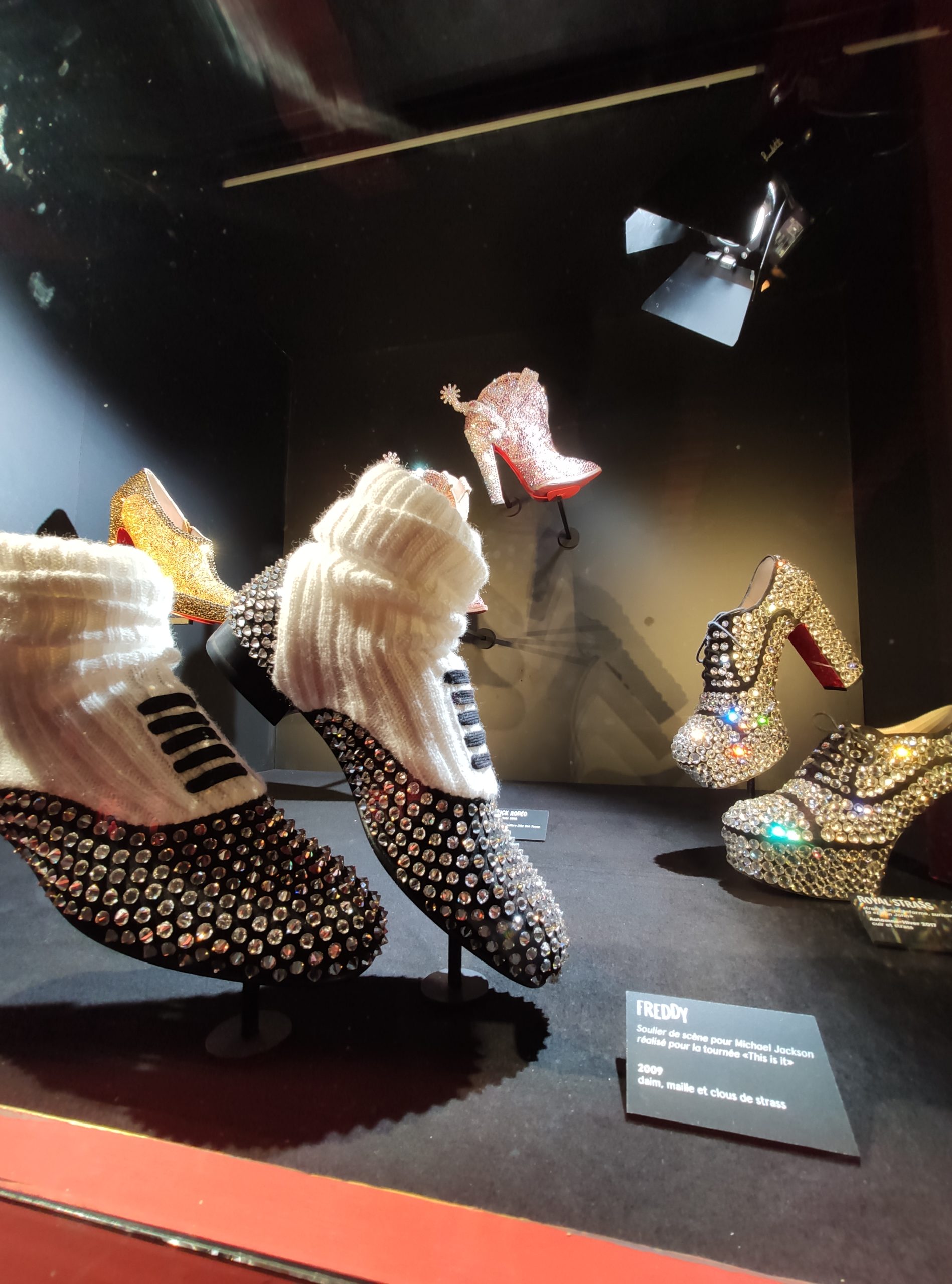 Une large sélection de souliers et croquis est présentée, dont certains jamais exposés. Ces pièces patrimoniales et artistiques sont exposées aux côtés de nombreuses collaborations qui soulignent l’attachement de Christian Louboutin pour les savoir-faire et les métiers d’art, comme des vitraux réalisés par la Maison du Vitrail à Paris, un palanquin d’argent réalisé par l’Orfebreria Villareal de Séville, ou encore un cabaret sculpté au Bhoutan.