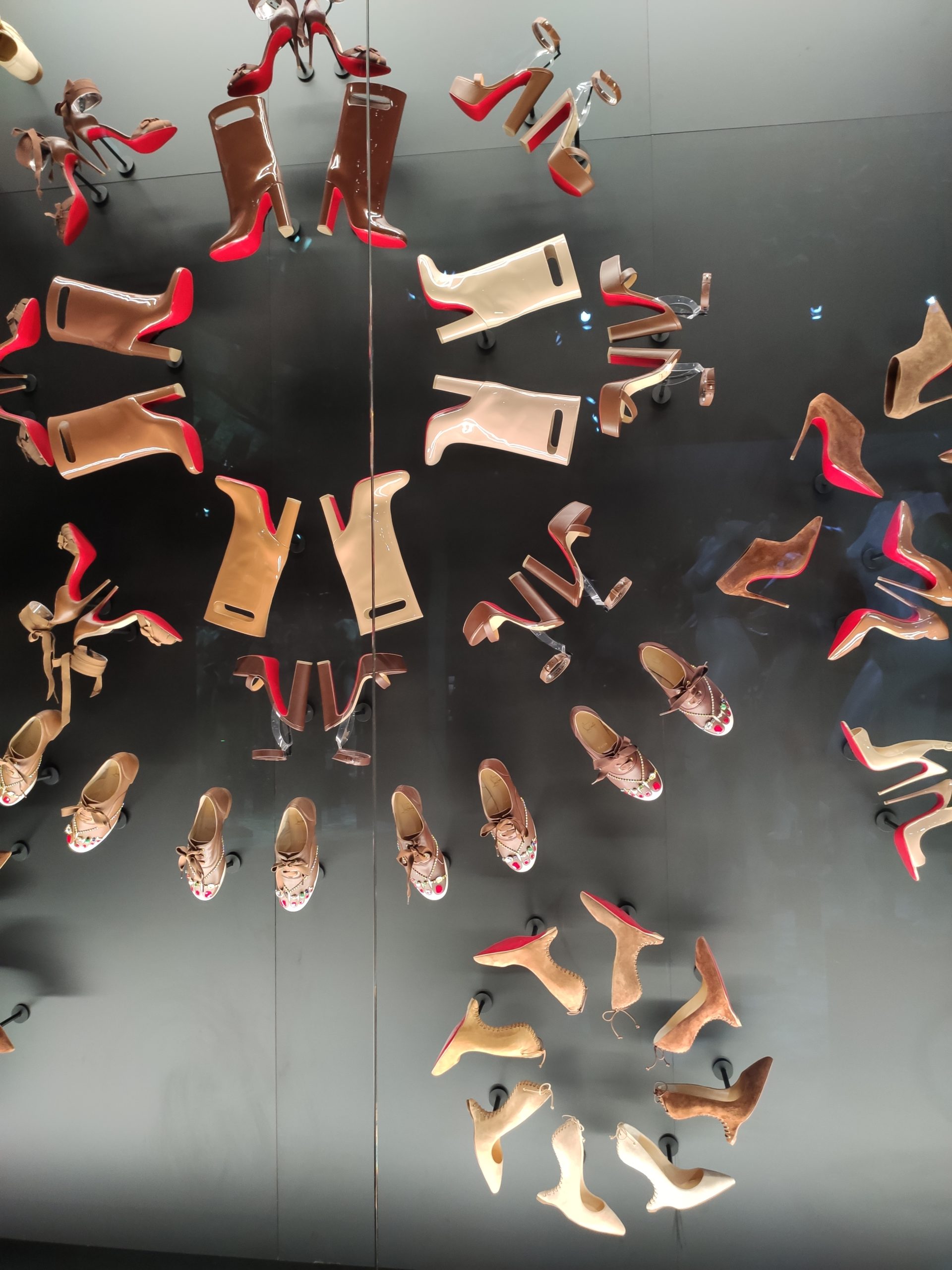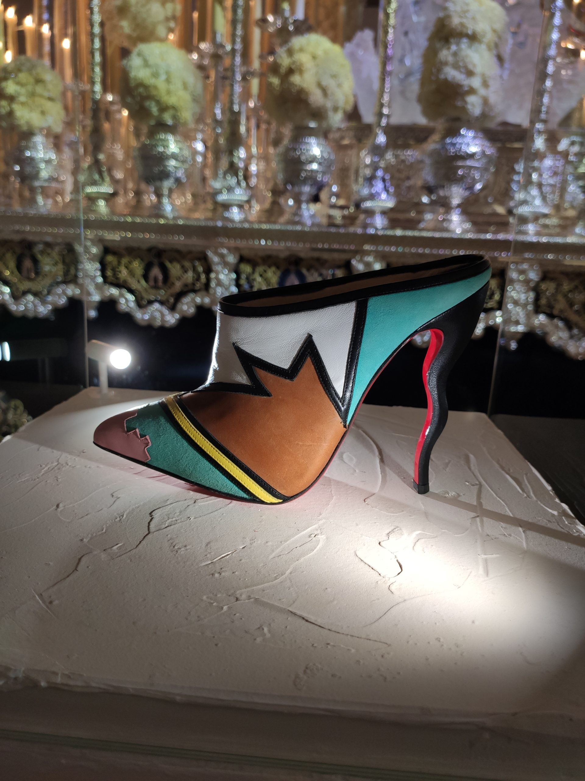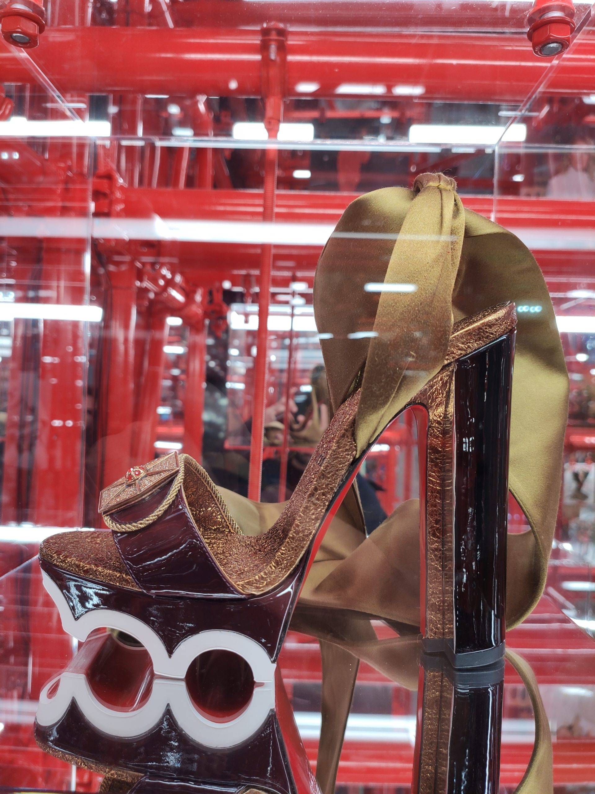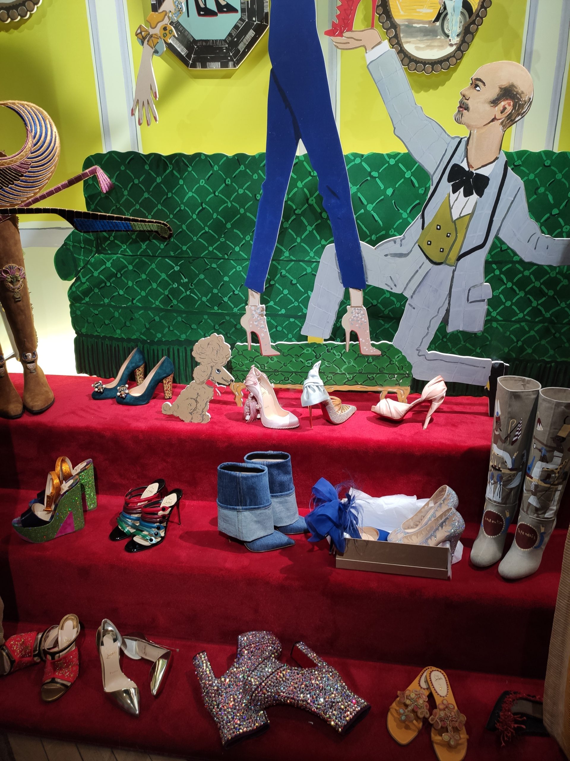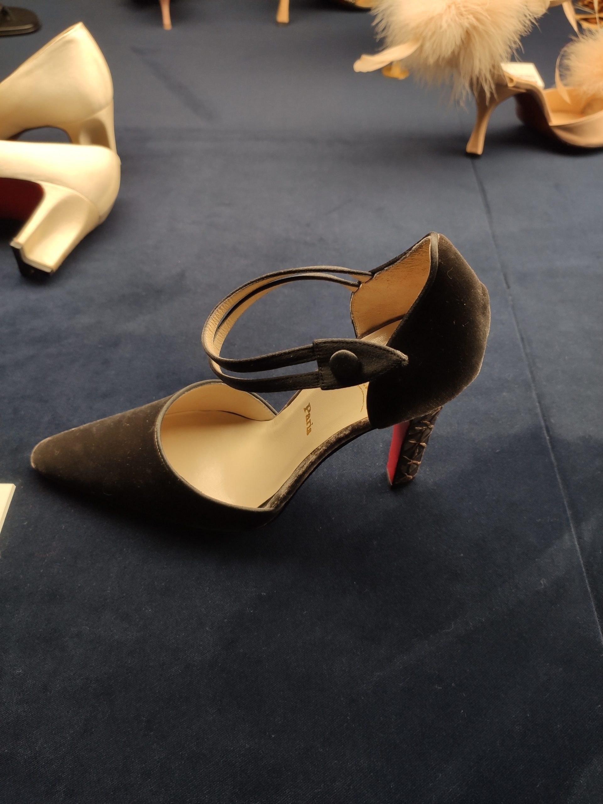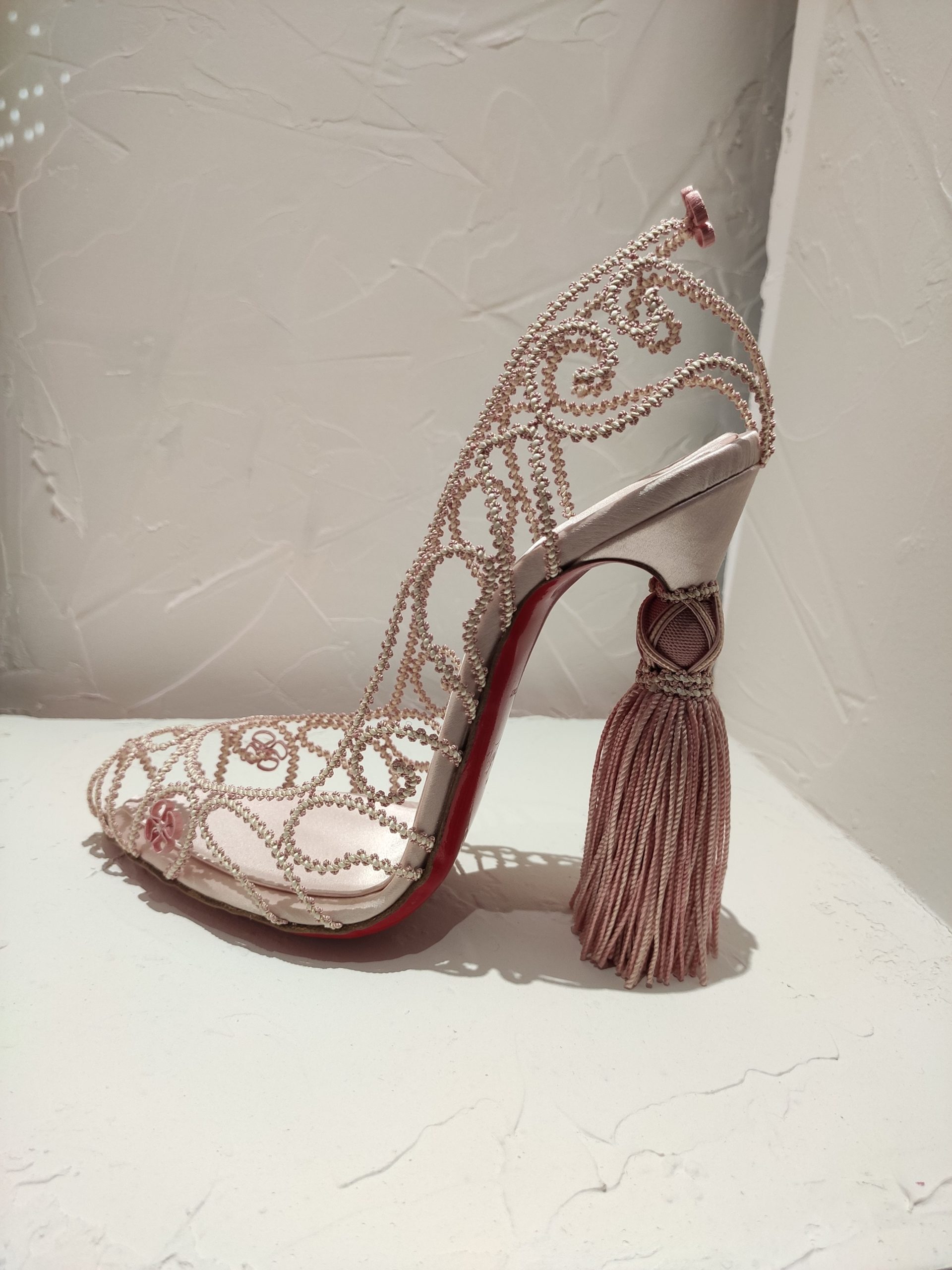 Une large sélection de souliers et croquis est présentée, dont certains jamais exposés. Ces pièces patrimoniales et artistiques sont exposées aux côtés de nombreuses collaborations qui soulignent l’attachement de Christian Louboutin pour les savoir-faire et les métiers d’art, comme des vitraux réalisés par la Maison du Vitrail à Paris, un palanquin d’argent réalisé par l’Orfebreria Villareal de Séville, ou encore un cabaret sculpté au Bhoutan.