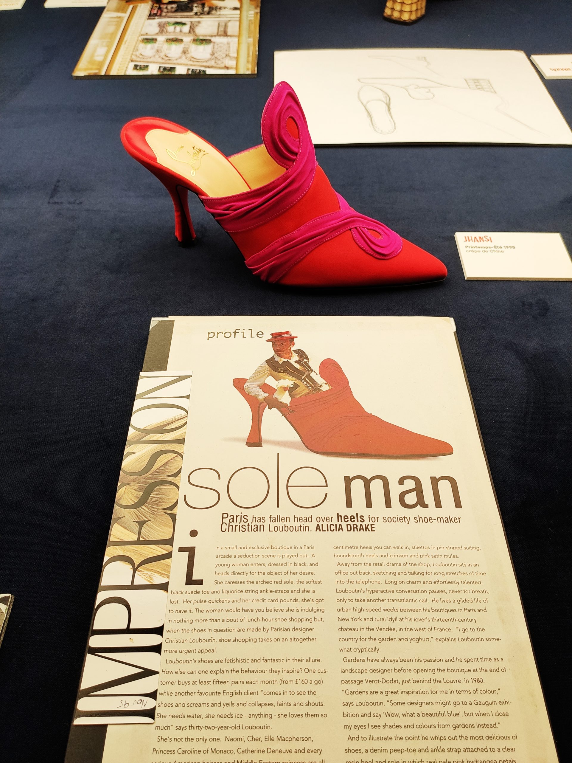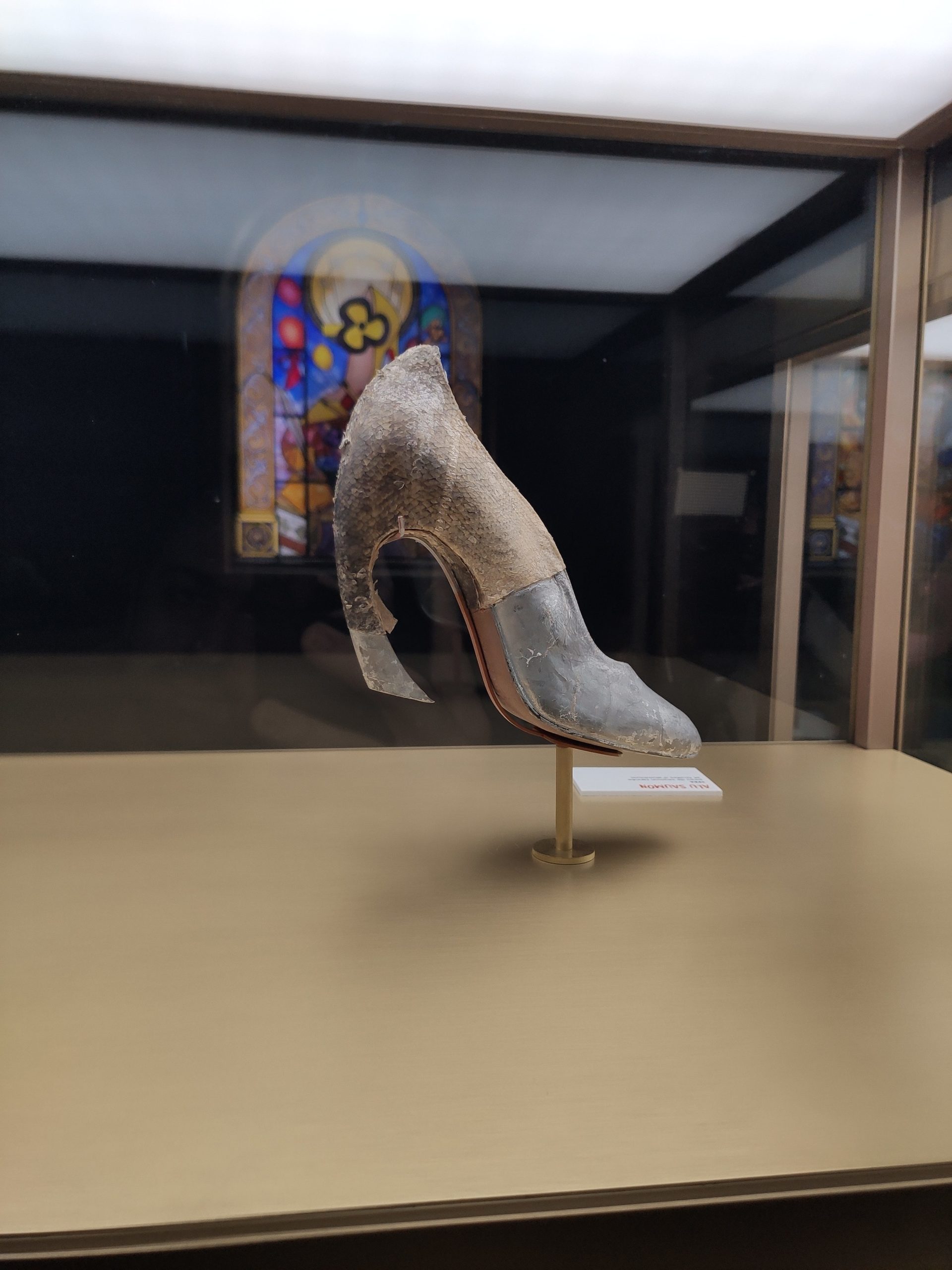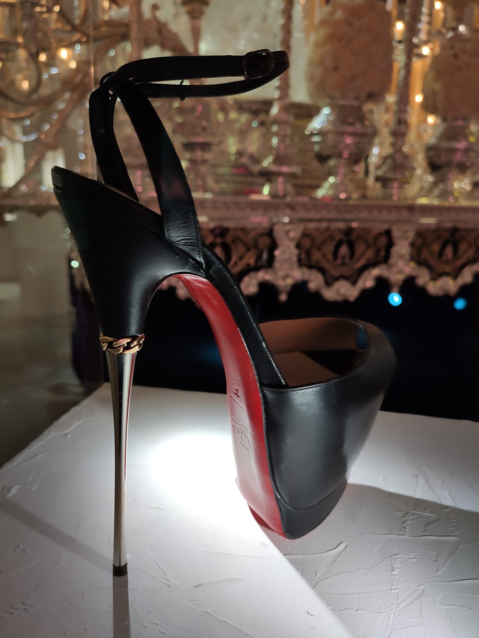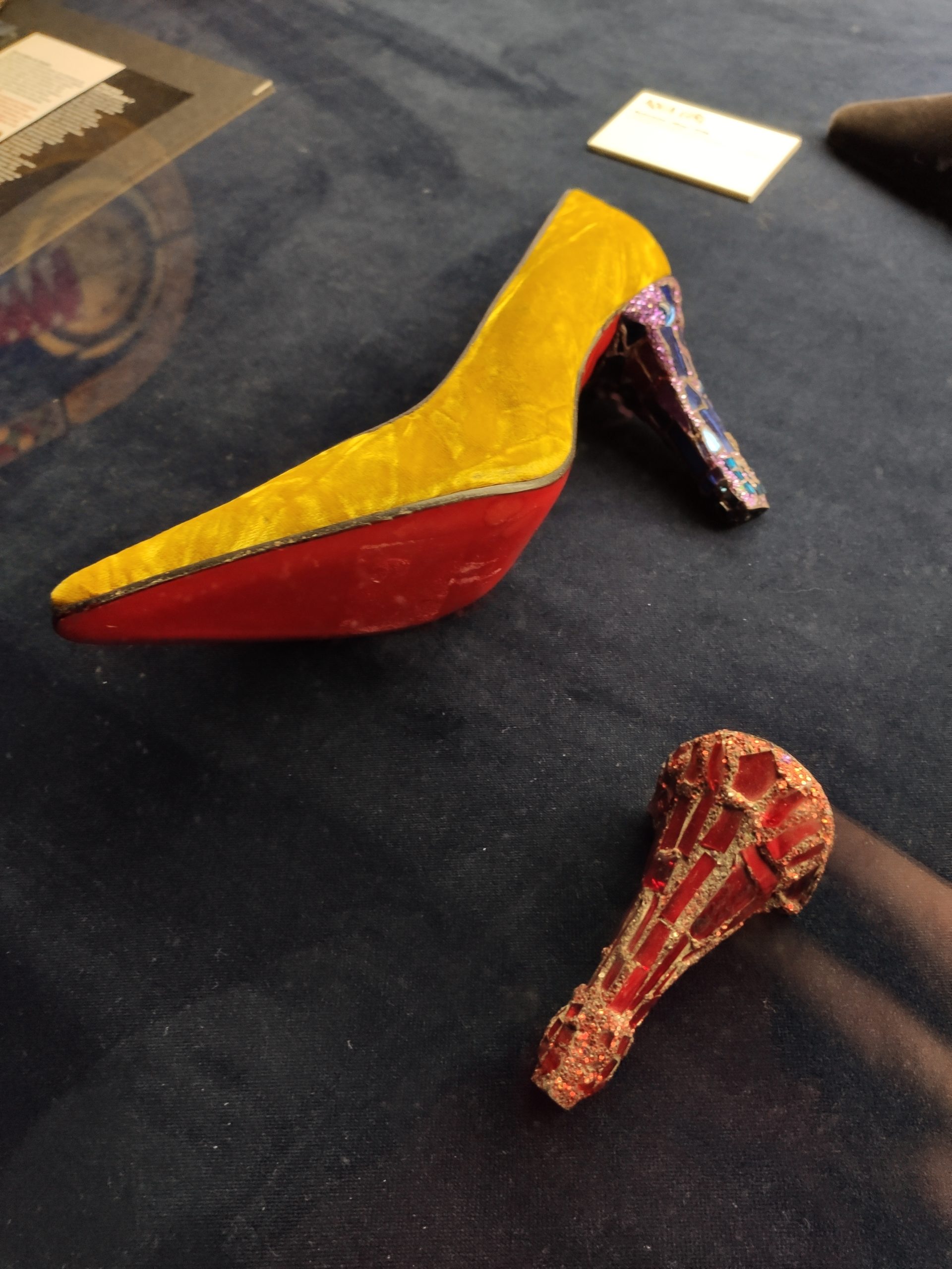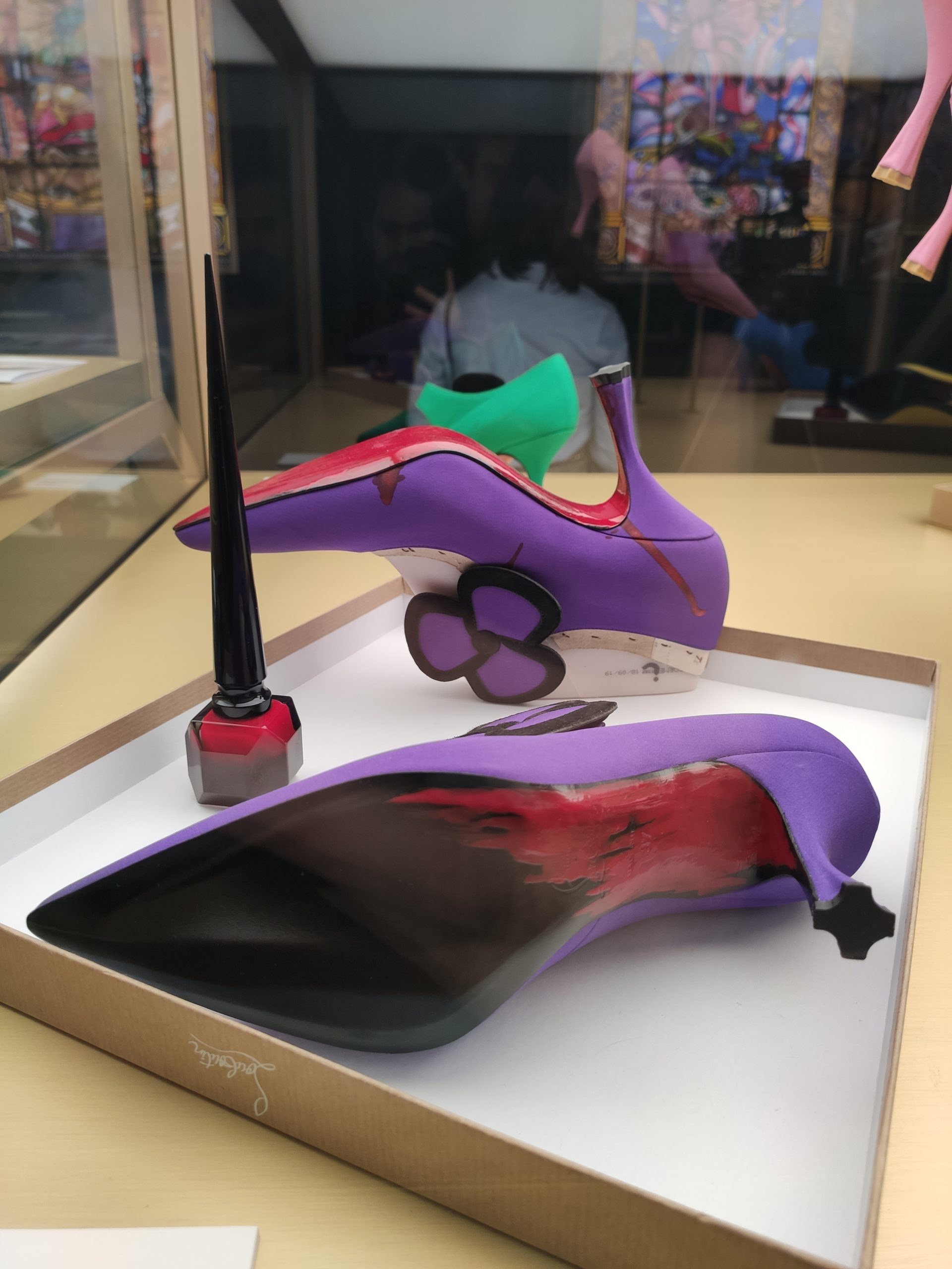 Une large sélection de souliers et croquis est présentée, dont certains jamais exposés. Ces pièces patrimoniales et artistiques sont exposées aux côtés de nombreuses collaborations qui soulignent l’attachement de Christian Louboutin pour les savoir-faire et les métiers d’art, comme des vitraux réalisés par la Maison du Vitrail à Paris, un palanquin d’argent réalisé par l’Orfebreria Villareal de Séville, ou encore un cabaret sculpté au Bhoutan.