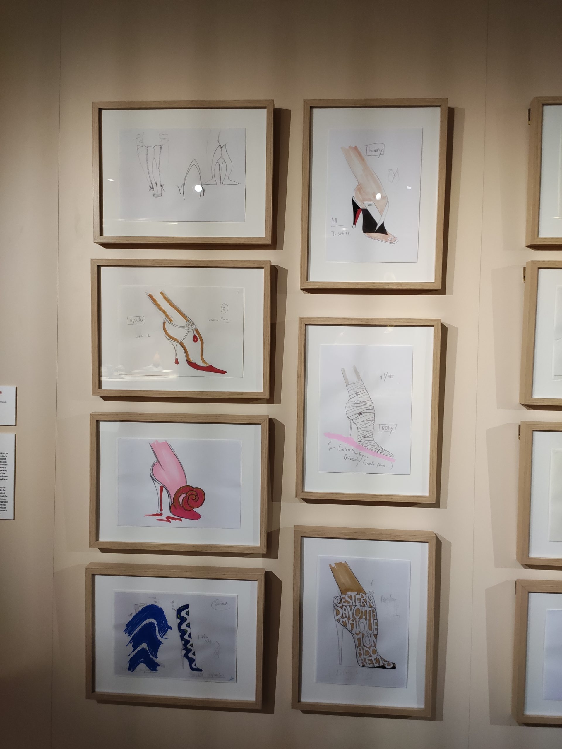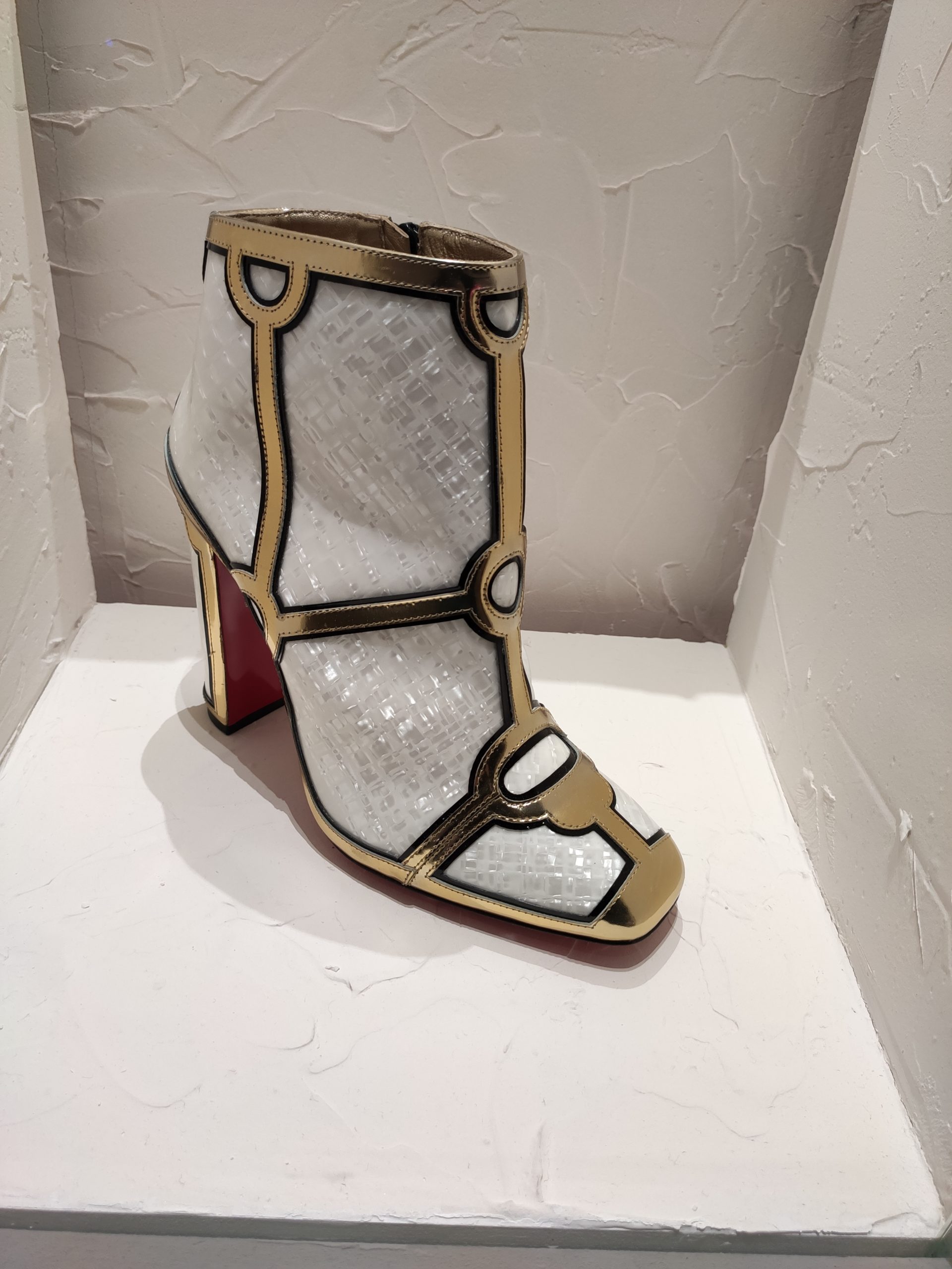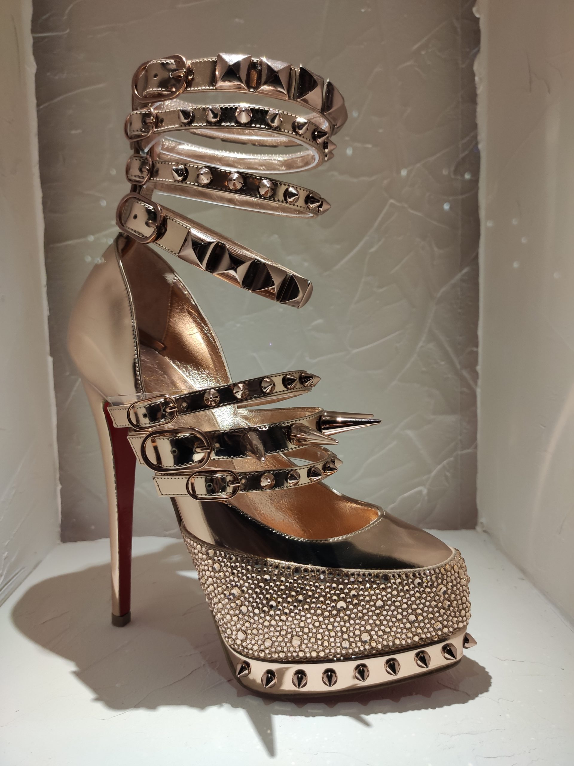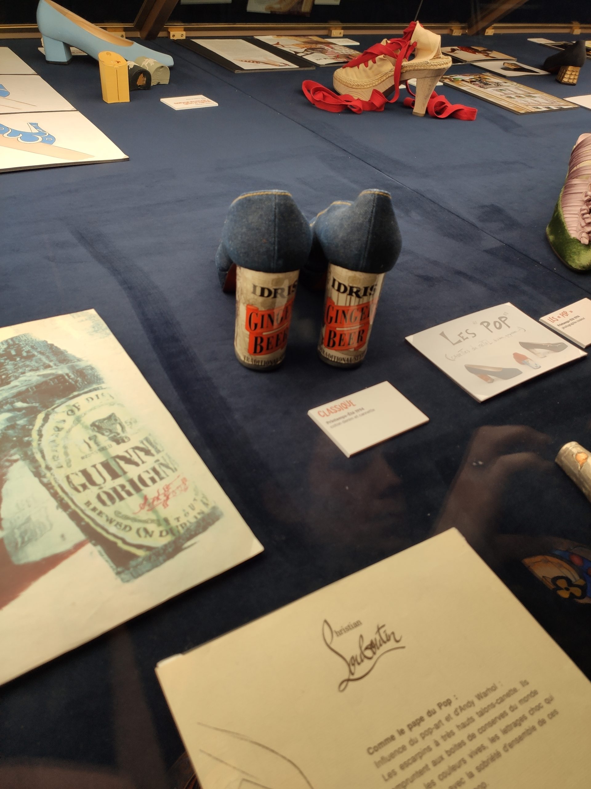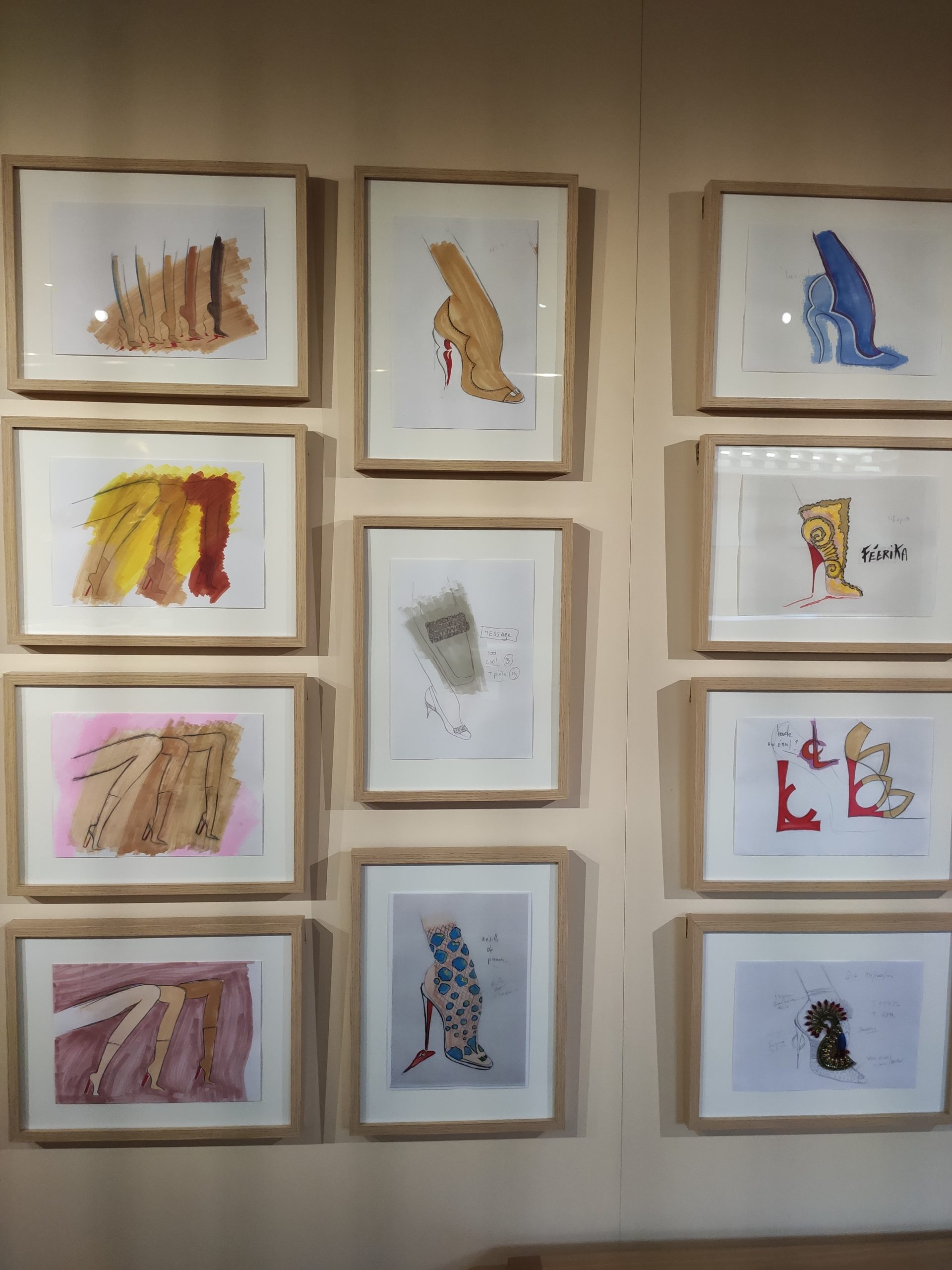 Une large sélection de souliers et croquis est présentée, dont certains jamais exposés. Ces pièces patrimoniales et artistiques sont exposées aux côtés de nombreuses collaborations qui soulignent l’attachement de Christian Louboutin pour les savoir-faire et les métiers d’art, comme des vitraux réalisés par la Maison du Vitrail à Paris, un palanquin d’argent réalisé par l’Orfebreria Villareal de Séville, ou encore un cabaret sculpté au Bhoutan.