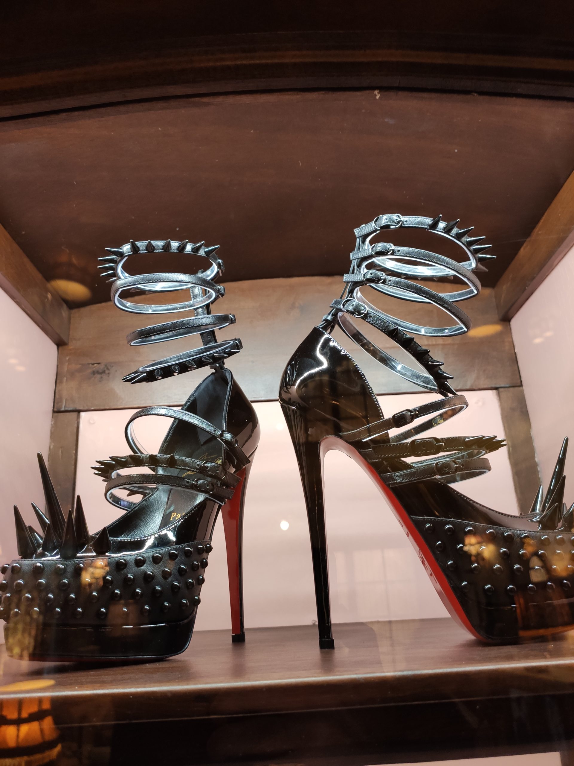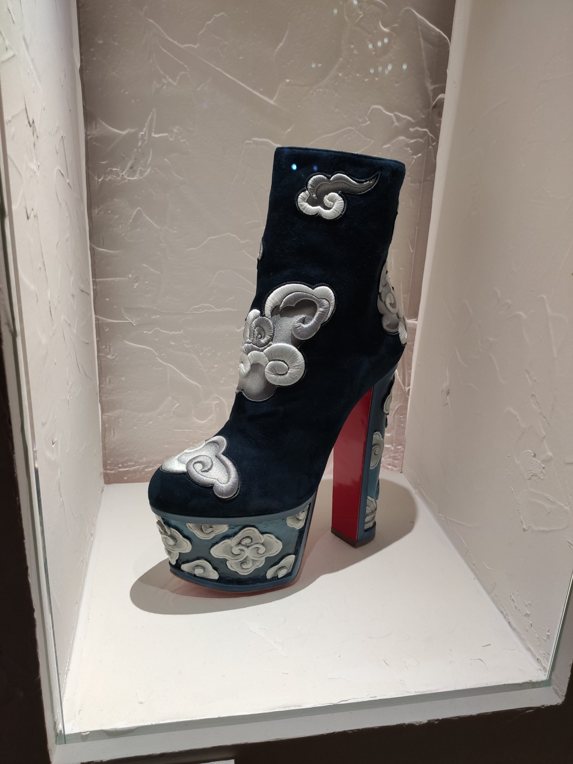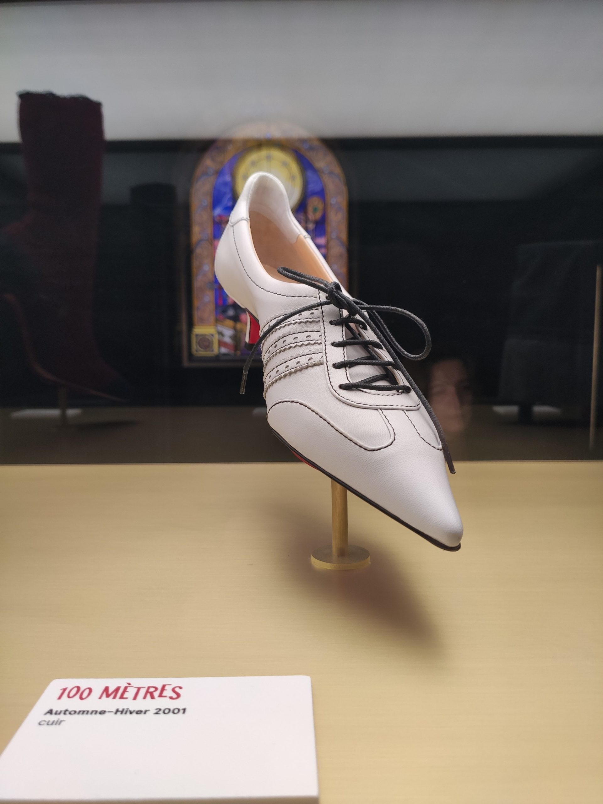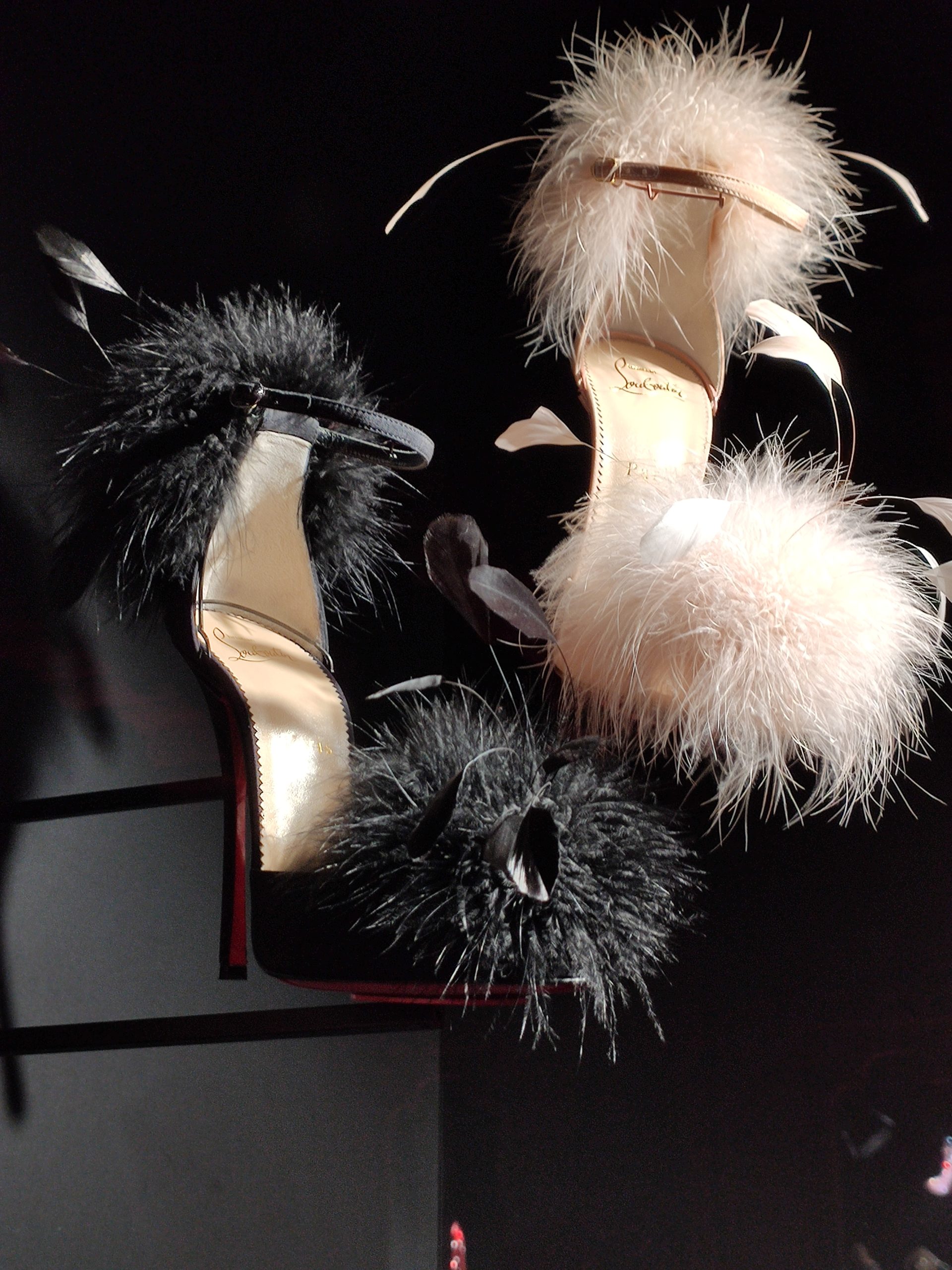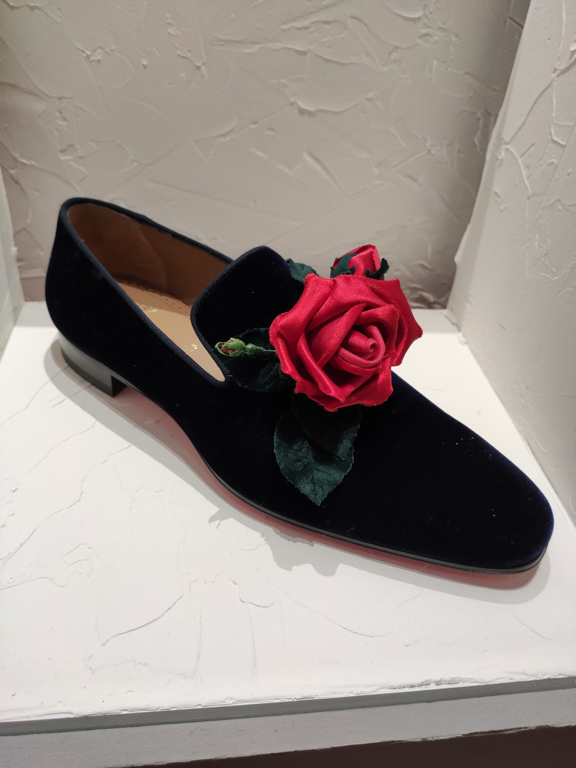 Une large sélection de souliers et croquis est présentée, dont certains jamais exposés. Ces pièces patrimoniales et artistiques sont exposées aux côtés de nombreuses collaborations qui soulignent l’attachement de Christian Louboutin pour les savoir-faire et les métiers d’art, comme des vitraux réalisés par la Maison du Vitrail à Paris, un palanquin d’argent réalisé par l’Orfebreria Villareal de Séville, ou encore un cabaret sculpté au Bhoutan.