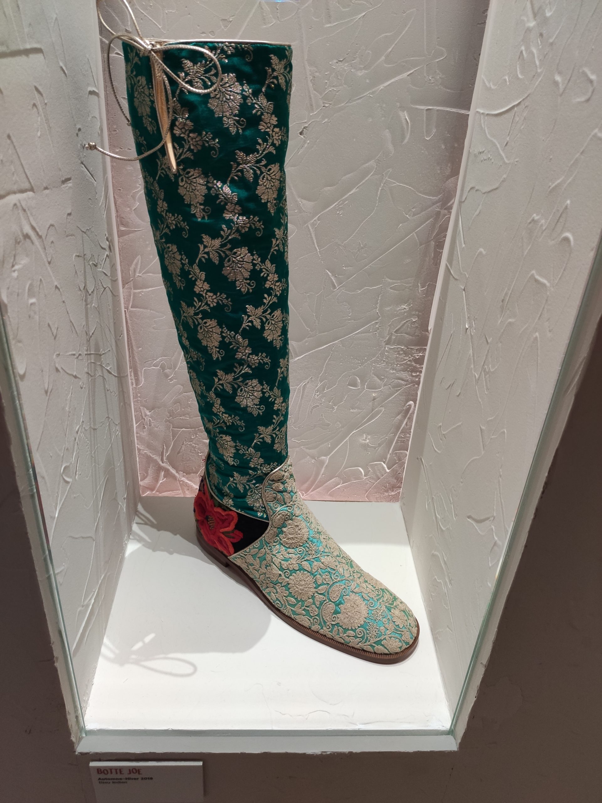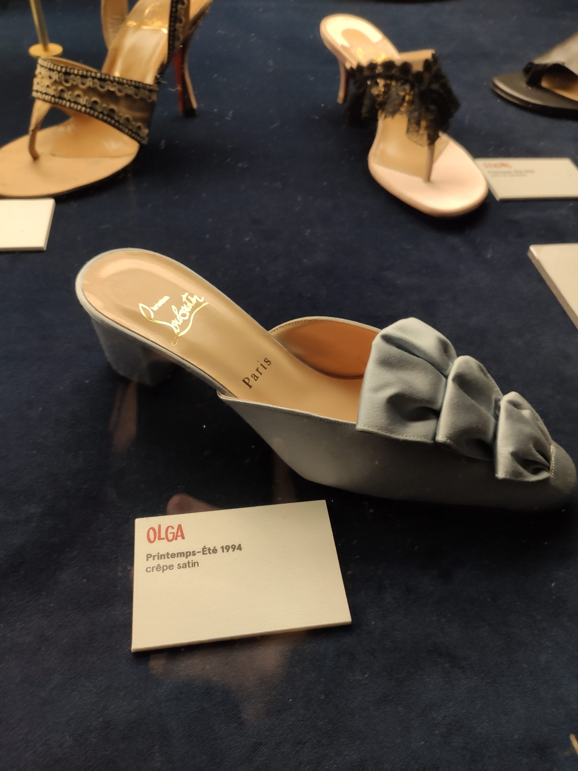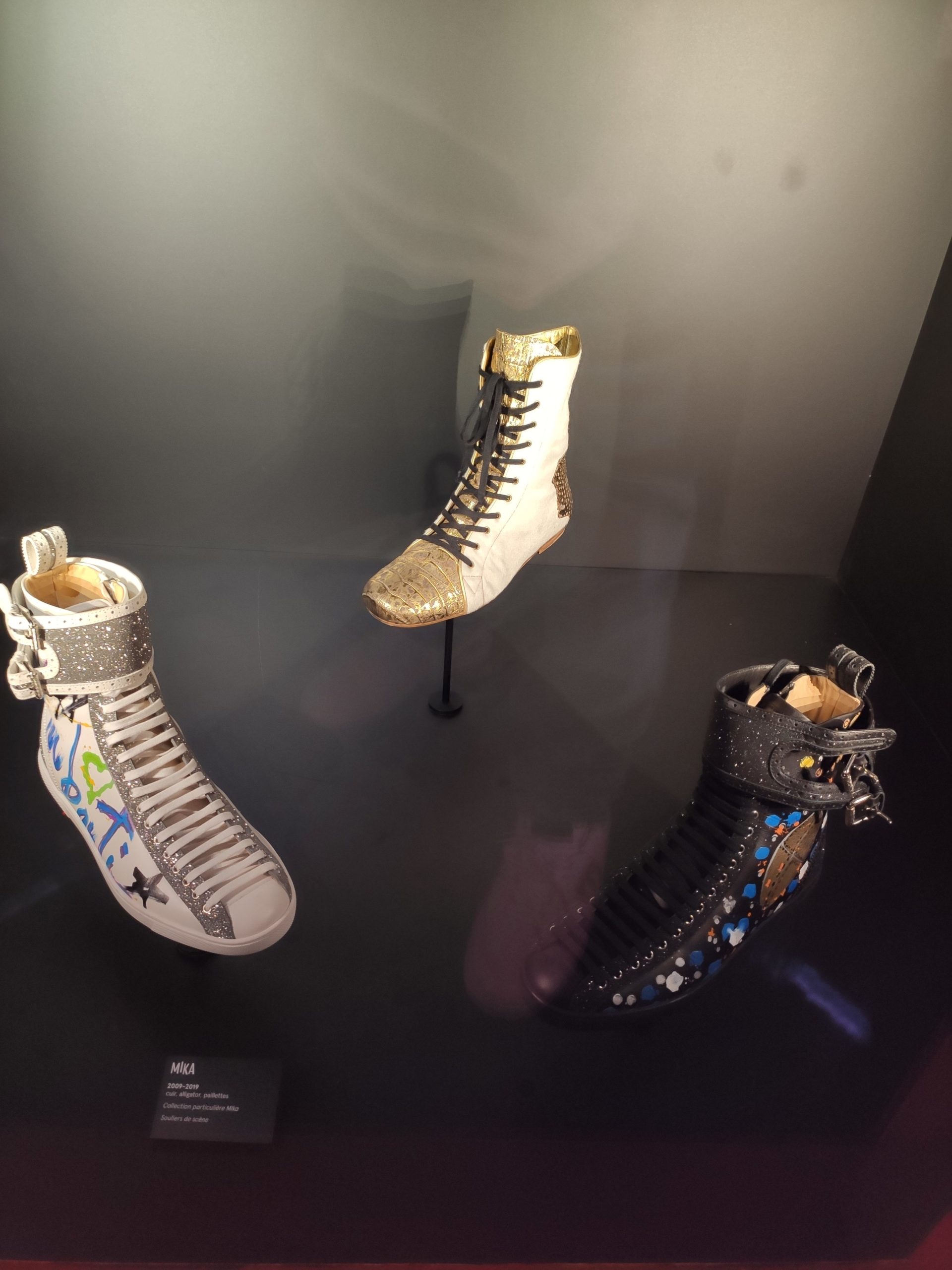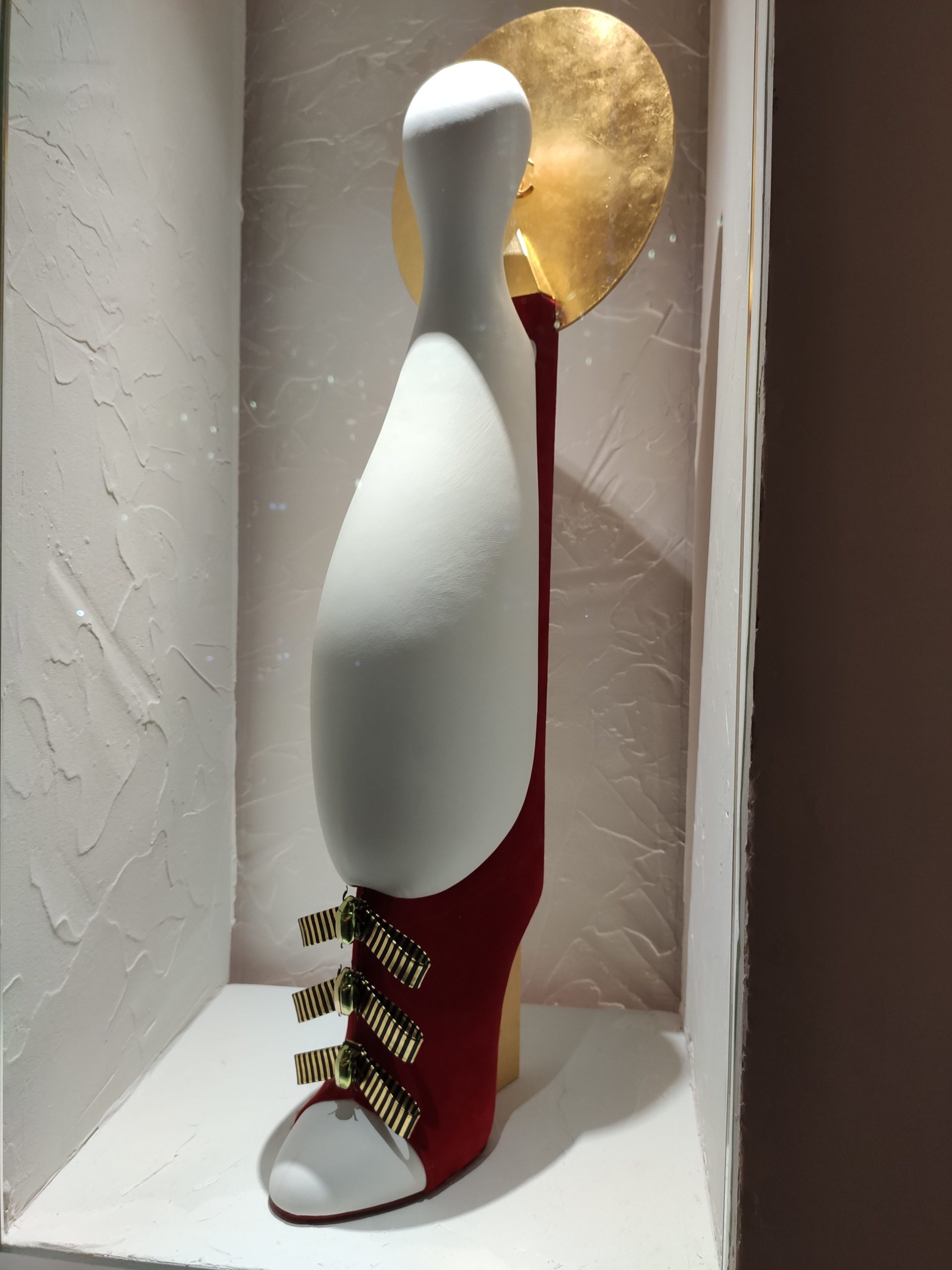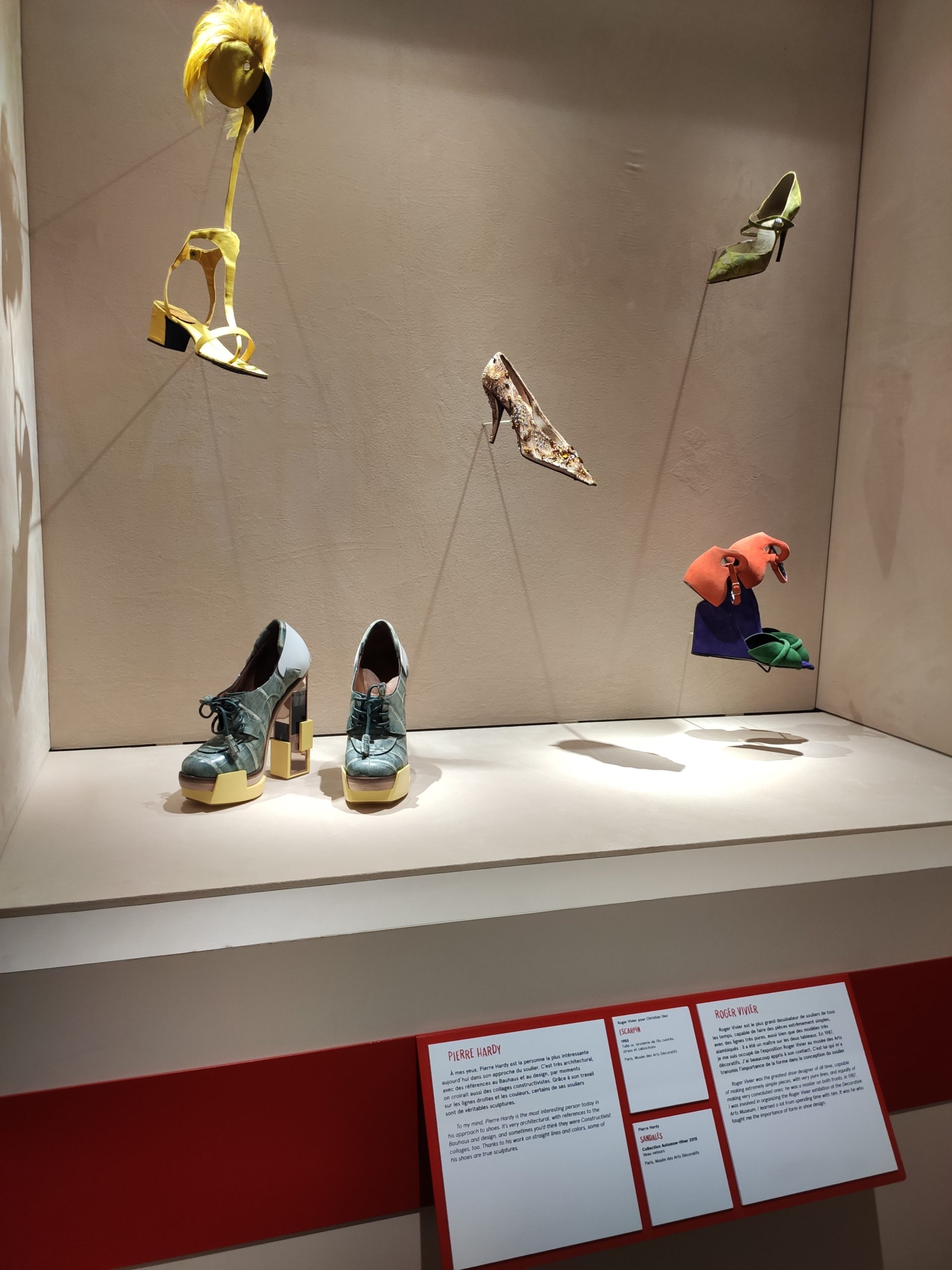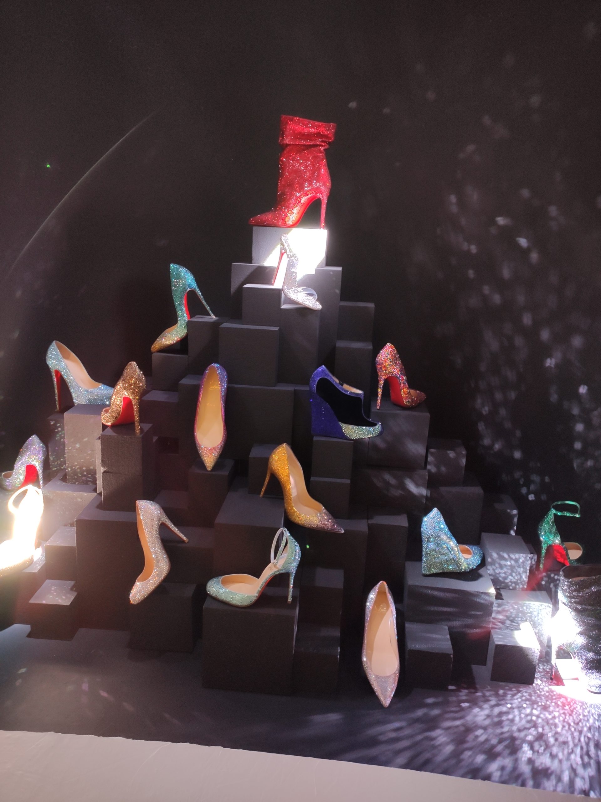 Une large sélection de souliers et croquis est présentée, dont certains jamais exposés. Ces pièces patrimoniales et artistiques sont exposées aux côtés de nombreuses collaborations qui soulignent l’attachement de Christian Louboutin pour les savoir-faire et les métiers d’art, comme des vitraux réalisés par la Maison du Vitrail à Paris, un palanquin d’argent réalisé par l’Orfebreria Villareal de Séville, ou encore un cabaret sculpté au Bhoutan.
