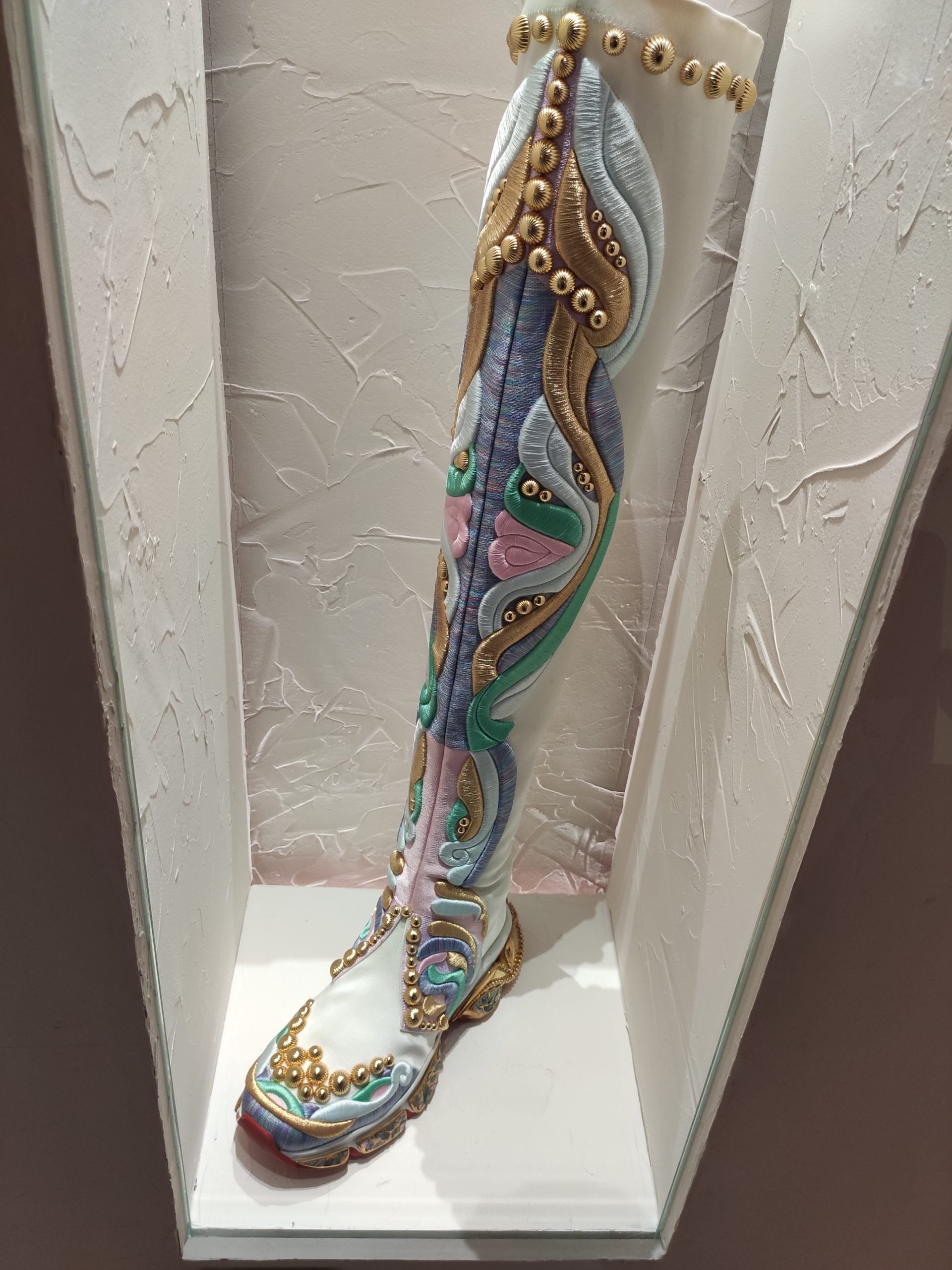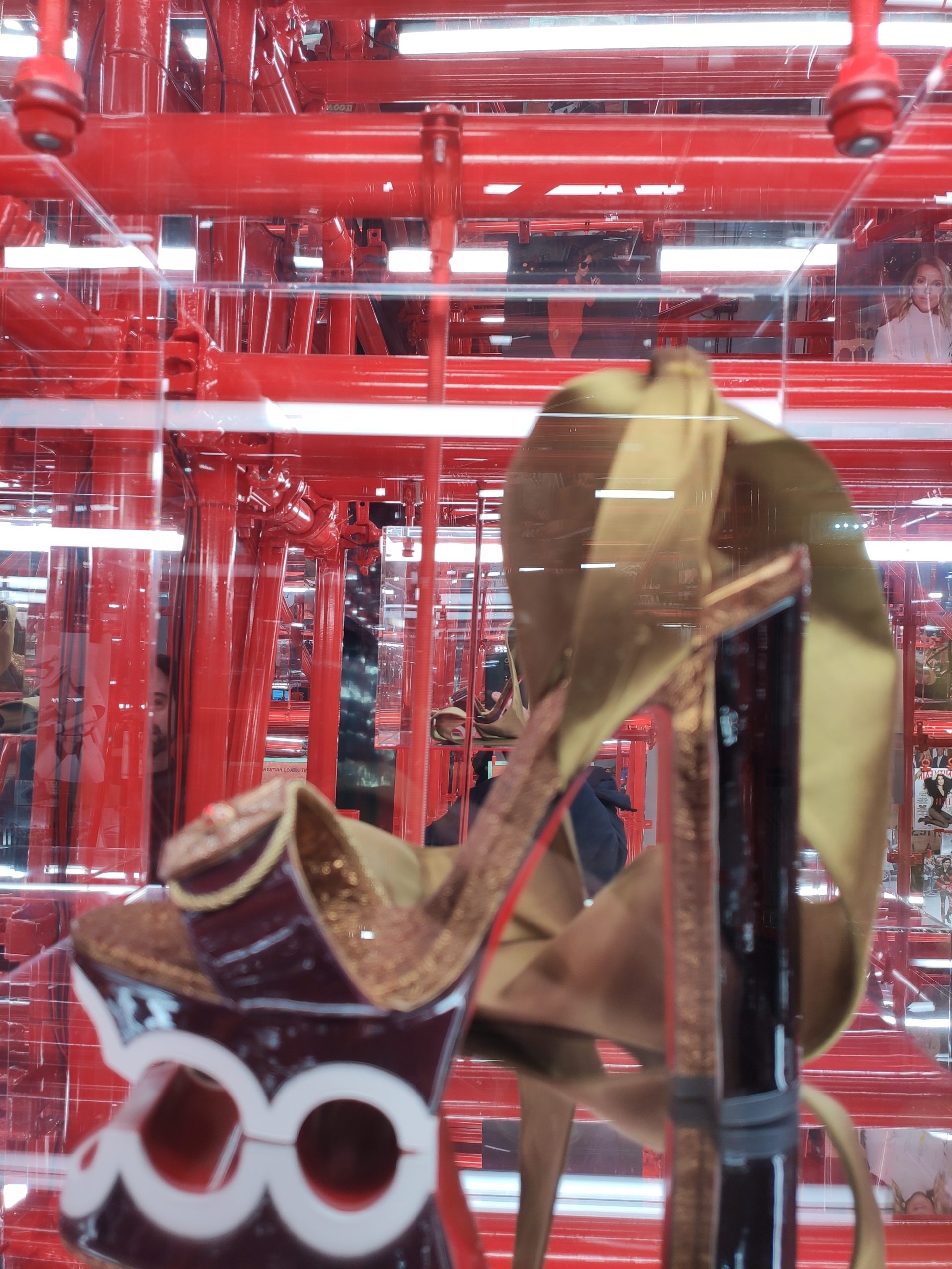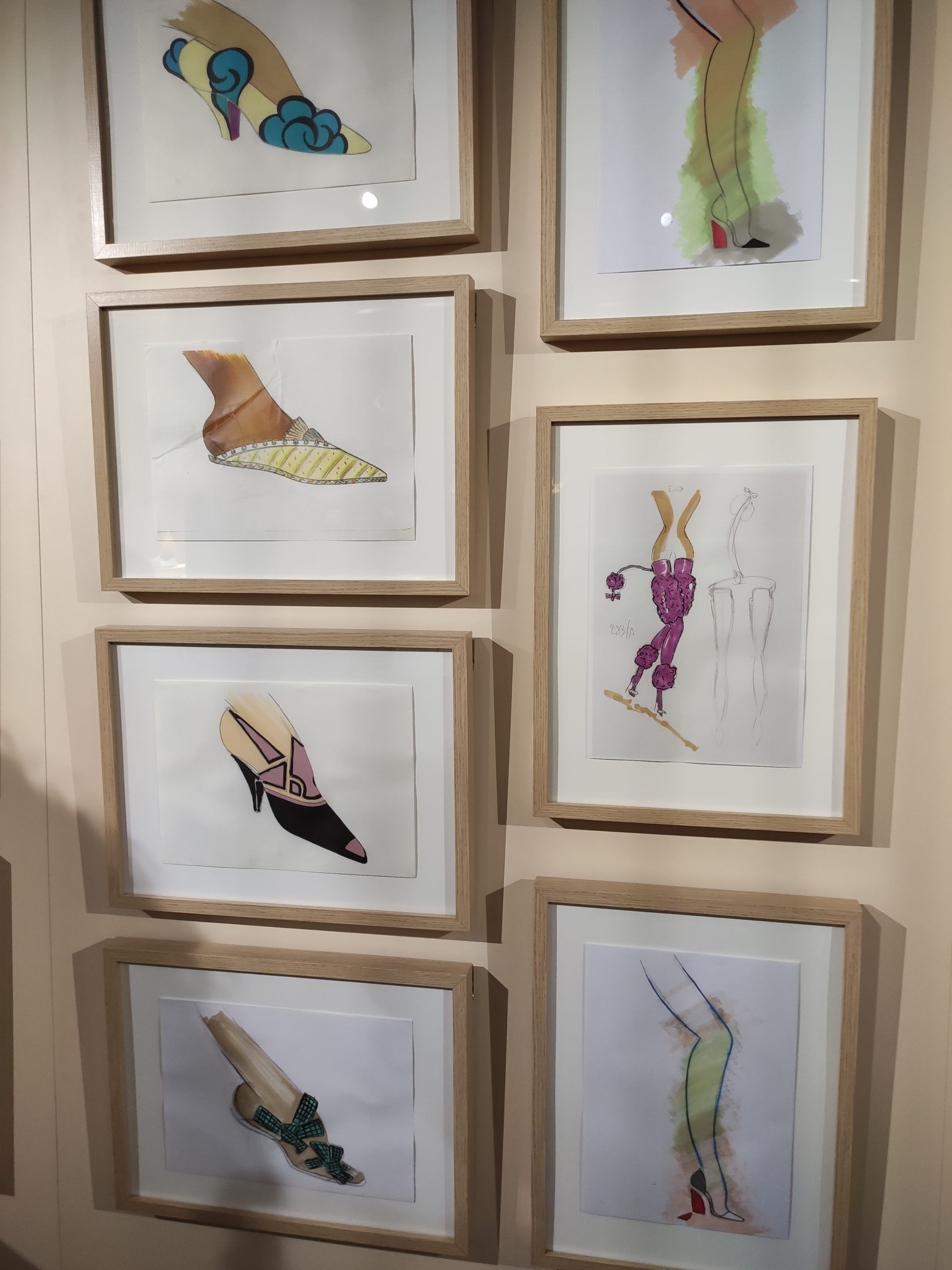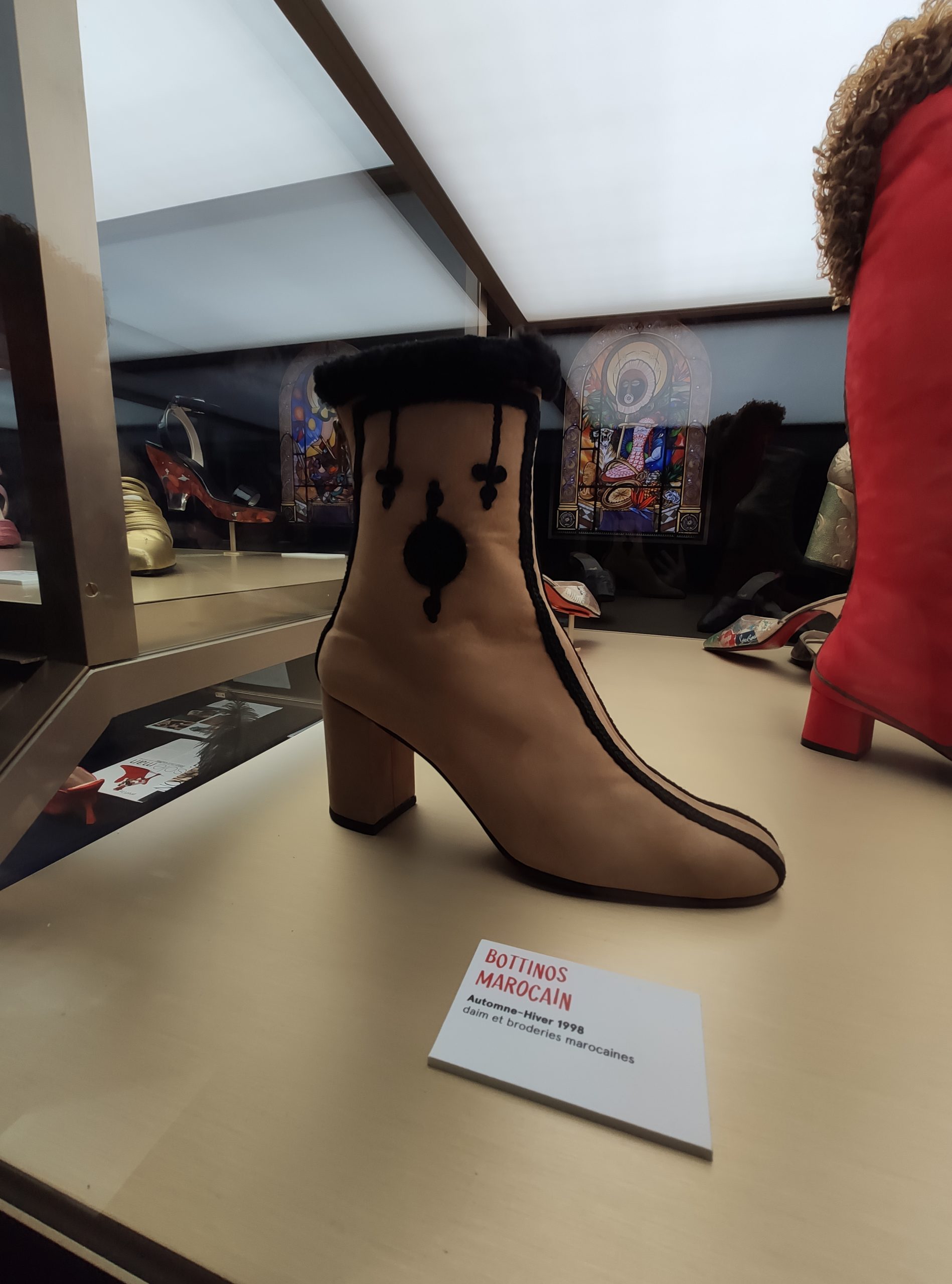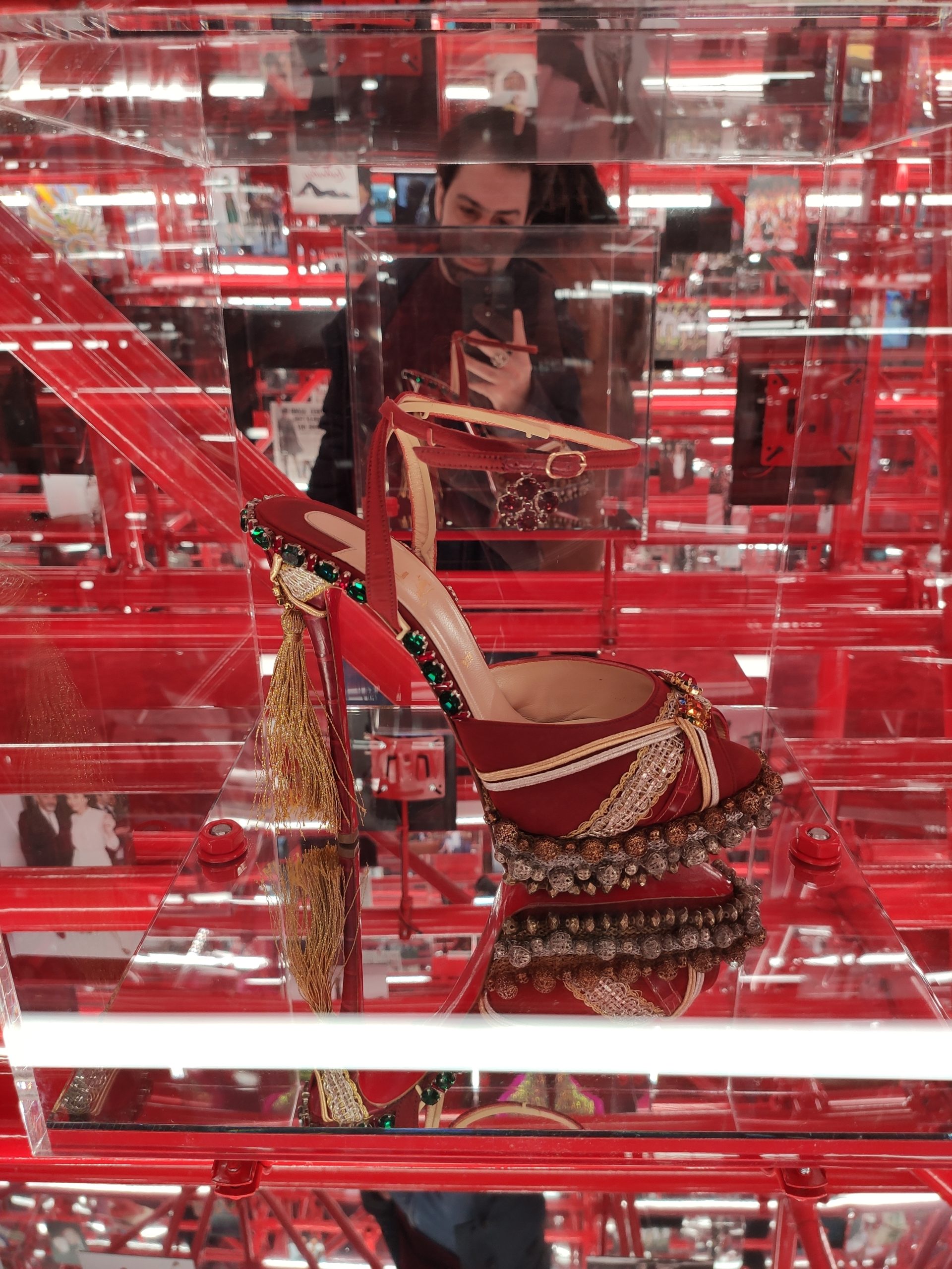 Une large sélection de souliers et croquis est présentée, dont certains jamais exposés. Ces pièces patrimoniales et artistiques sont exposées aux côtés de nombreuses collaborations qui soulignent l’attachement de Christian Louboutin pour les savoir-faire et les métiers d’art, comme des vitraux réalisés par la Maison du Vitrail à Paris, un palanquin d’argent réalisé par l’Orfebreria Villareal de Séville, ou encore un cabaret sculpté au Bhoutan.