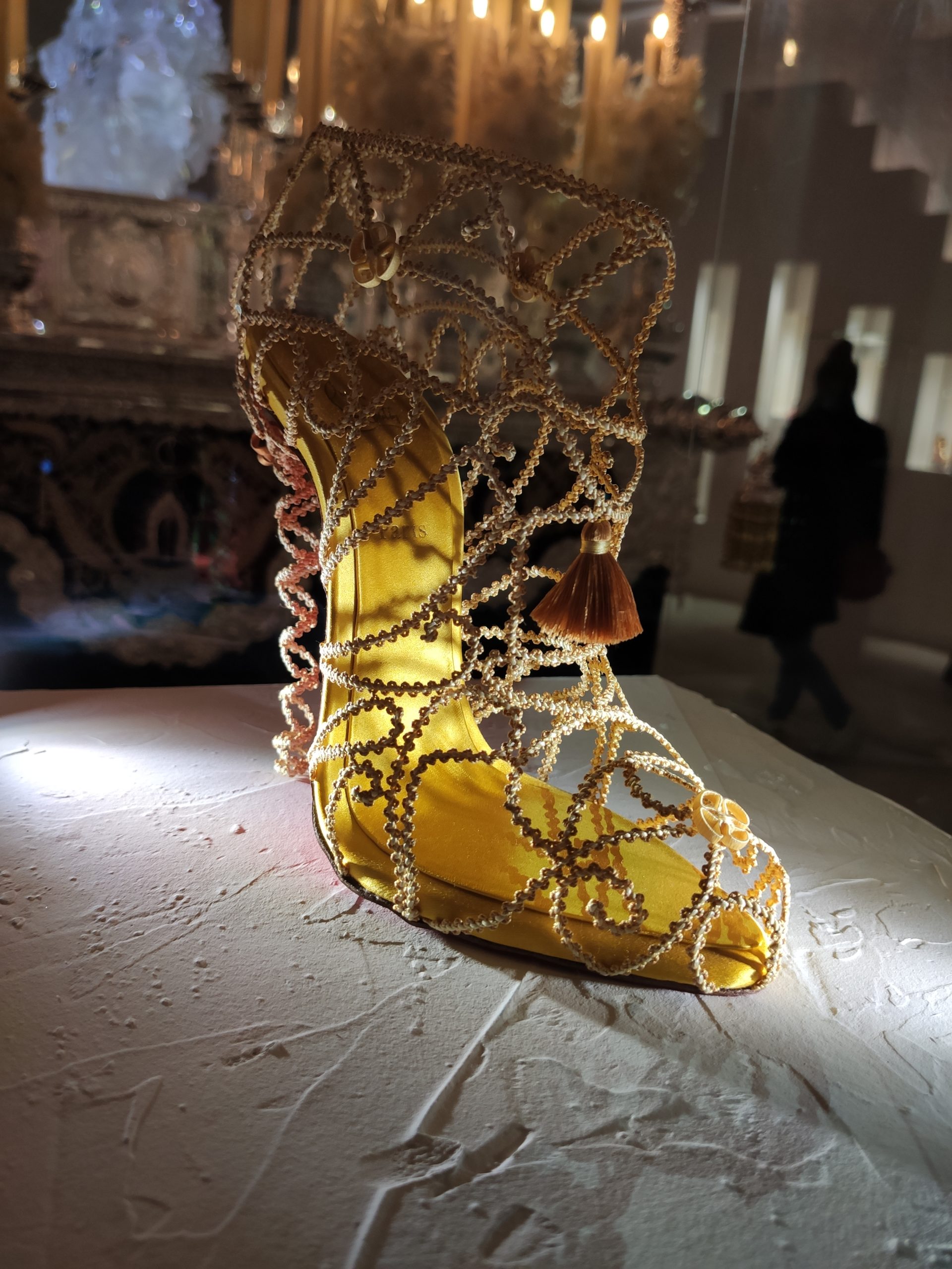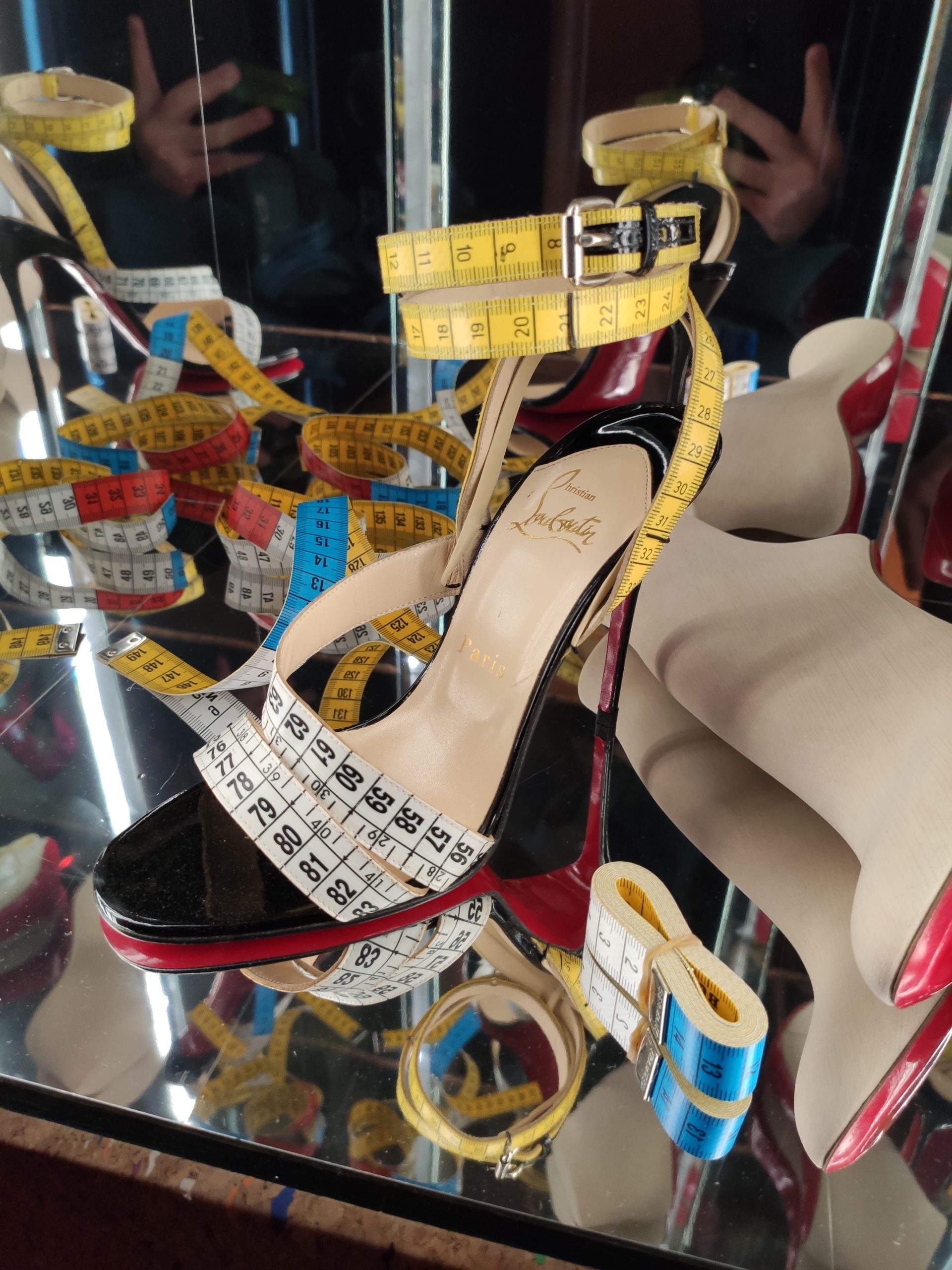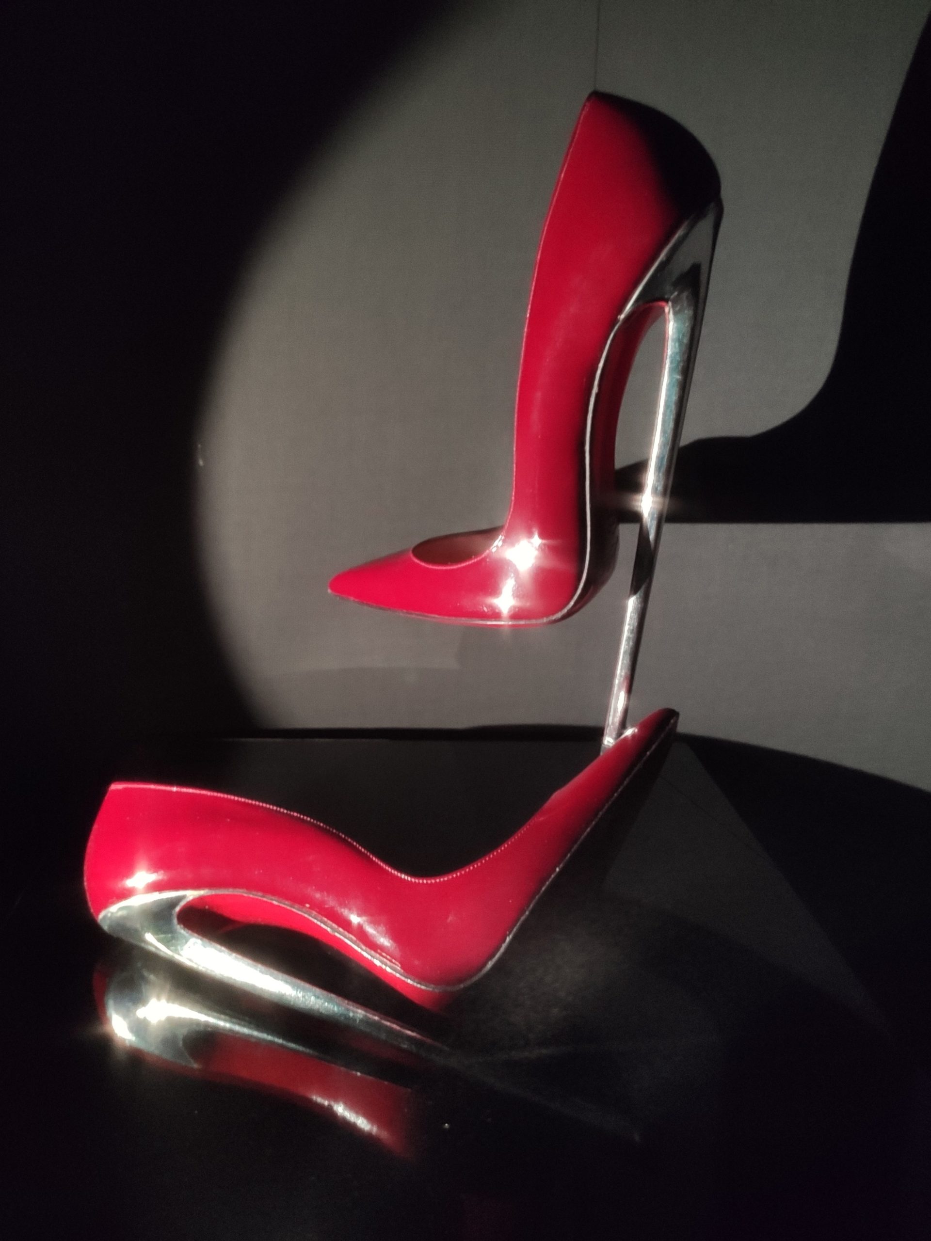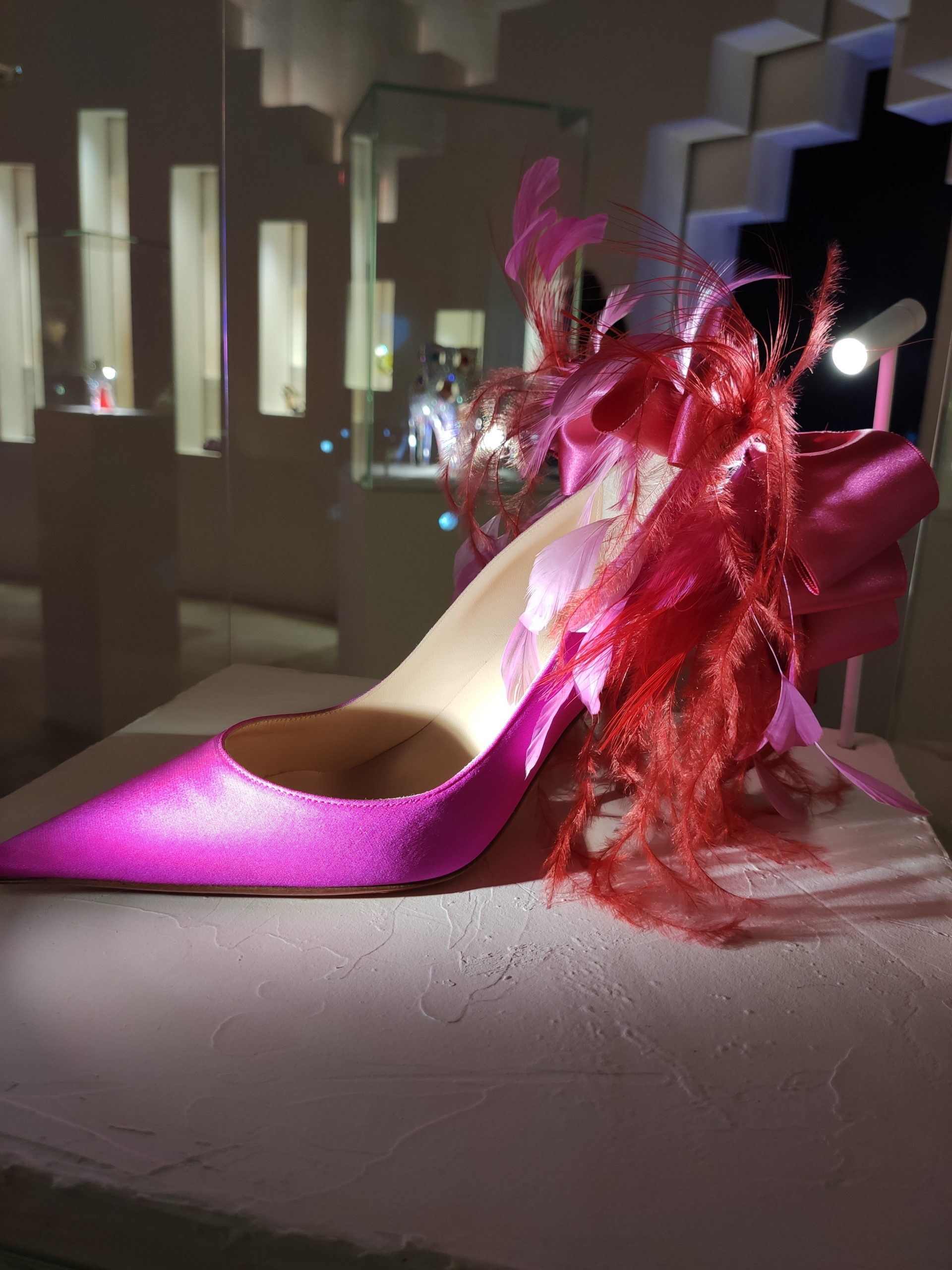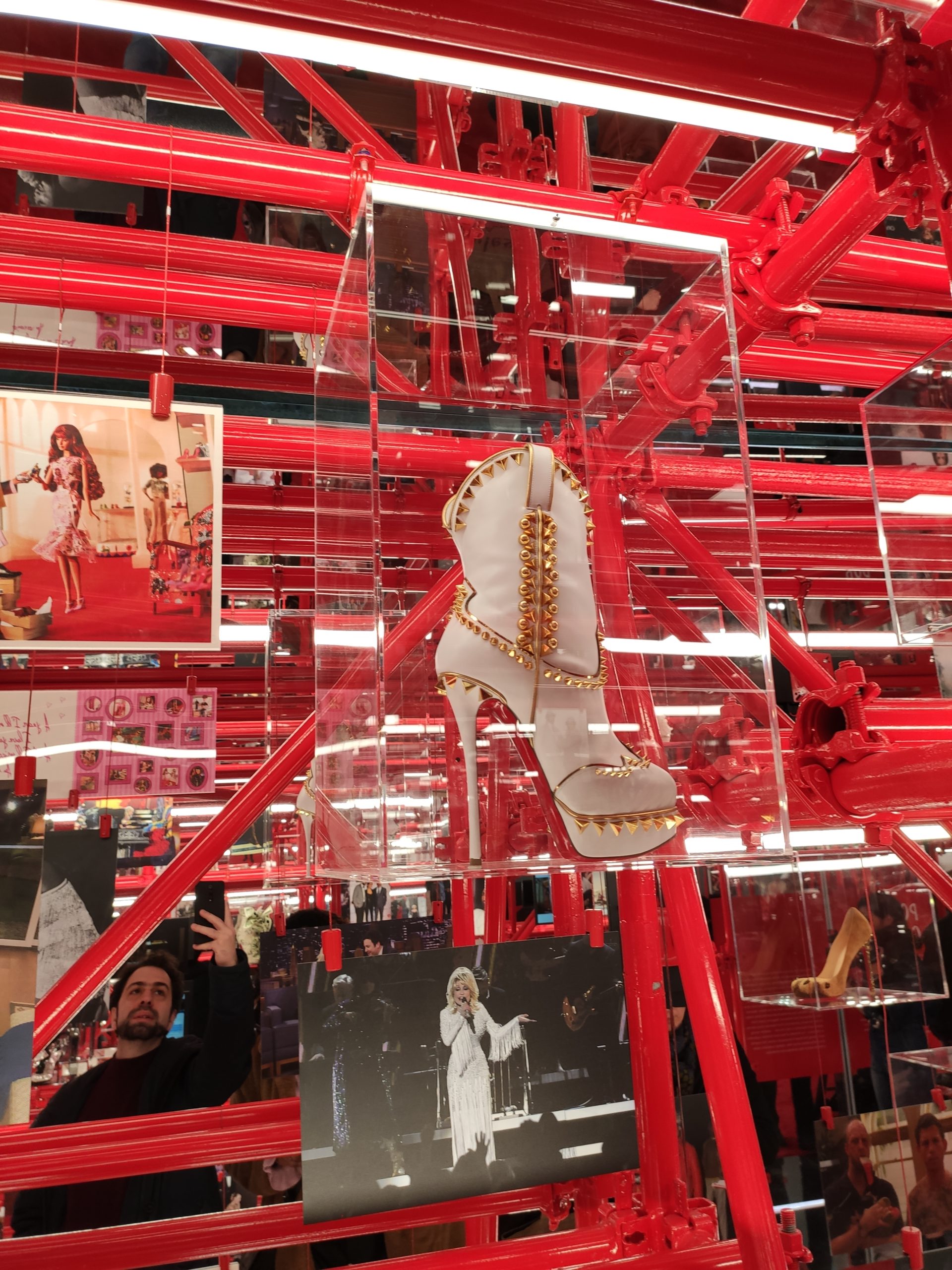 Une large sélection de souliers et croquis est présentée, dont certains jamais exposés. Ces pièces patrimoniales et artistiques sont exposées aux côtés de nombreuses collaborations qui soulignent l’attachement de Christian Louboutin pour les savoir-faire et les métiers d’art, comme des vitraux réalisés par la Maison du Vitrail à Paris, un palanquin d’argent réalisé par l’Orfebreria Villareal de Séville, ou encore un cabaret sculpté au Bhoutan.