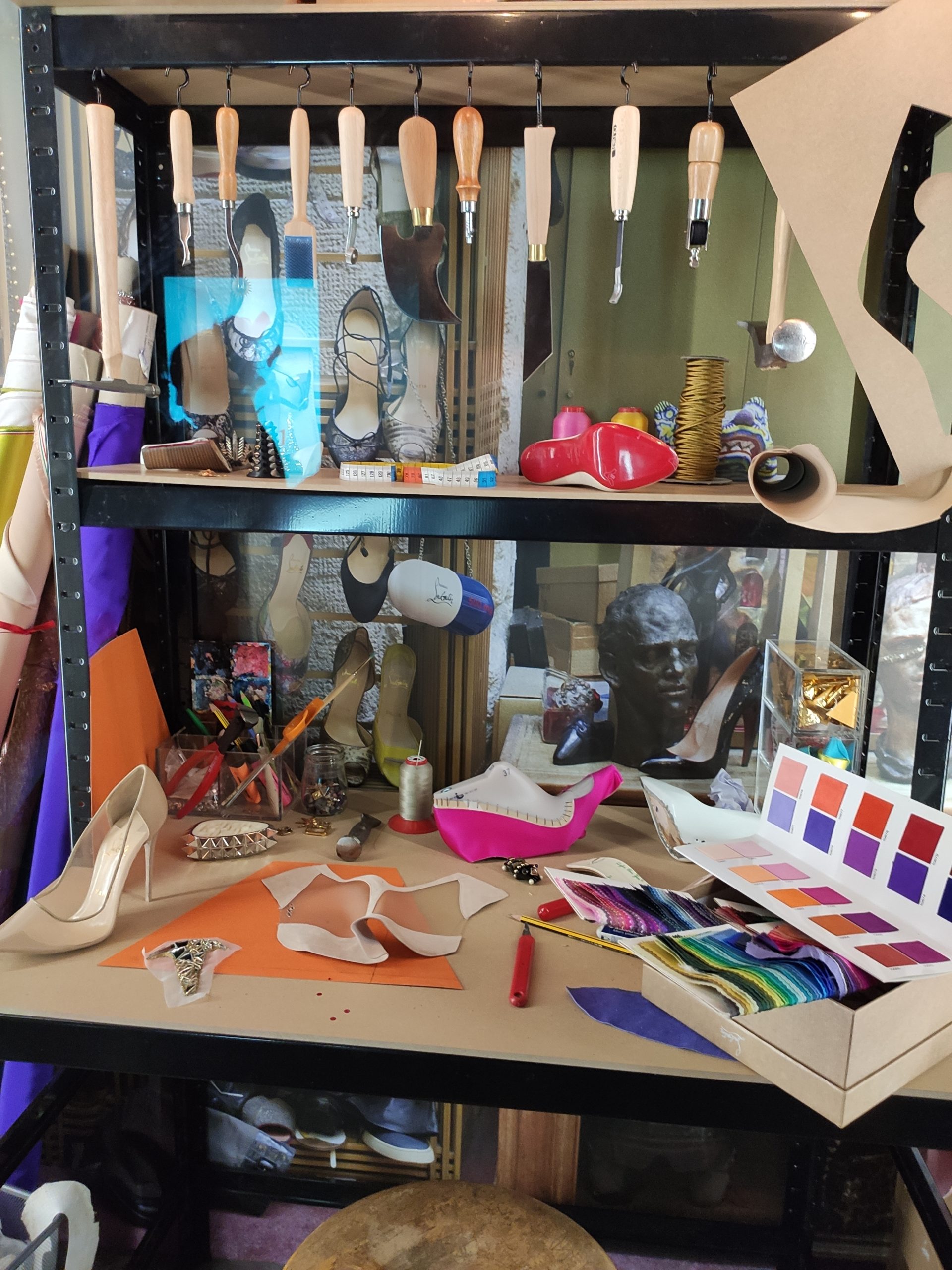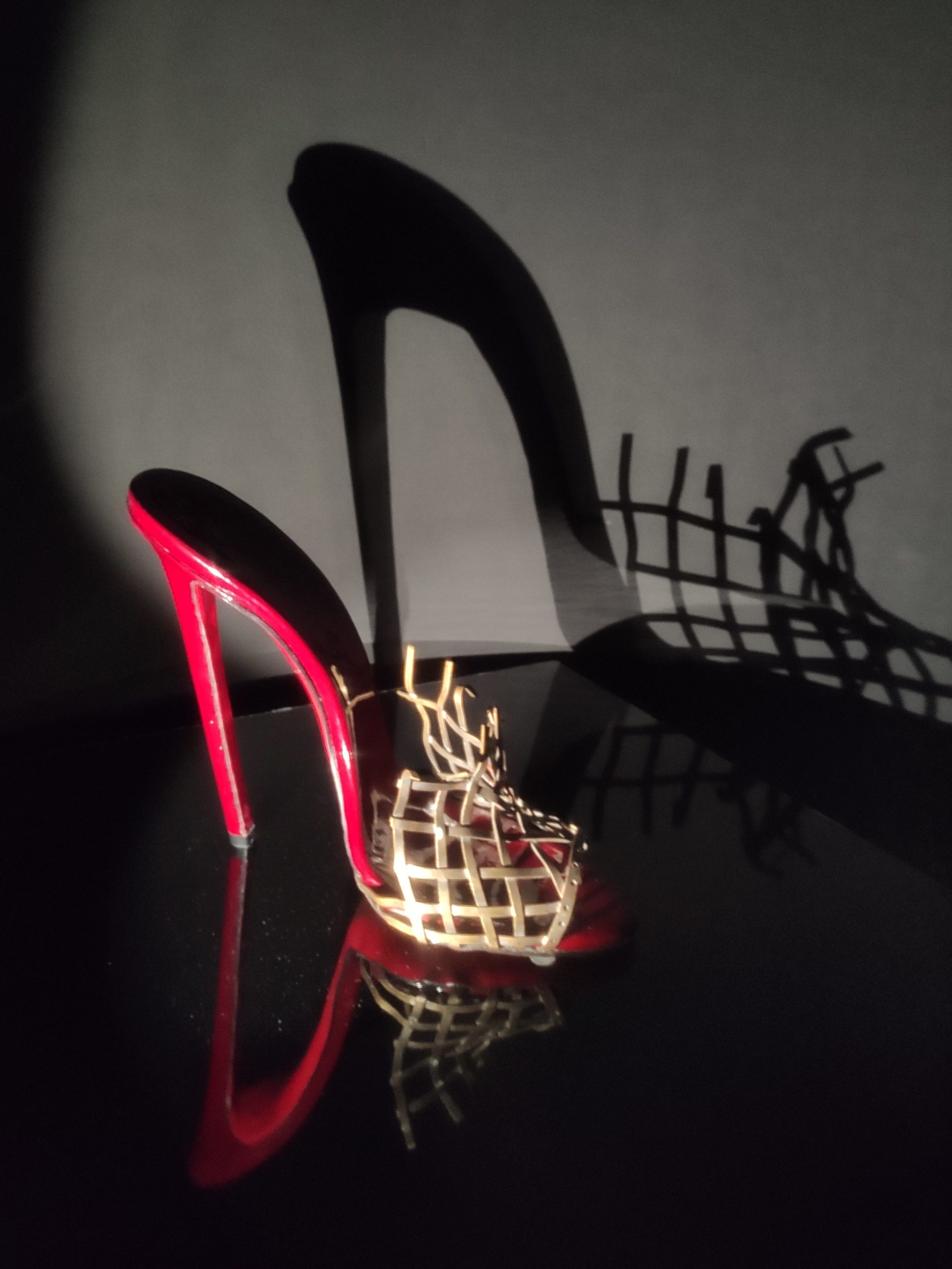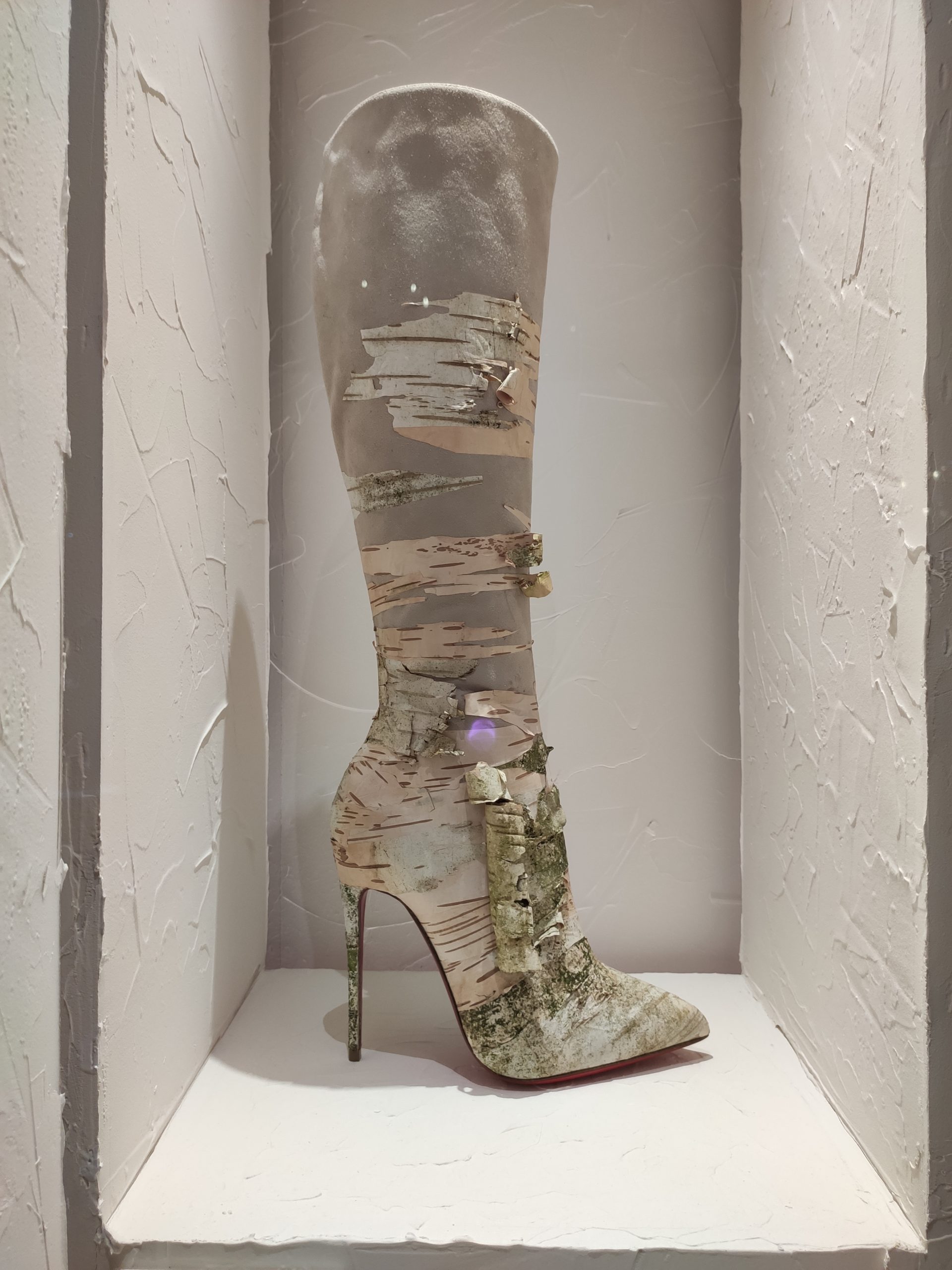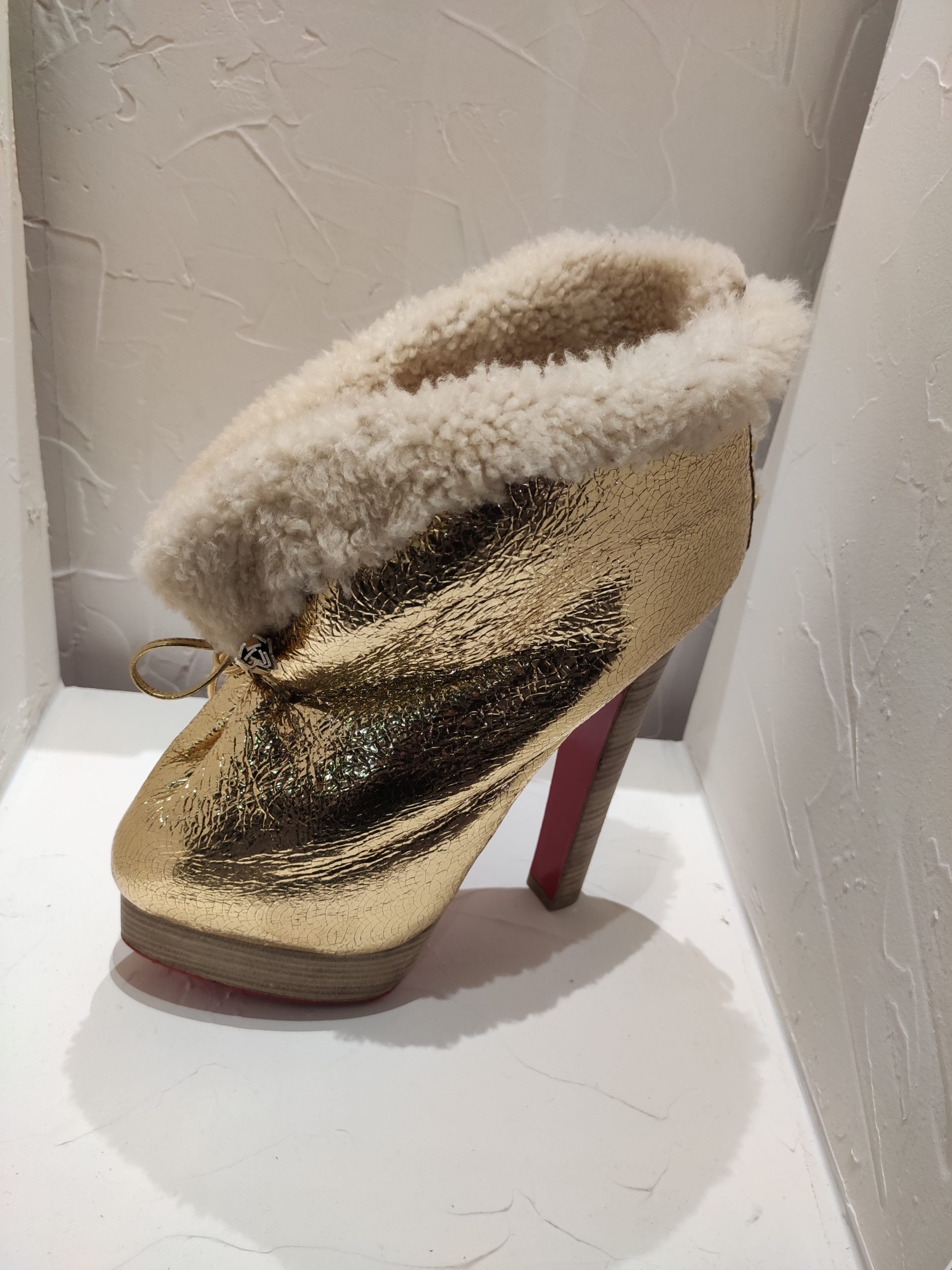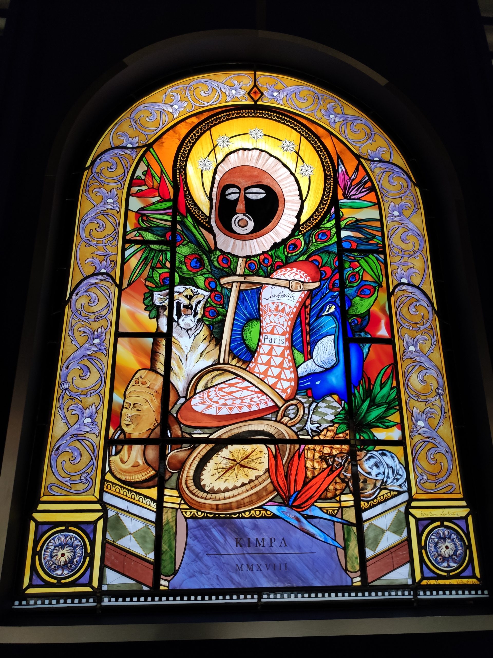 Une large sélection de souliers et croquis est présentée, dont certains jamais exposés. Ces pièces patrimoniales et artistiques sont exposées aux côtés de nombreuses collaborations qui soulignent l’attachement de Christian Louboutin pour les savoir-faire et les métiers d’art, comme des vitraux réalisés par la Maison du Vitrail à Paris, un palanquin d’argent réalisé par l’Orfebreria Villareal de Séville, ou encore un cabaret sculpté au Bhoutan.